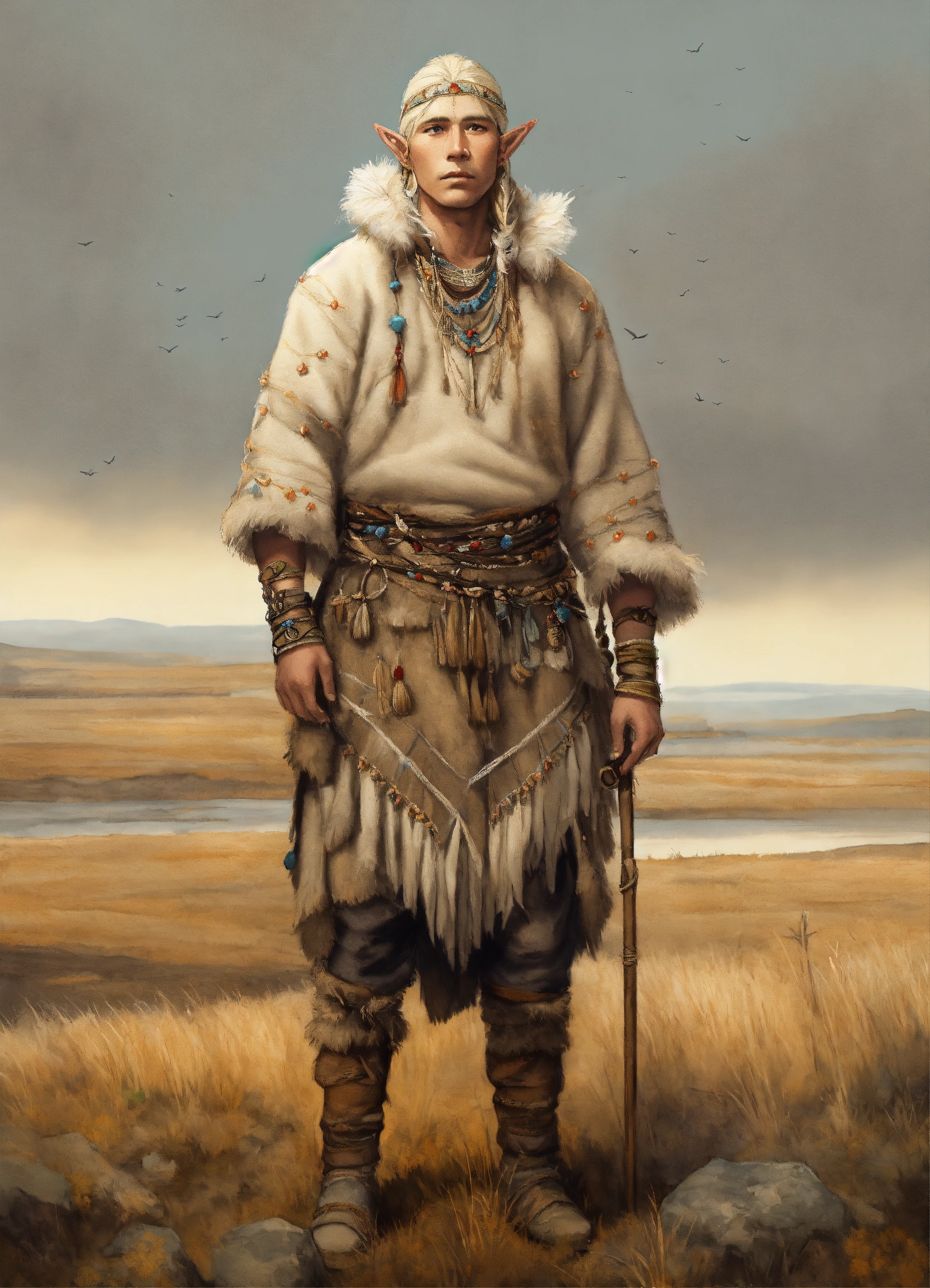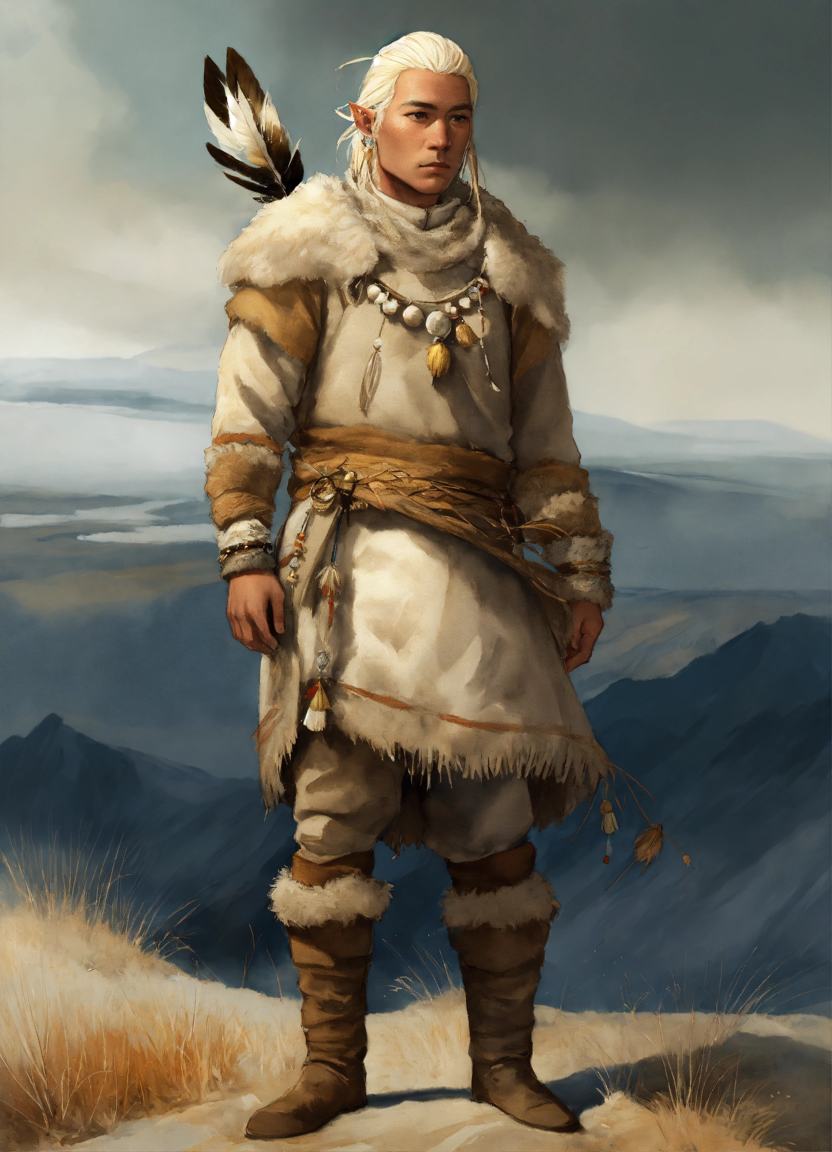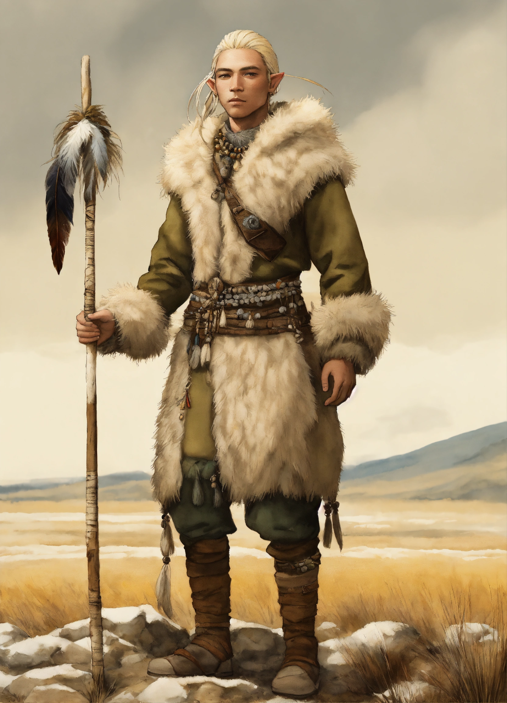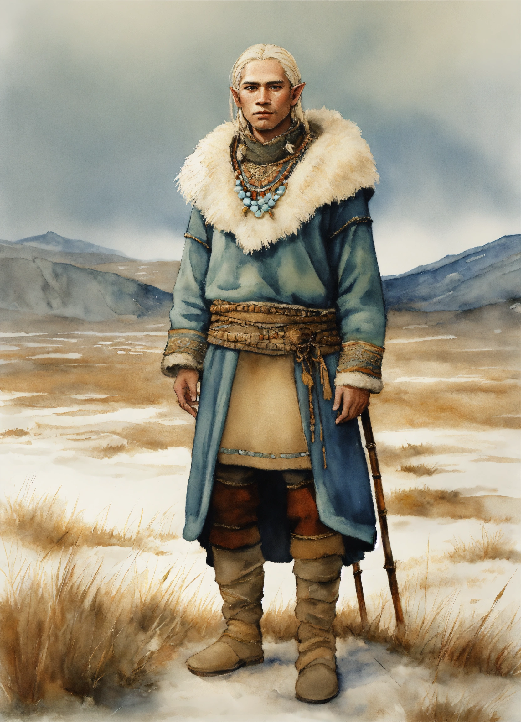Full body illustration of an elf inuit man, native american phenotype with blonde hair and albino skin, wearing stone age warm clothing made from natural fabrics like linen, cotton, or furs, adorned with feathers, beads and shells, standing on the steppe tundra landscape, watercolors, gloomy and depressing ambient, artwork by tom björklund, detailed face, detailed skin, highest detail quality