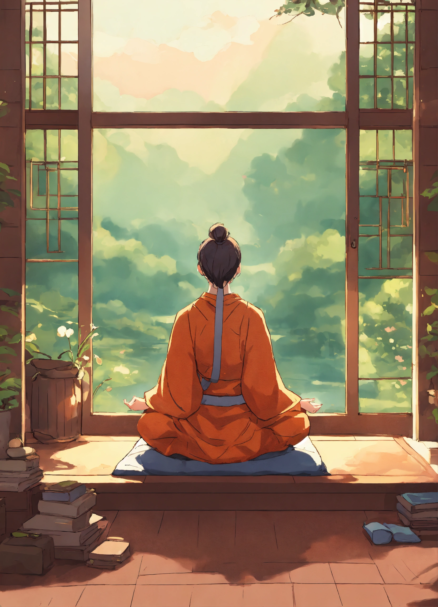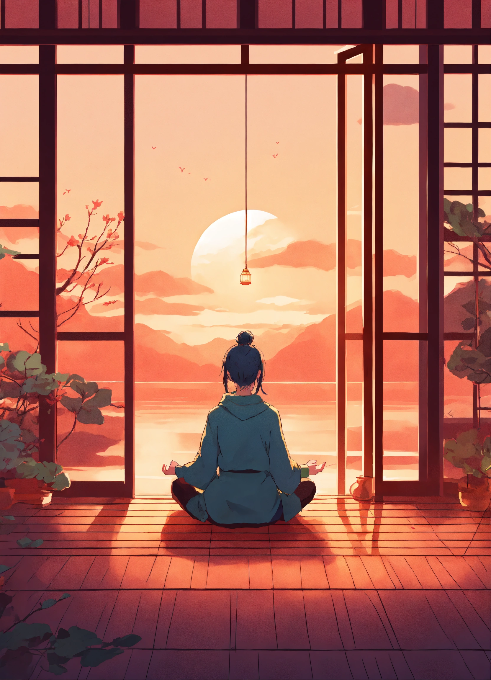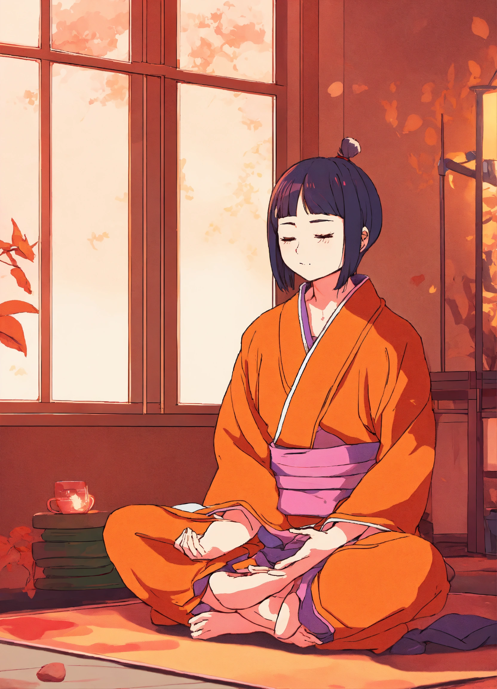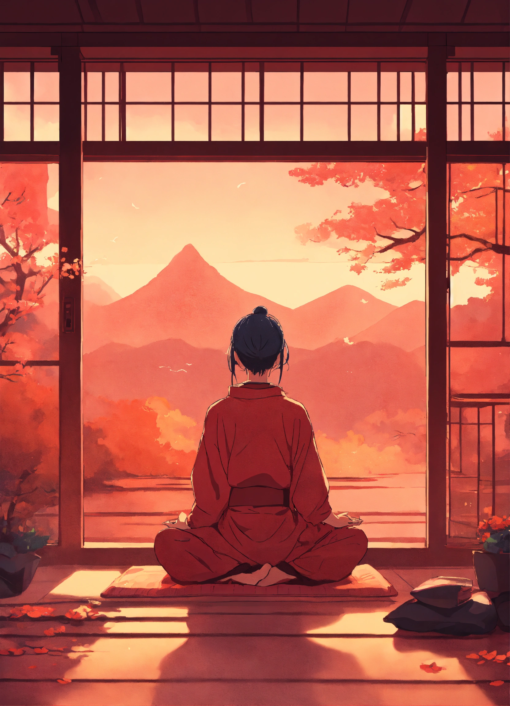 Meditation samuri anime style cozy webpage background hero image for adorable platform modern minimalist illustration