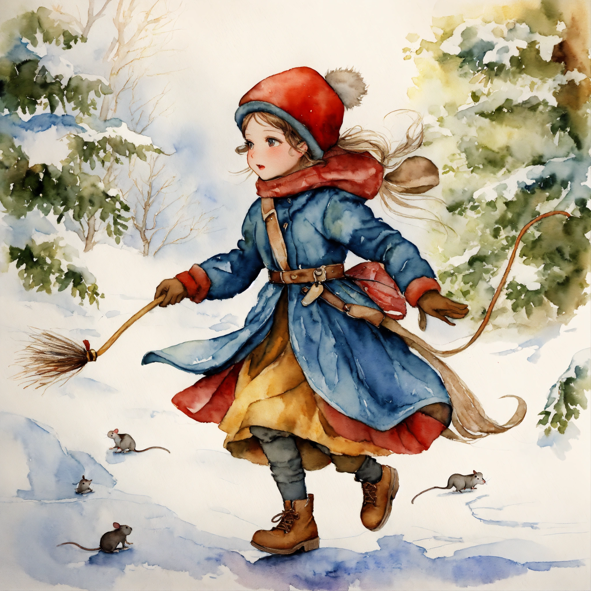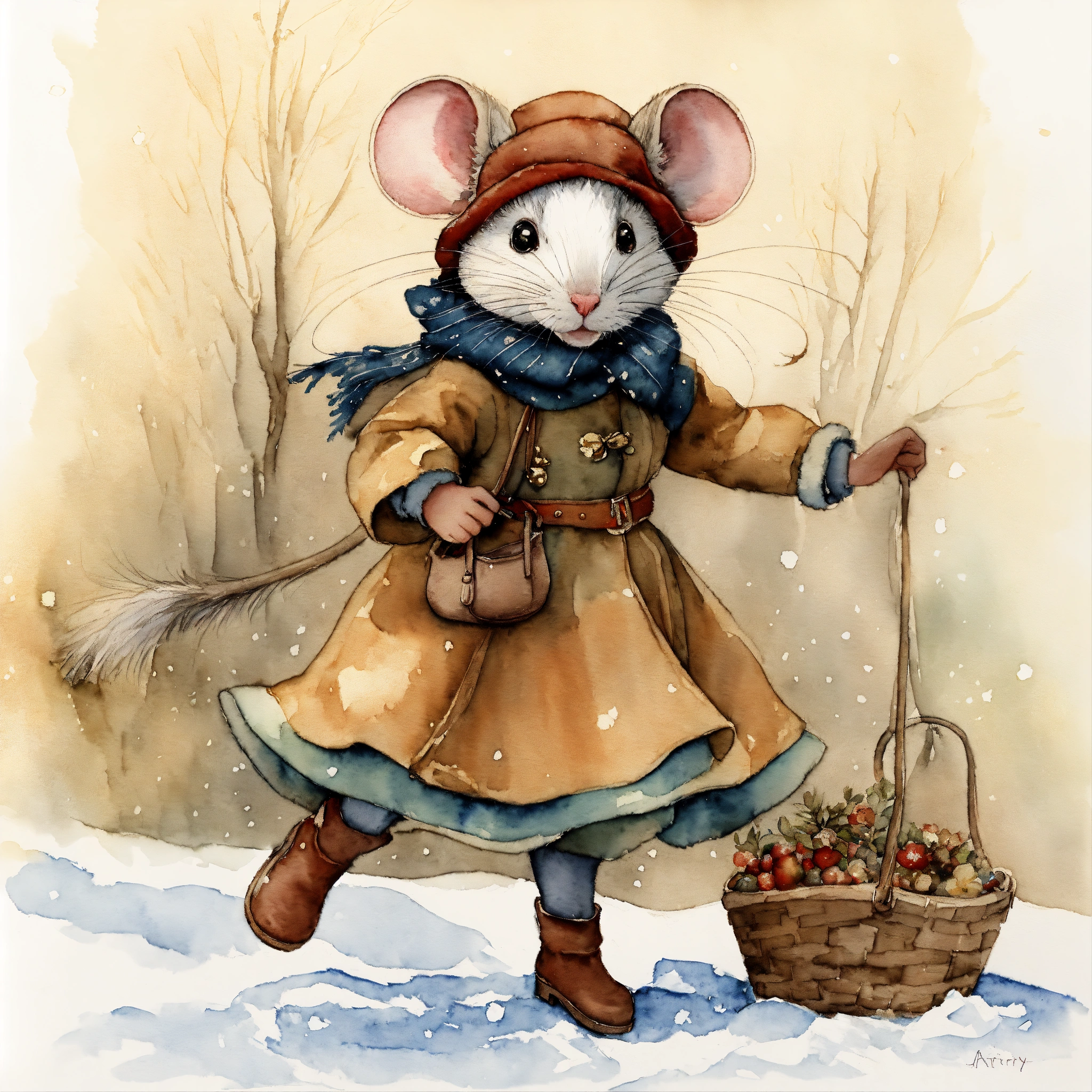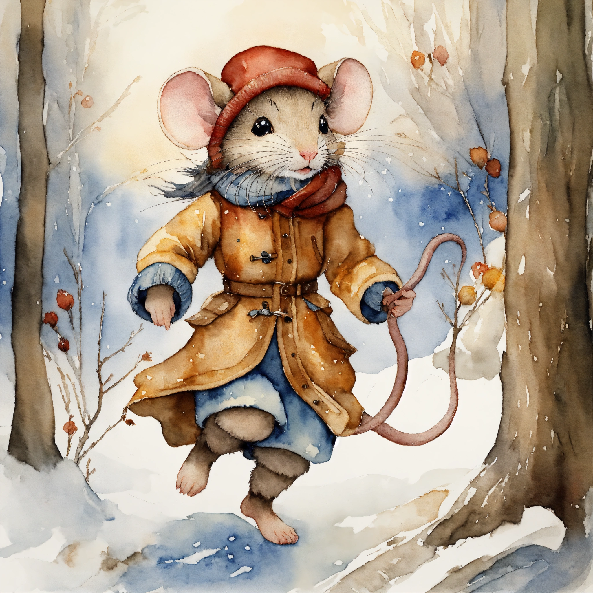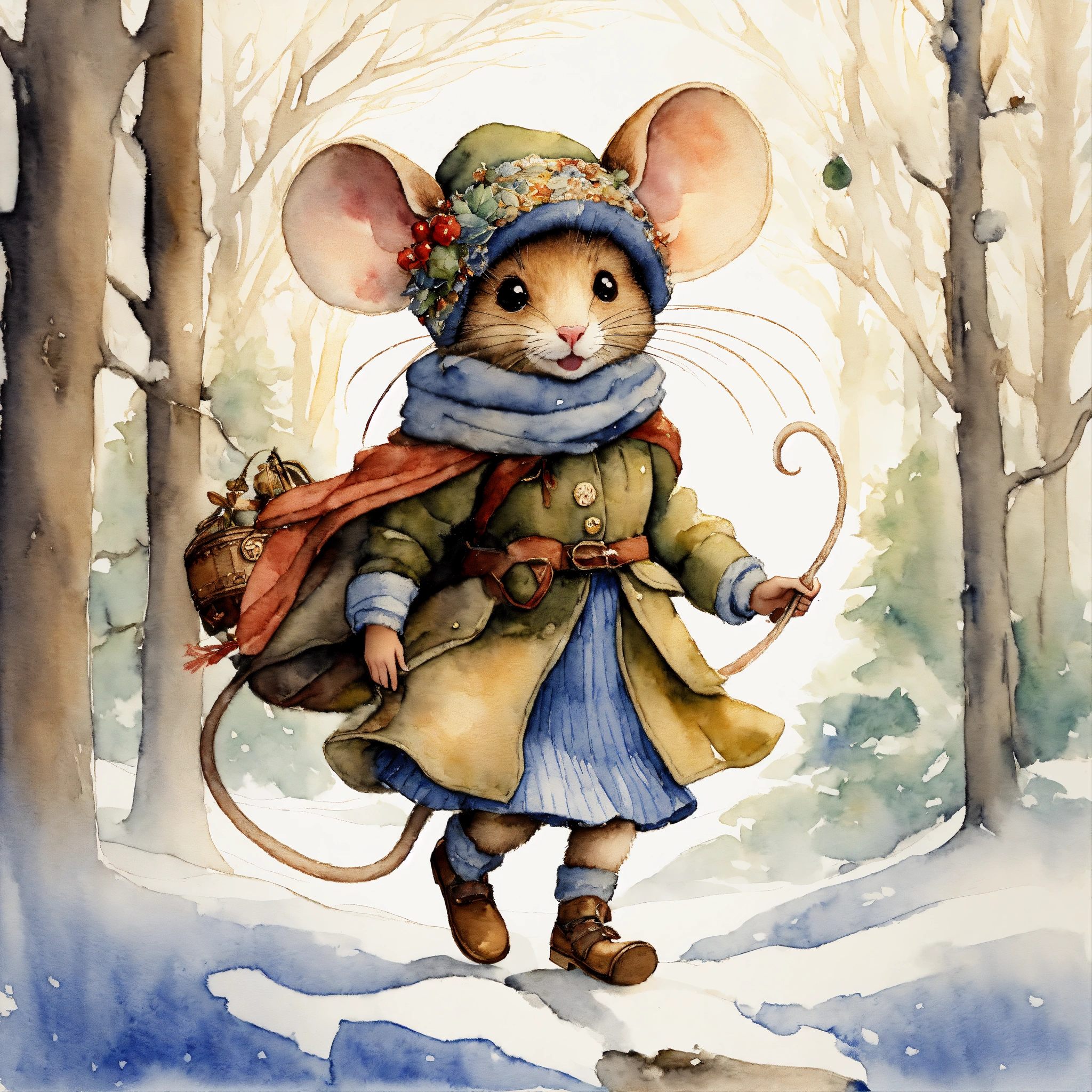 White background, white background full-body winter a mouse girl mouse, skipping adventure, watercolor, trending on artstation, sharp focus, studio photo, intricate details, highly detailed, the image should evoke a sense of awe and wonder, inviting viewers to embark on an imaginative journey. watercolour and ink by cicely mary barker