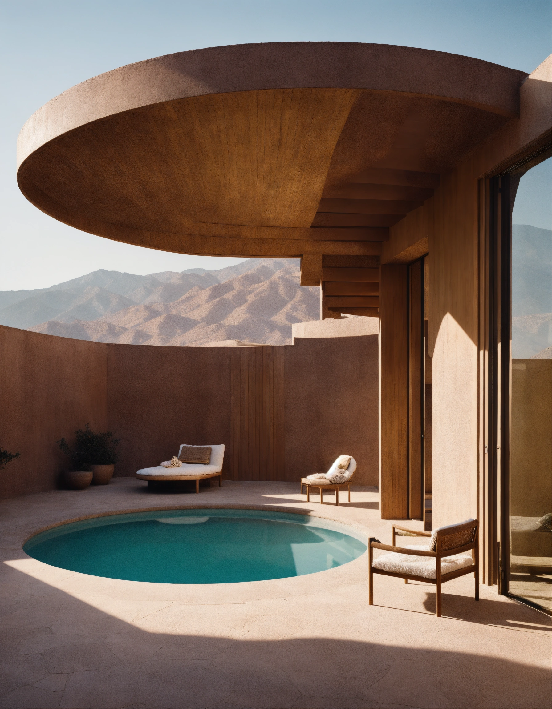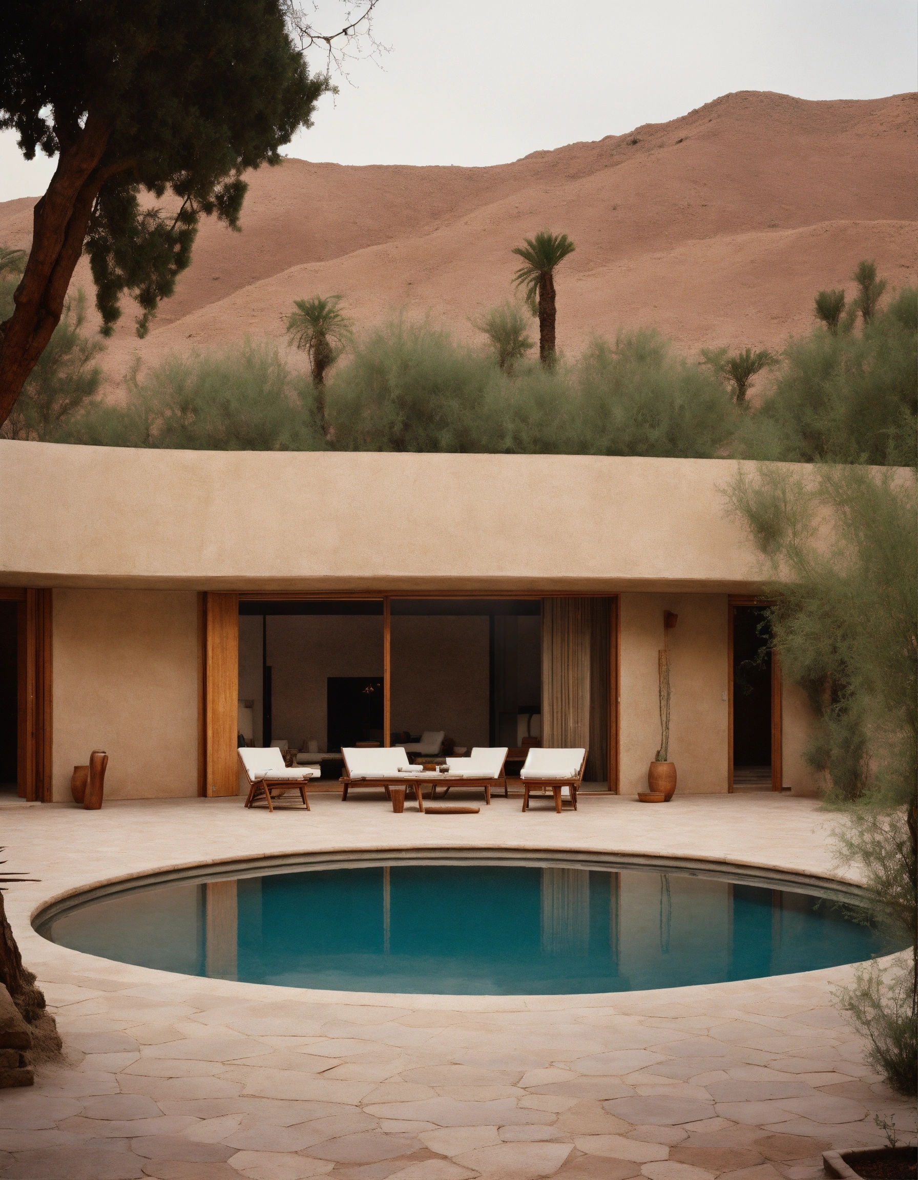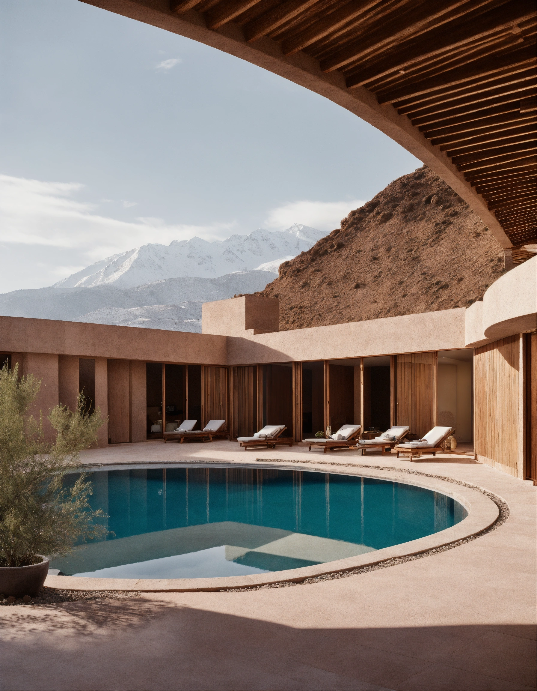 A large flat seamless round swimming pool within a round courtyard of a modern brutalist house in marrakech, snowy mountains in the background, minimalist wood exterior furniture, ultra realistic and extremely detailed, cinematic mood, film photography by julius shulman