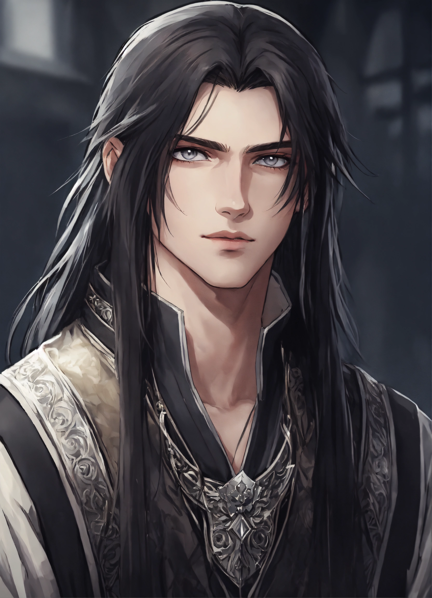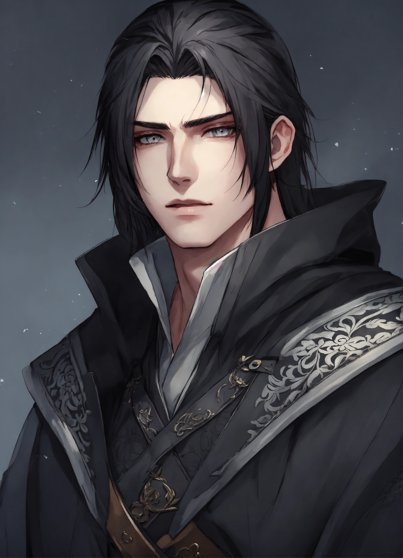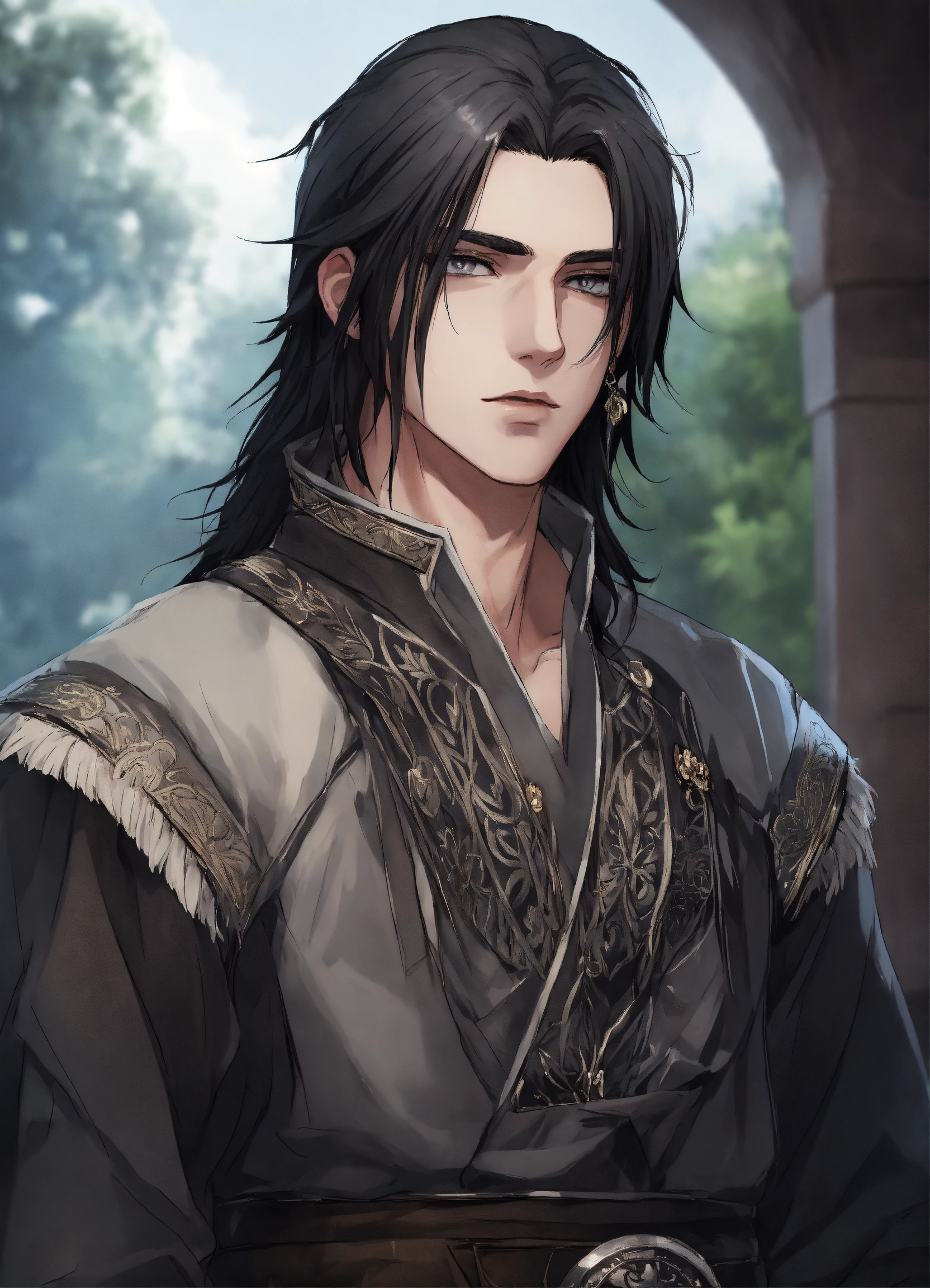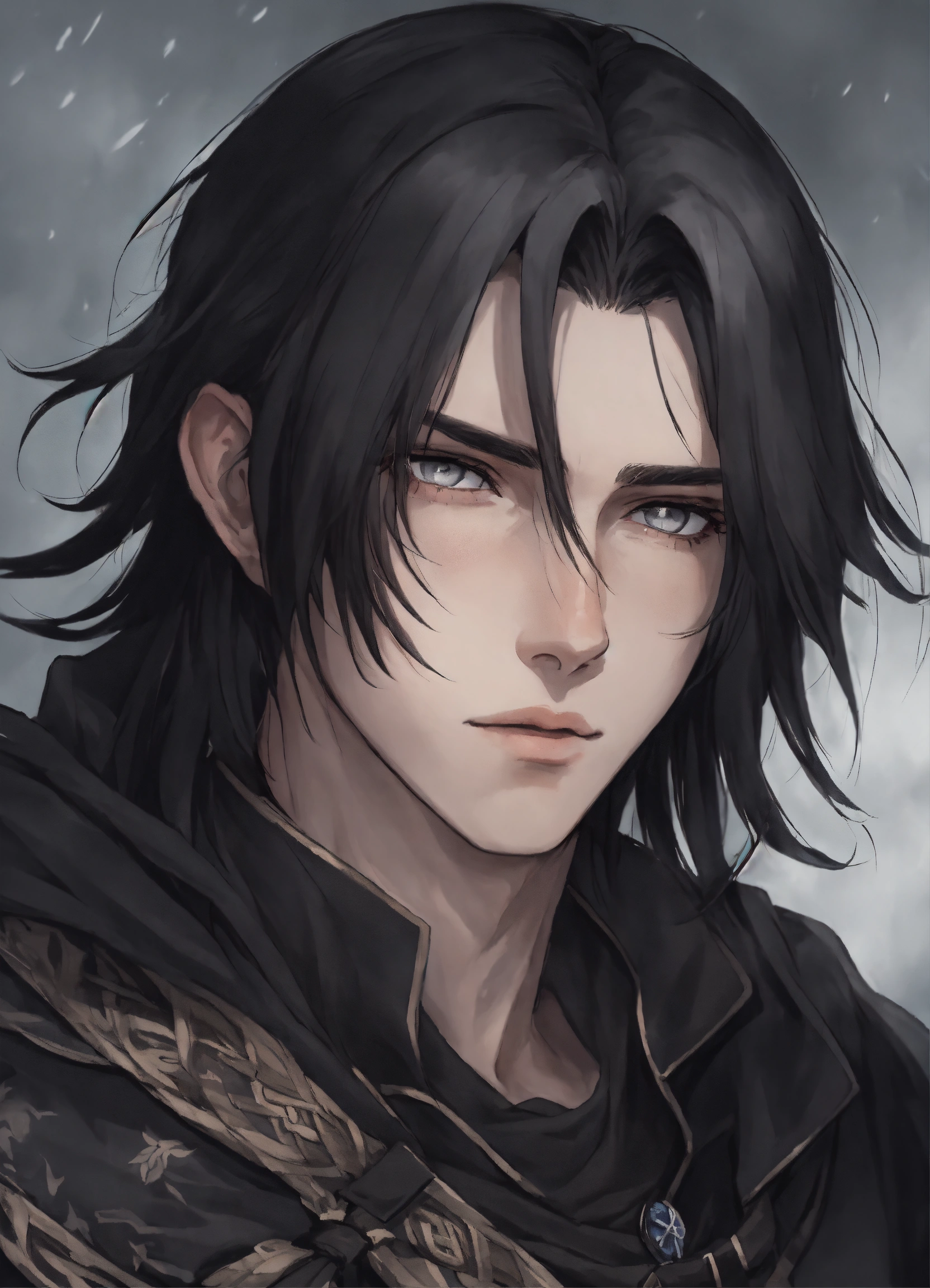 Anime style, 20-year-old slavic man, dark black straight shoulder length hair, grey eyes, deathly pale skin, slvic clothing, dressed in slavic clothes in anime style