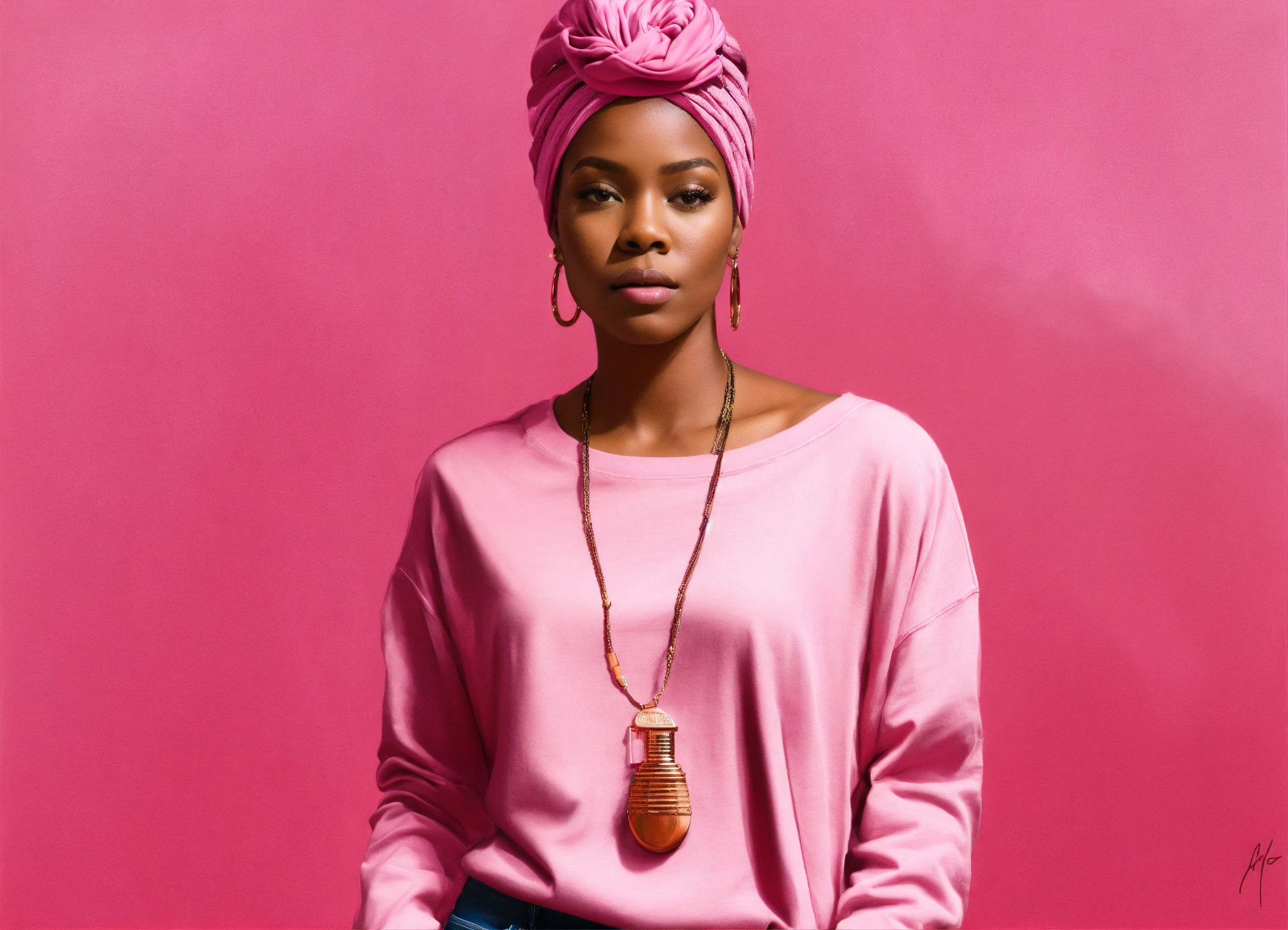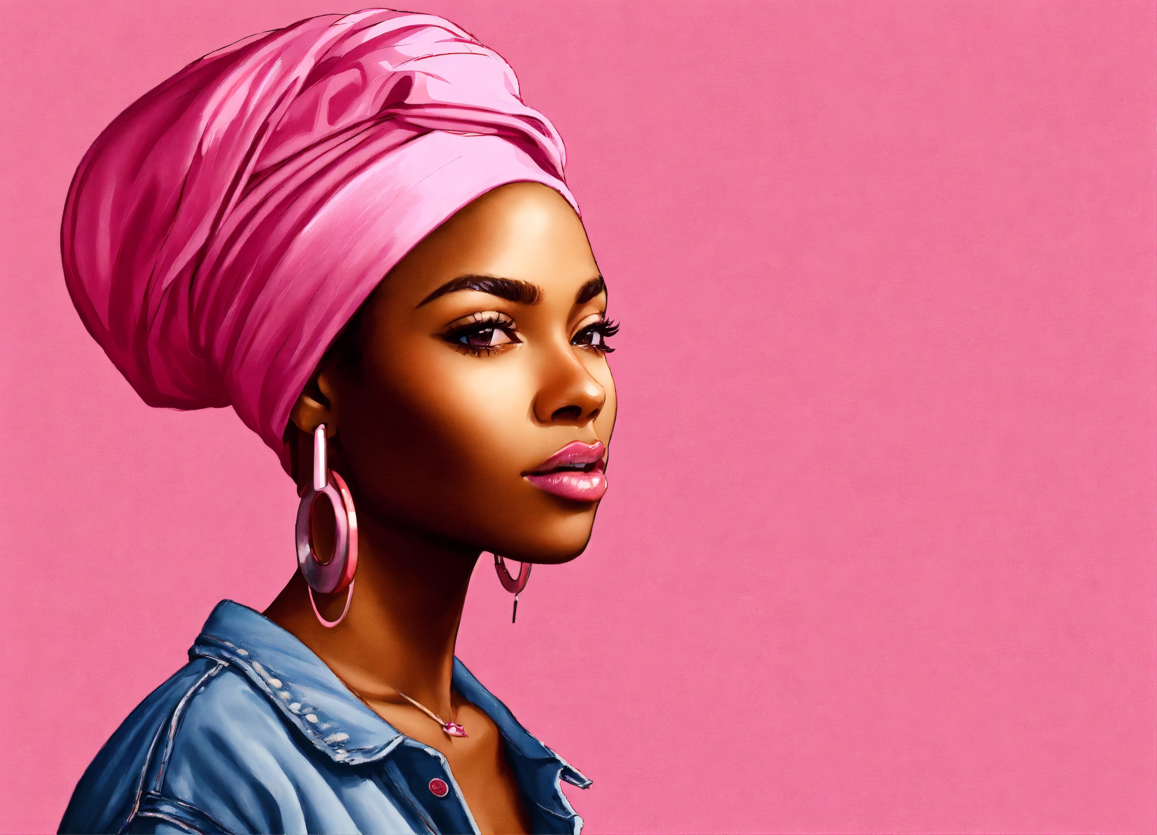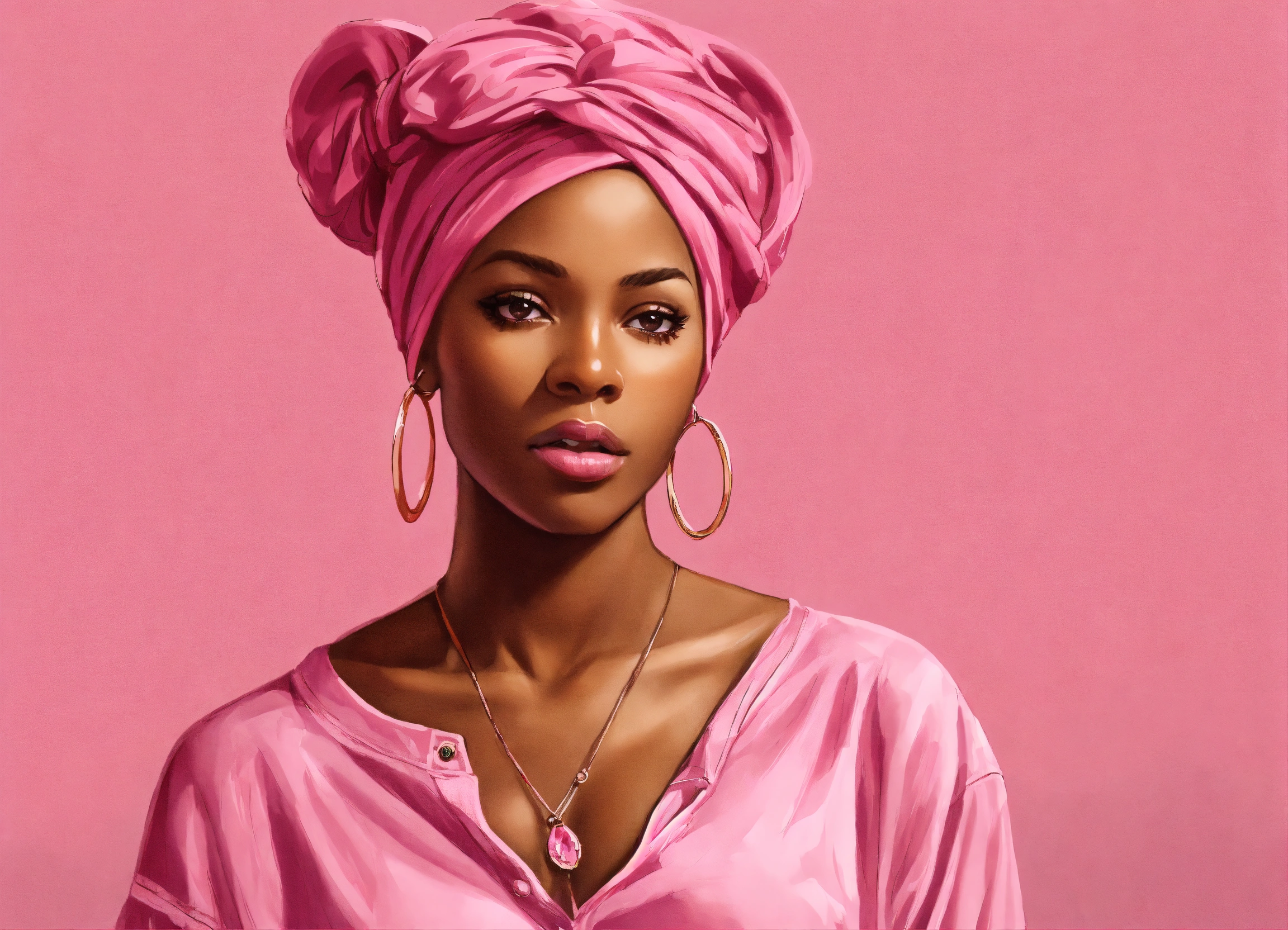 One black woman, dressed in the color pink.... with a pink head wrap full body, intricate, casually dressed in jeans and a long sleeved pink t-shirt, highly detailed, digital painting, smooth, sharp focus