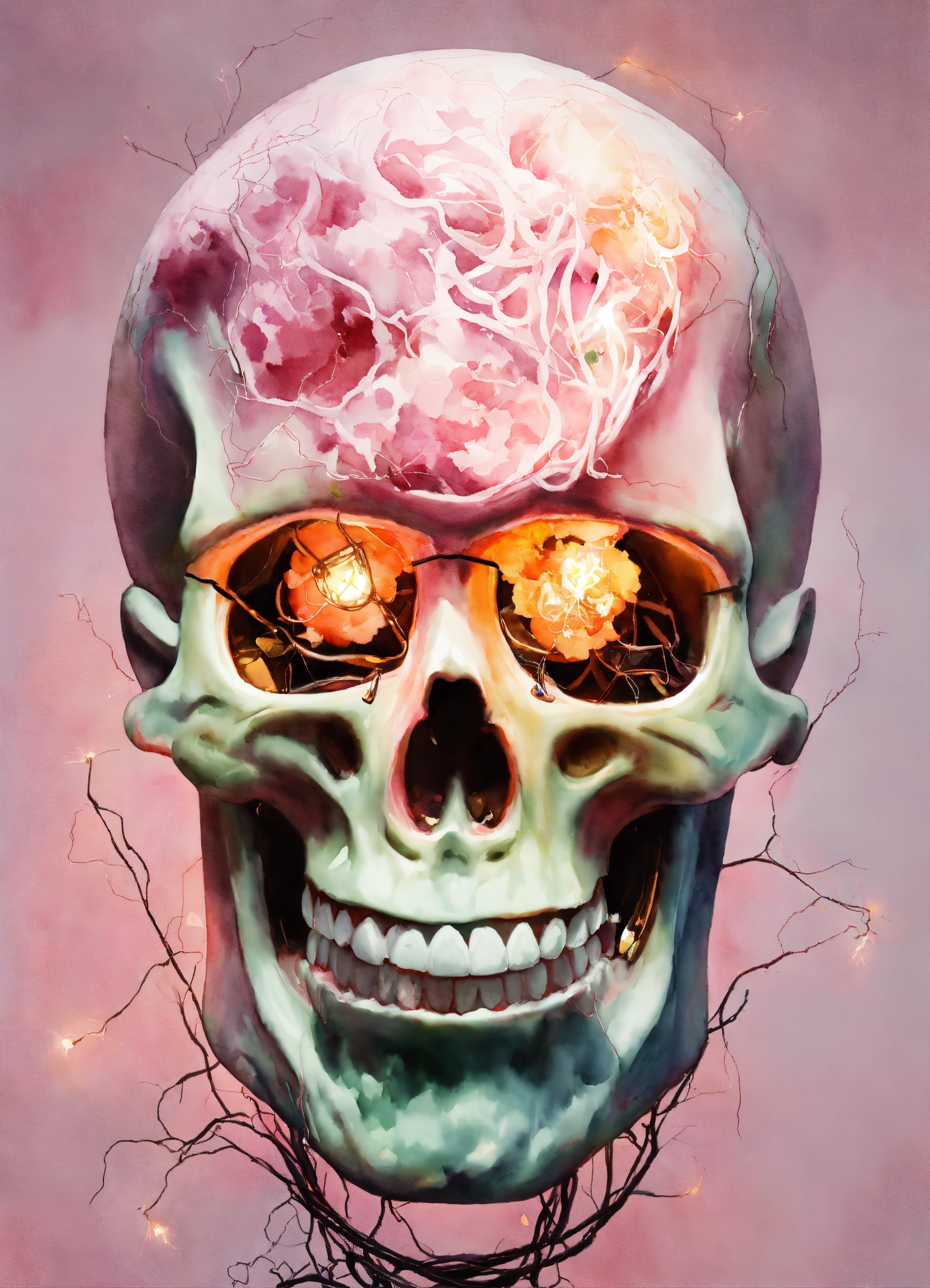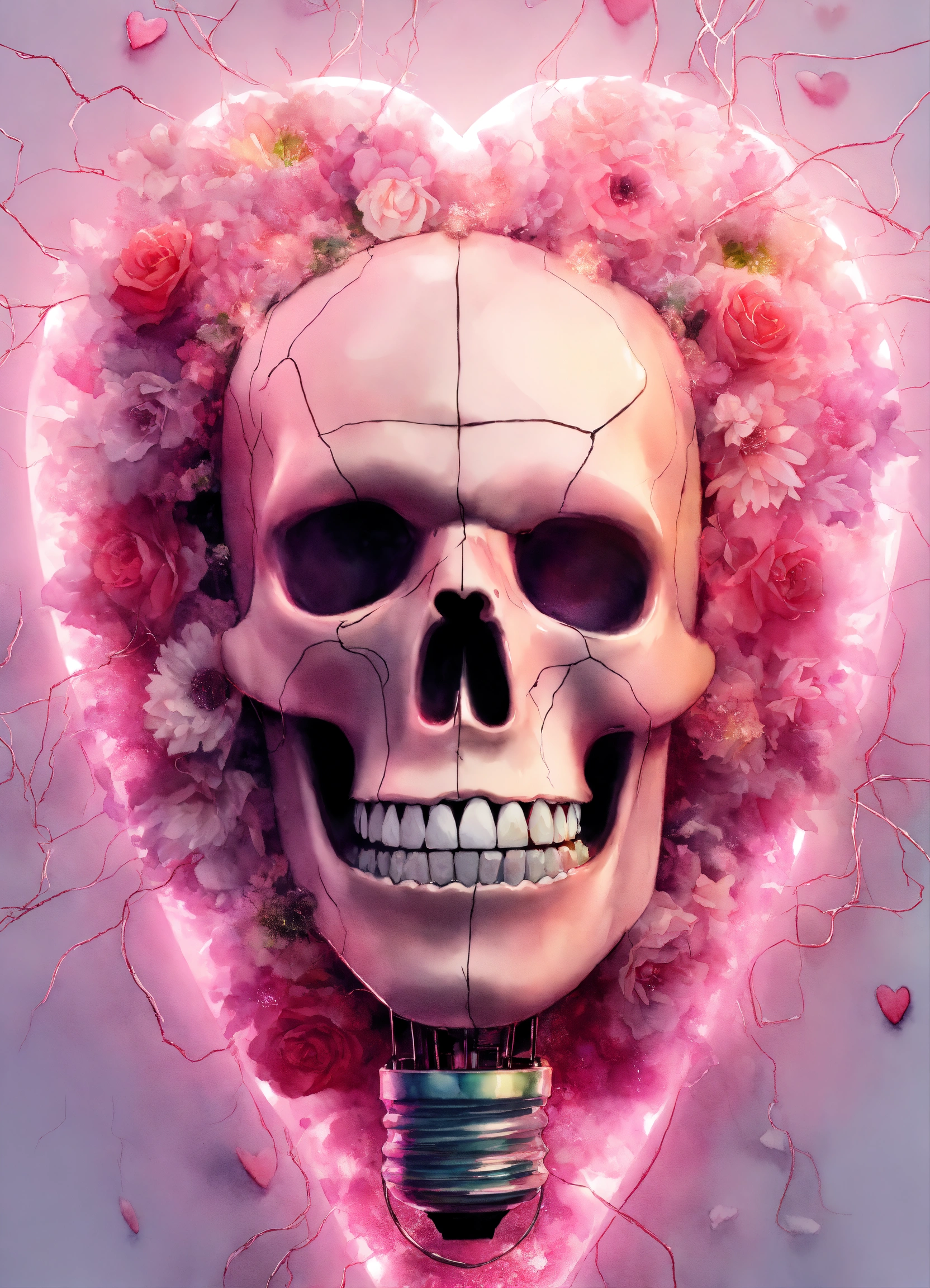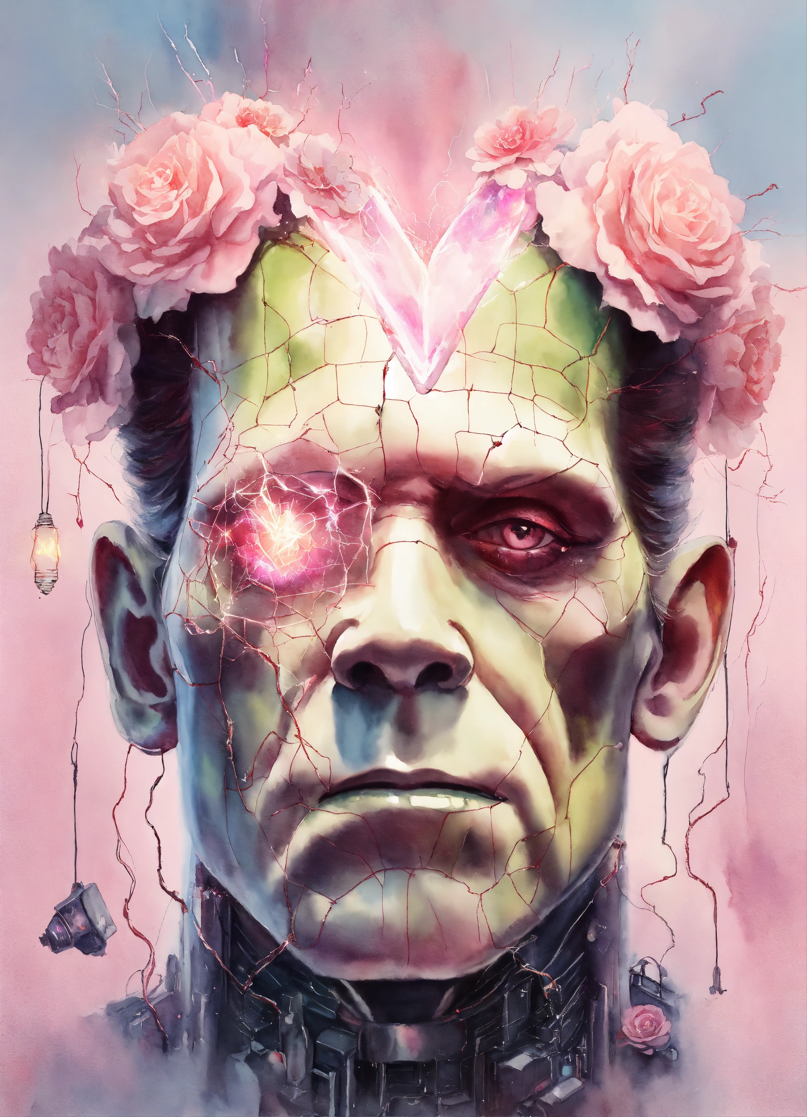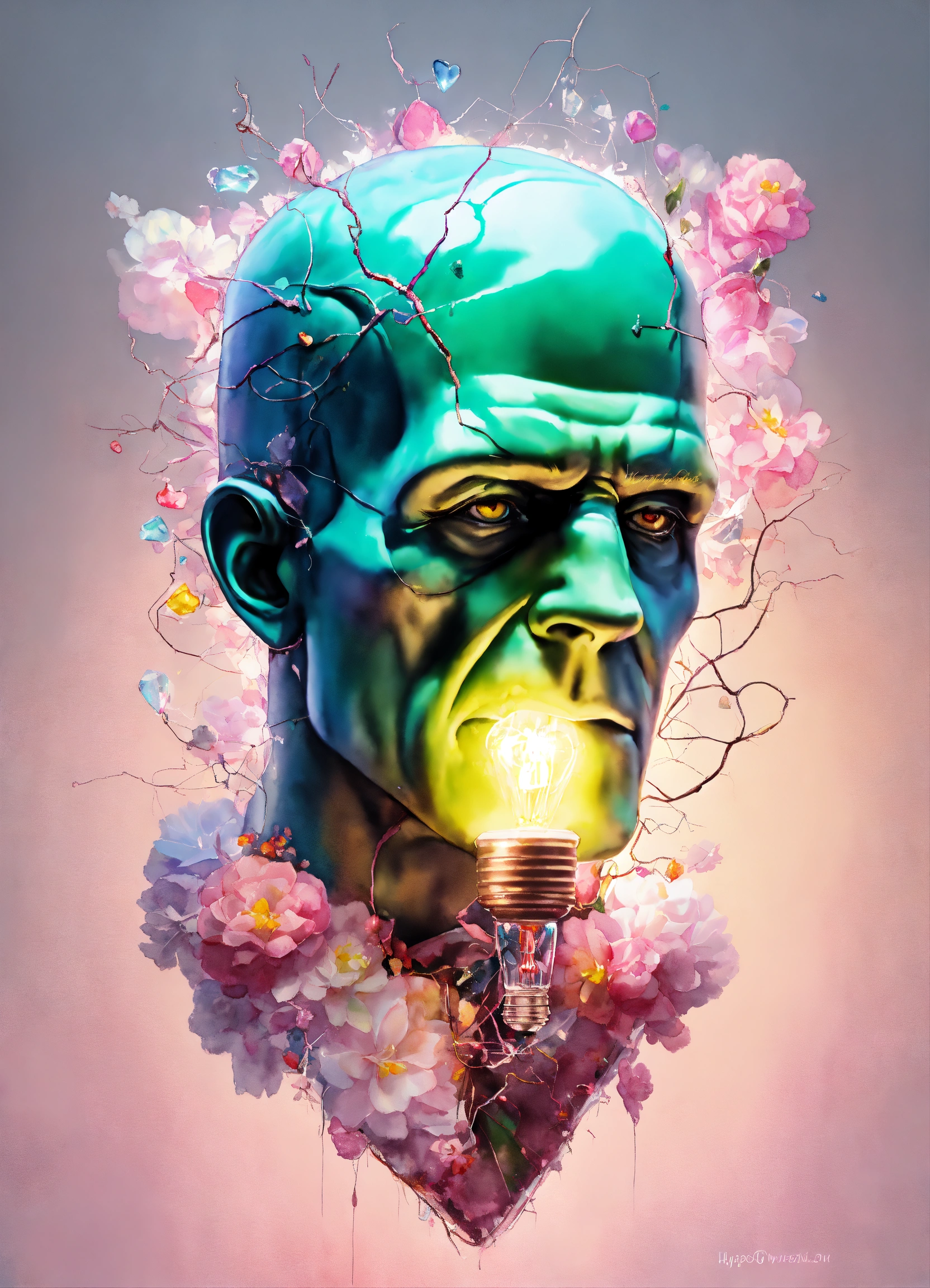 Pastel light pink frankenstein inside, edison lightbulb heart shaped, hyper hyperrealistic hyperulticolored, florals inside, sparks, electricity, sharp image, painting, watercolor, fractal gems, white background