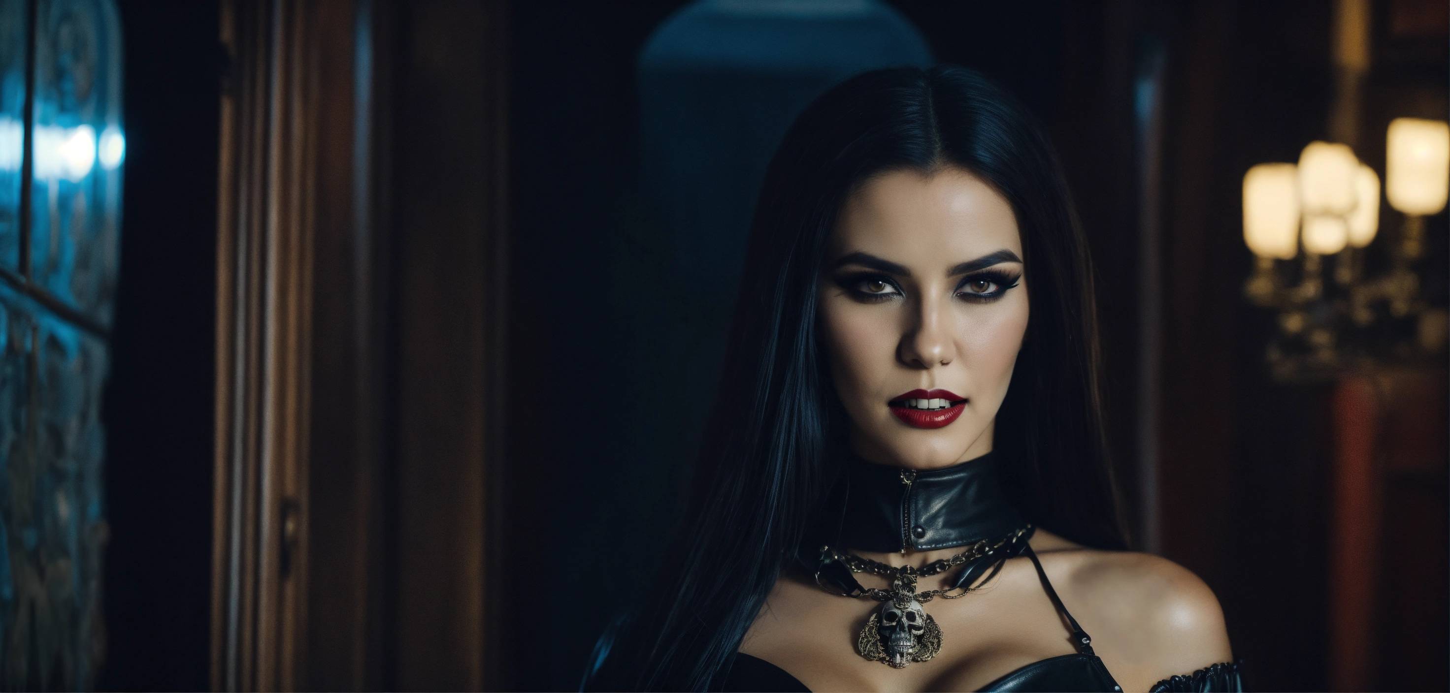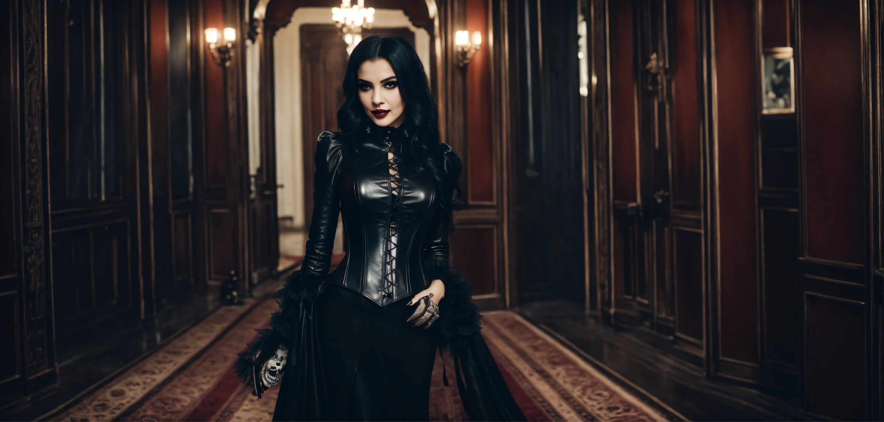 Cinematic look, two stunning arab seductress women fashion model, arrogant evil smile from above showing vampire teeth, black long straight hair, black leather corset, long strict victorian governess wide black long leather shirt dress with long big puff sleeves and big buttons, mansion hall at night haze, white office shirt collar, leather gloves, eyeliner makeup, black leather boots, human skull in one hand, underworld vampire movie style