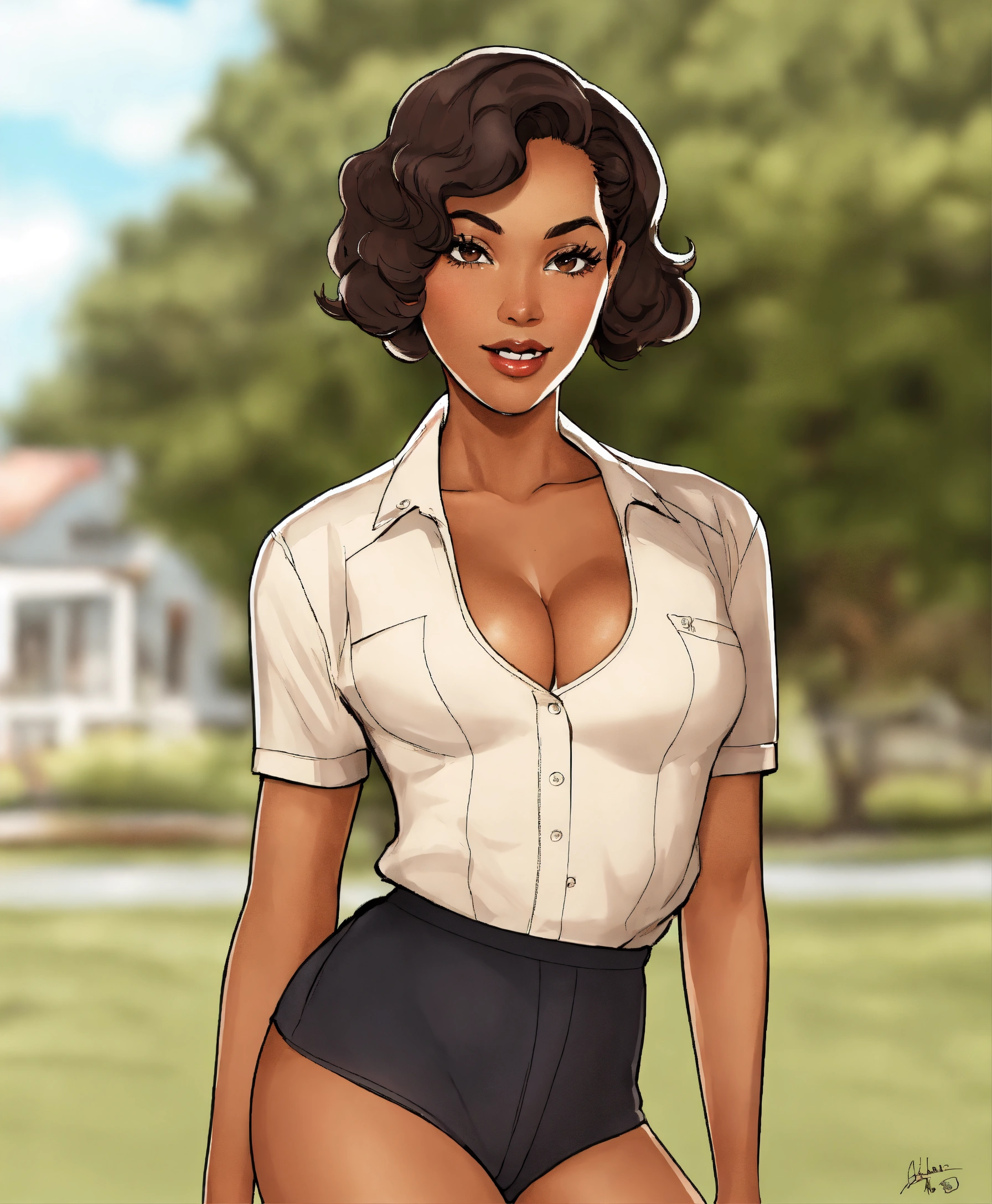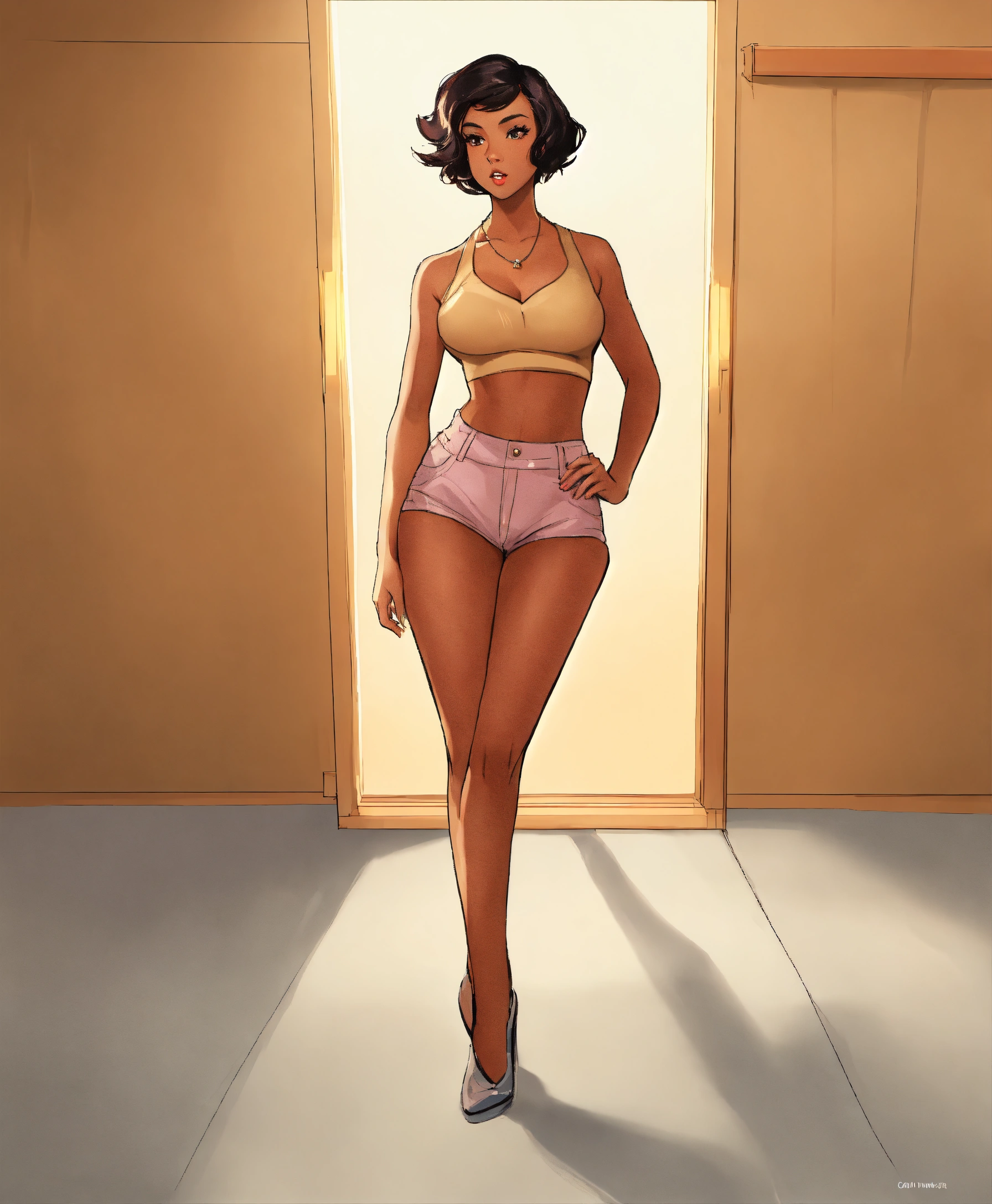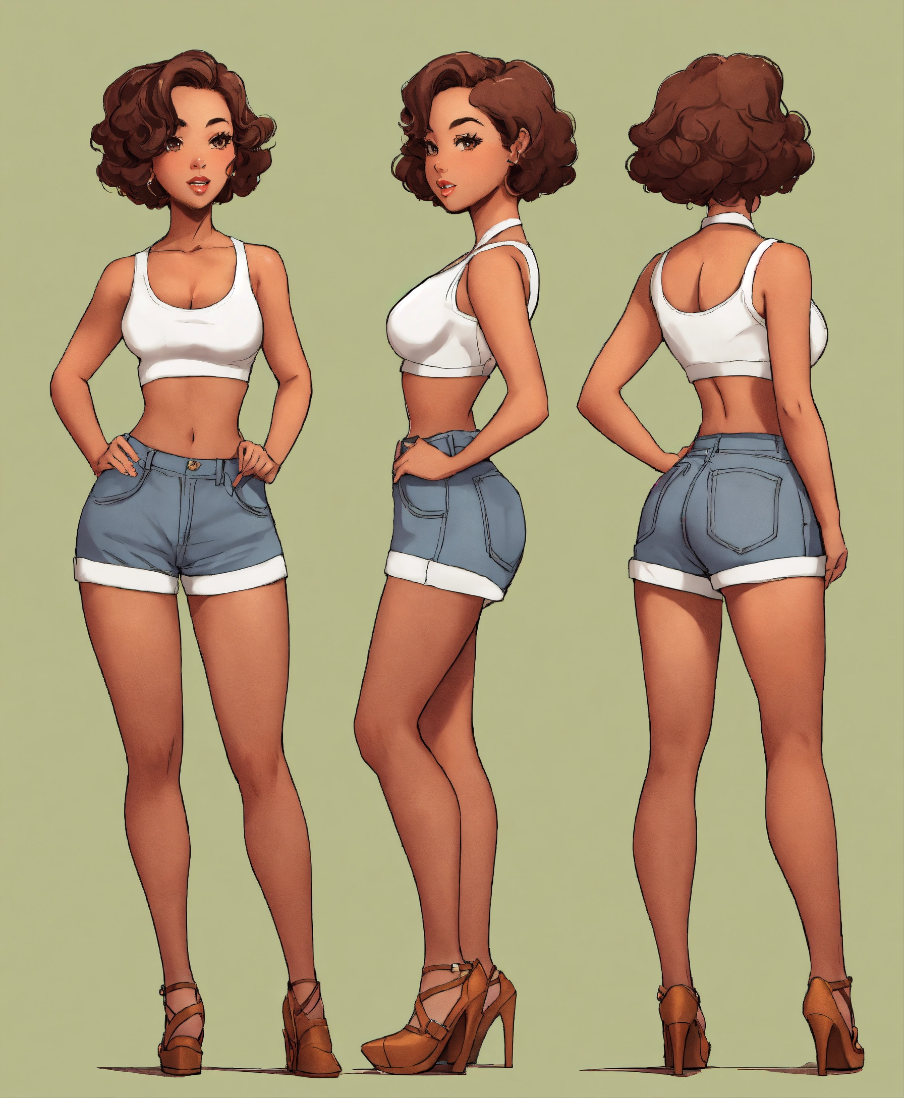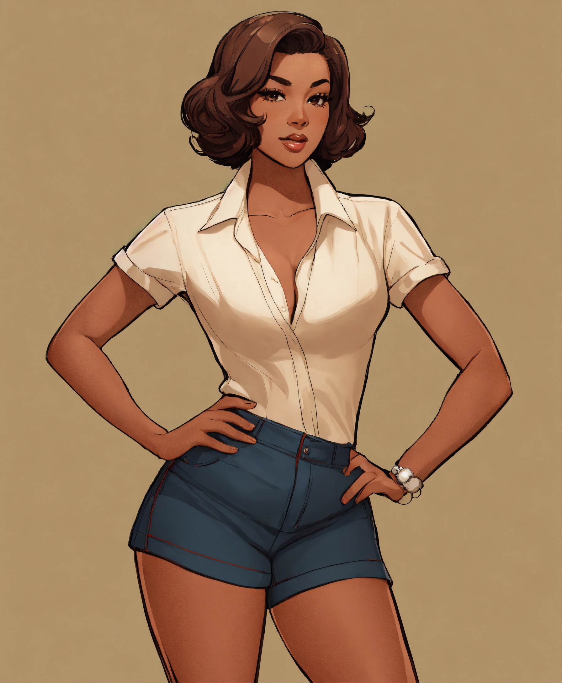 Brown skin, gorgeous 40s woman, white background, short hair, standing, facing front. hd, woman, body asymmetrical, no shadows, tan skin, gorgeous woman, white background, short hair, standing, facing front. hd, 3((((((((((((show whole body)))))), no shadows, cartoon, wearing black shorts, full frame of the body 35mm wide angle shot, pin-up styles, make image into 2d, coloring book