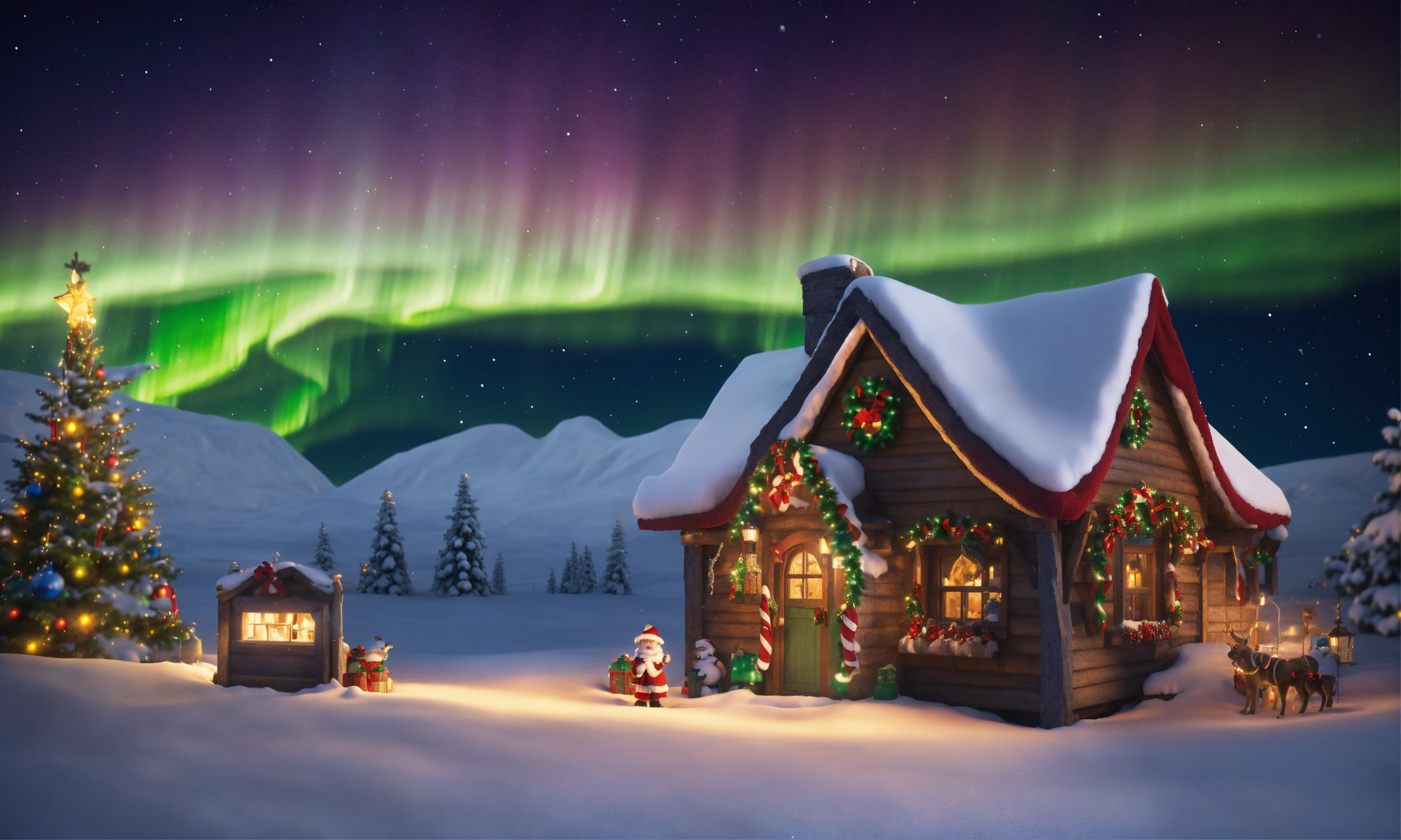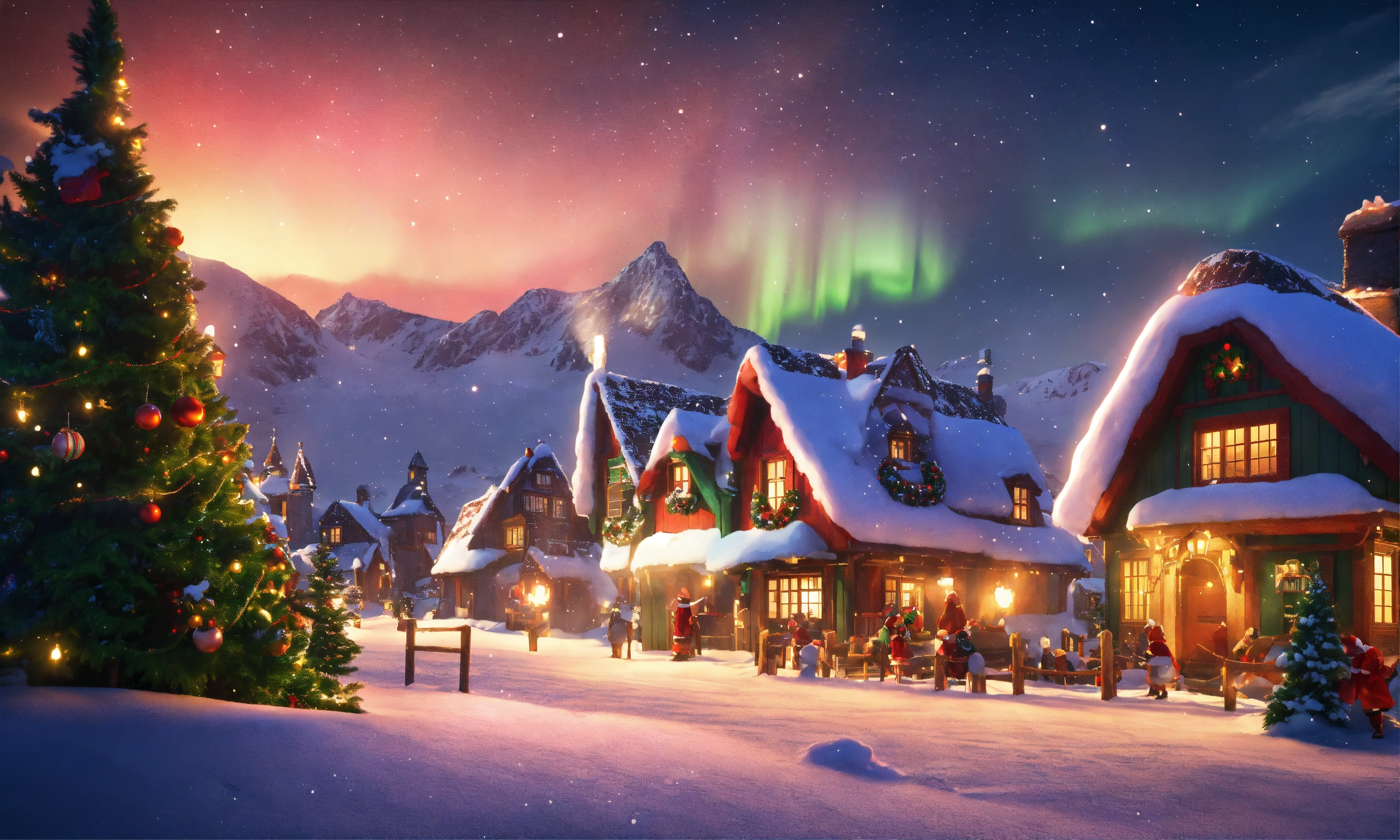 3d“describe a magical christmas scene at the north pole where santa’s workshop is bustling with elves, and the night sky is illuminated by the northern lights, casting a shimmering glow over the snow-covered landscape.”8k hyper realistic