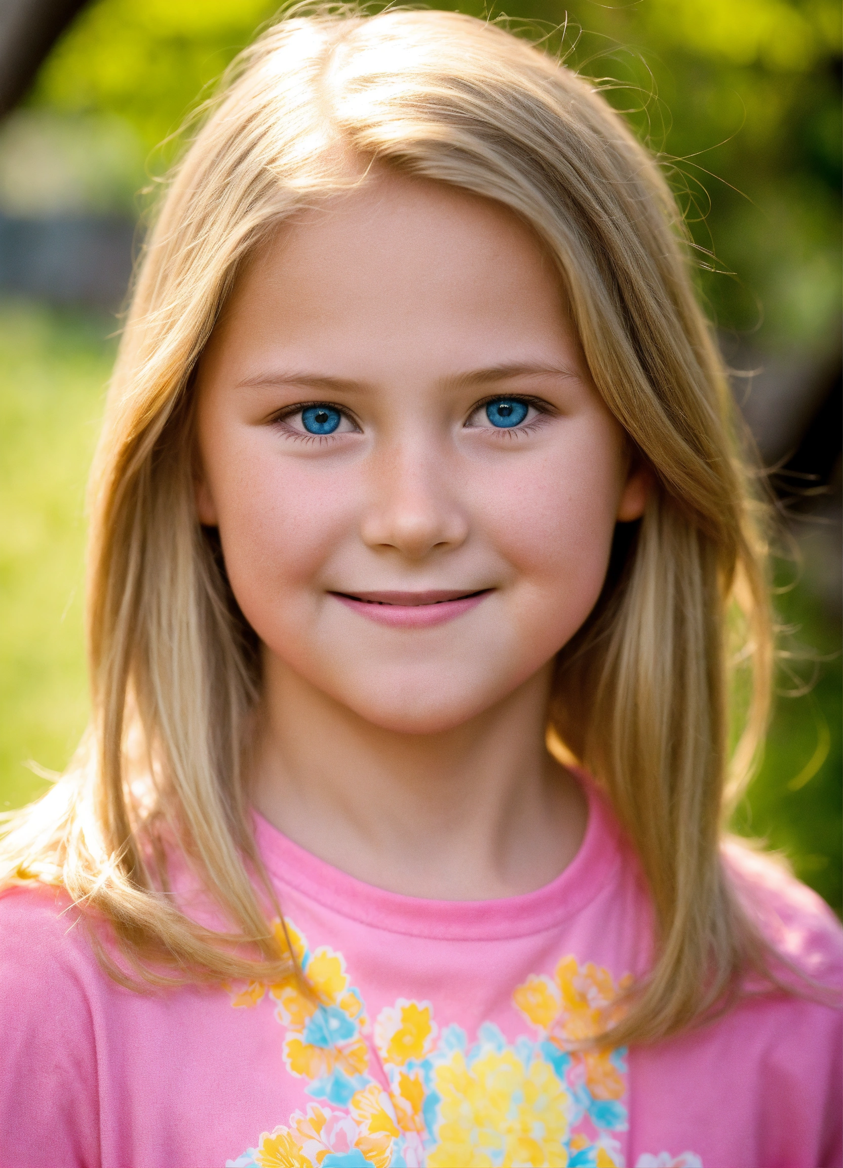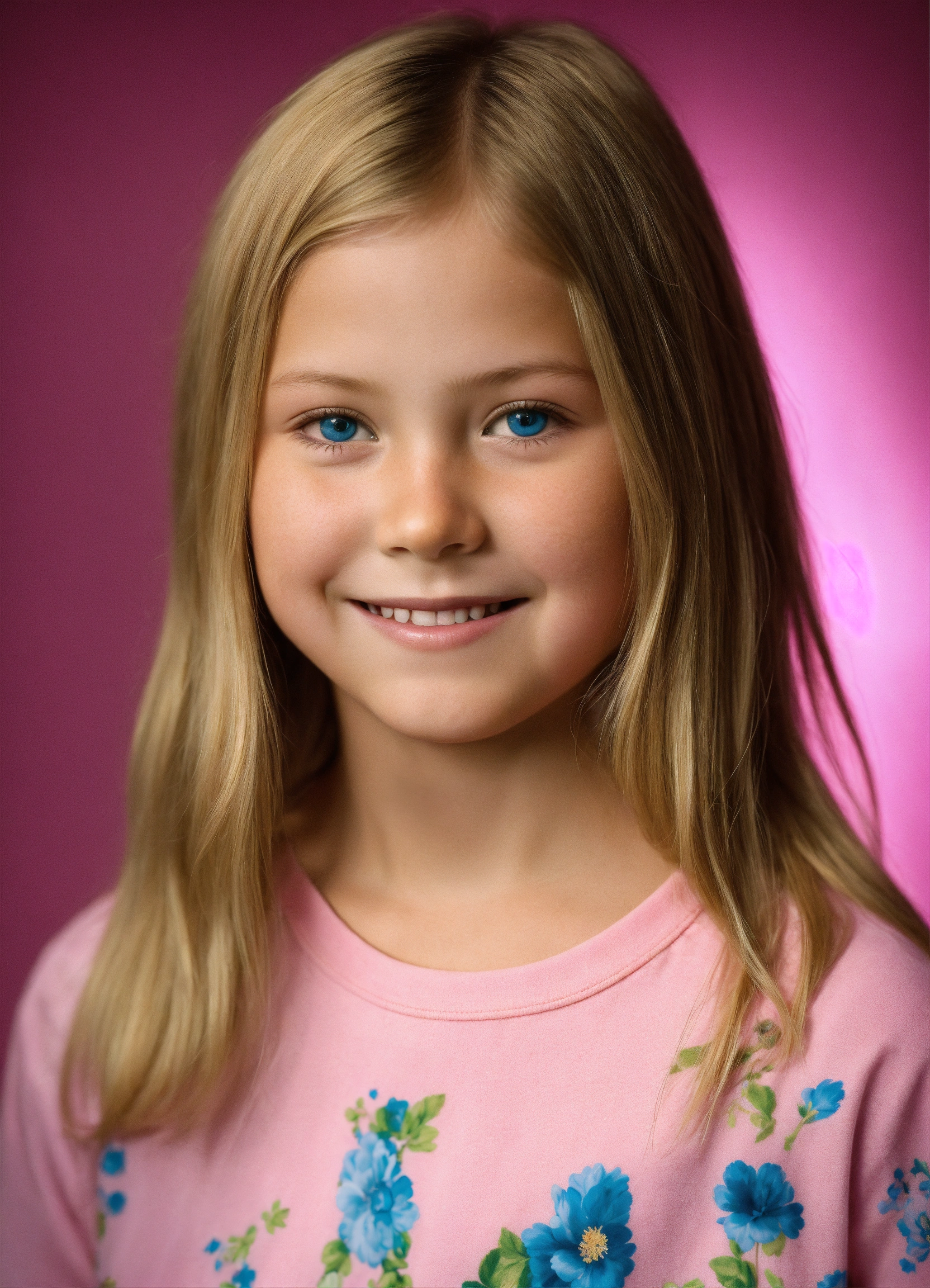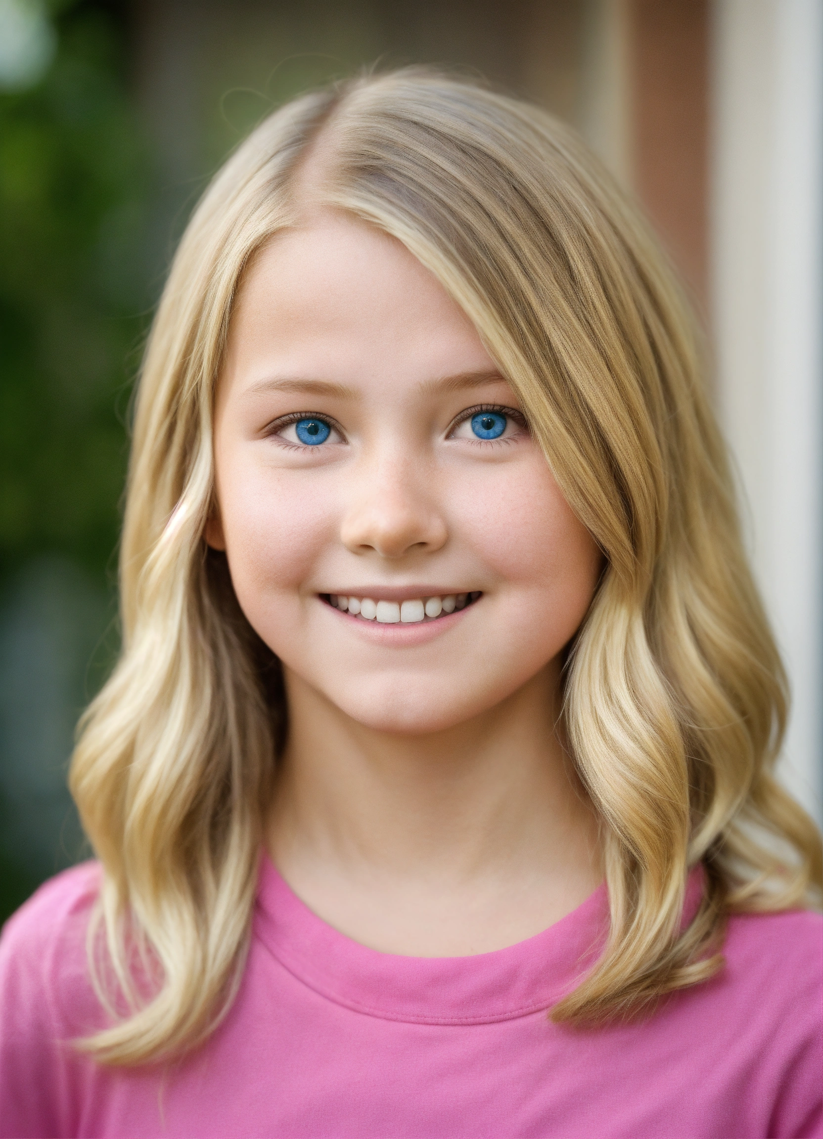 Head shot of a 10 year old girl, she has shoulder length blond hair, she has blue eyes, she is wearing a pink shirt, she is facing forward smiling