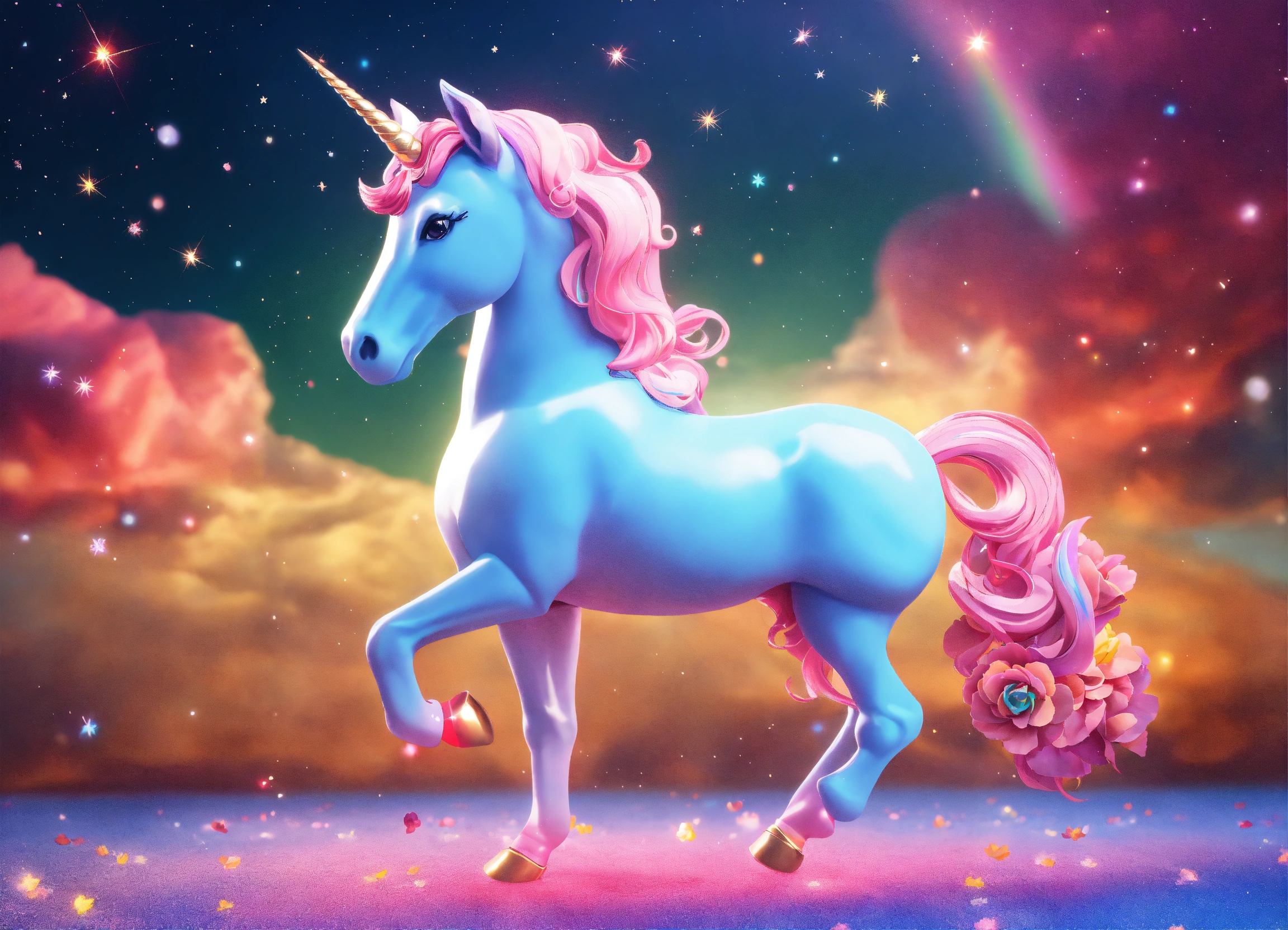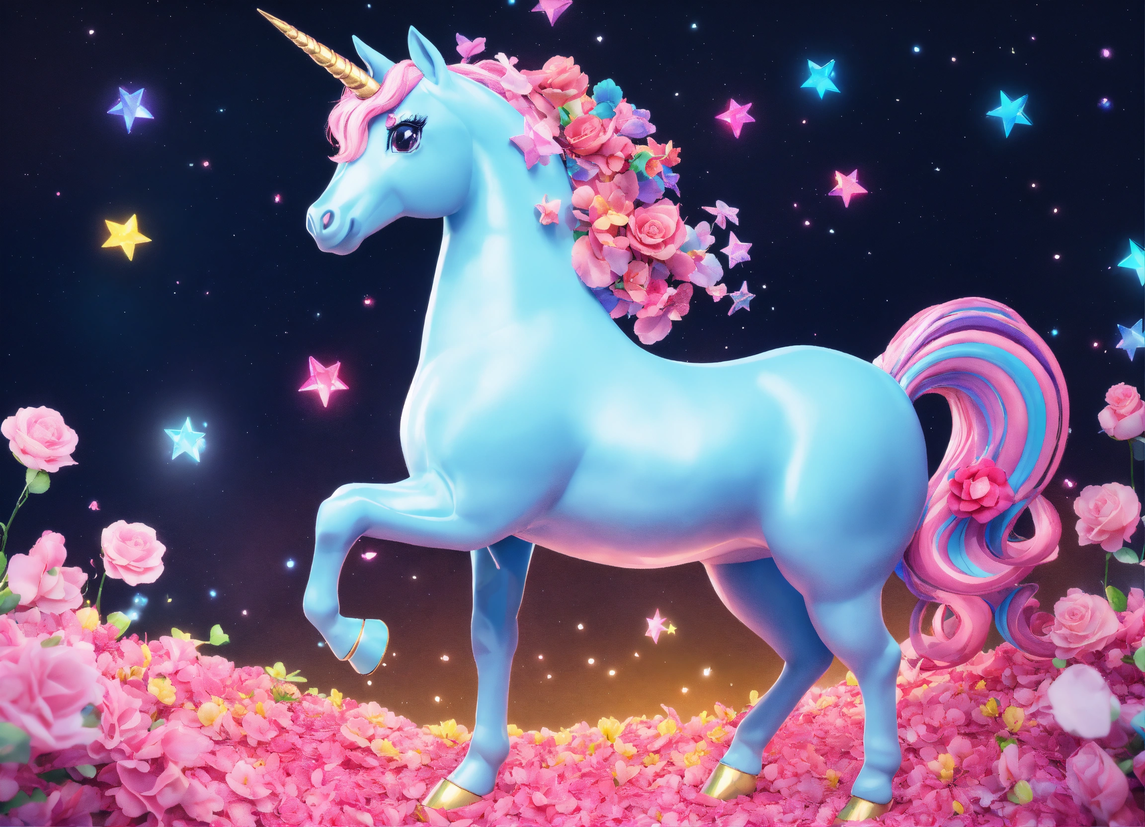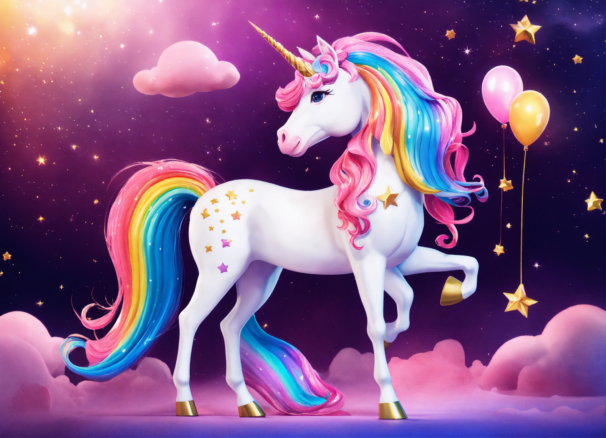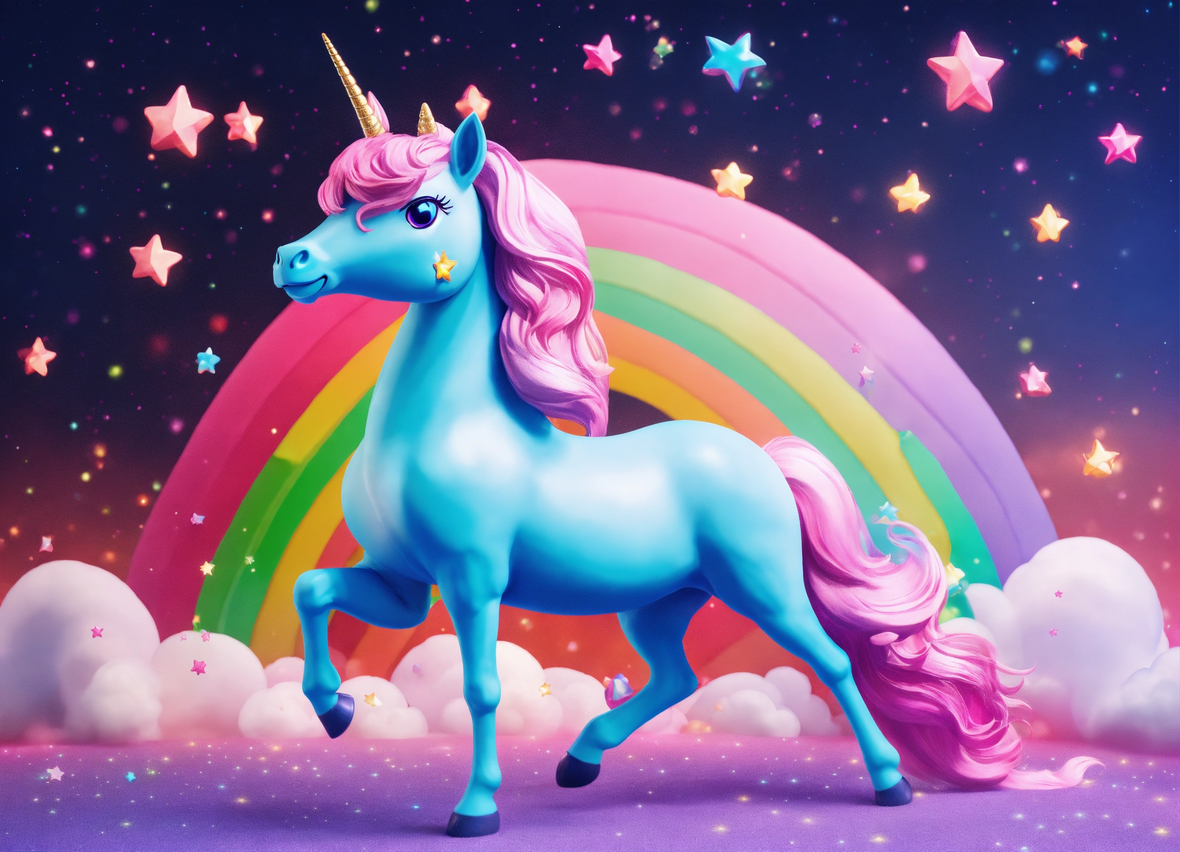 Hermoso unicornio cuerpo completo en 3d caricatura realista, fondo colorido de fantasia con un arcoiris colorido y brillante y nubes rosas con chispas y estrellas