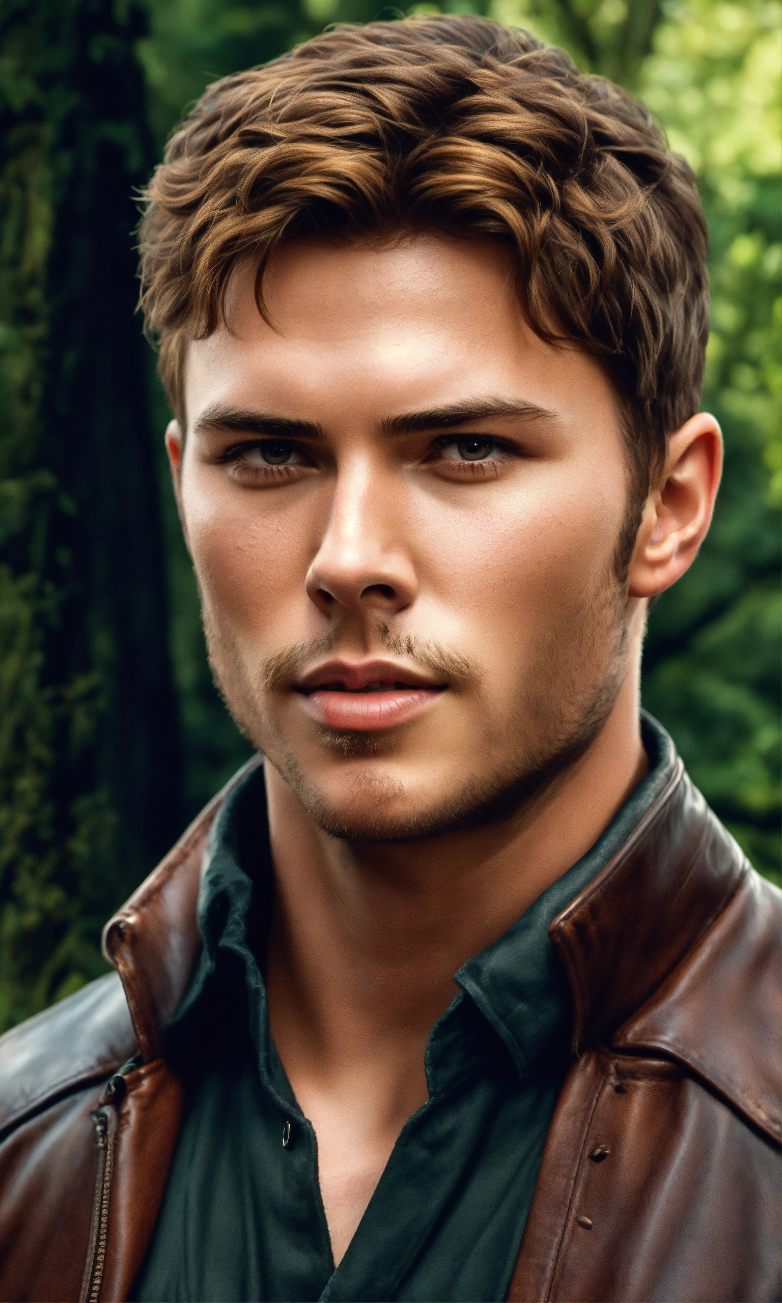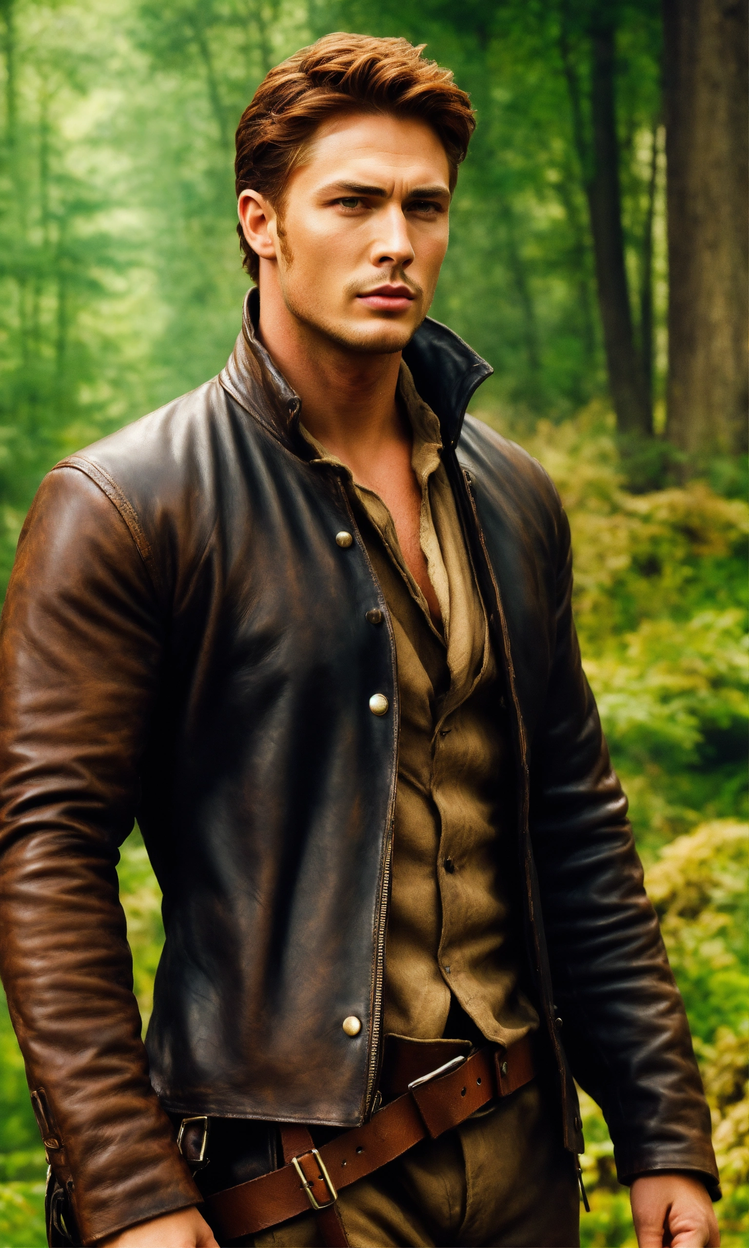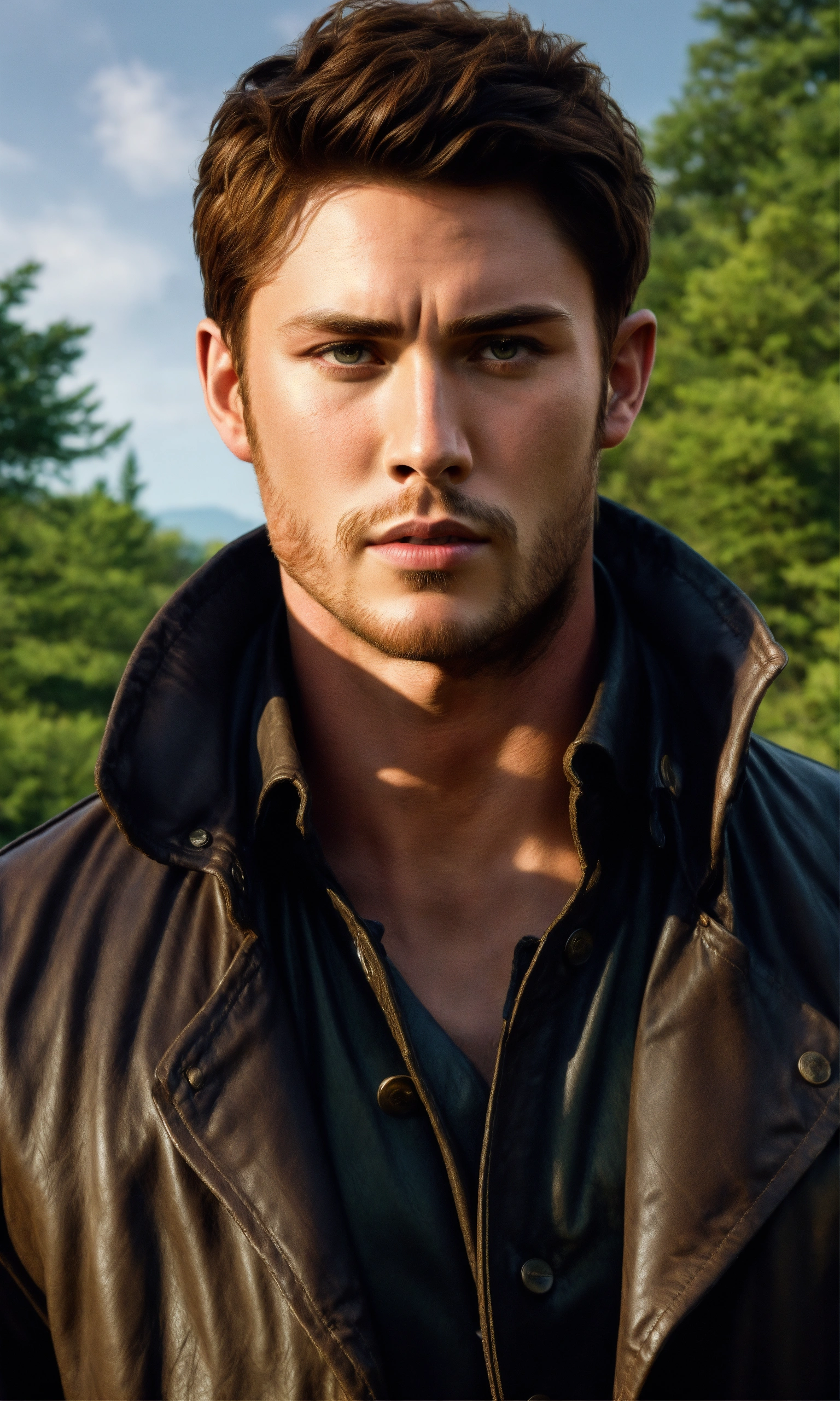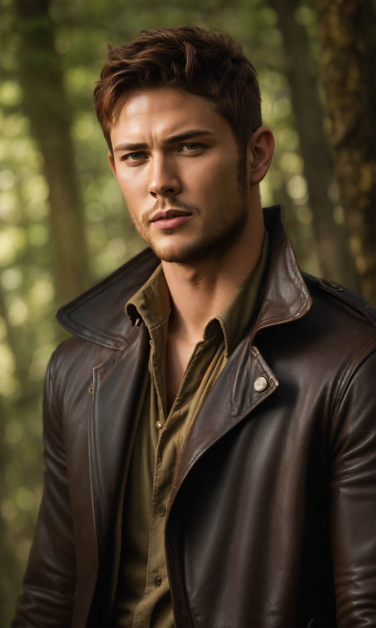 Concept art of handsome period man, poldark, poldark, megan fox, jamie fraser, outlander, period man in forest farm, short ginger red hair, very tan skin, hazel green eyes, jenson ackles, jenson ackles, realistic illustration, sabine rich, artgerm, j scott campbell, perfect body, sharp facial features, slim nose, black eyelashes, perfect full lips, sharp jawline, sharp high cheekbones, dark brown weathered leather jacket, perfect detailed face, cinematic, full body, full body outfit view, flower forest cottage background, full body, tight fitted black pants, tight fitted knee high boots, detailed, realistic illustration, colonial american, casual, dean winchester, short straight hair, dean winchester, short buzz cut hair, black fitted shirt, dean winchester's leather jacket, hyper realistic, dark weathered clothes, dark fabric, dark, dean winchester, jenson ackles face, buzz cut, straight hair, period man