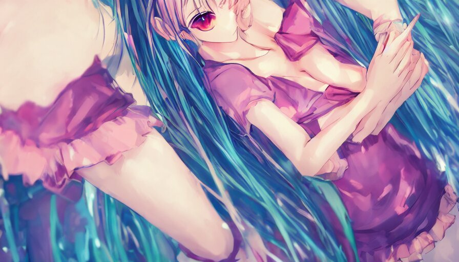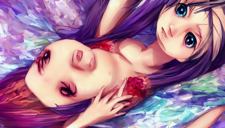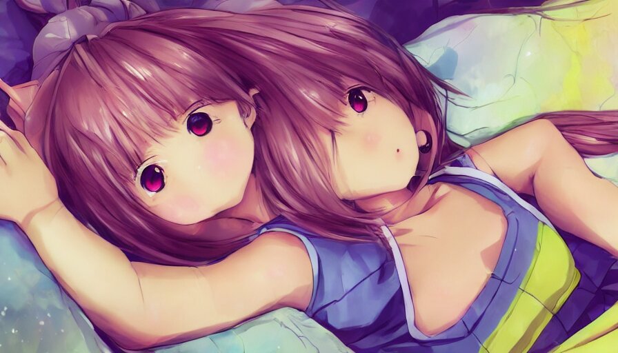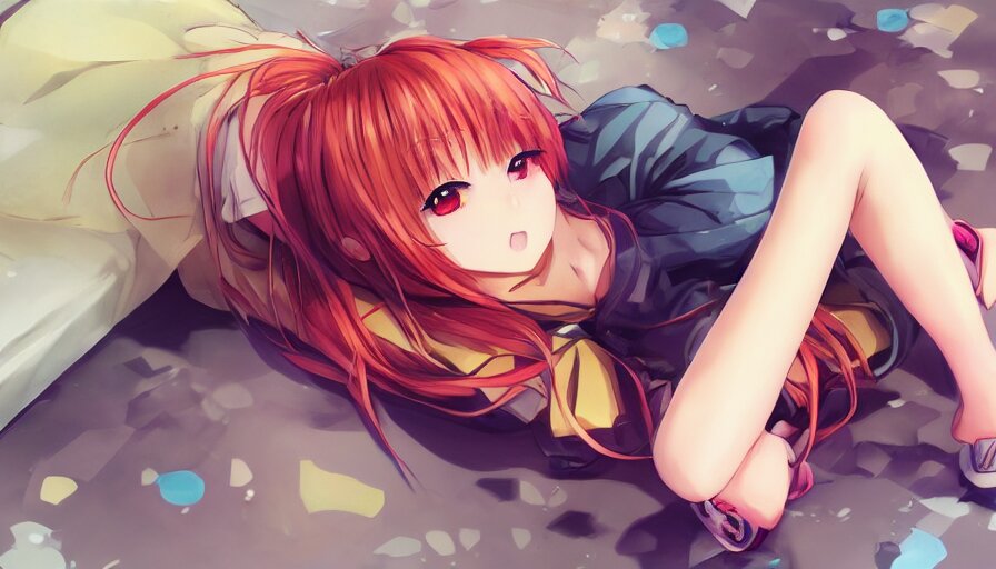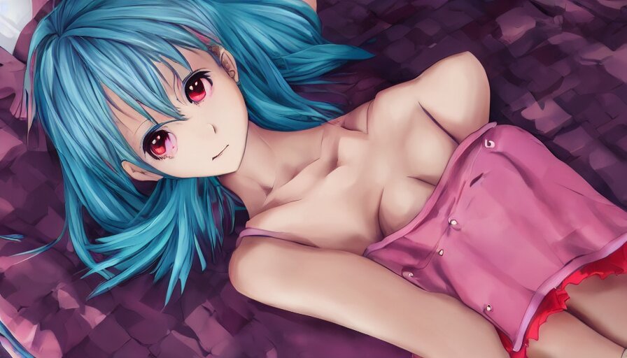 Cute anime character lying down, colorful outfit, realistic face, detailed face, detailed eyes, short miniskirt, lightly dressed, ultra detailed digital art, hyper real, detailed, ultra detailed, ground up angle, full body shot, wide angle