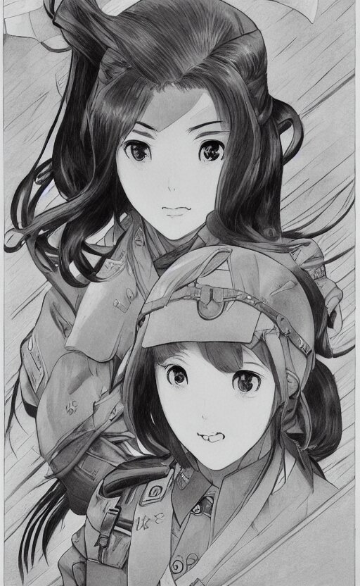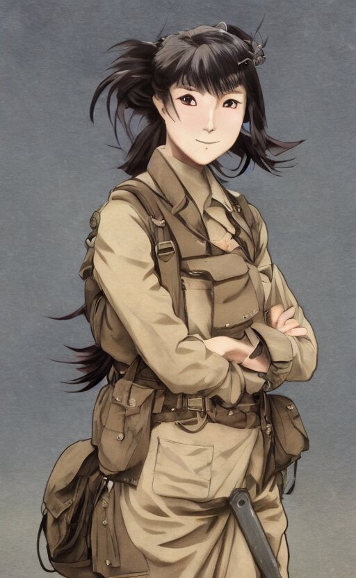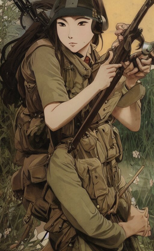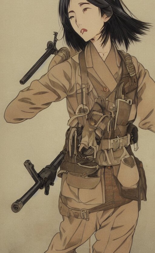 Japanese girl fighting ww2, anime style, long hair, hair down, symmetrical facial features, ww2 era, hyper realistic, pale skin, 4k, rule of thirds, extreme detail, detailed drawing, trending artstation, hd, war, d&d, realistic lighting, by alphonse mucha, greg rutkowski, sharp focus, backlit, soldier clothing