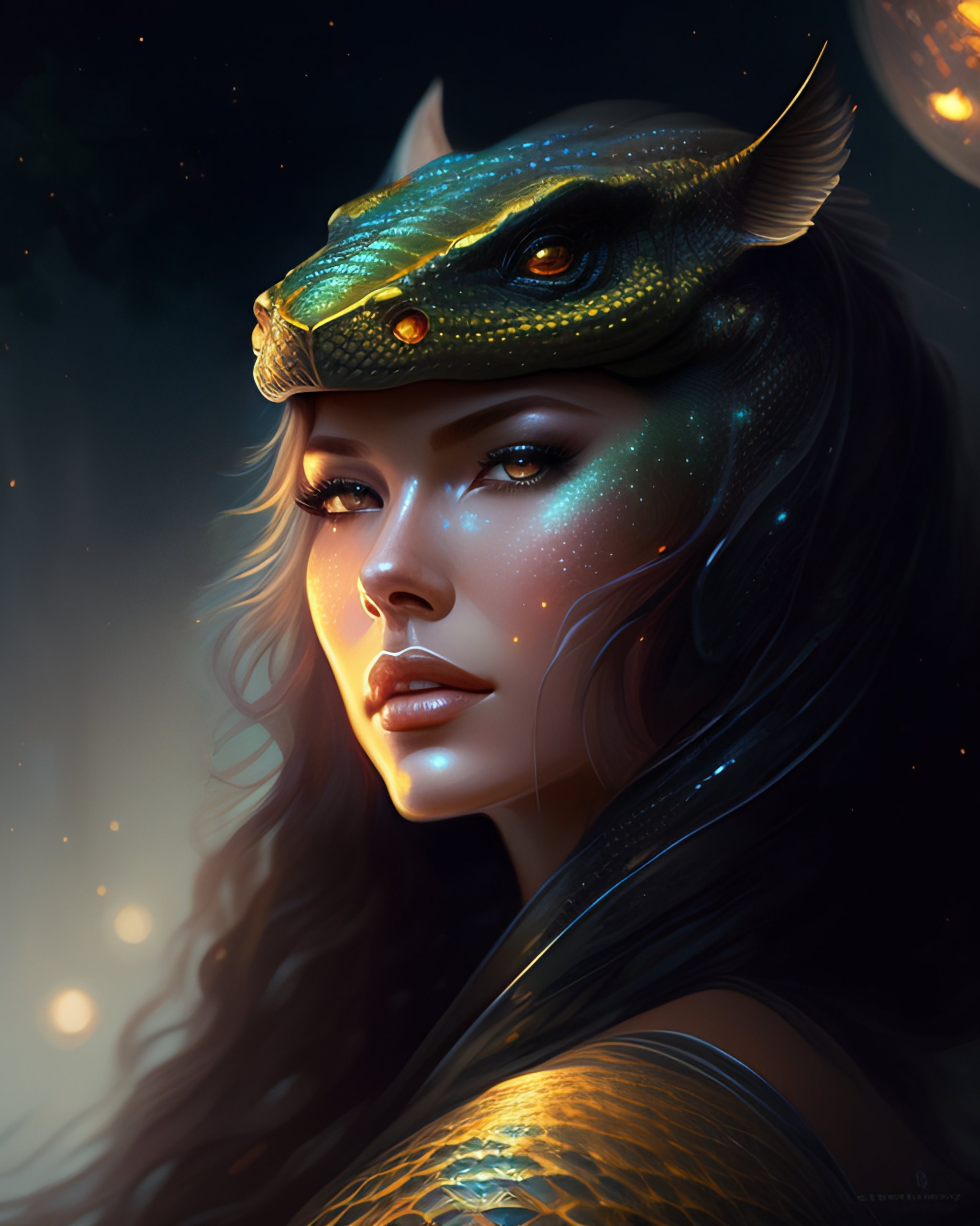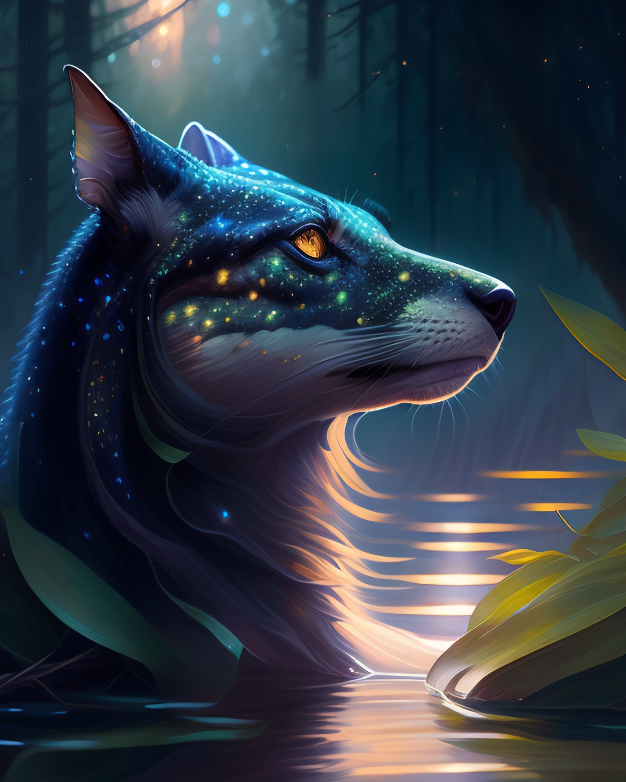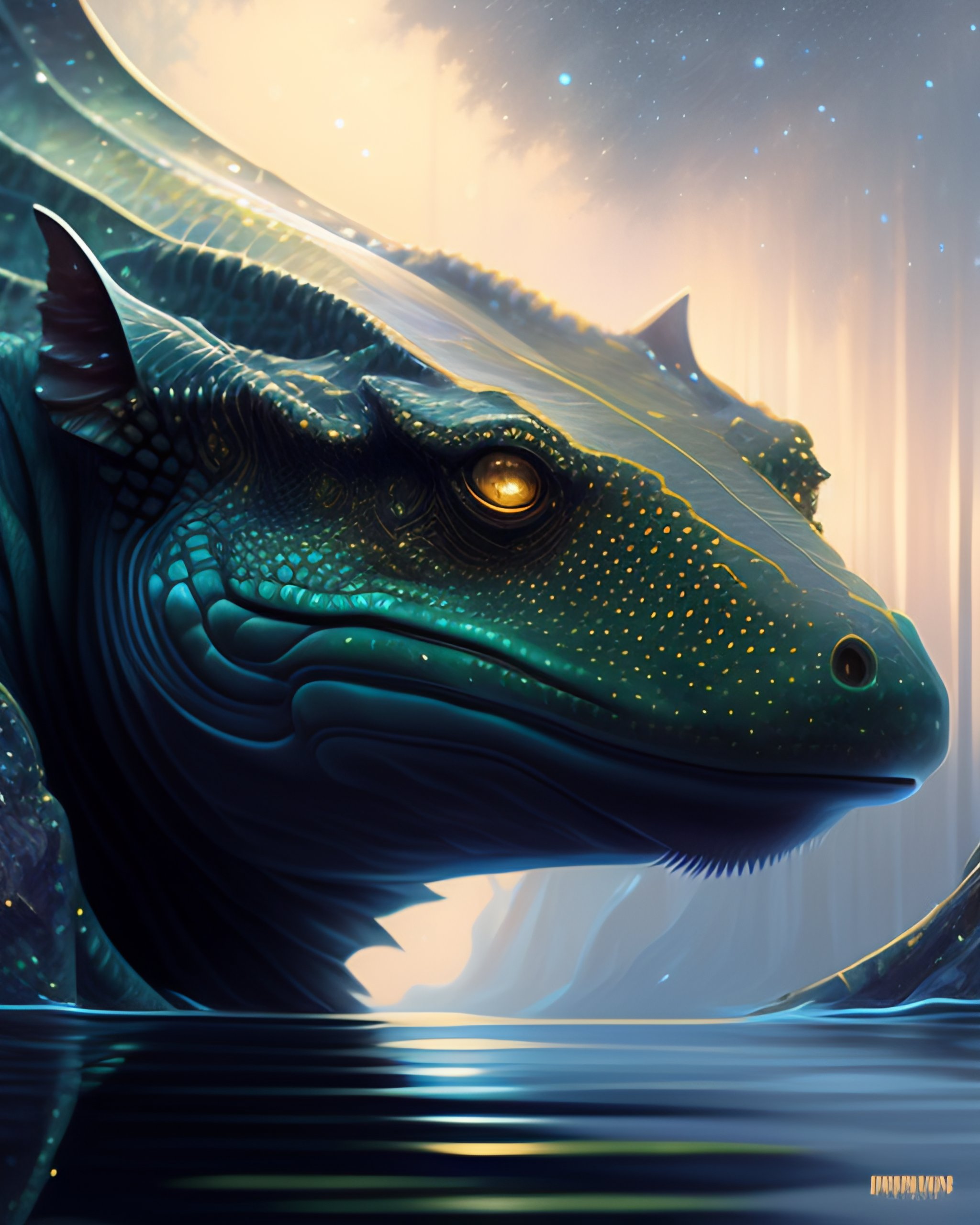 Reptilian creature, starry sky, swamps, highly detailed, digital painting, artstation, concept art, smooth, sharp focus, illustration, art by artgerm and greg rutkowski and alphonse mucha