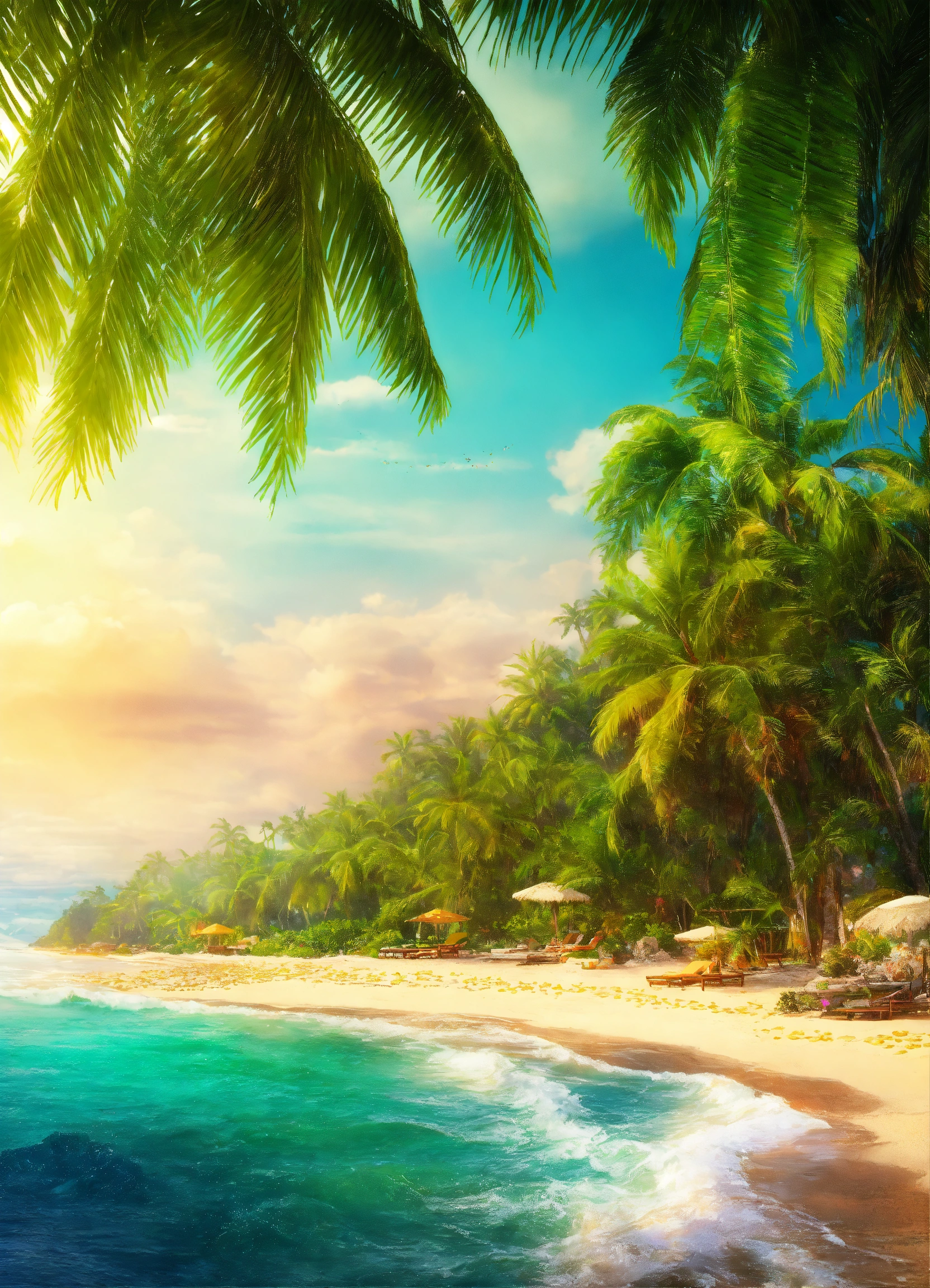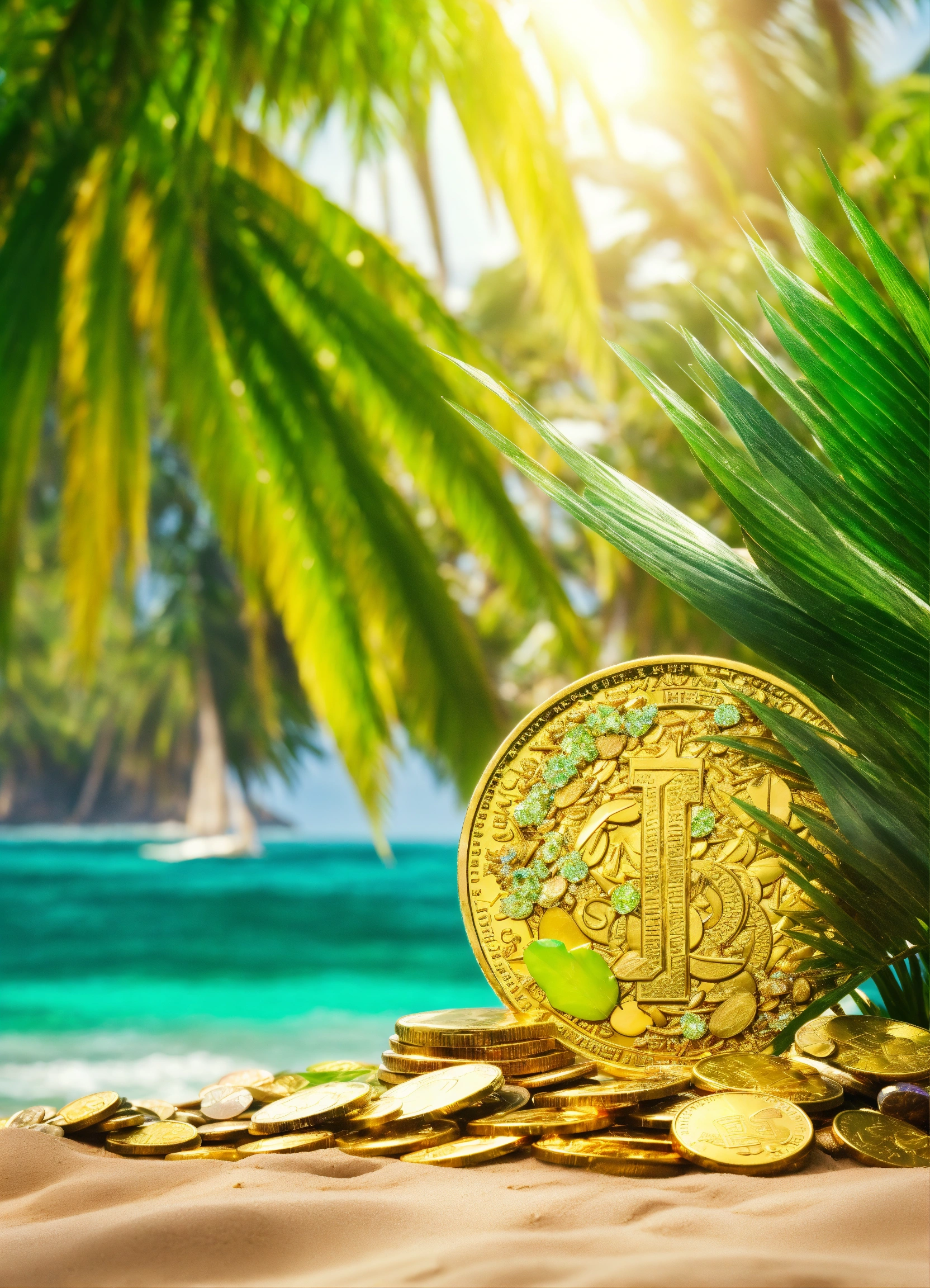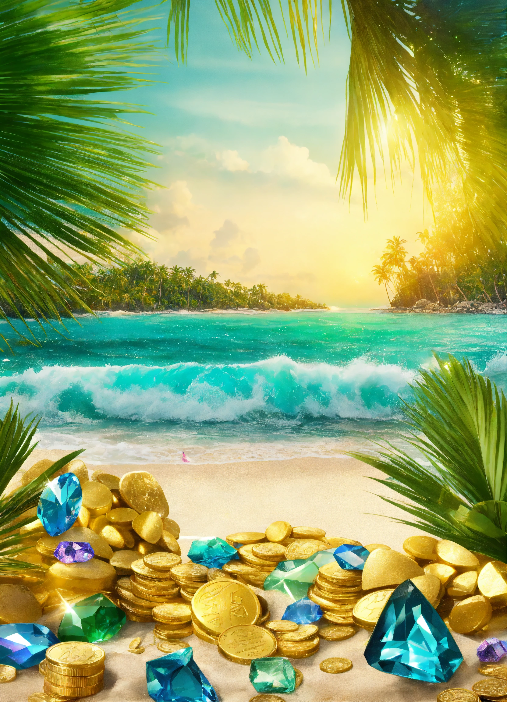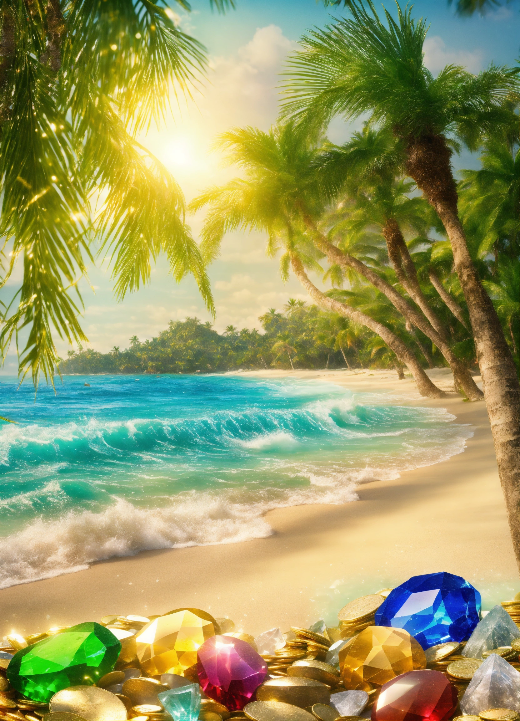 Tropic beach, waves, green palms, on the background - crystals, colorful gemstones, gold, coins, jews, 4k, full hd, realistic