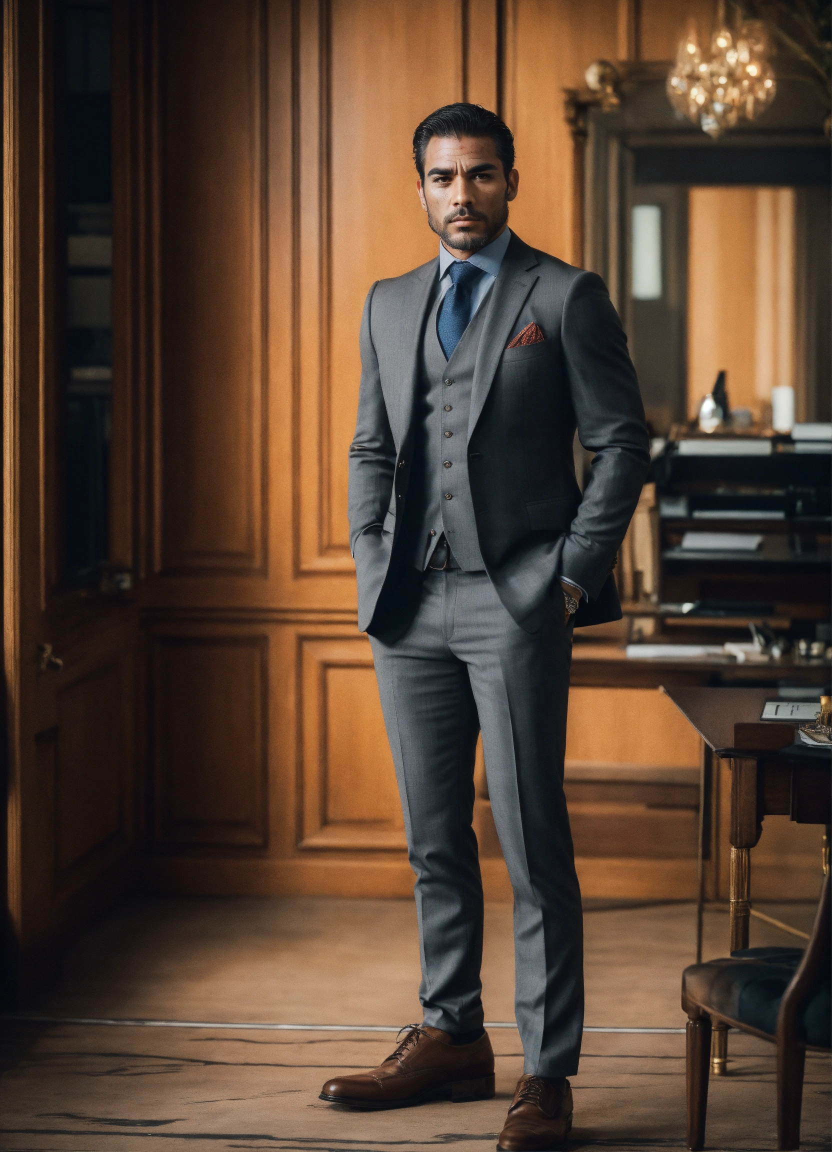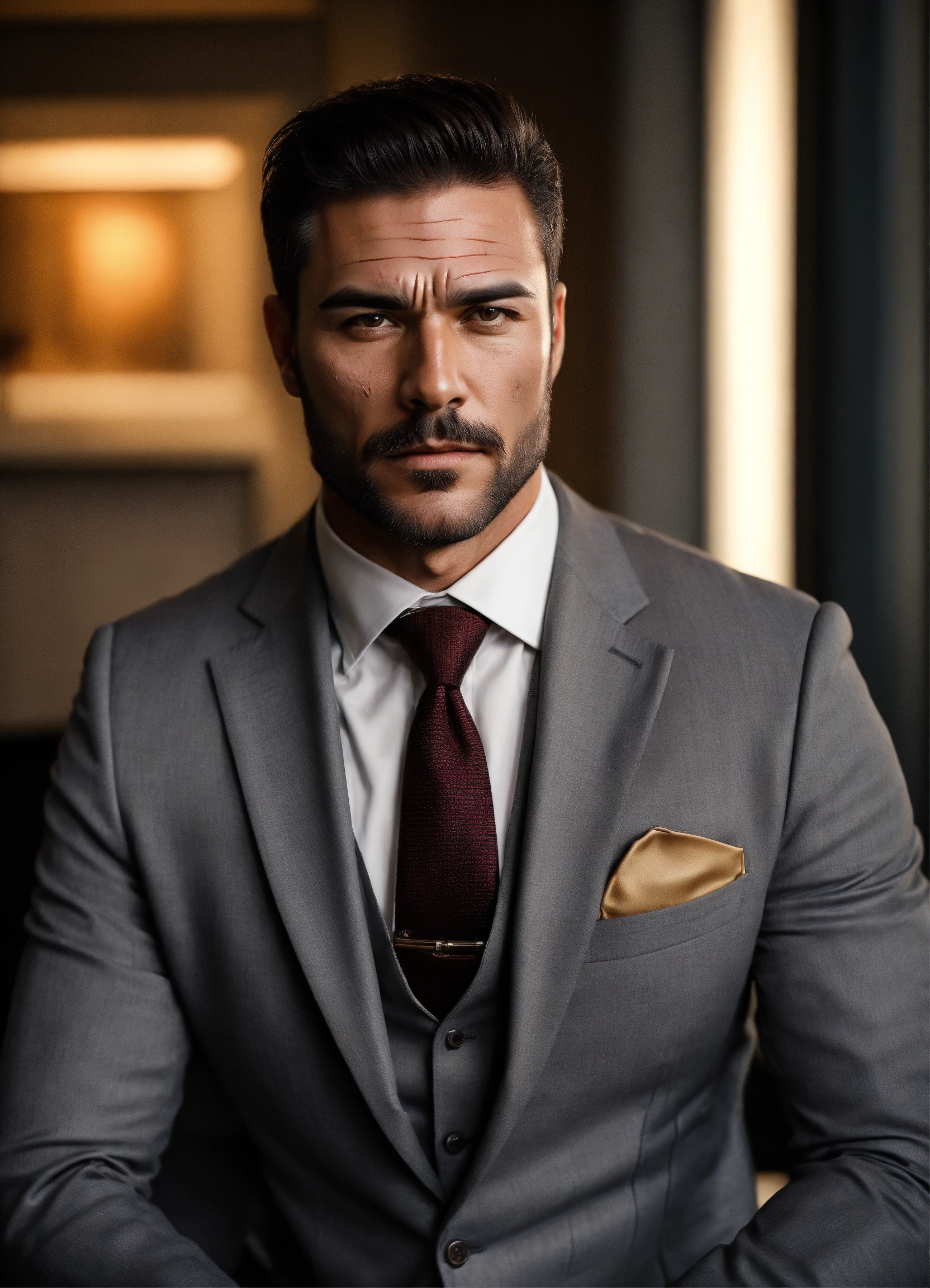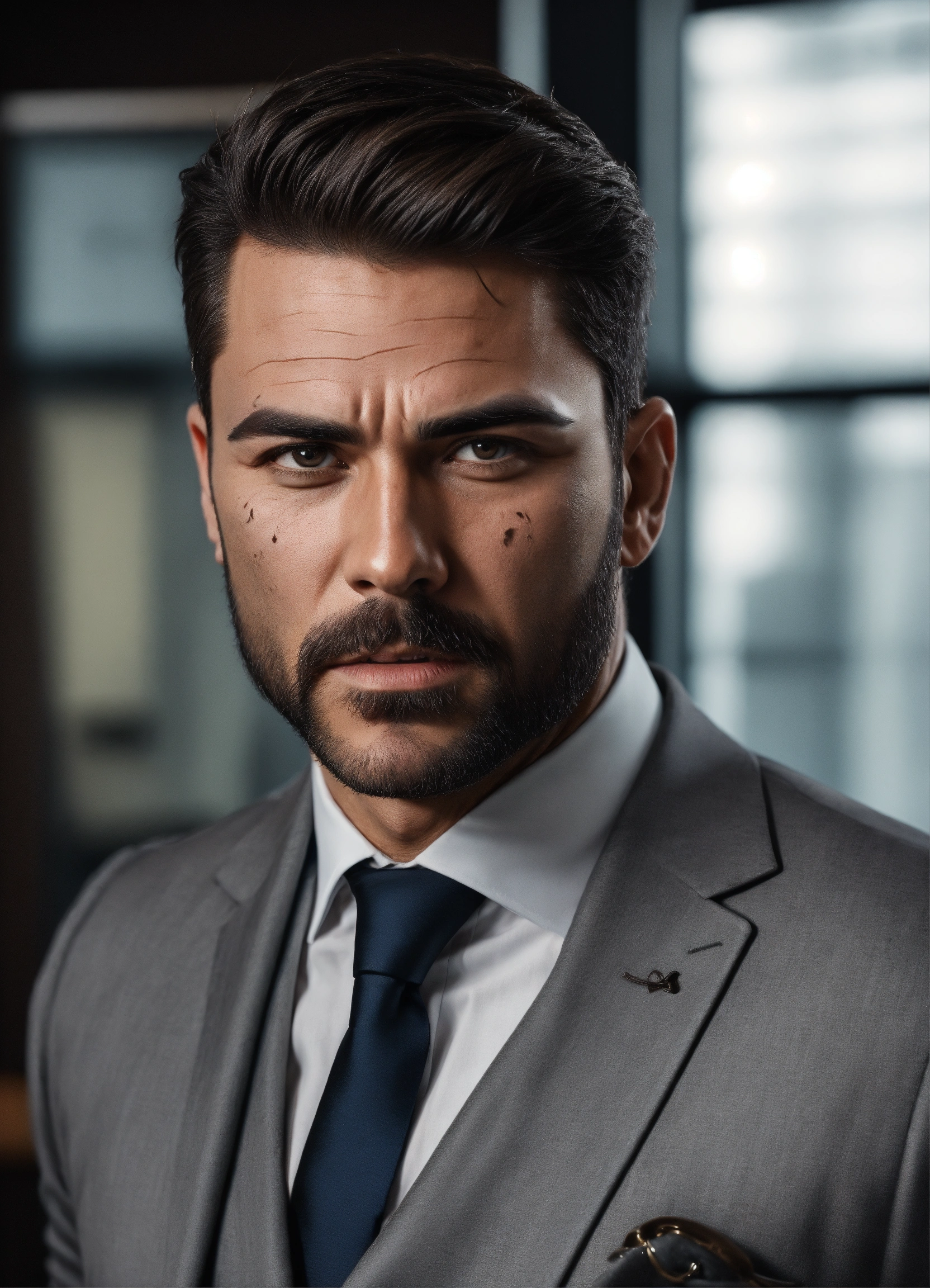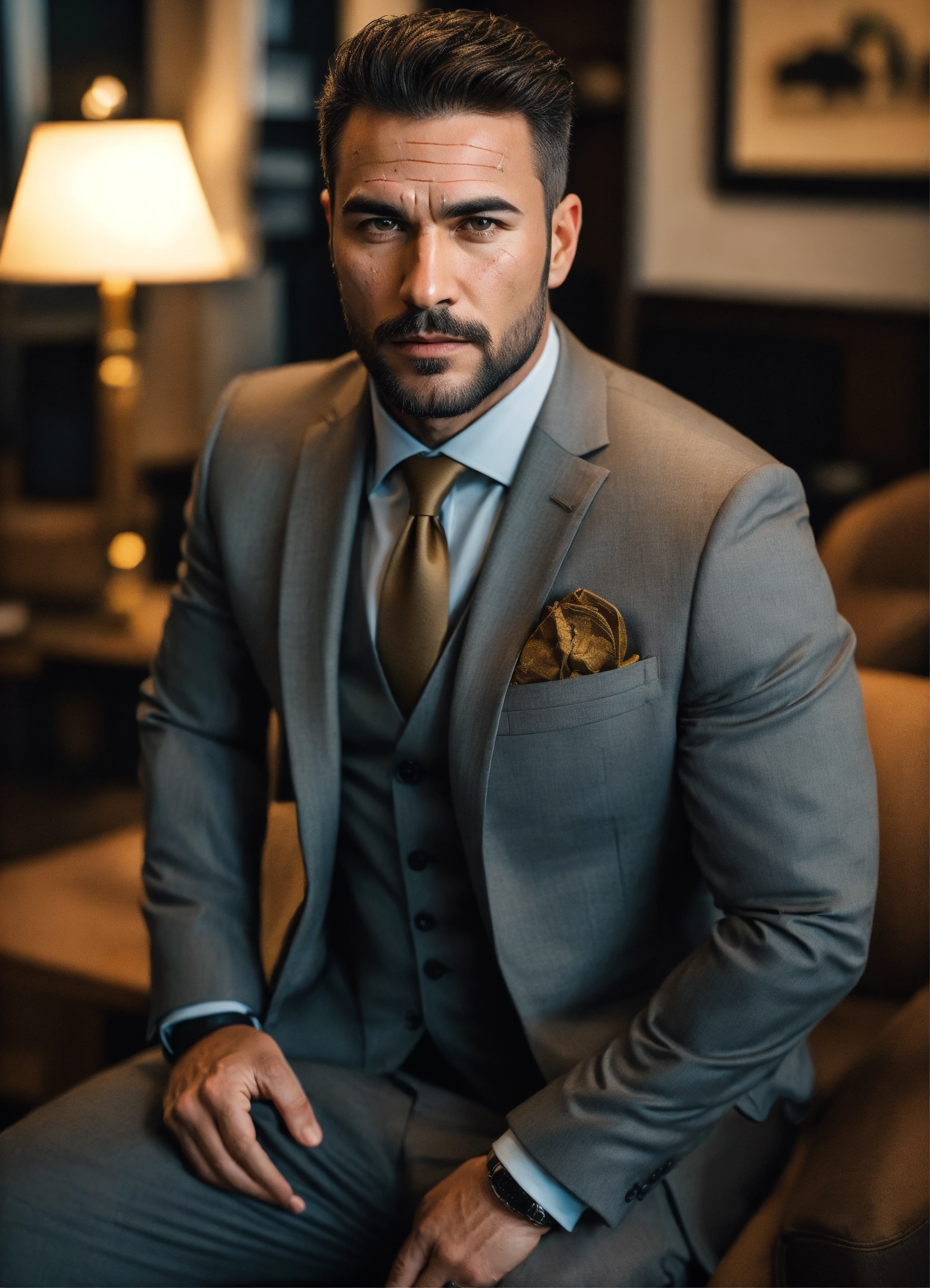 Handsome brutal bandit forty-five years old, brunette, brown eyes, with scar on his eyebrow in a gray suit in a hunting-style luxury office