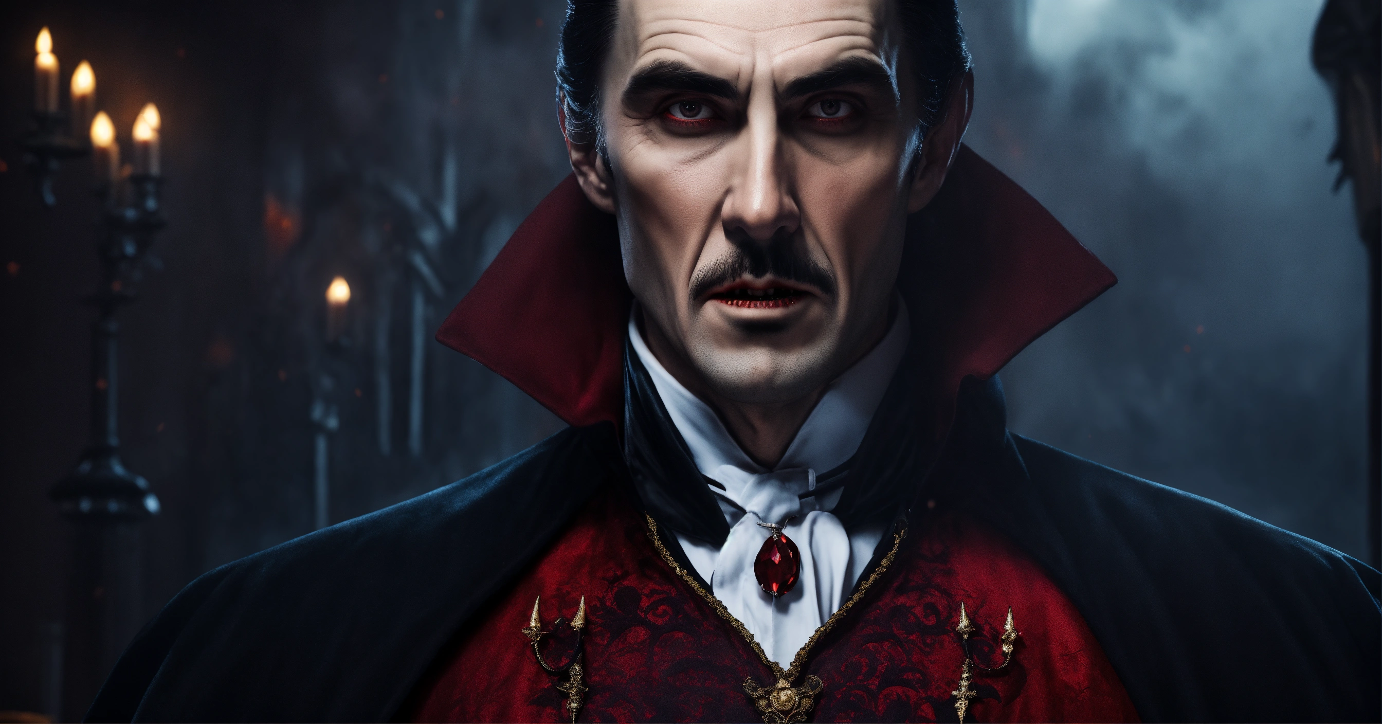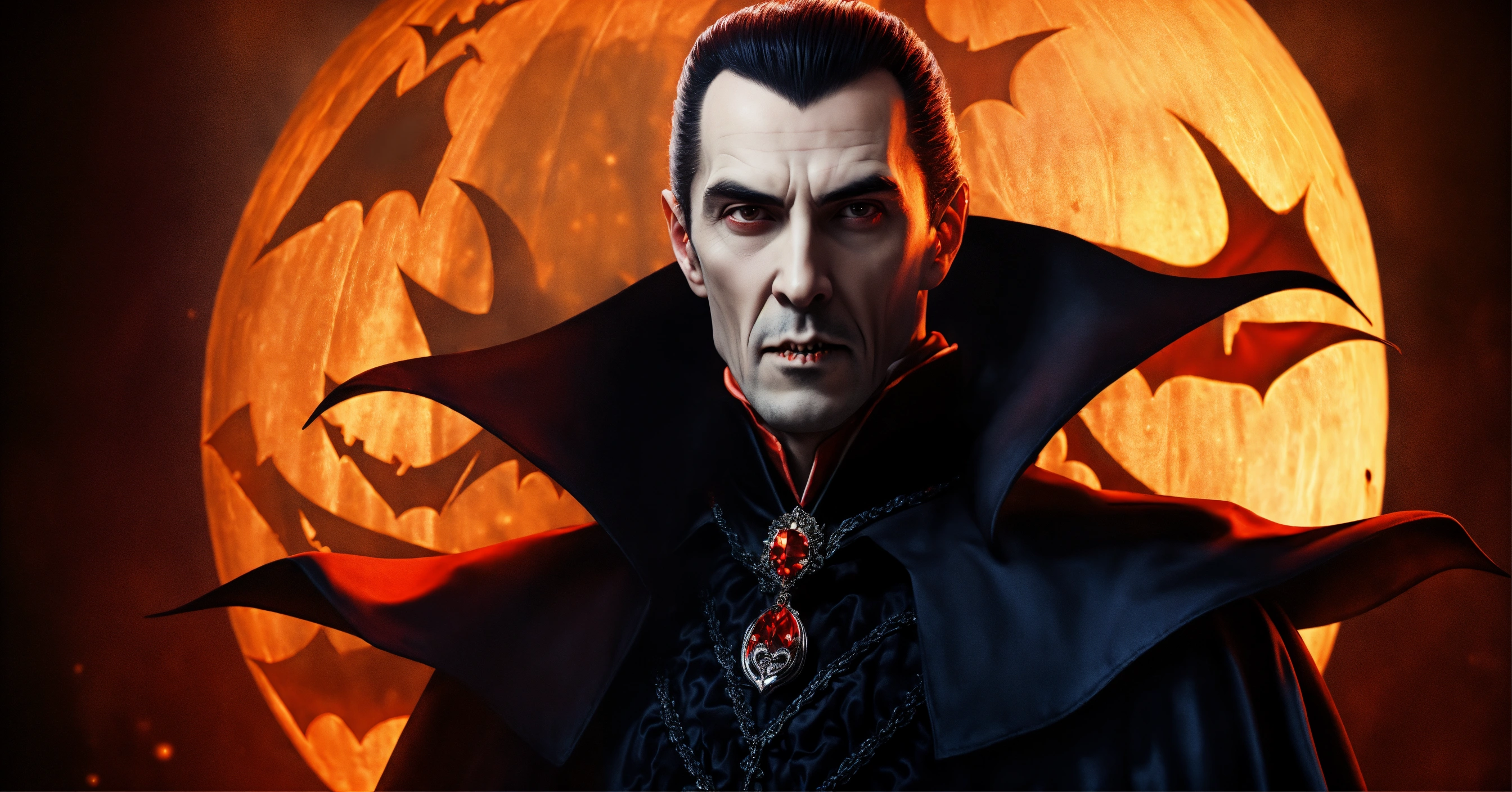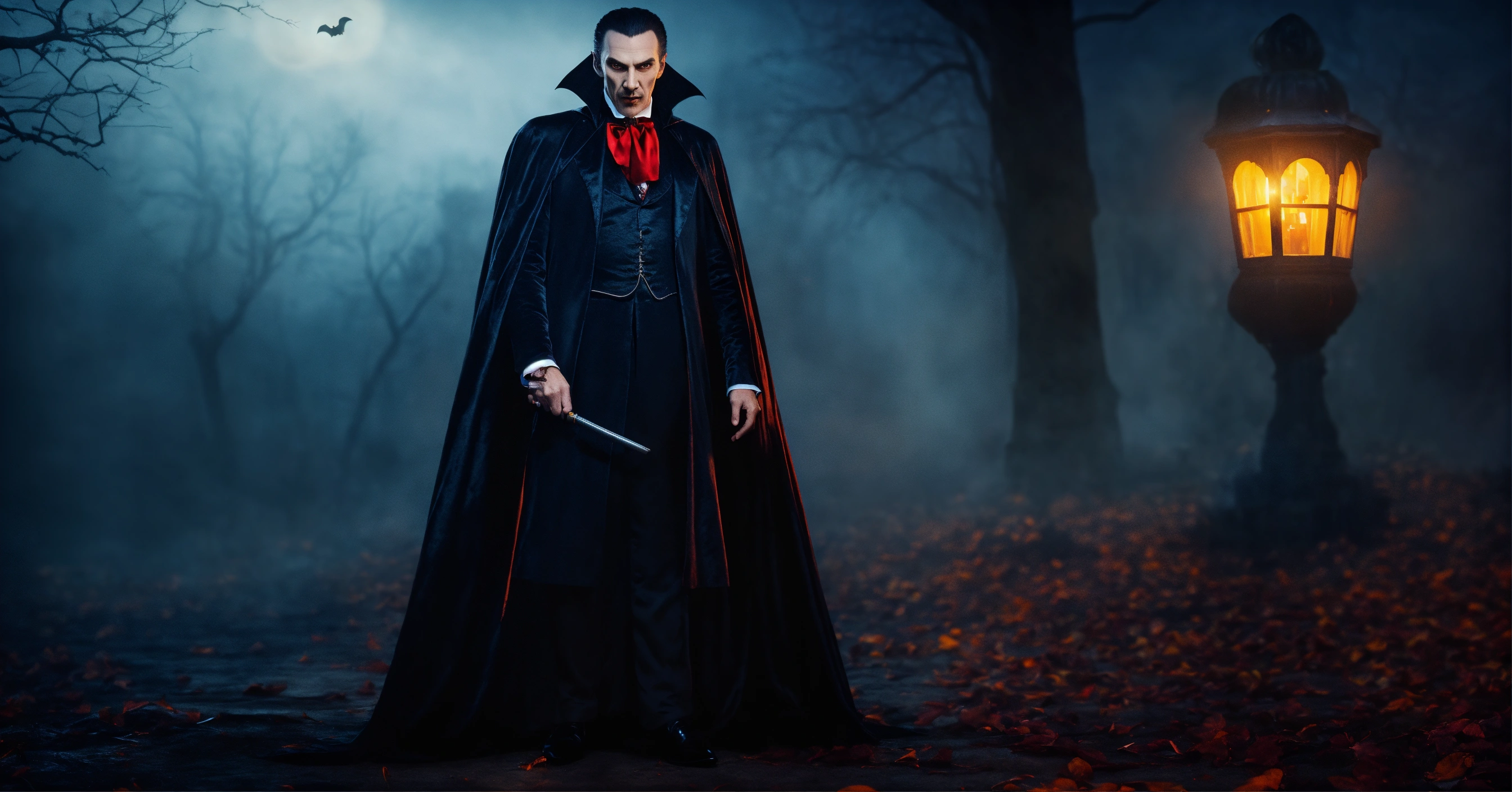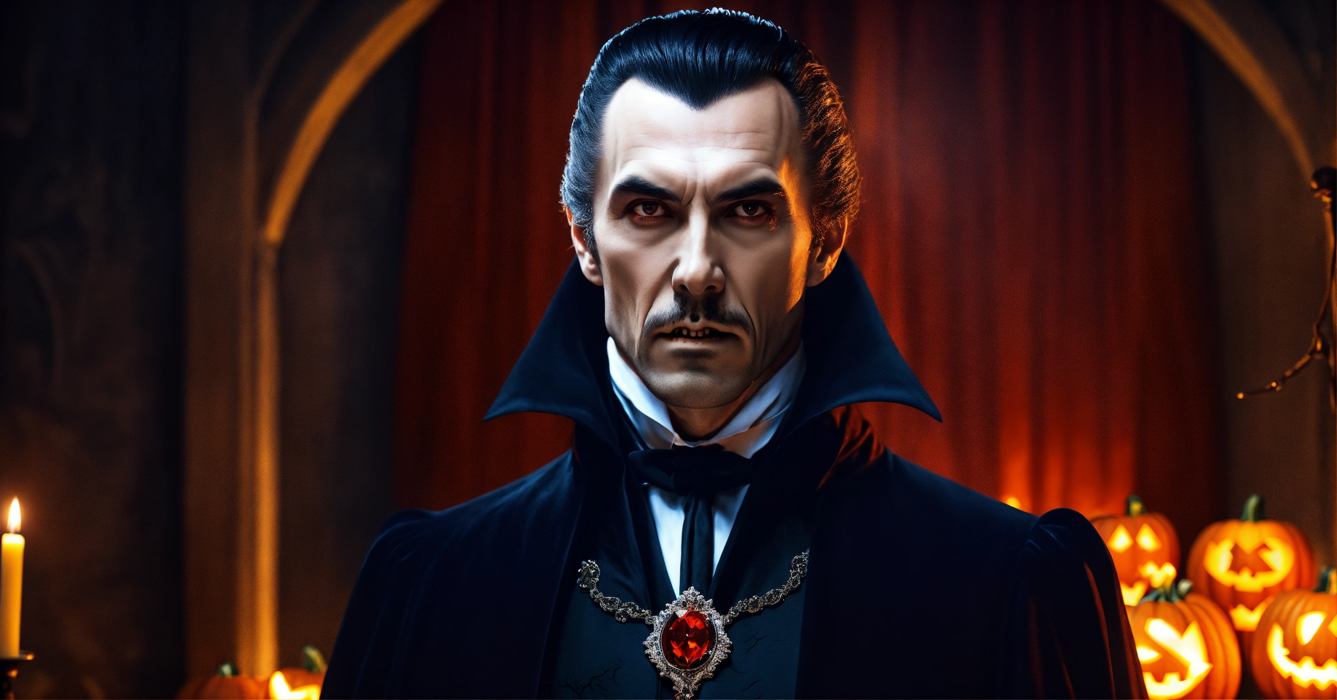 Image of count dracula, full portrait, halloween background. ensure high resolution, 8k image, realistic.
