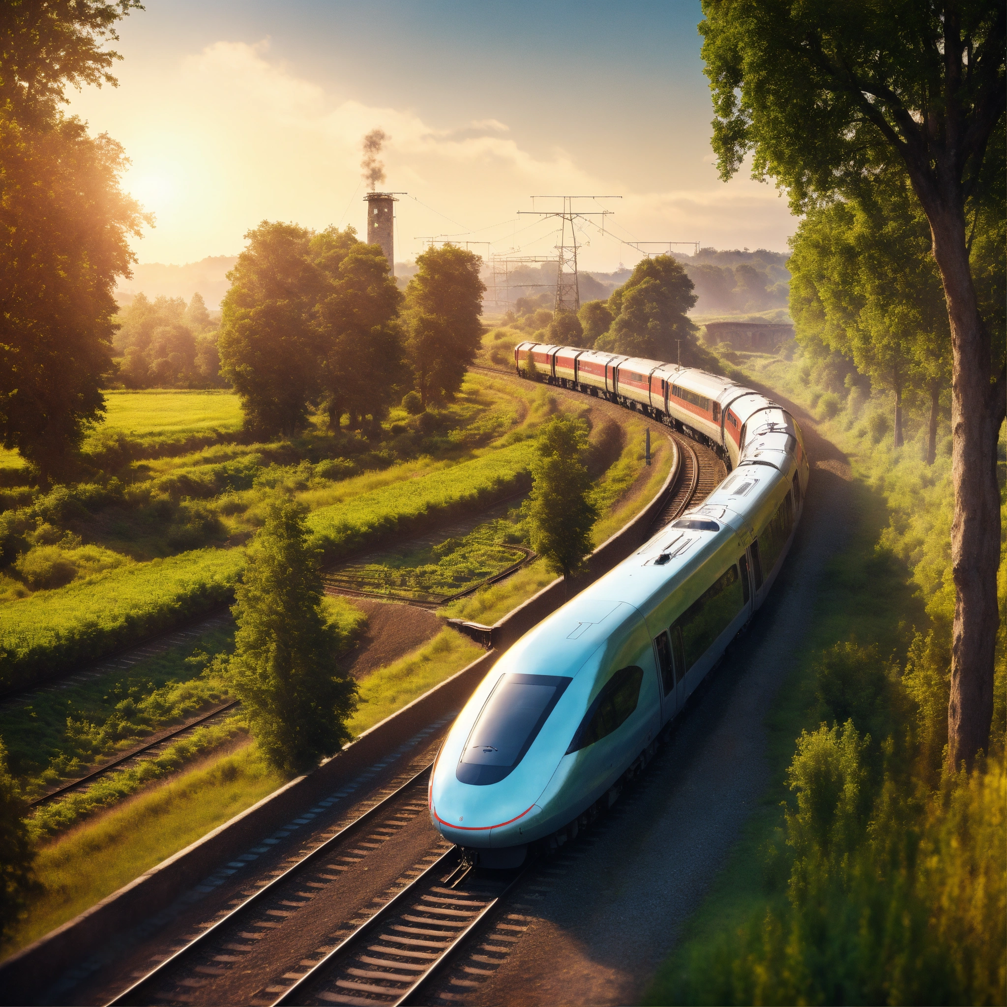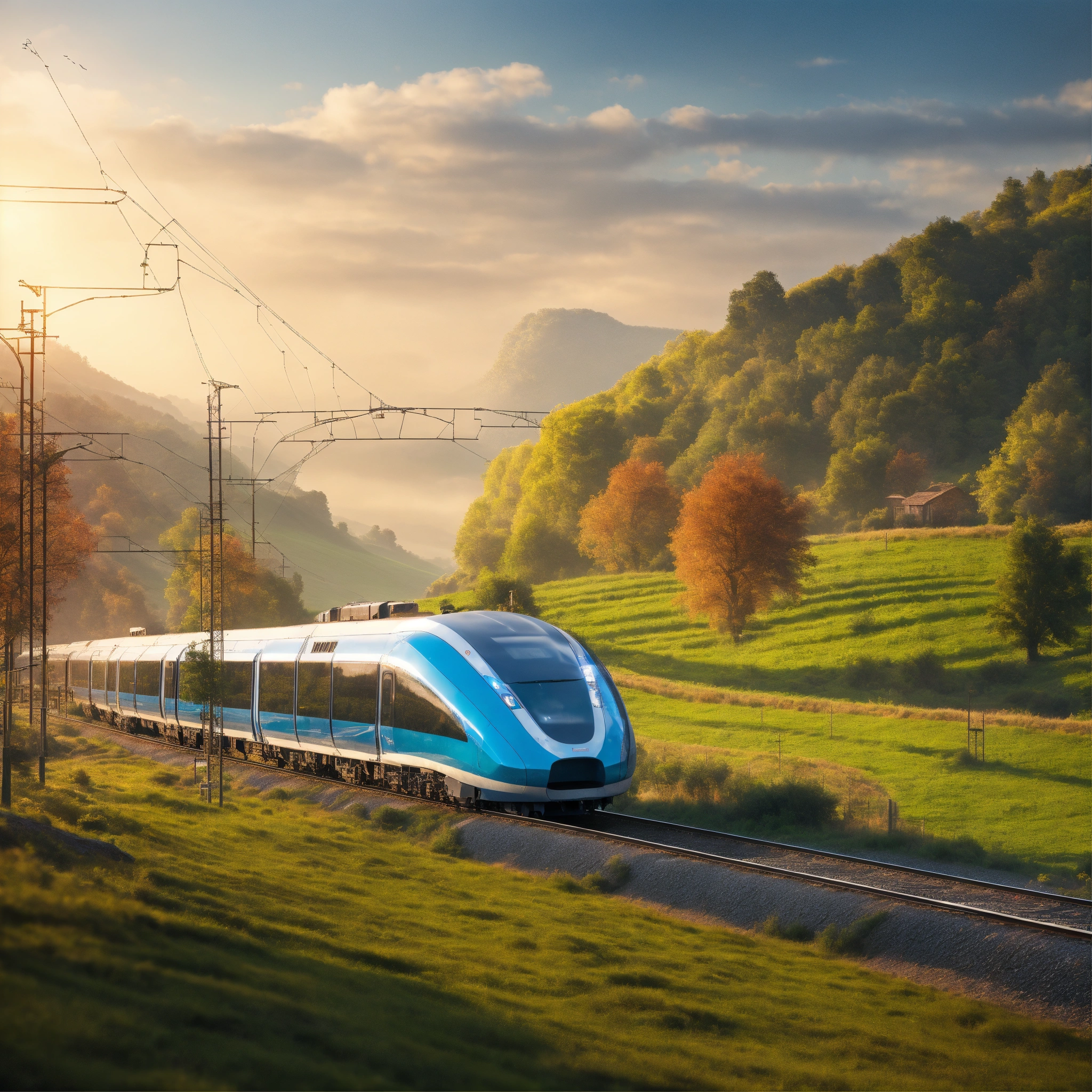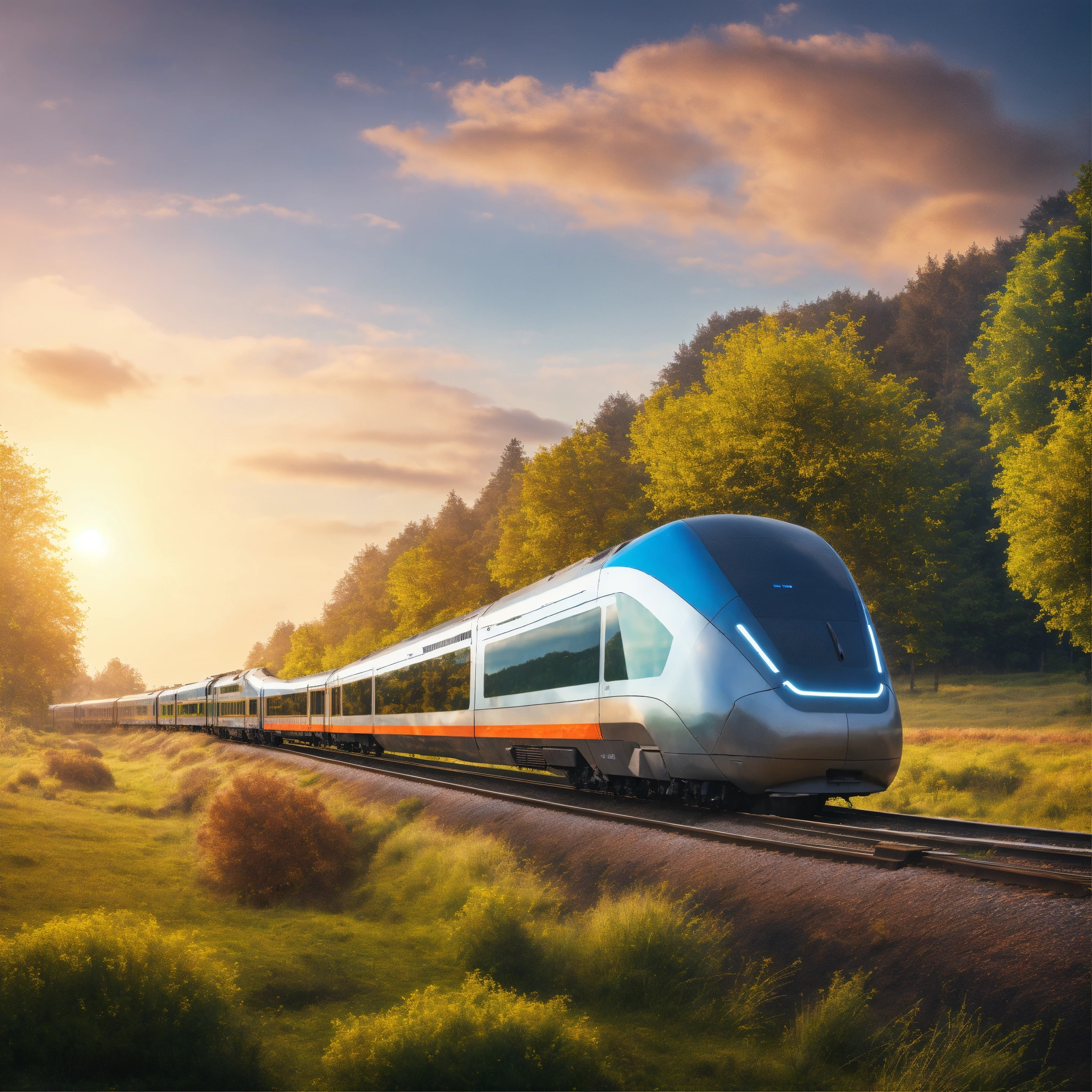 Train of the future running through the countryside in the morning, realistic photo, 4k realistic photo