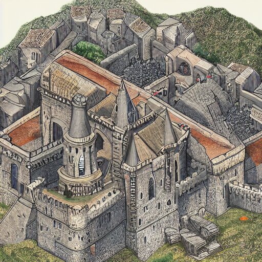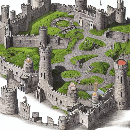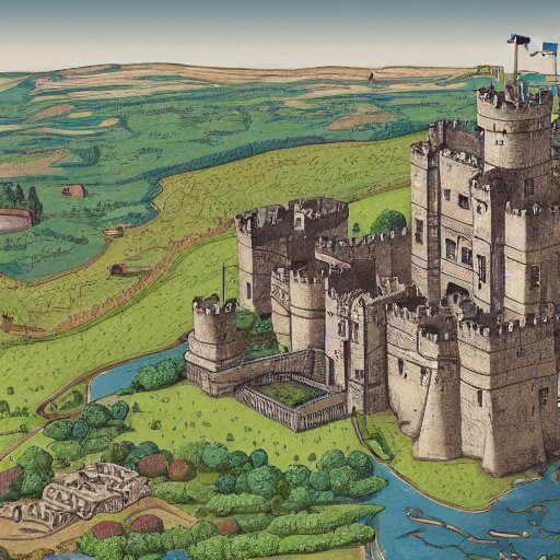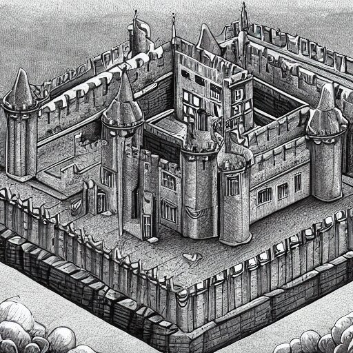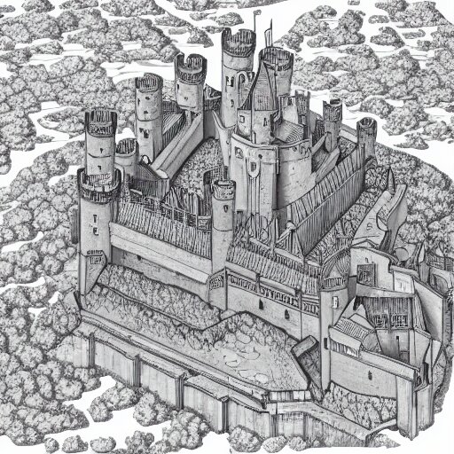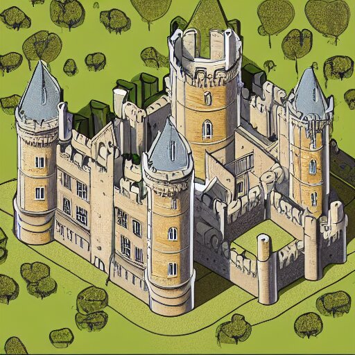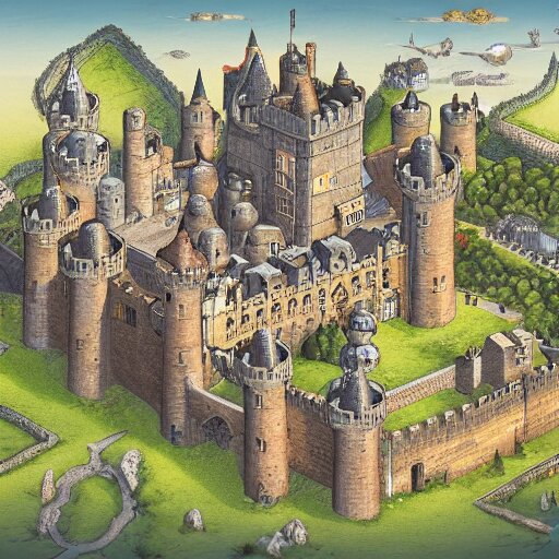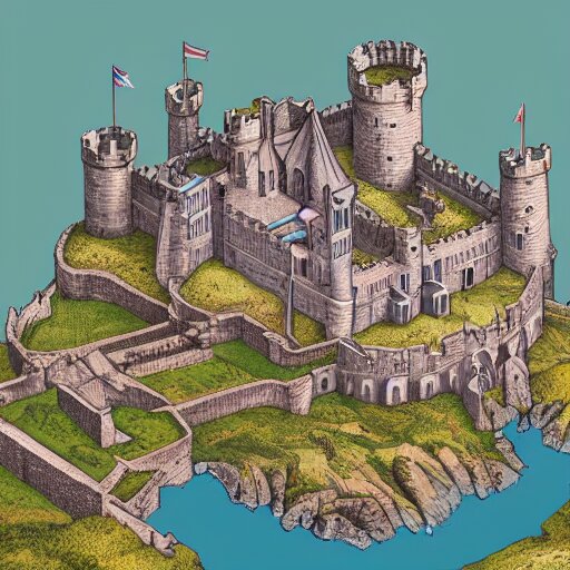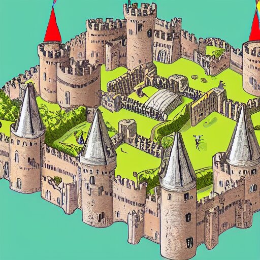 An isometric view of medieval castle in the middle of england