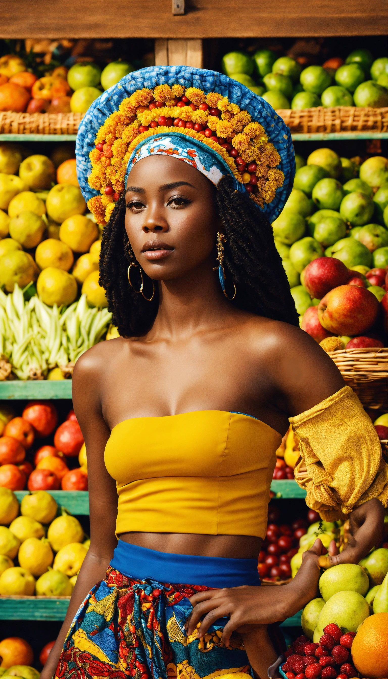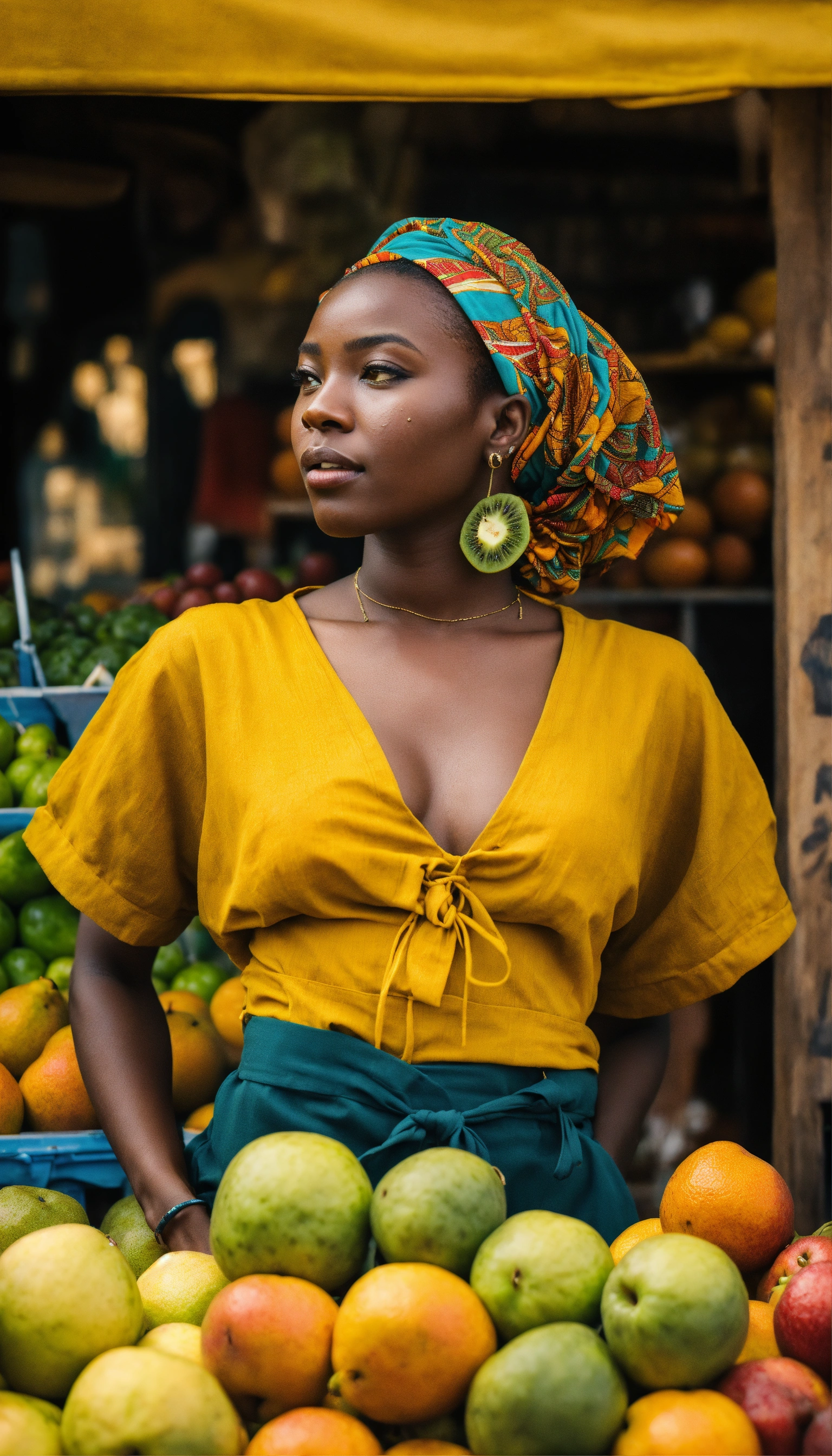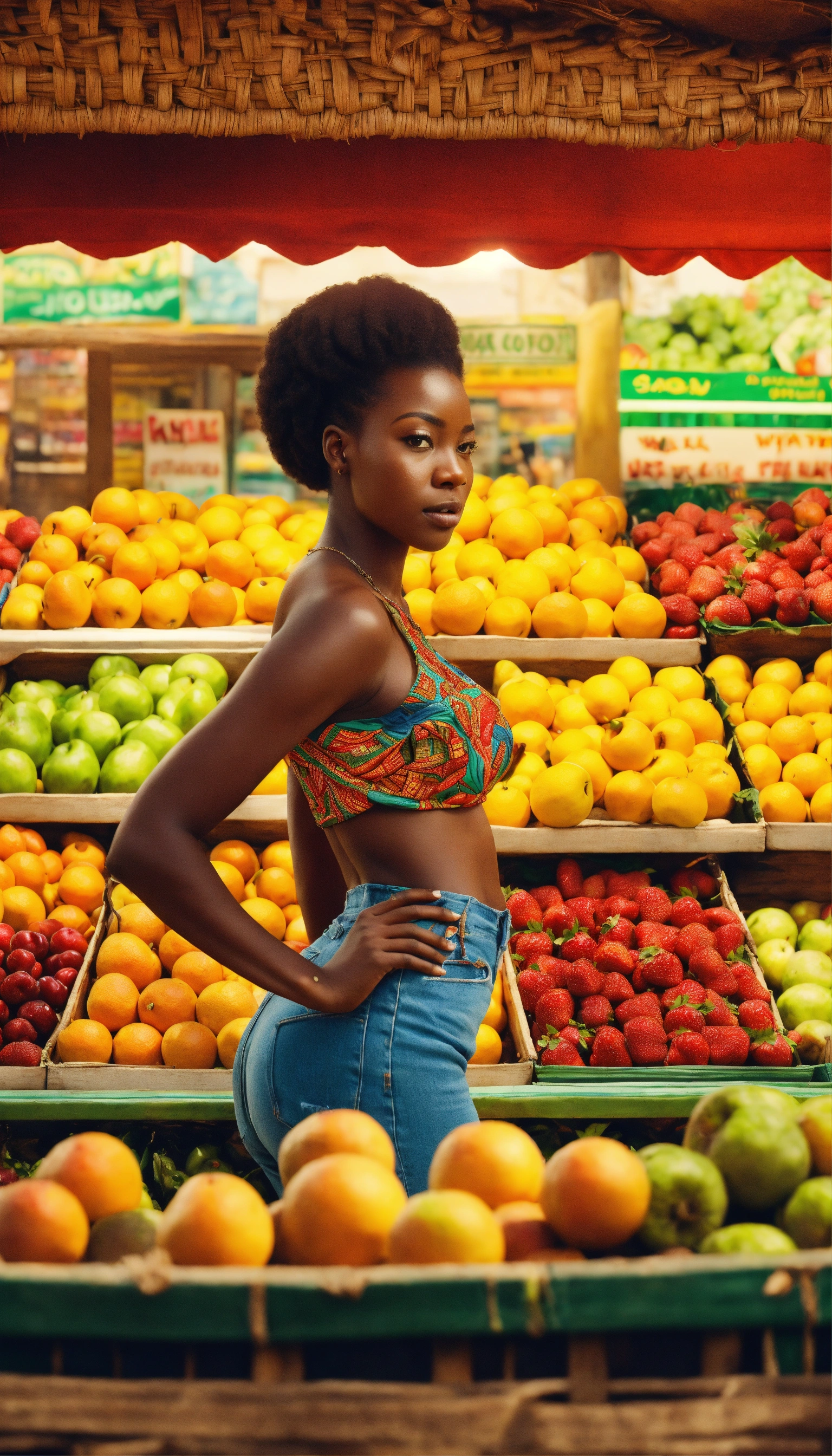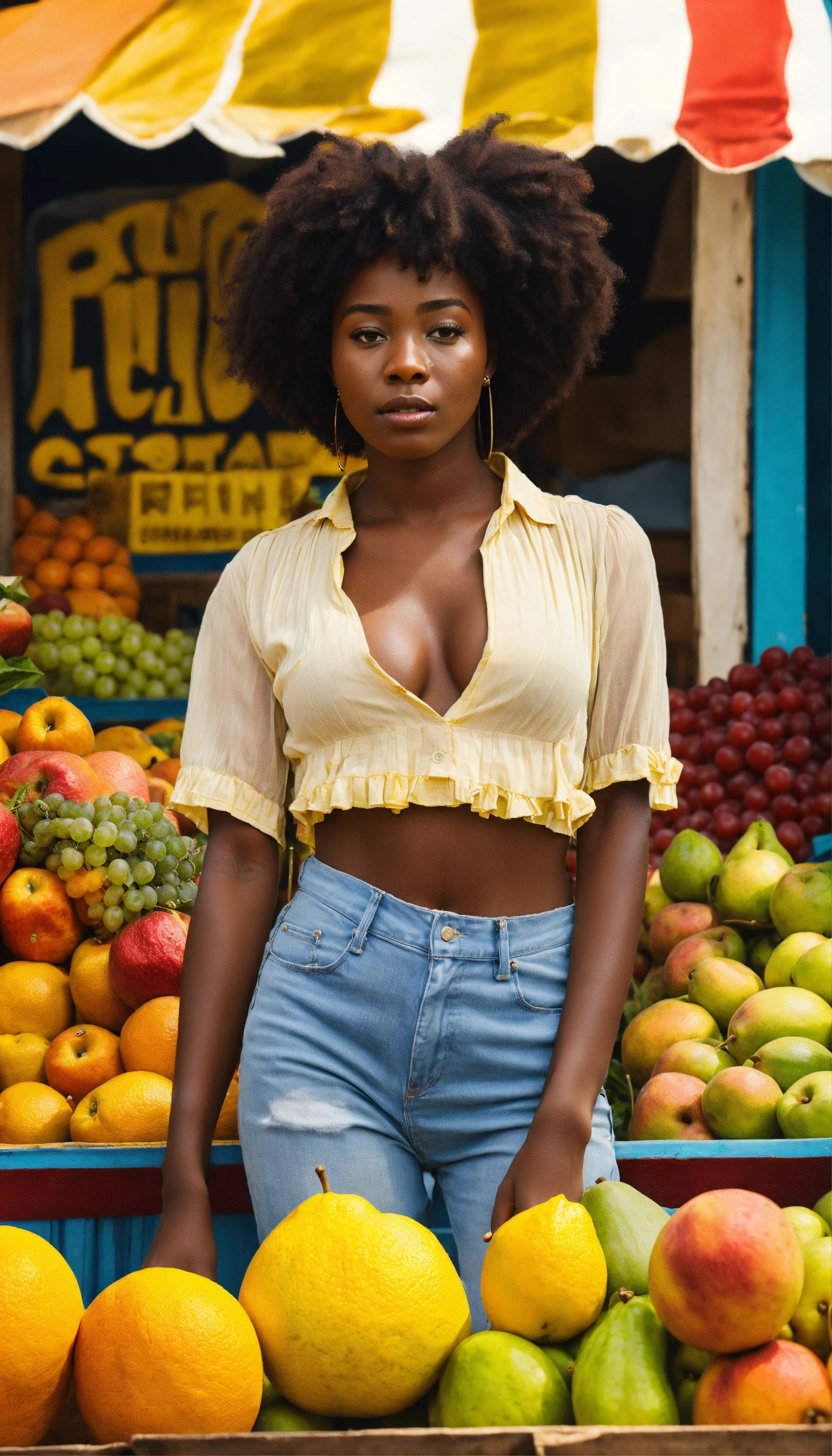 Close up a woman standing in front of a fruit stand, an album cover, inspired by ras akyem, instagram, hyperrealism, ifunny watermark, ghanaian movie poster, very beautiful girl, still image from tv series