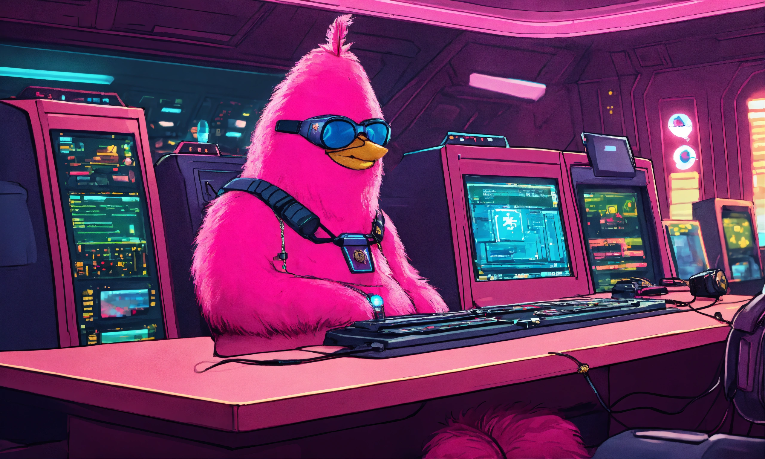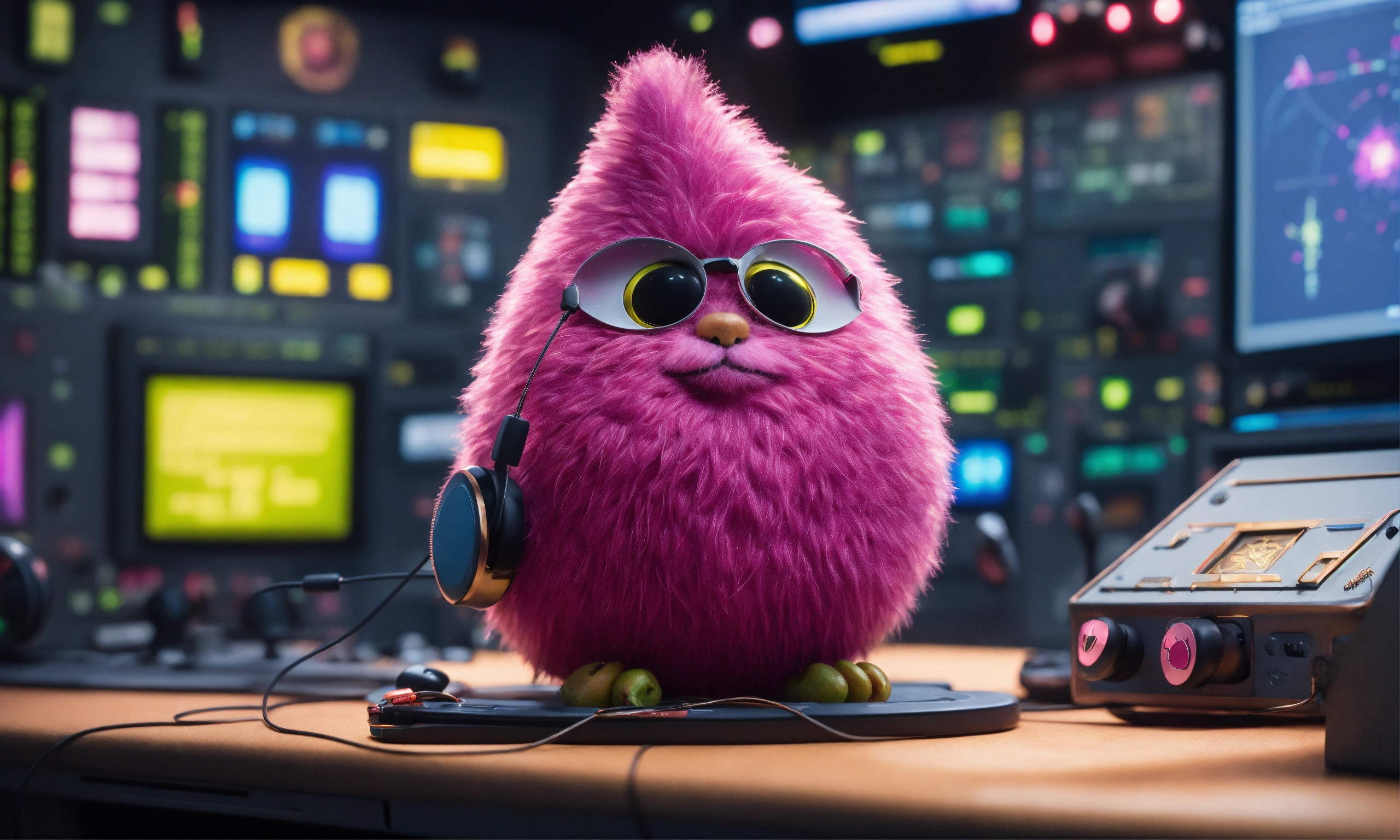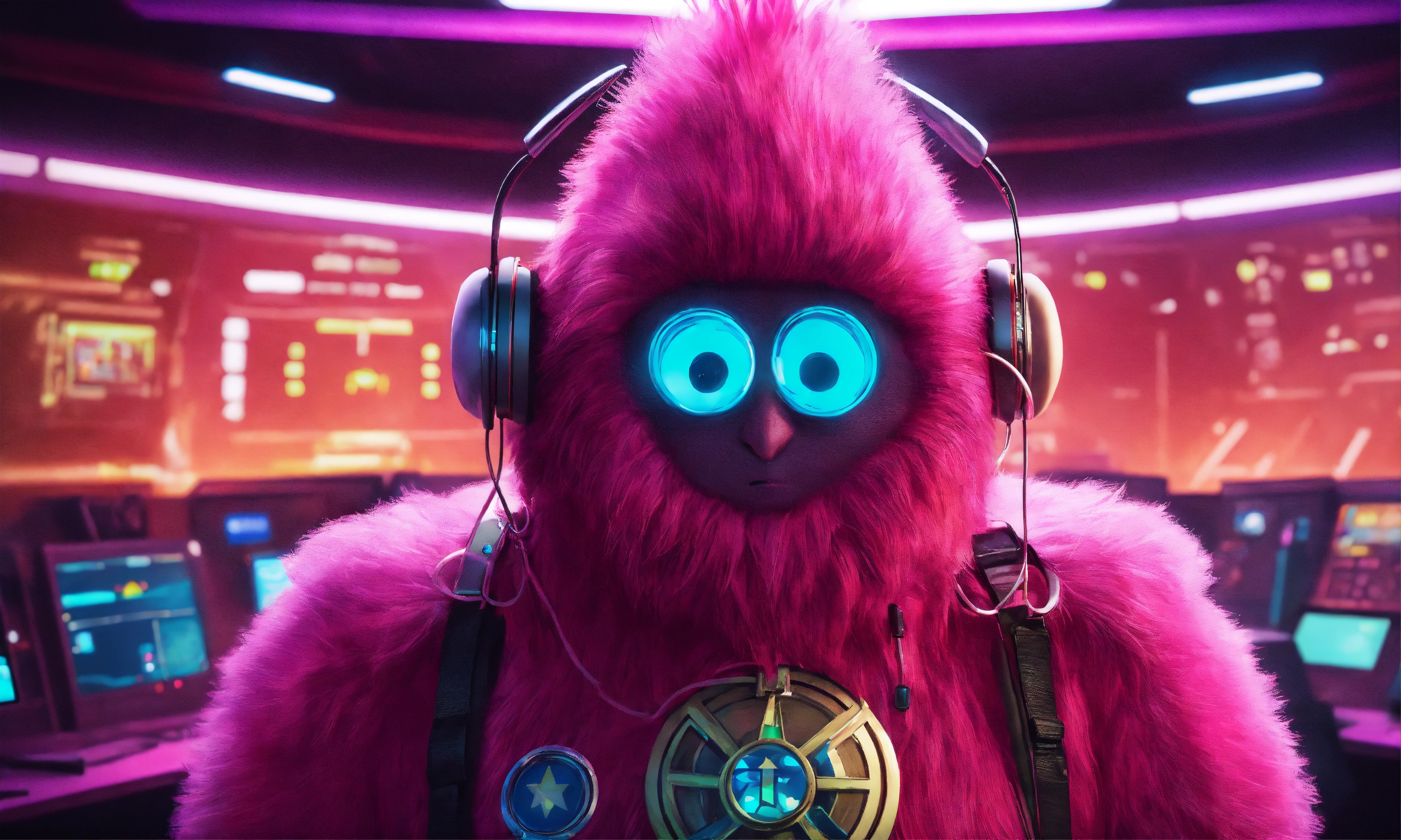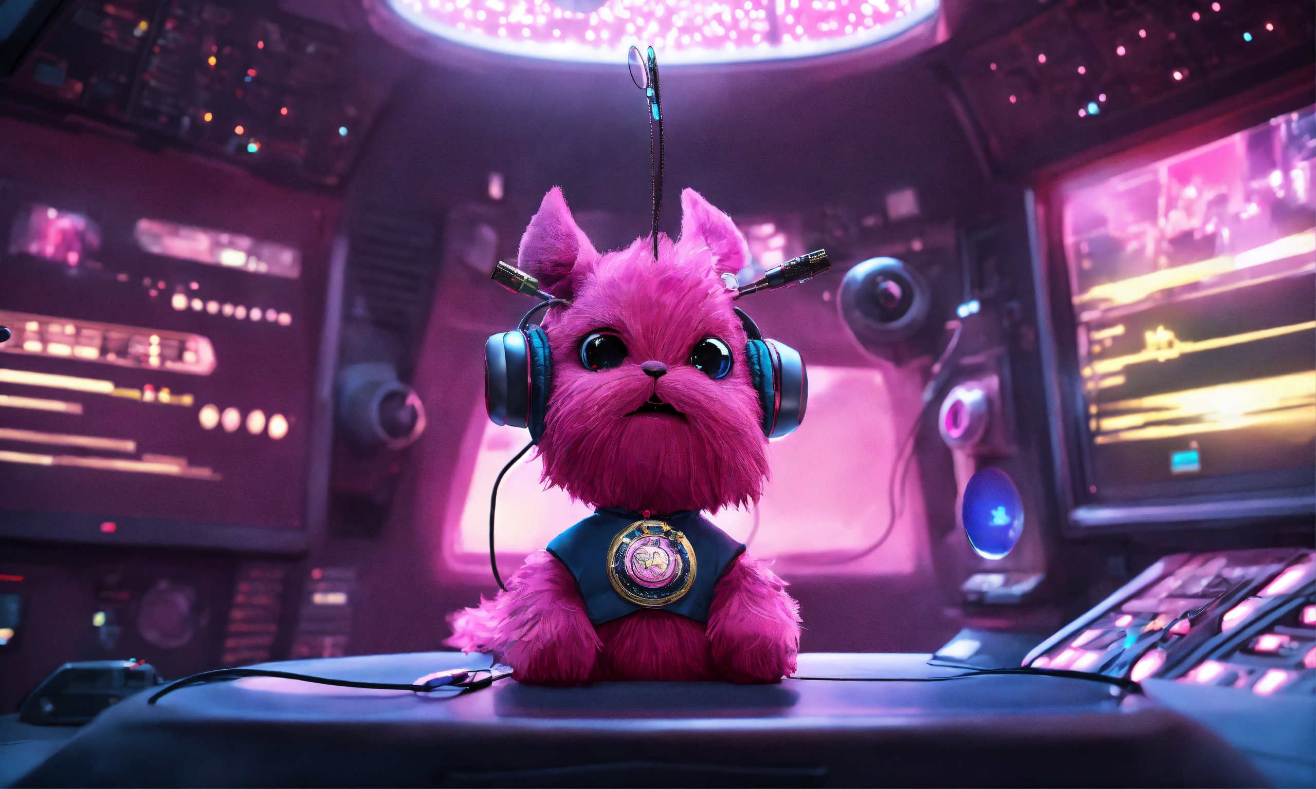 Lovable pear shaped pink hairy grimace character and wearing hi tech earphones with pointy antenna, and a hi-tech necklace medallion with commander badge in a star ship control room