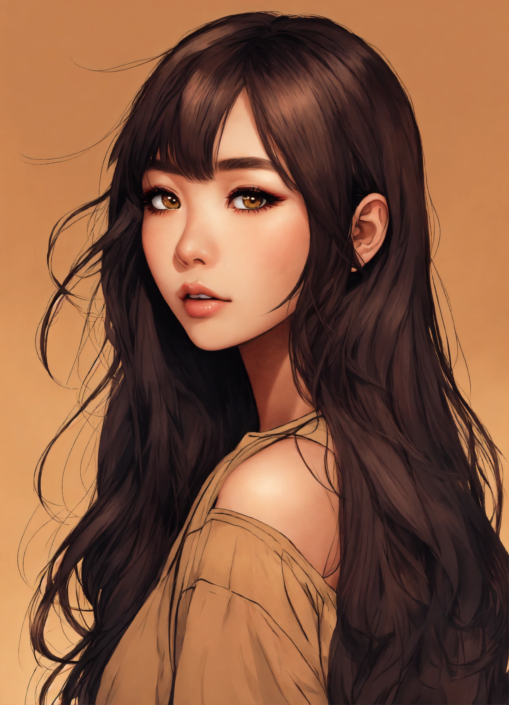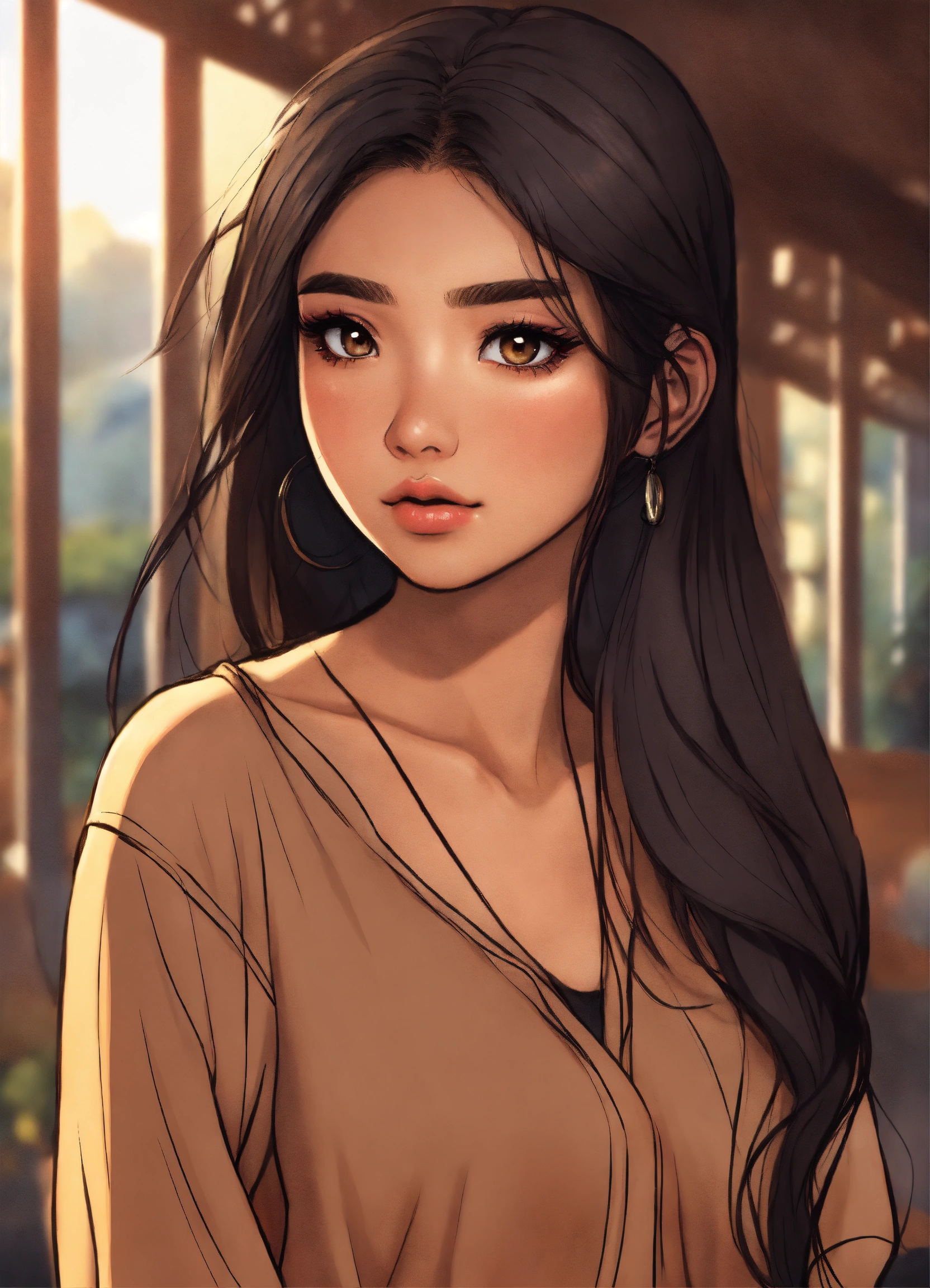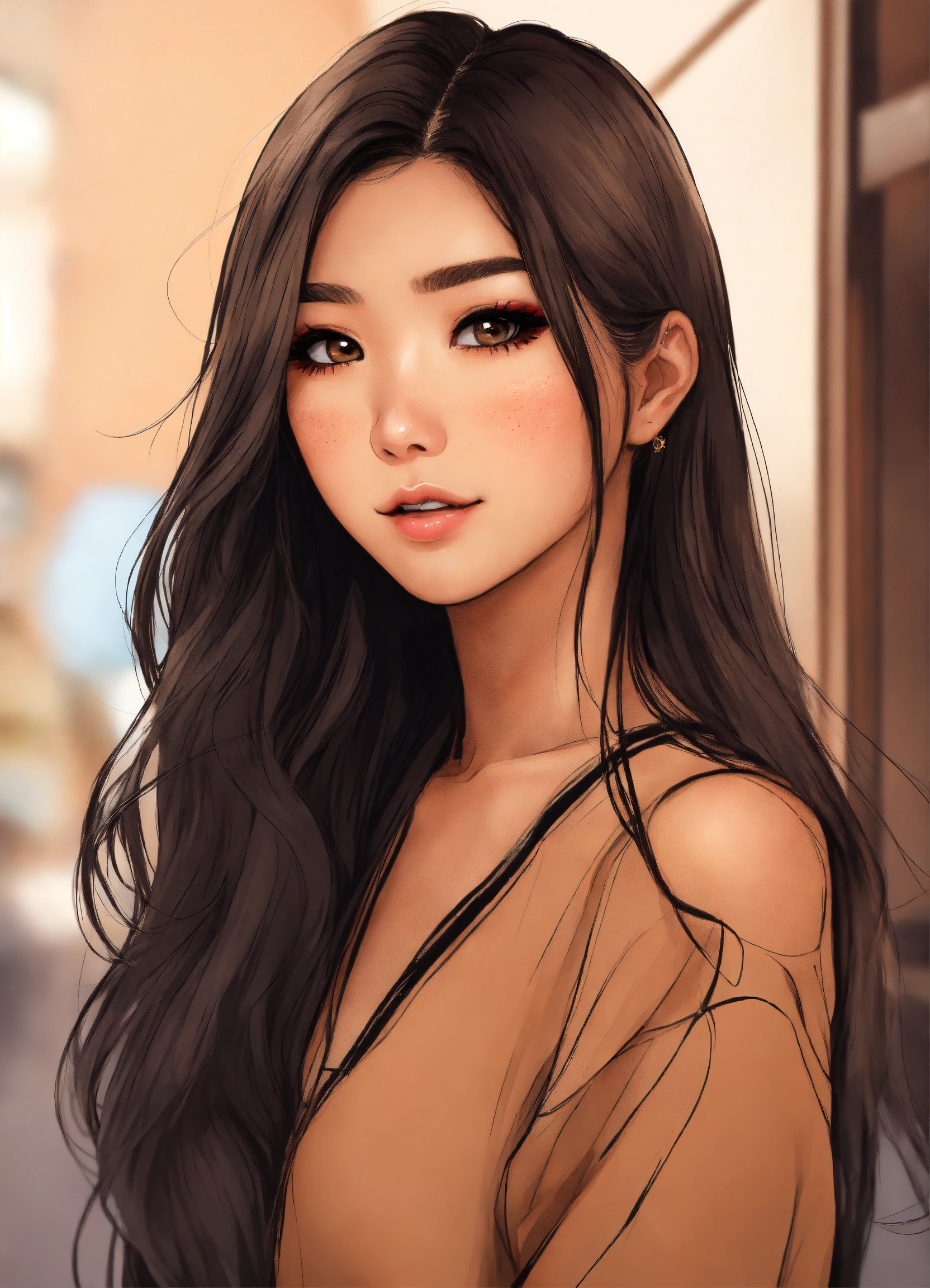 Cute tan asian female, long brown and black straight fluffy hair, heavy eyeliner, makeup, no imperfections, comic art