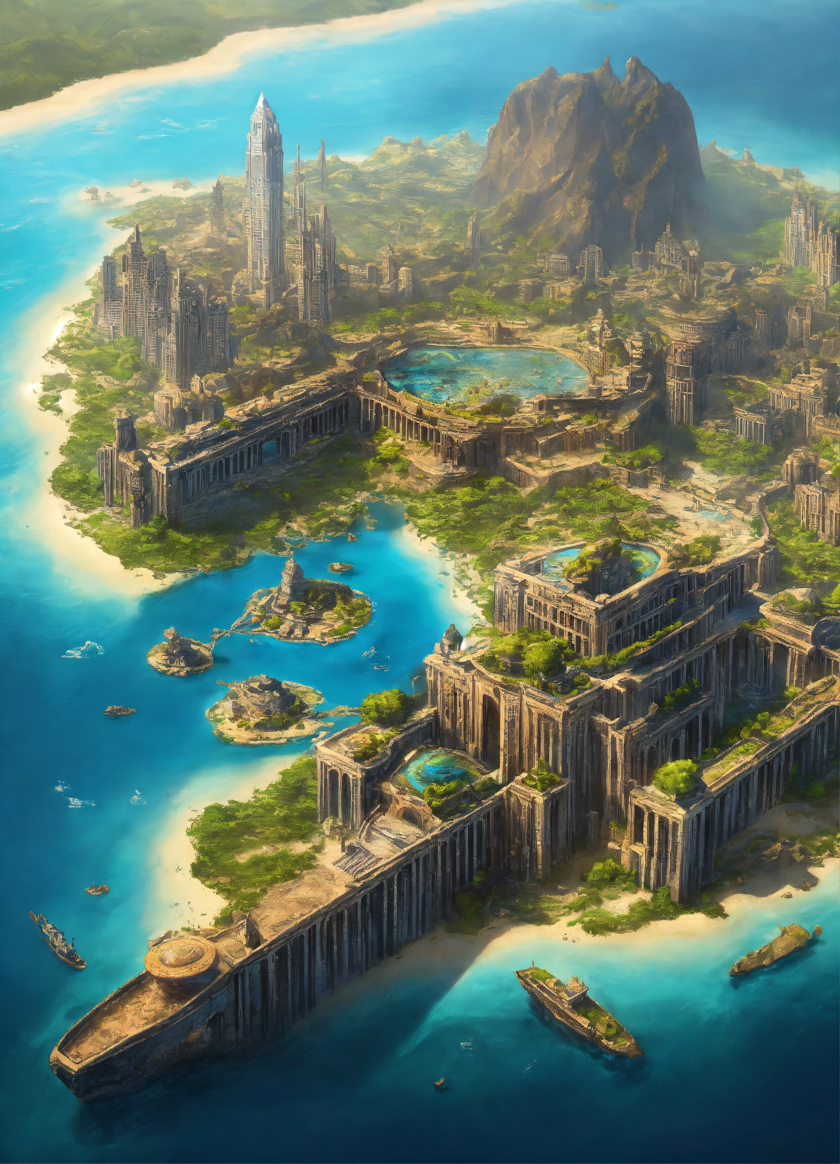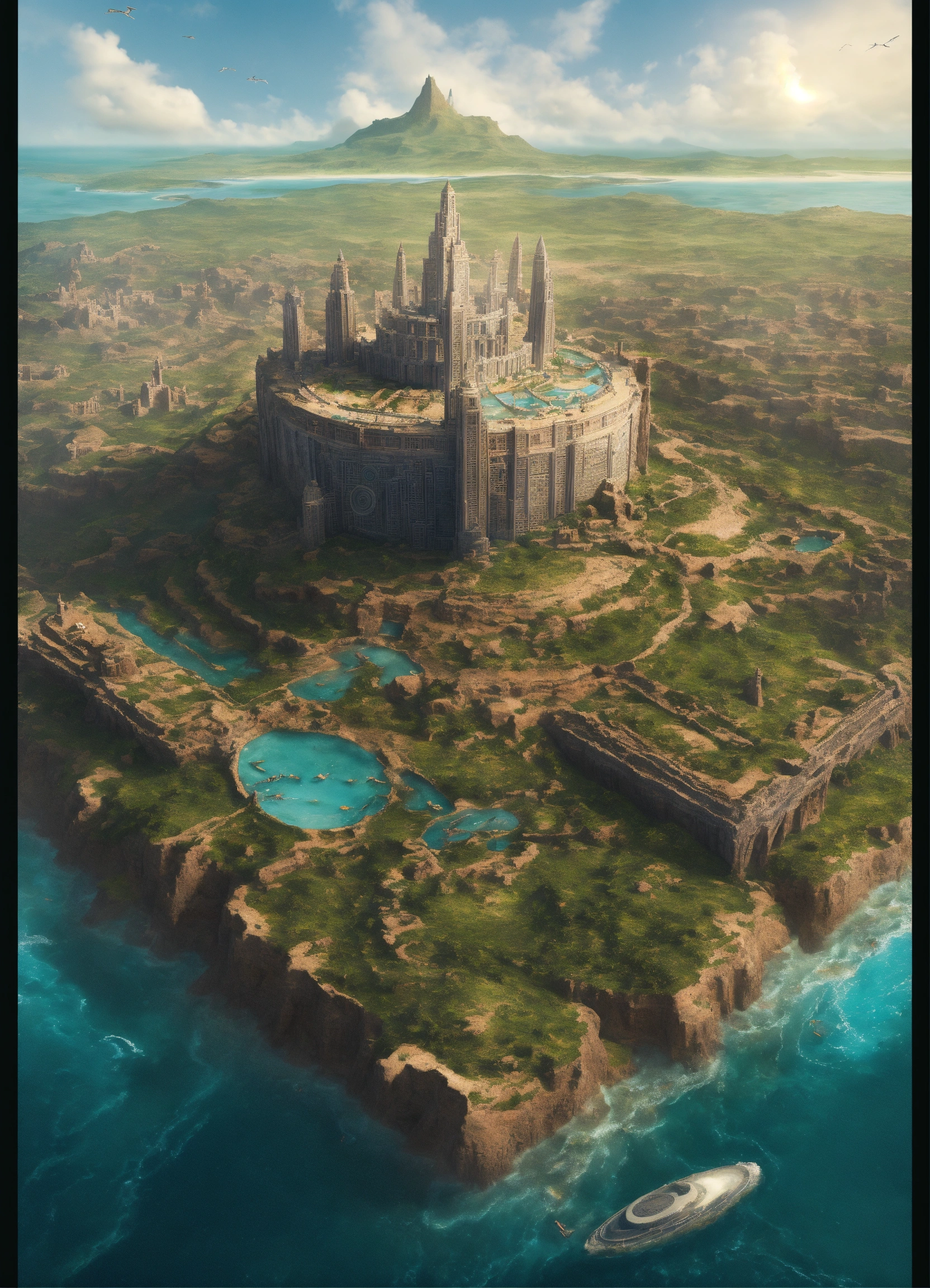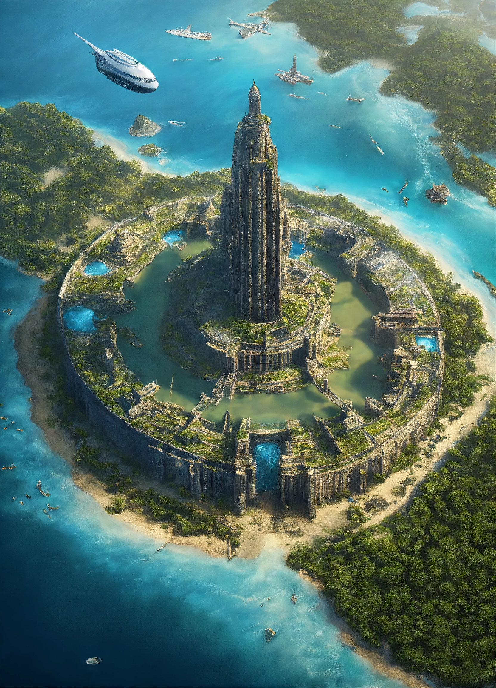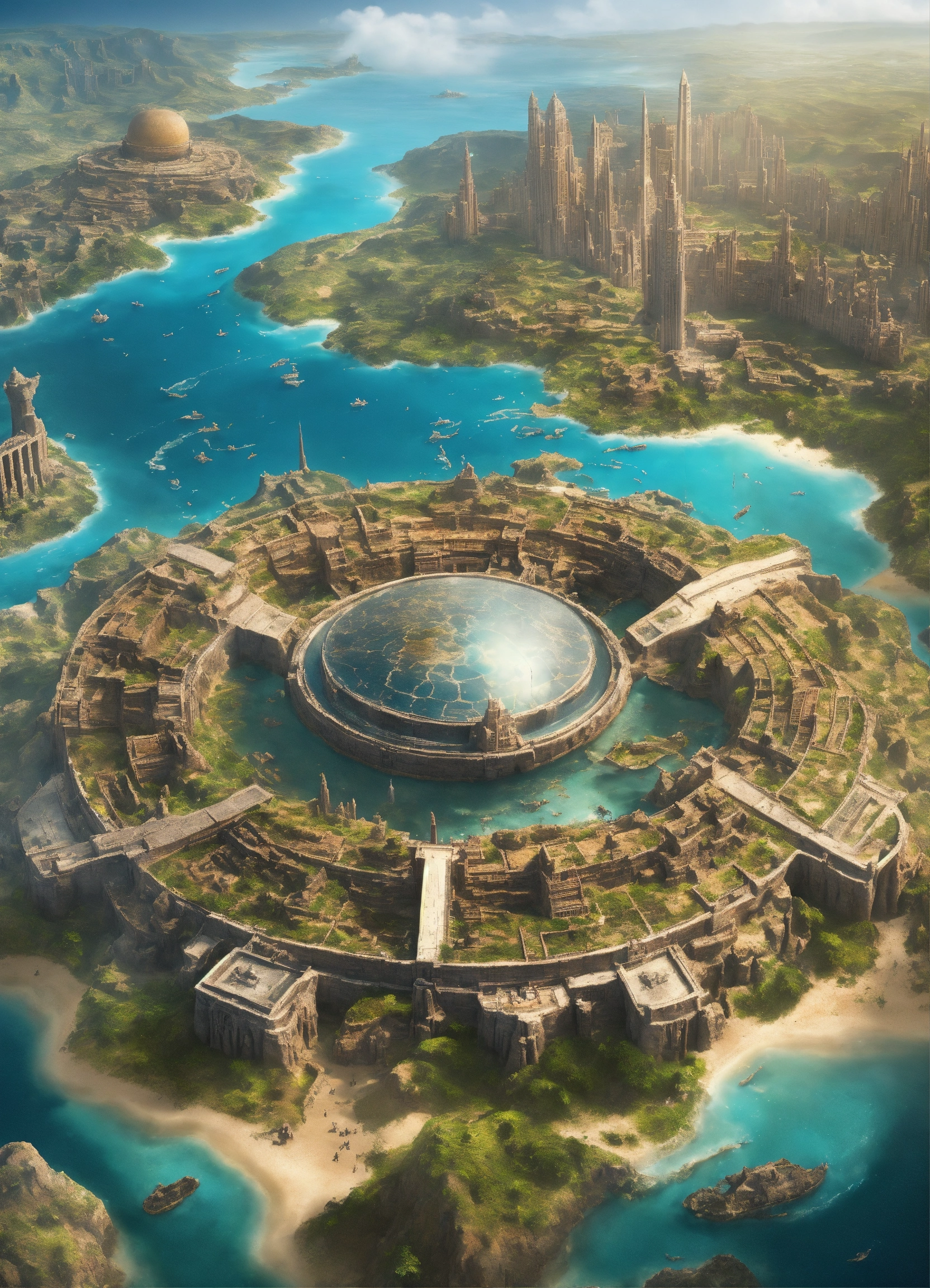 Atlantis filled with ancient black people, round with different layers of water, realistic, futuristic, aerial view