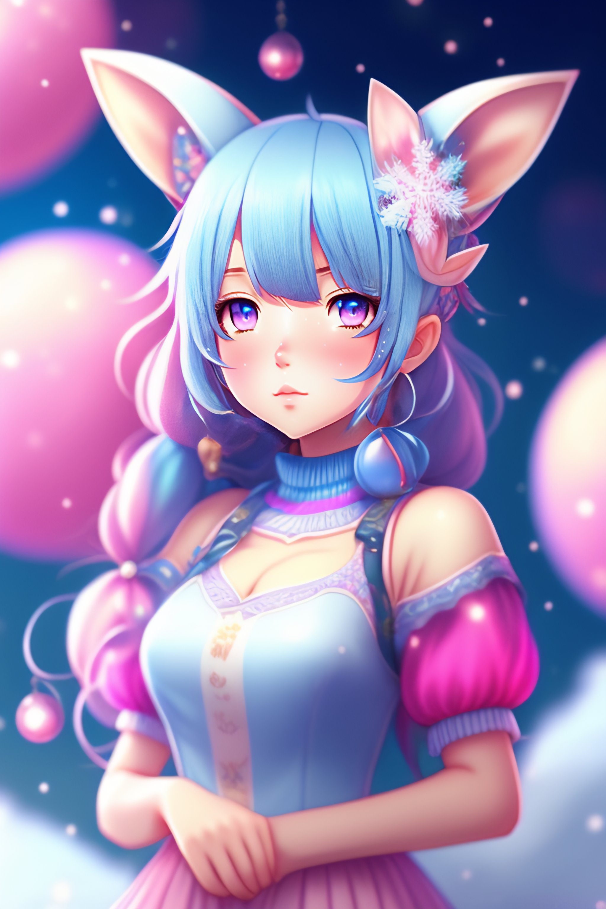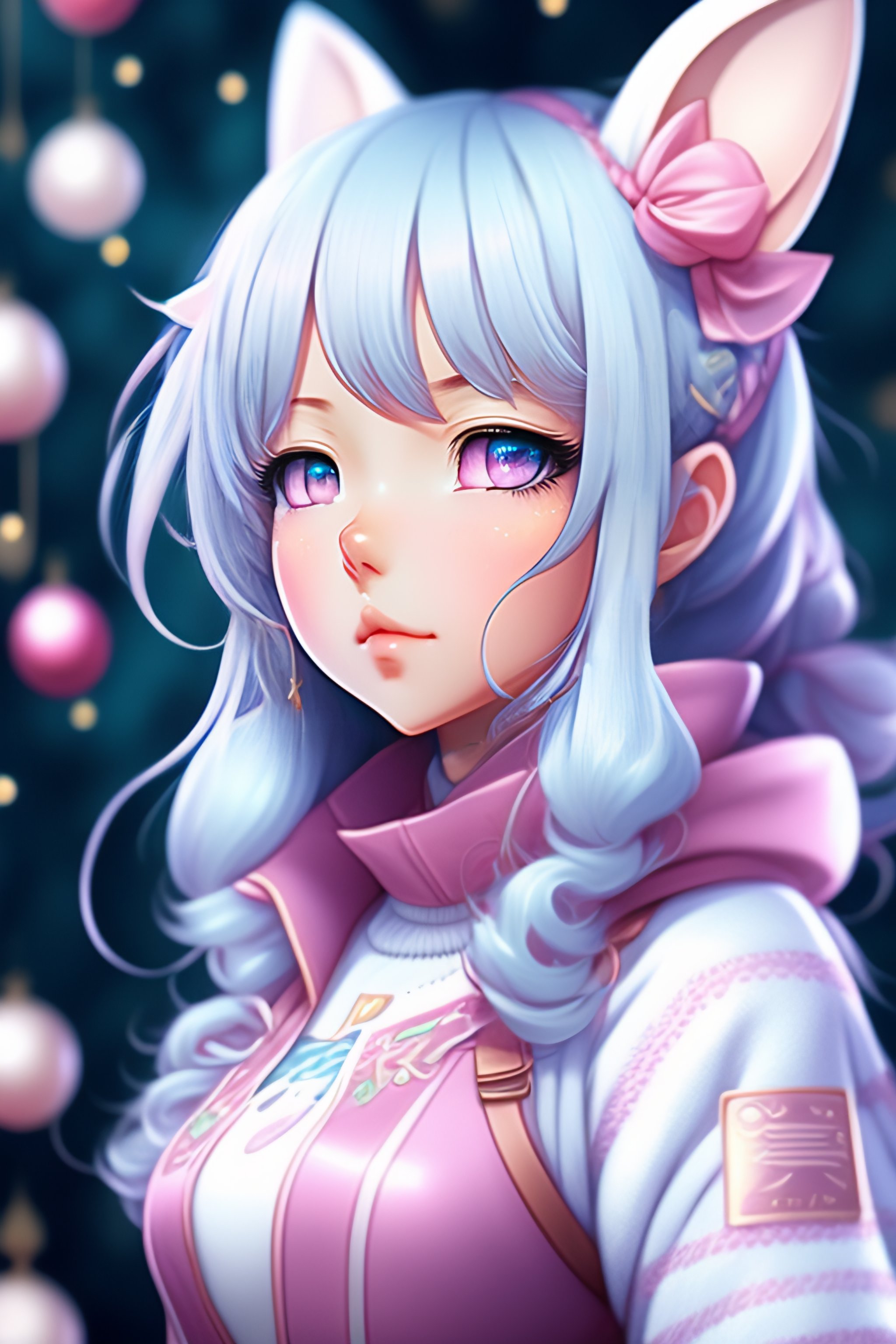 Anime, wallpaper like pencil drawing, digital art of cute kawaii girl with bunny ears, light blue hair, bob, pink eyes, holding a omikuji, background with snow ornaments, highly detailed, concept art, 8k