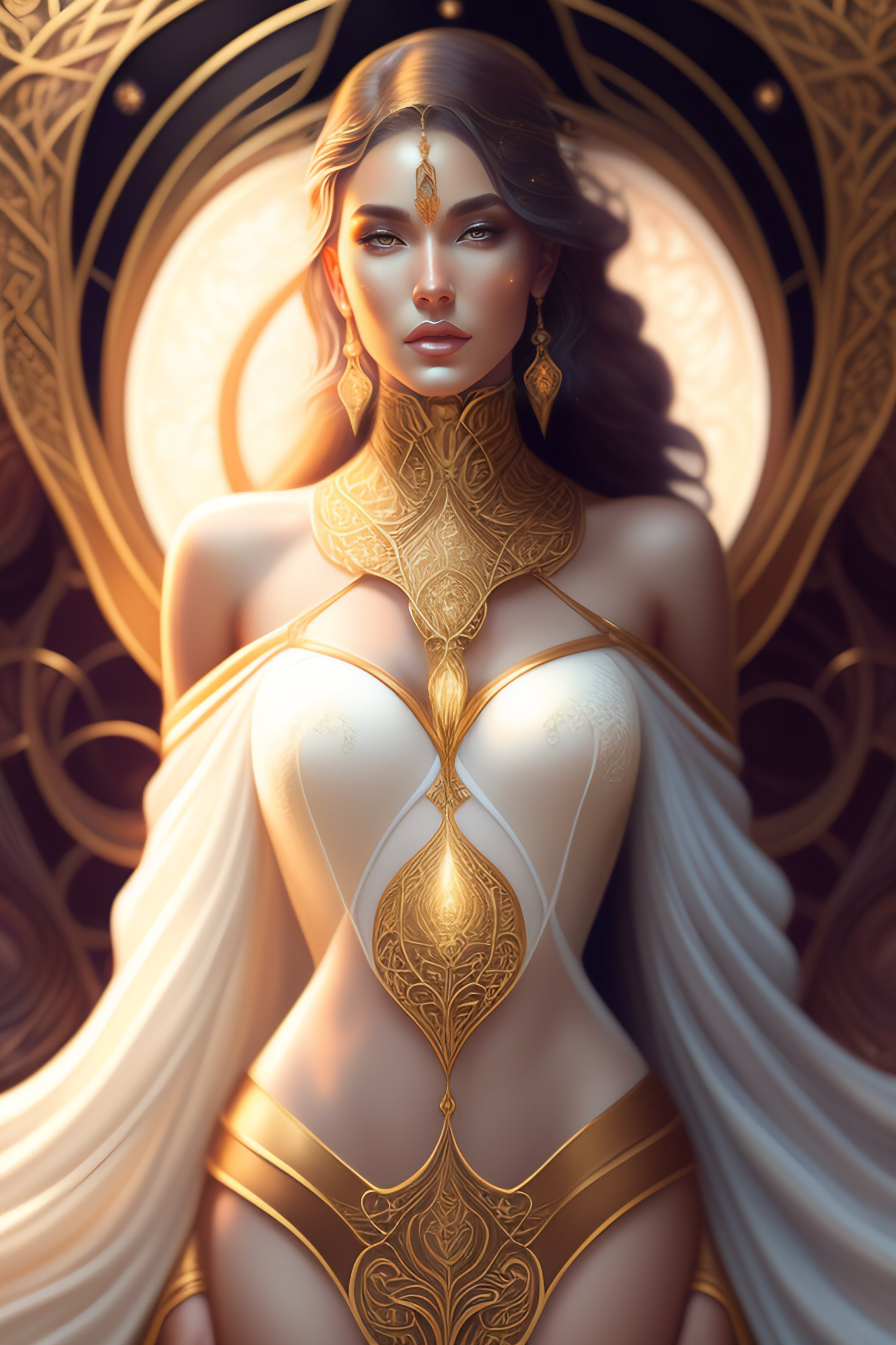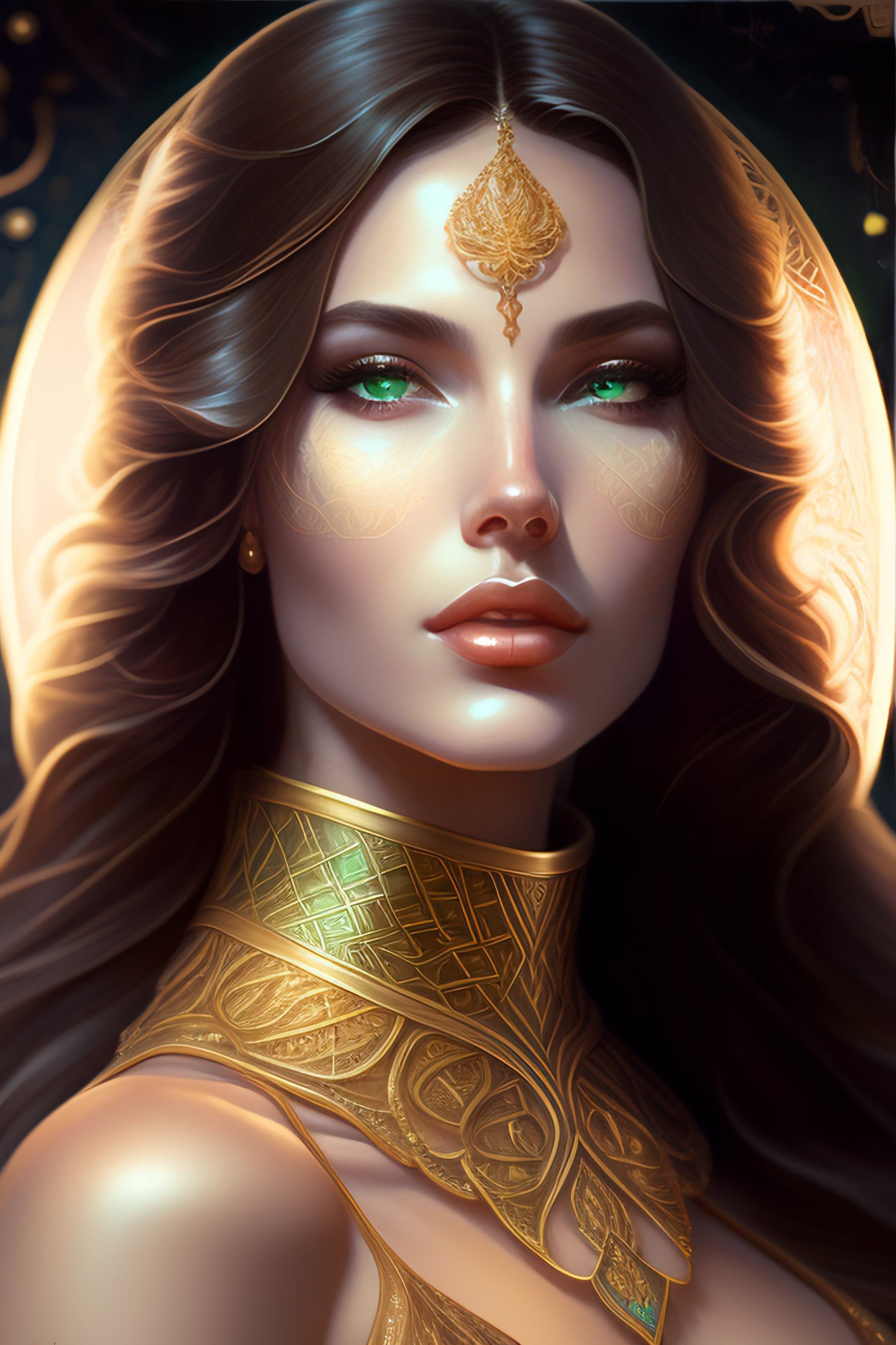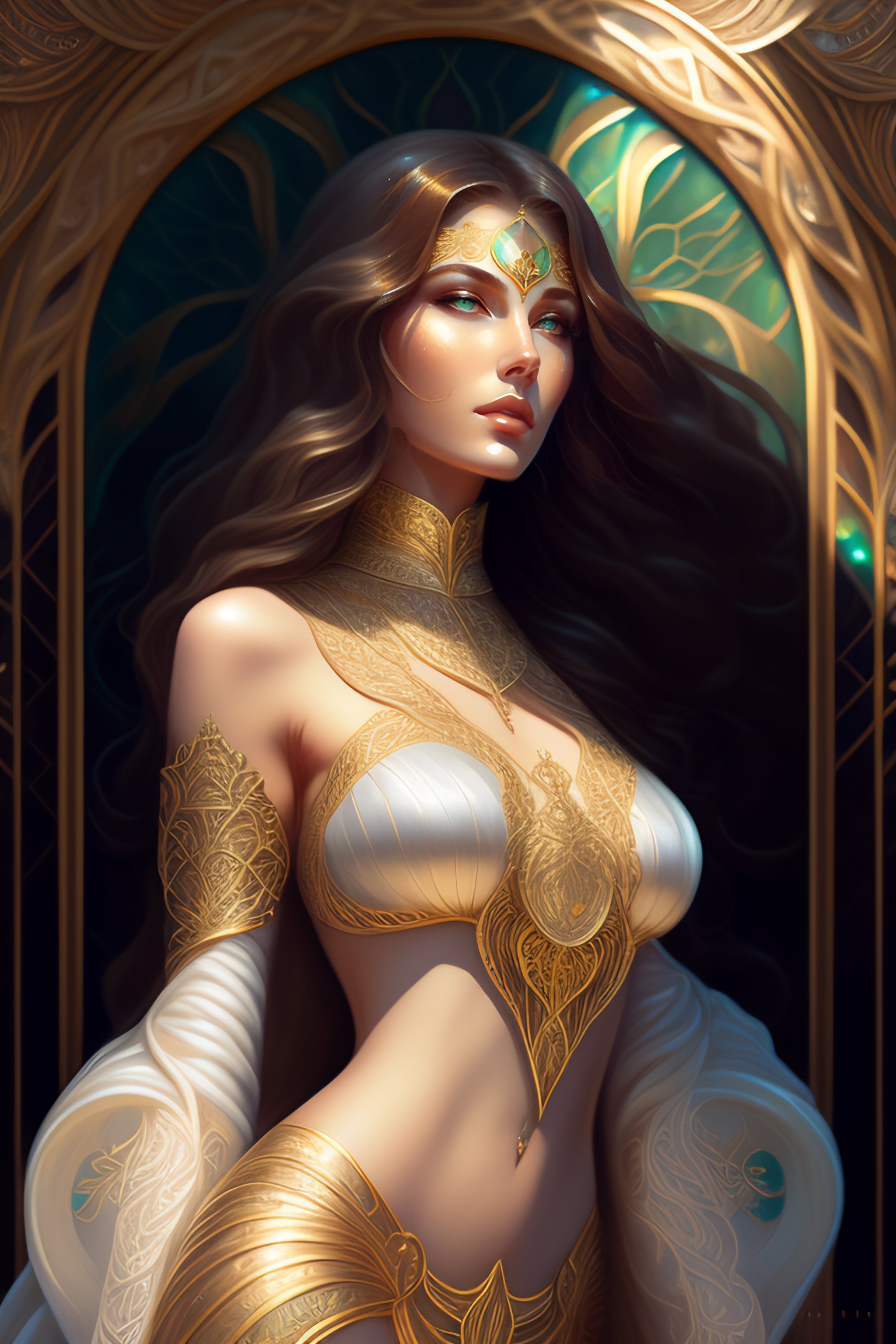Symmetry, full body portrait of gorgeous, american sacral priestess, witch, goddess, queen, princess, pale glowing white skin, intricate emerald and gold jewelry, long brown hair blowing in the wind, dressed in jewels tones, long highlighted chestnut brown hair, hazel green eyes, magical surrounding lighting outline, holding a quartz crystal staff emanating rainbows, exotic, pretty face, intricate, elegant, highly detailed, digital painting, artstation, concept art, smooth, sharp focus, illustration, art by artgerm and greg rutkowski and alphonse mucha, erte, art deco, filigree and scroll, 8 k