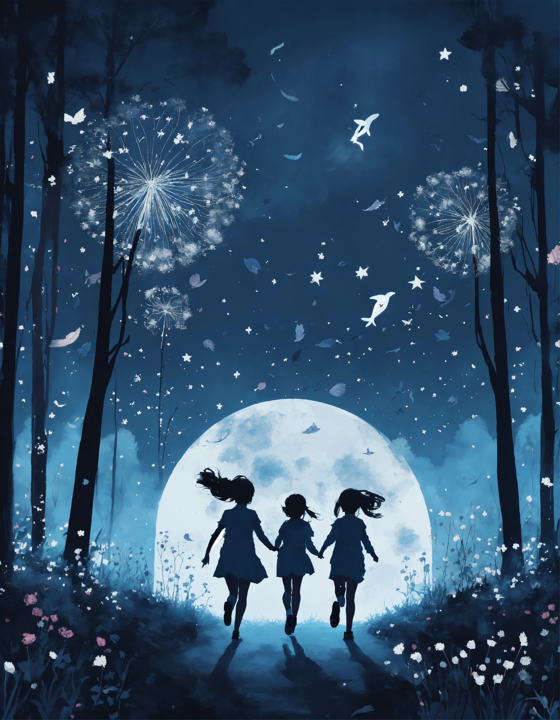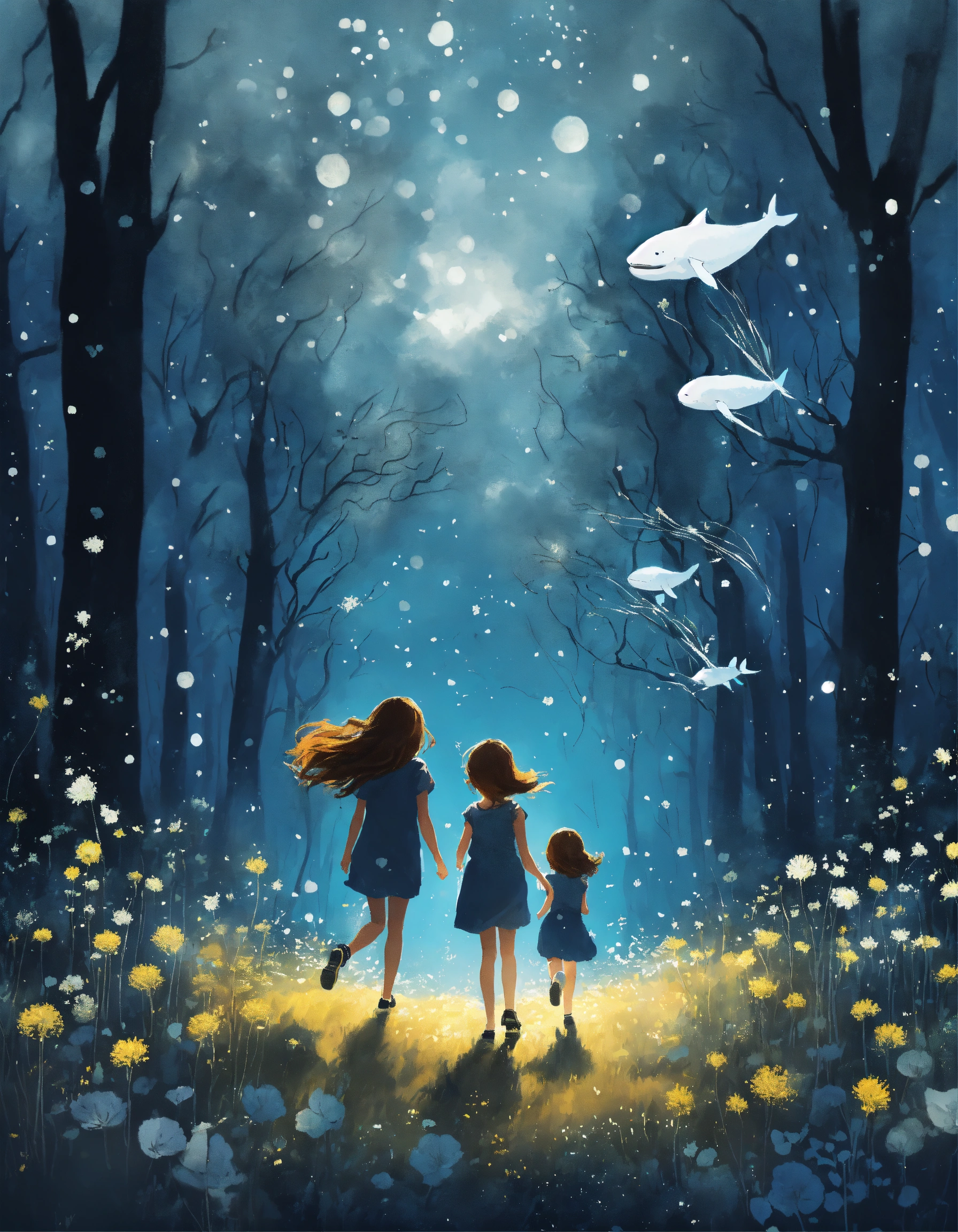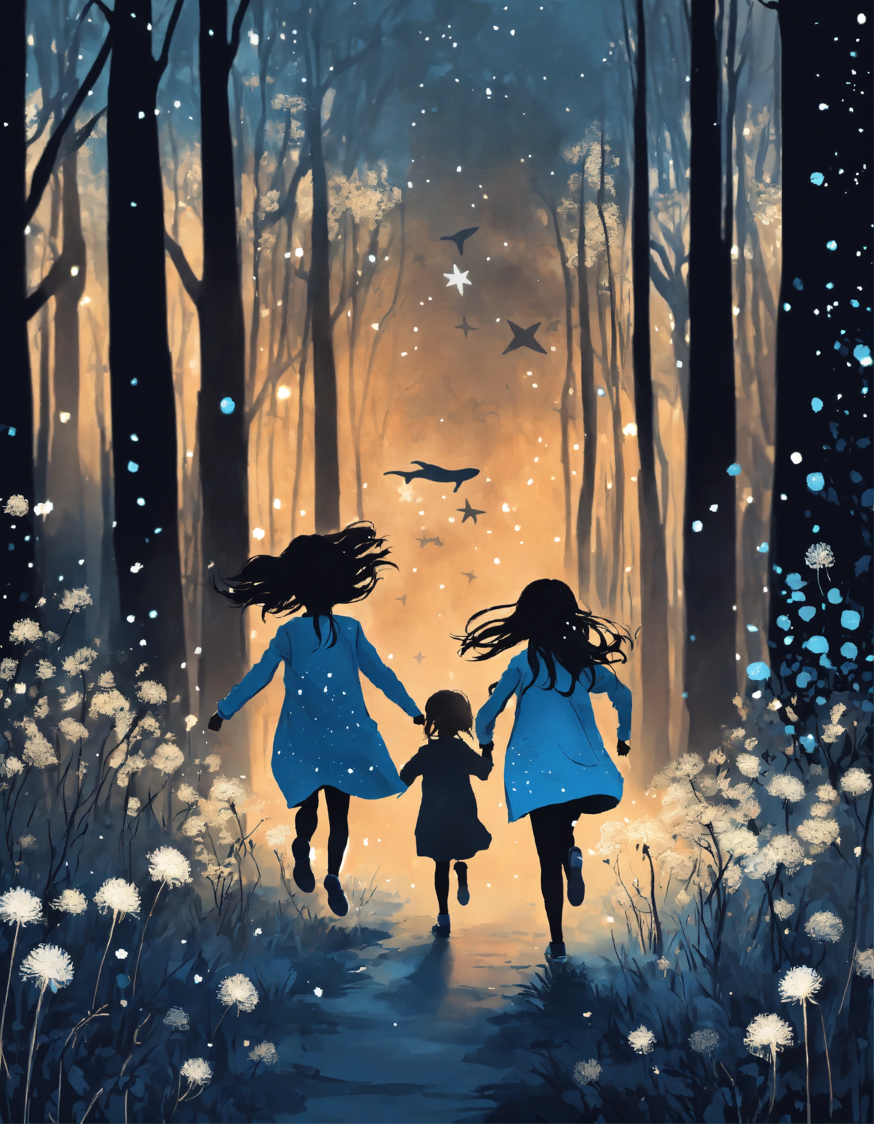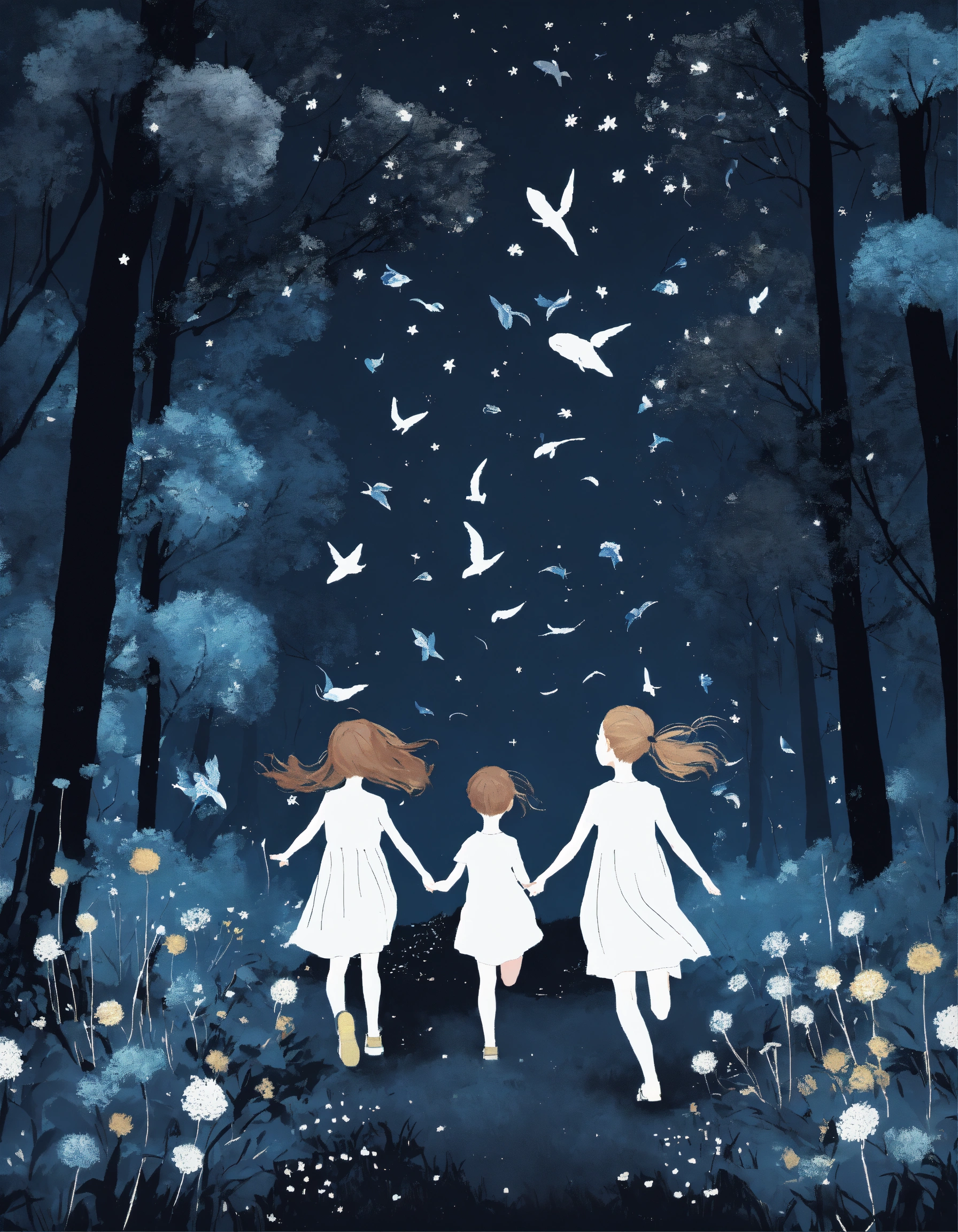 Two little girls are running through a dark magical forest with dandelions, star whales are flying above them, simple stile, texture painting, texture vector illustration, dreamy blue colors, black white and gray colors, lots of brush texture