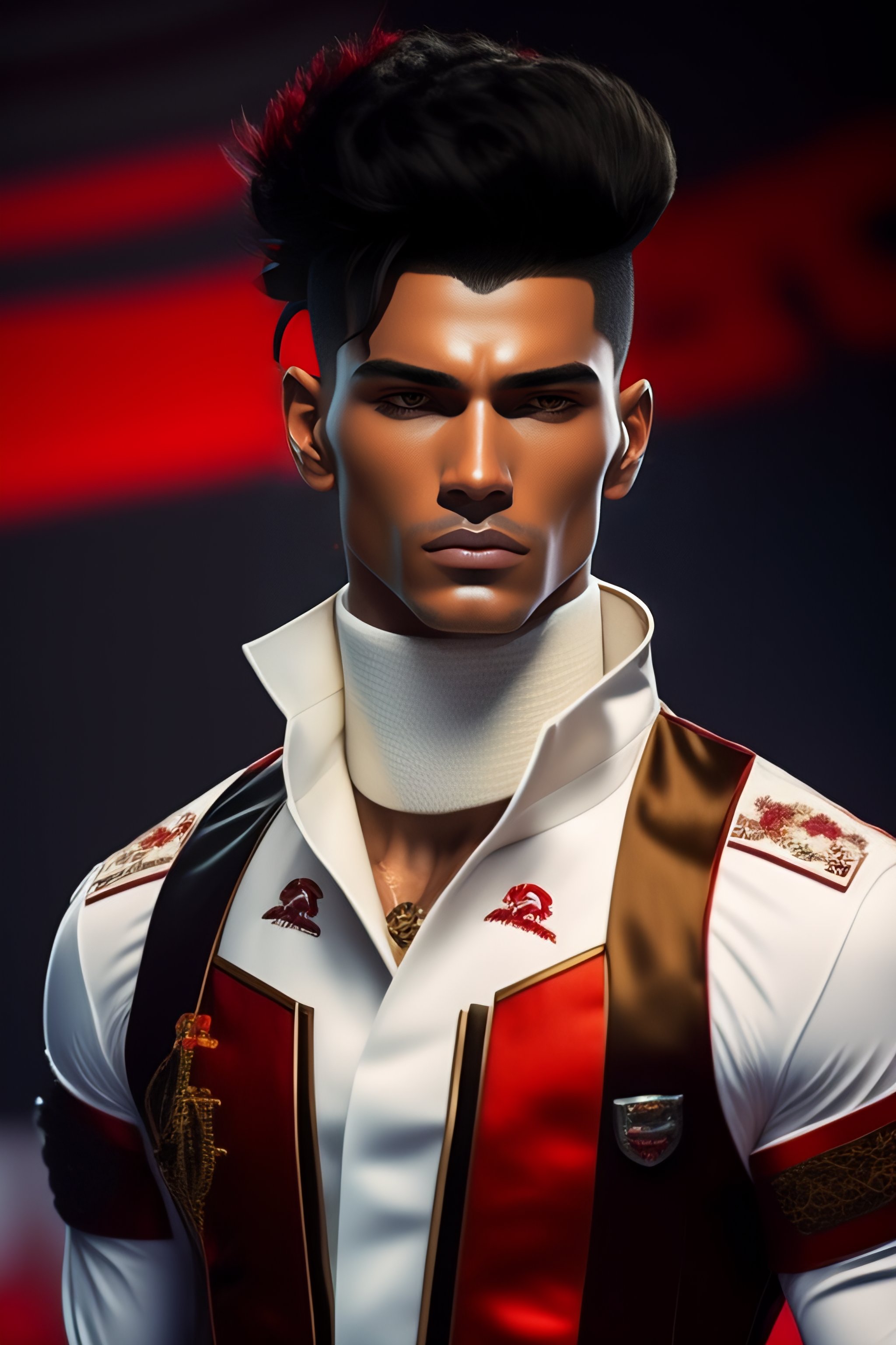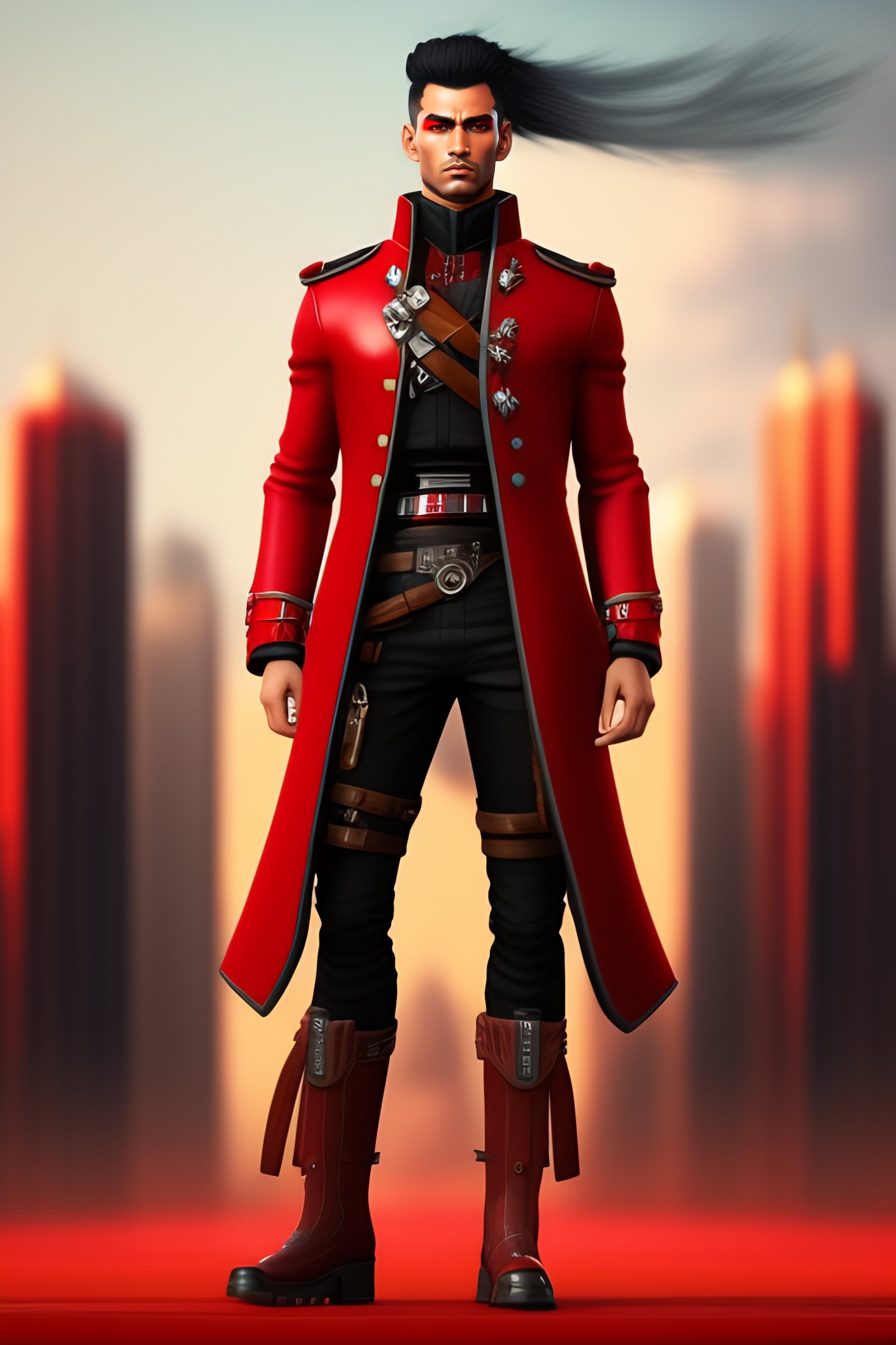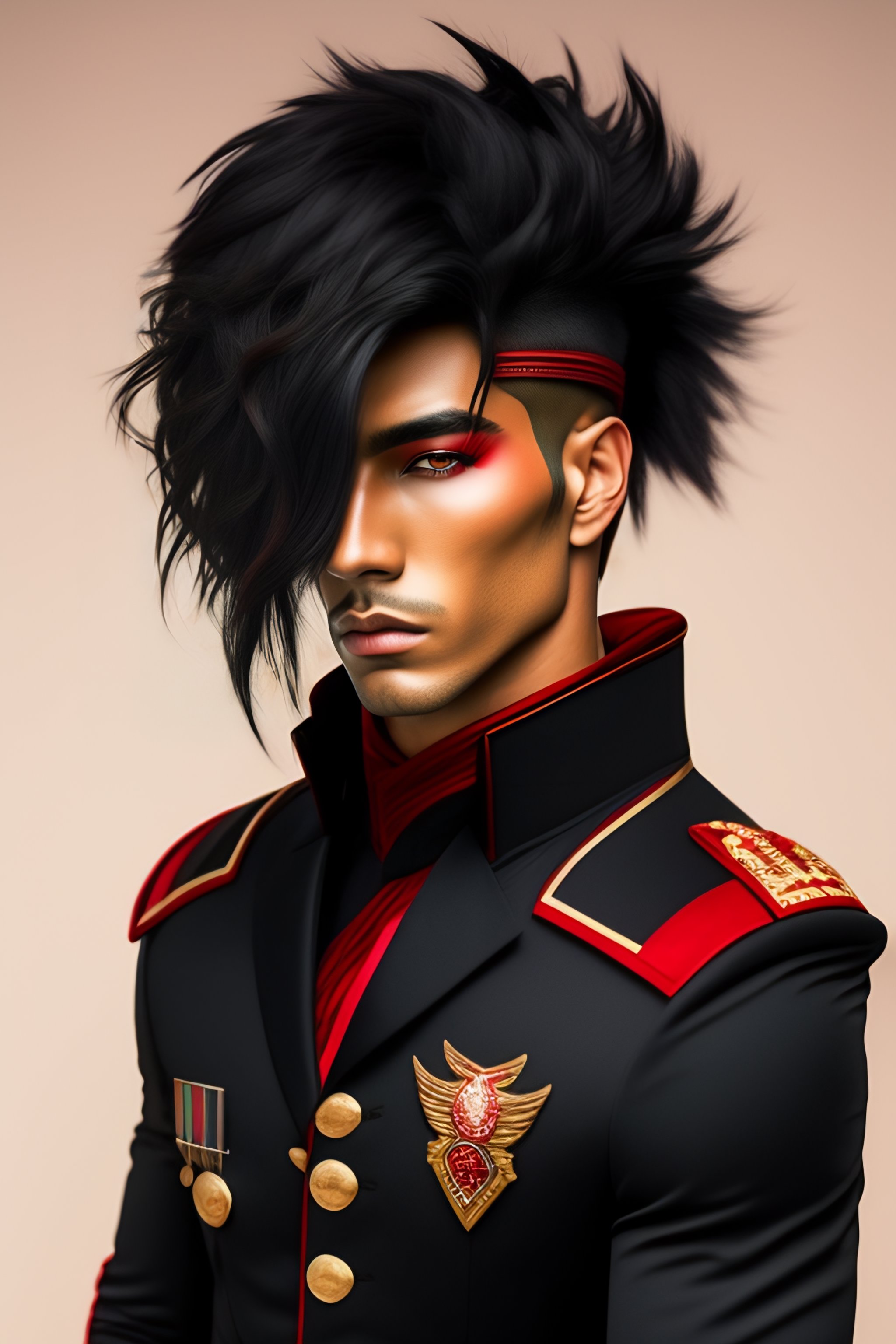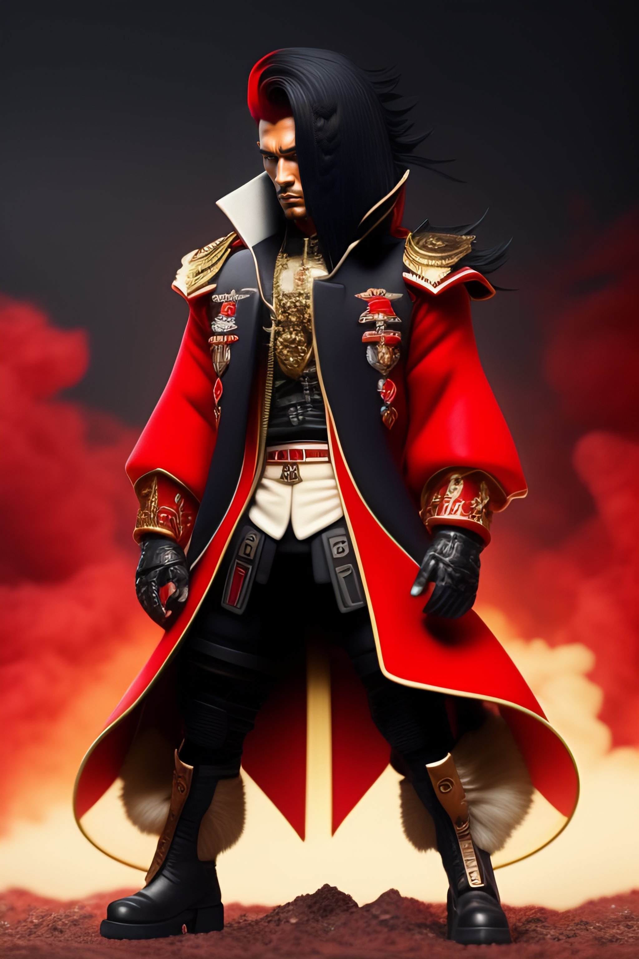 Hombre de cabello negro con mechas rojas, pantalones y botas militares negras, camisa blanca con corbata roja, chaqueta americana negra, portando una gran guadaña, mascara inferior demoniaca japonés, pelo largo al estilo de madera uchiha, un mechón de pelo tapando un ojo, cuatro ojos rojos, complexión atlética