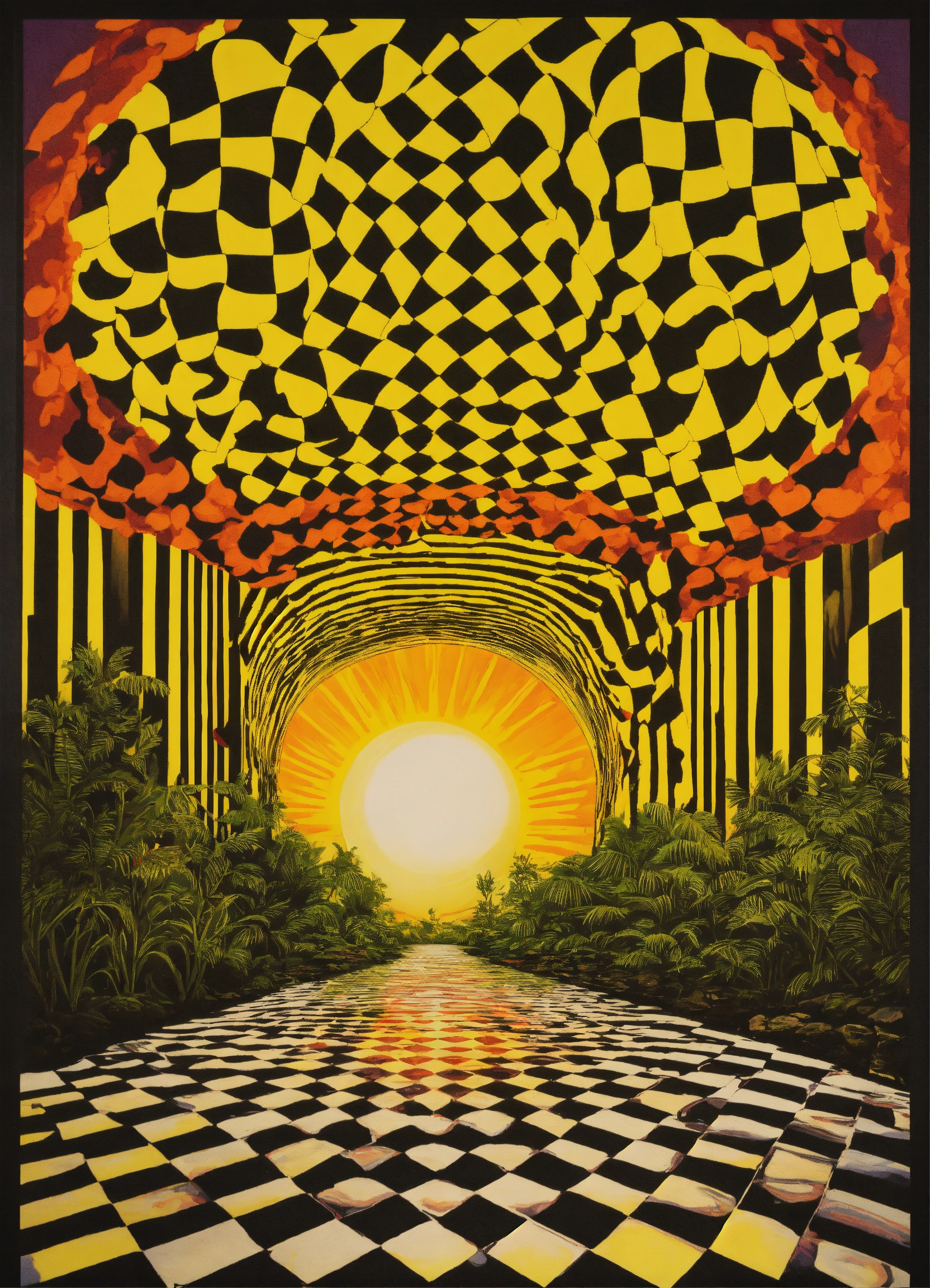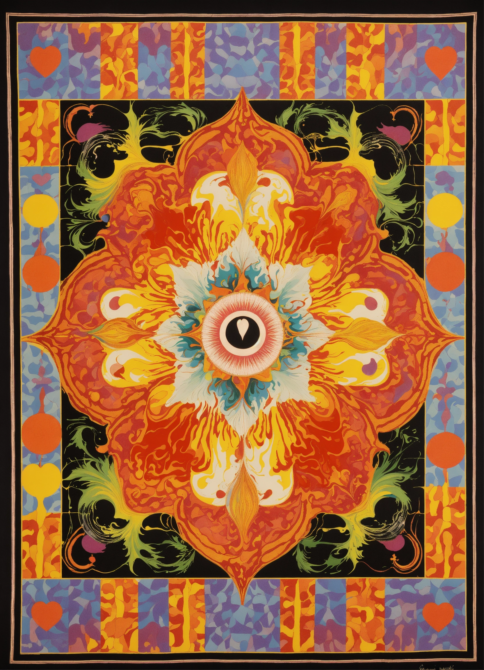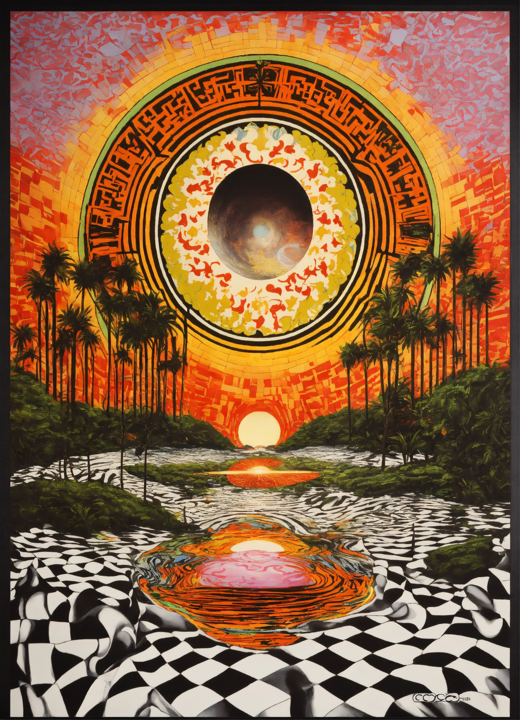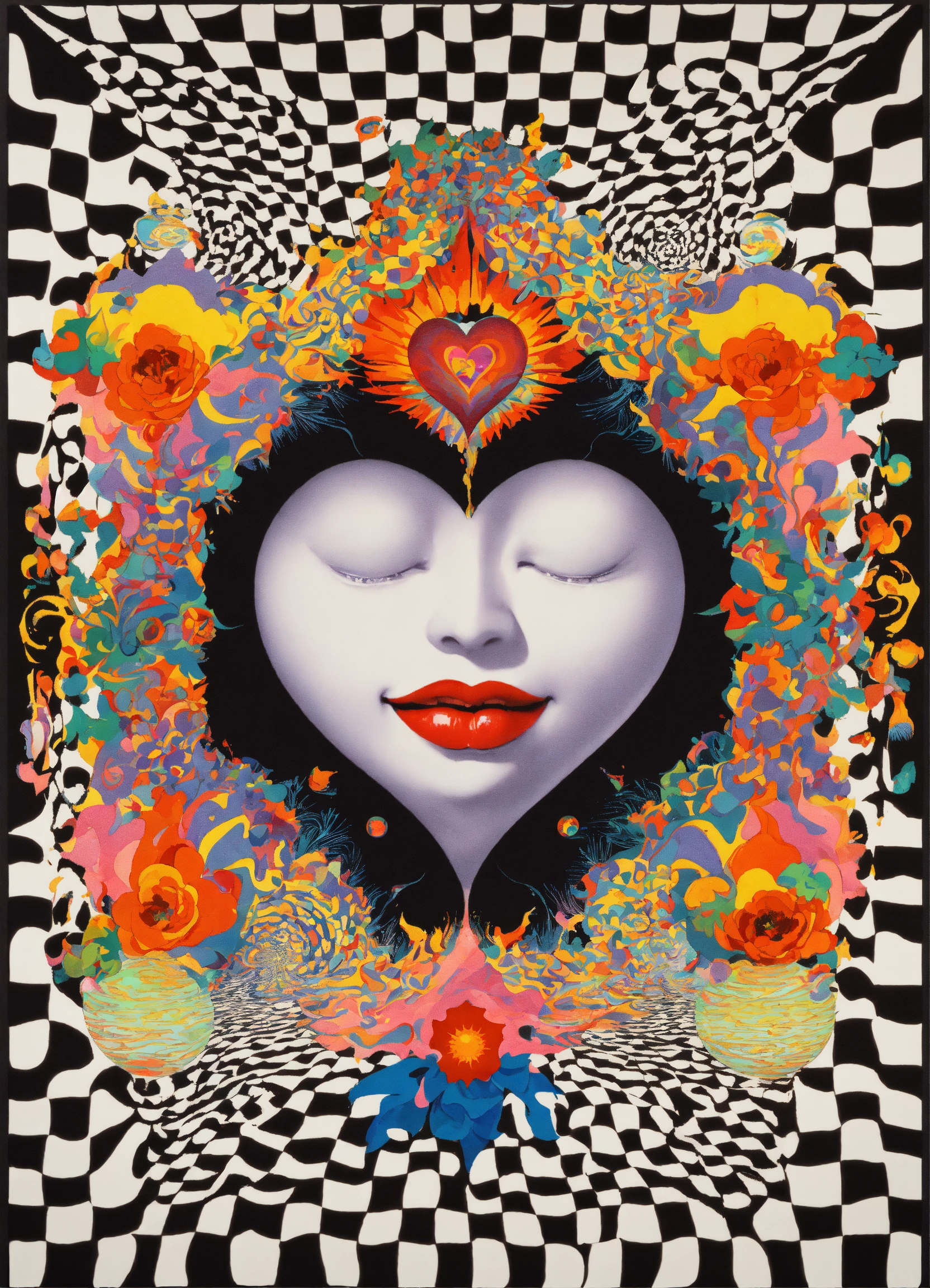 Janpanse retro poster, big smiling love heart merging with oriental big sun containing four corners of cosmos, abstract psychedelic vortex by andy warhole, symmetrical grid patterns, psychedelic mount melting eyeball merging into dripping love-heart by coogi pattern mount, 3d rim dripping, dream dimension merging into nebula merging into sun merging, florescent geometrical clouds dripping, dense jungle melting into floor, black and white checkerboard patterns dripping by maurits cornelis escher