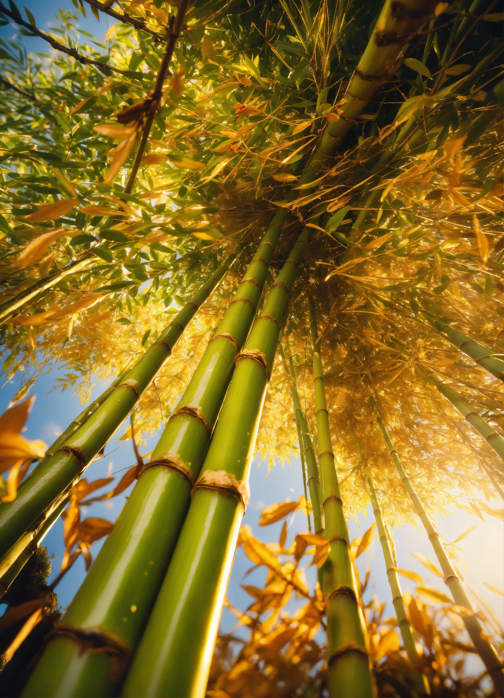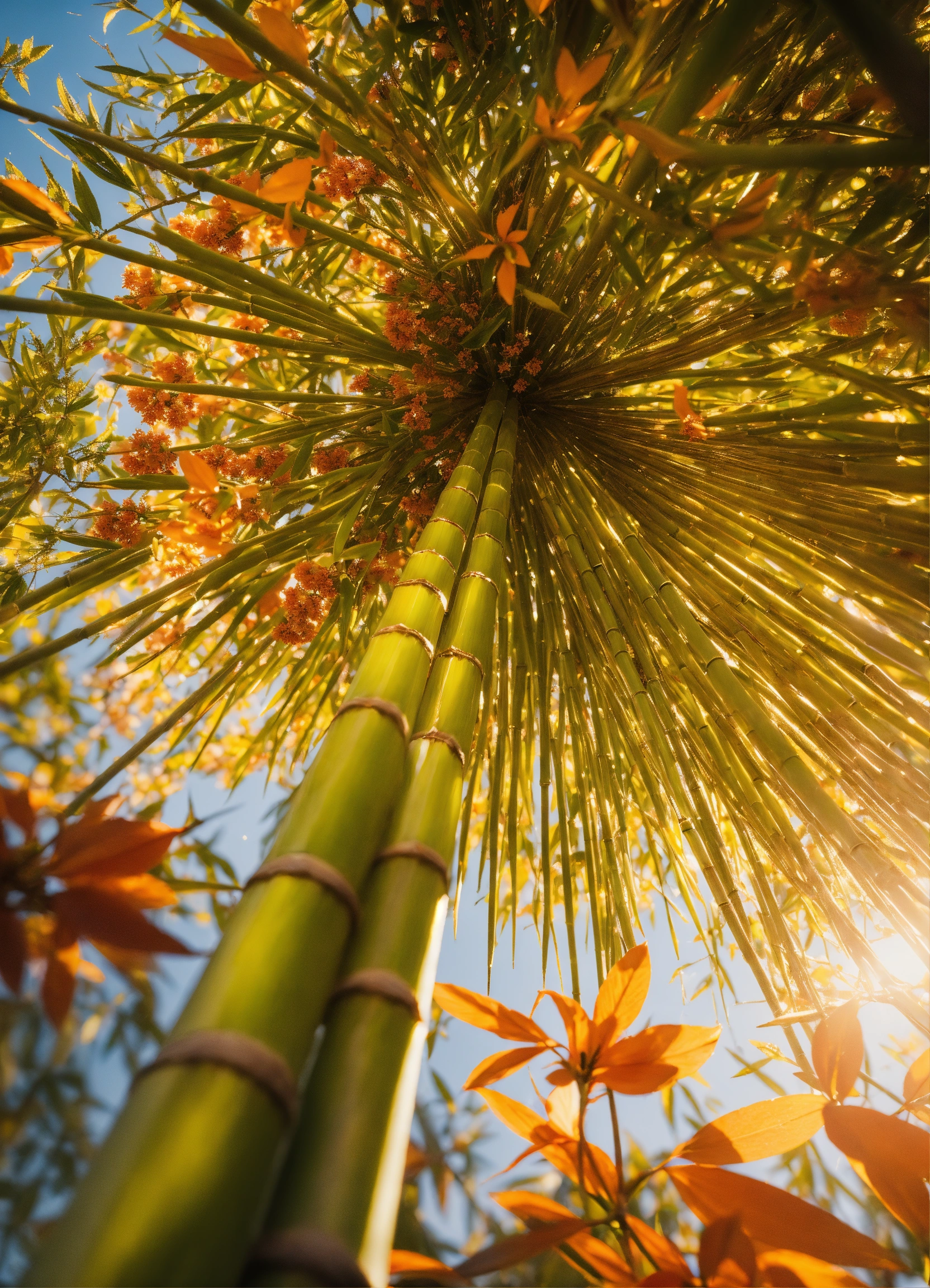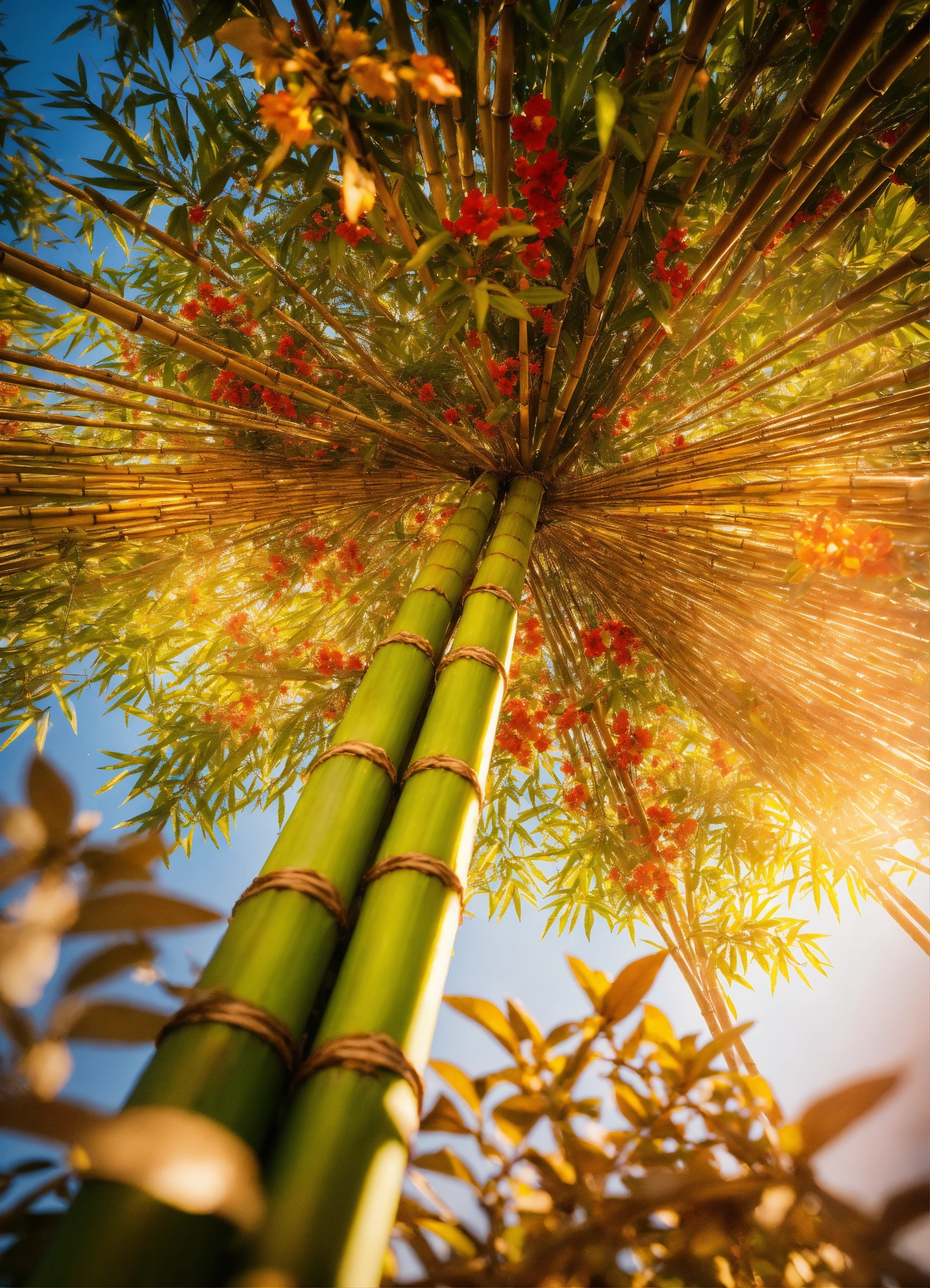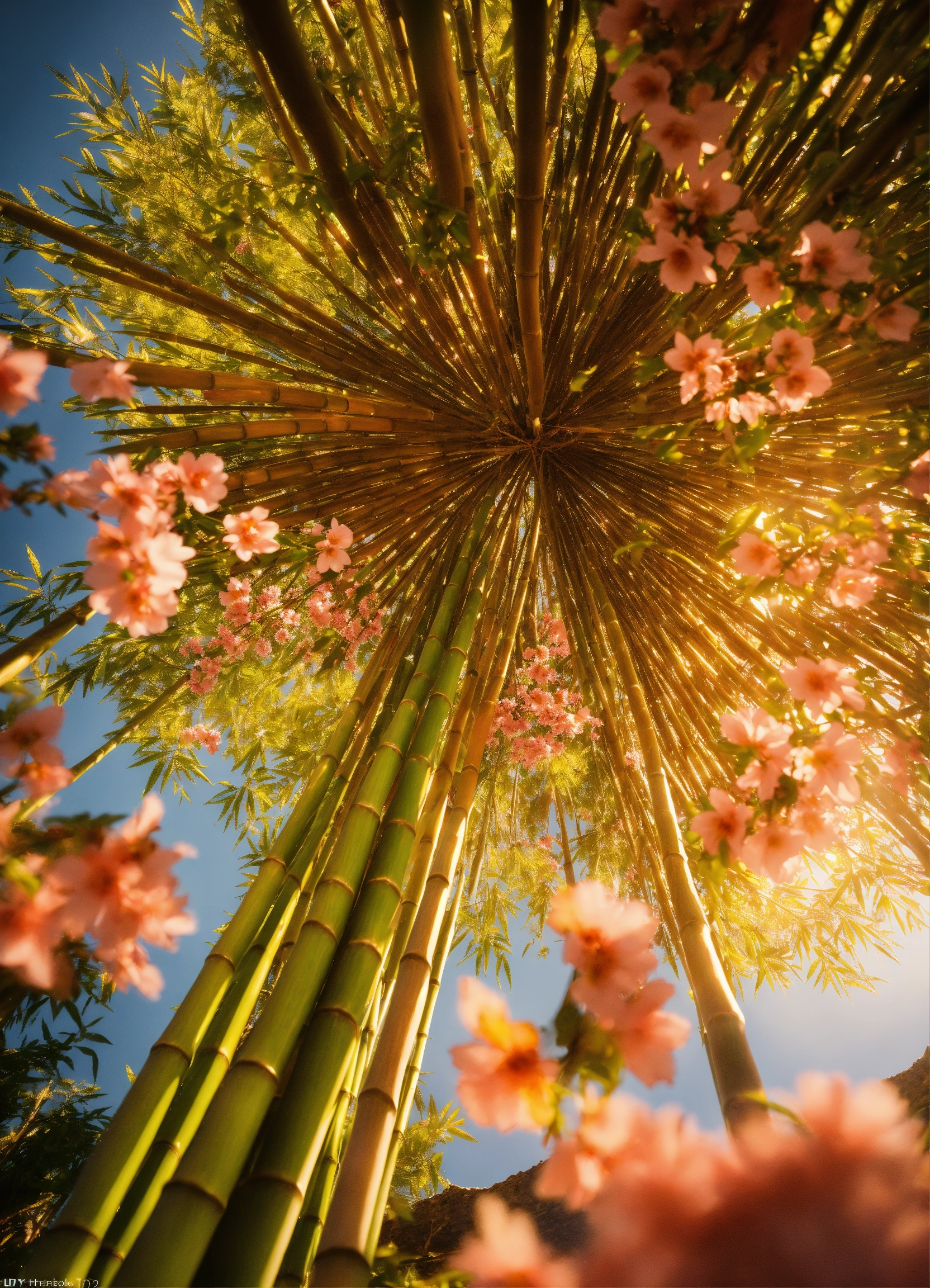 A hyperrealistic image in ultra-high definition captures a warm climate and warm, enveloping light in the scene. the composition is from a low angle looking up, with bamboo suspended in mid-air, gracefully in motion. the frame is tight and close-up on the flowers, creating an air of mystery in the scene. this art photograph is presented in stunning 8k resolution, highlighting its emphasis on photorealistic art and smooth 3d cinematography.