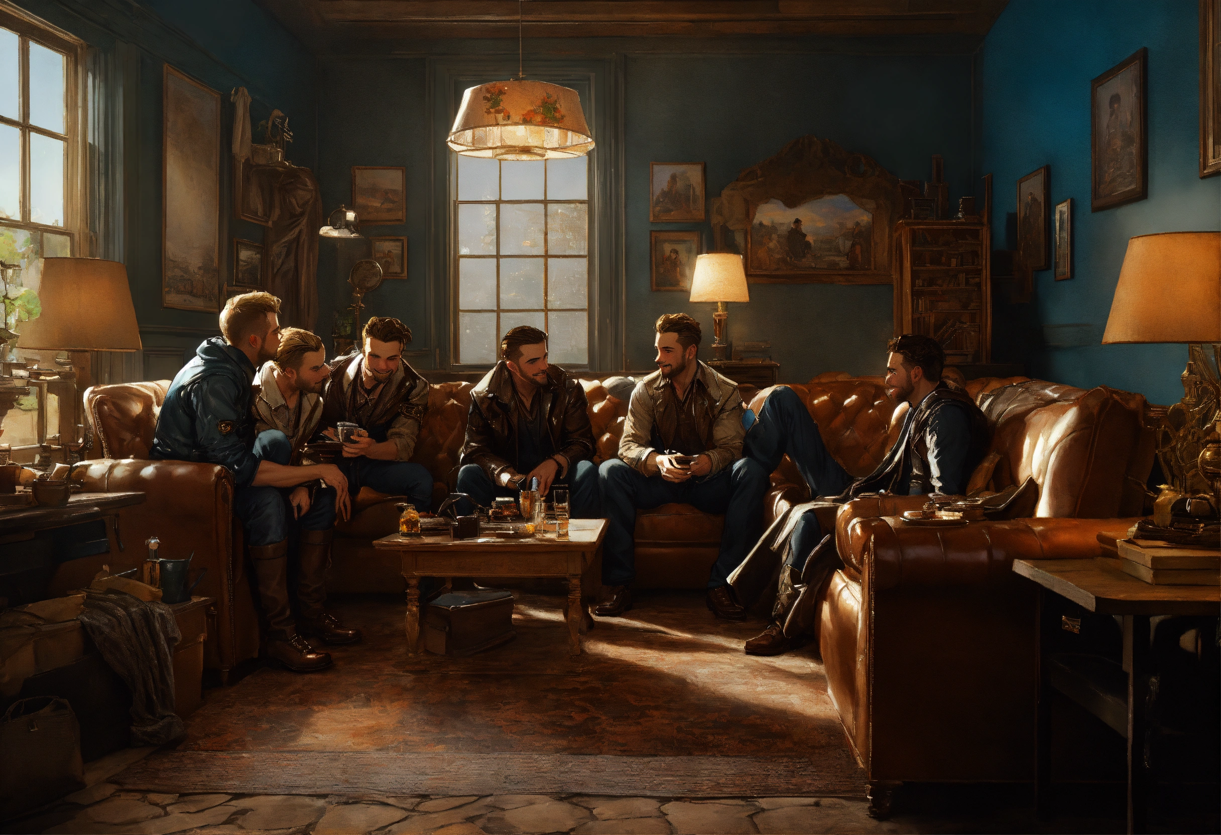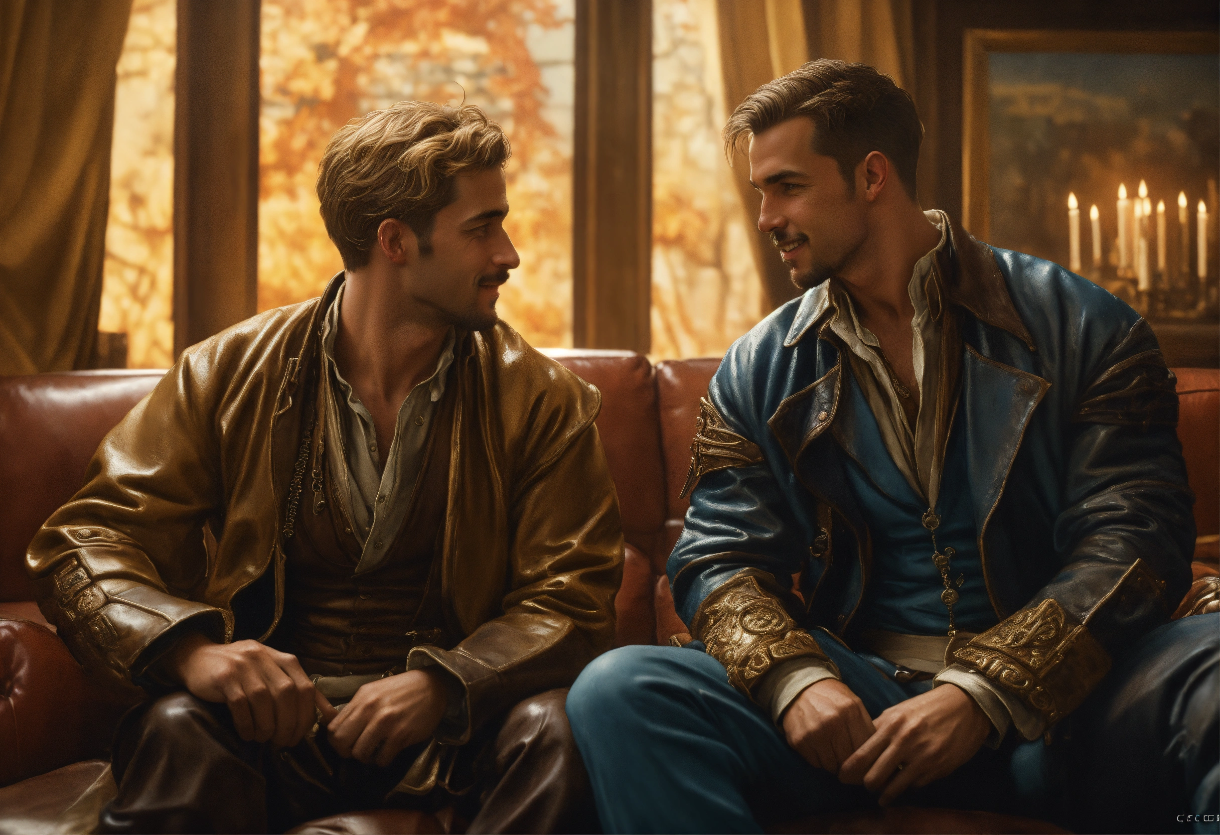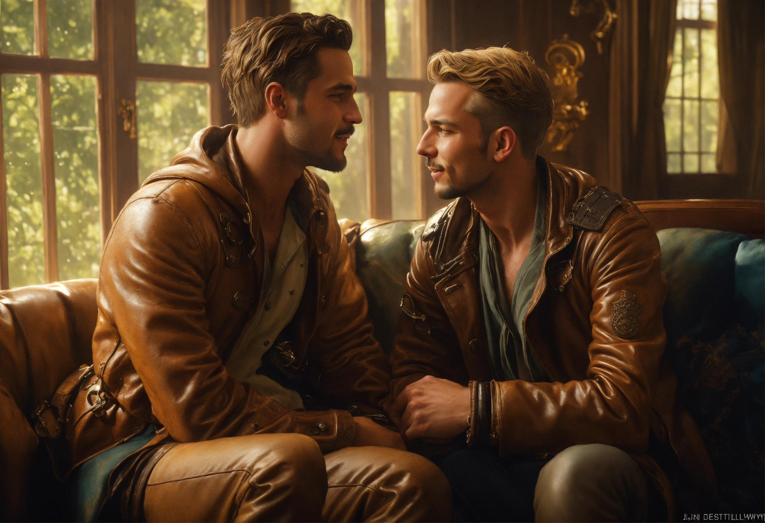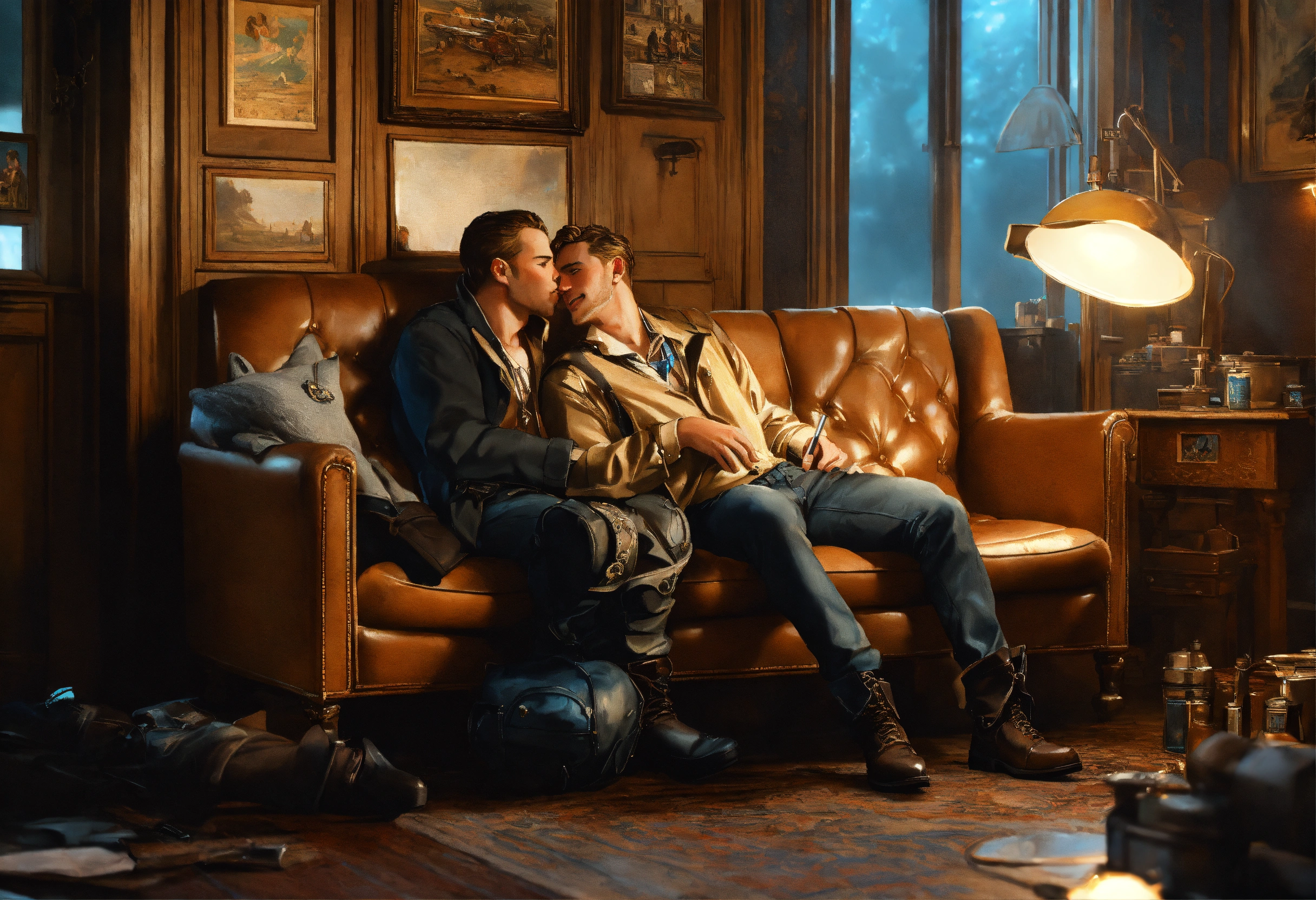 Smiling blond men in solid wet oil rainwear kissing, looking into his tender blue eyes in the same room a highly detailed picture of the reaction guys sitting on a couch that looks like the iron throne, four excited men, in the same room a frustrated male writer with depression, in the same room male men kissing man male film star, beautiful photorealistic illustration, intricate details, natural lighting, 8 k, artstation, volumetric lighting, smooth, highly detailed, octane render, by andres rocha and albert bierstadt and greg rutkowski, by j.c. leyendecker, steampunk, perfectly detailed image, close-up, excellent lighting, photorealistic, digital illustration, realism, by tom of finland, bastien lecouffe-deharme, norman rockwell, daniel ridgway knight, mike dargas, lucio amitrano, omar ortiz, disney
