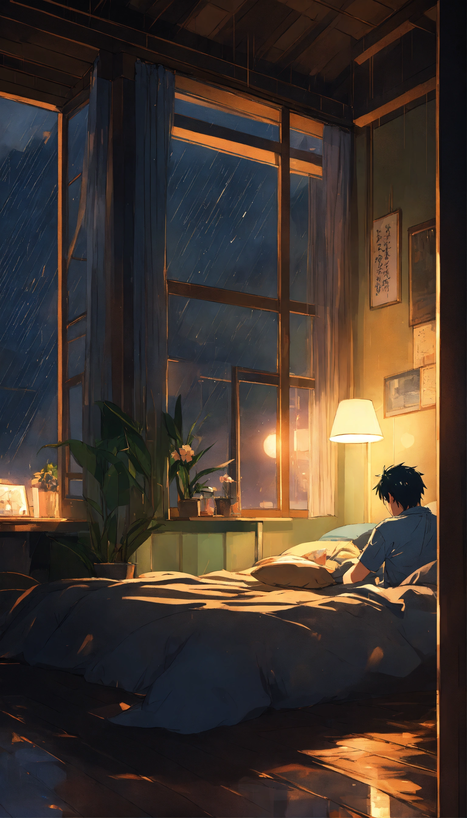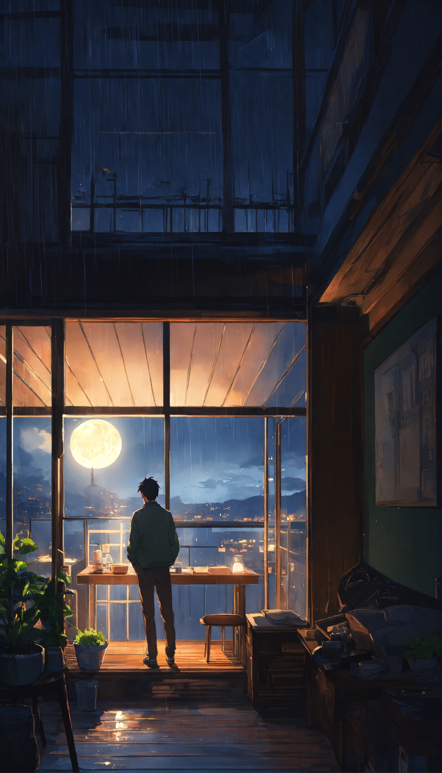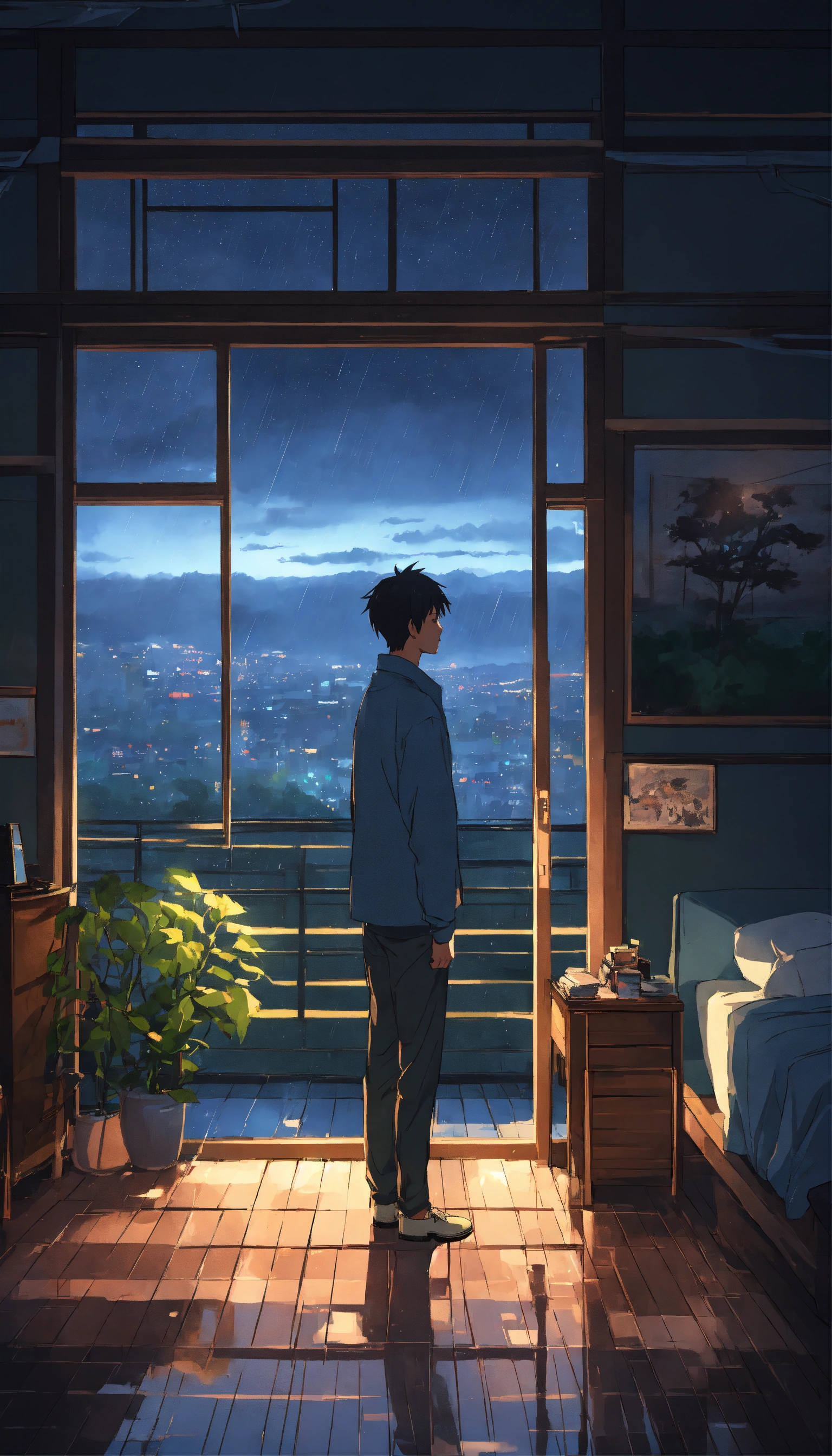A man viewing a windows inside a dark bedroom at rainy night makoto shinkai style