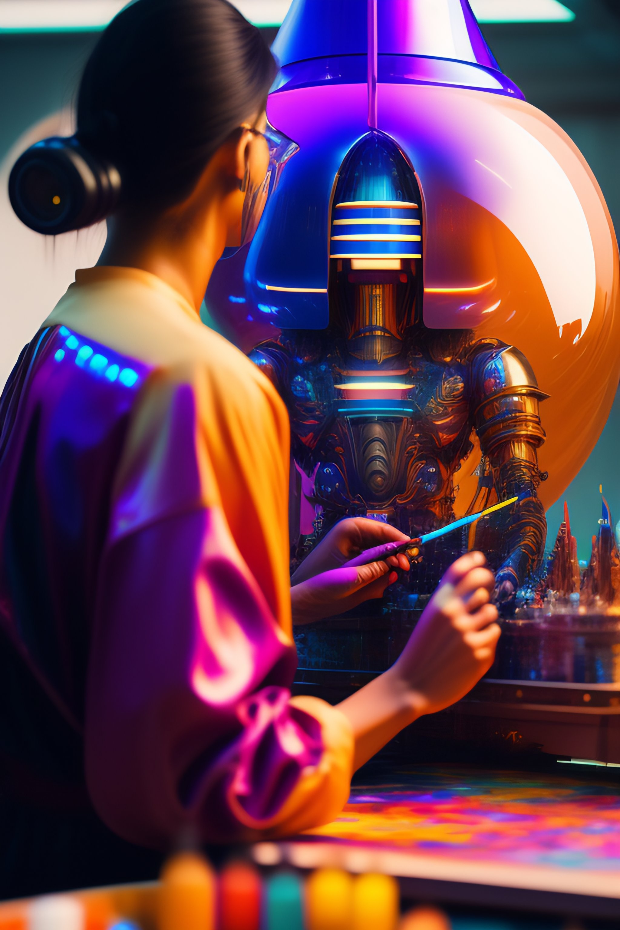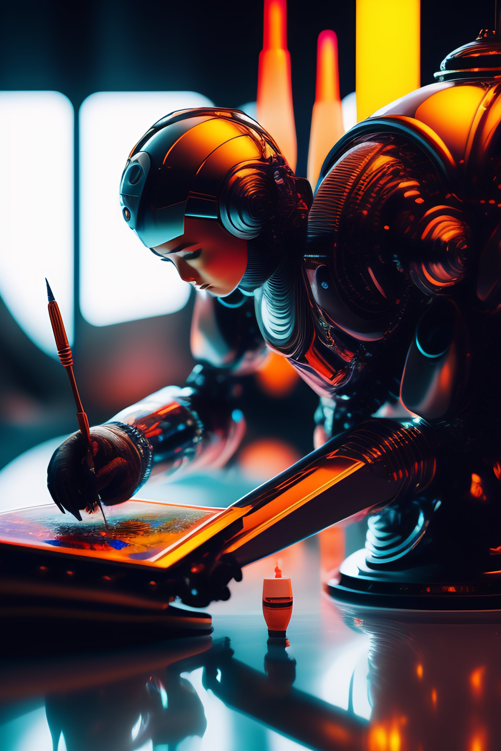 Photo of futuristic holy futuristic cyborg - robot - painter - artist creating a painting with acrylic paint and brushes in a futuristic artist studio by h. r giger, by, rich deep colors. masterpiece, intricate artwork by tooth wu and wlop and beeple, gaspar noe, james cameron