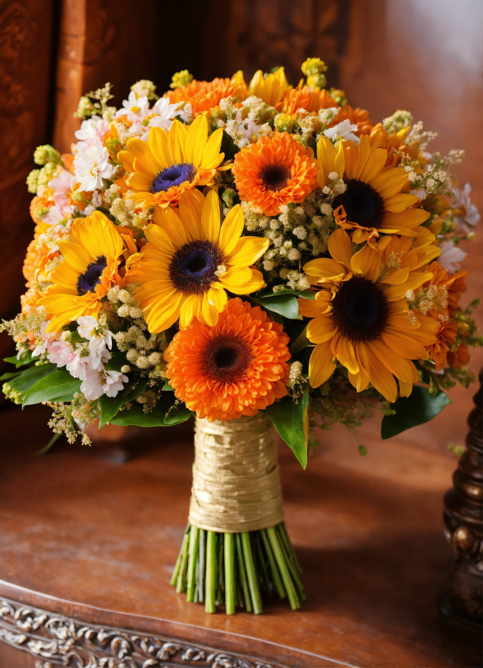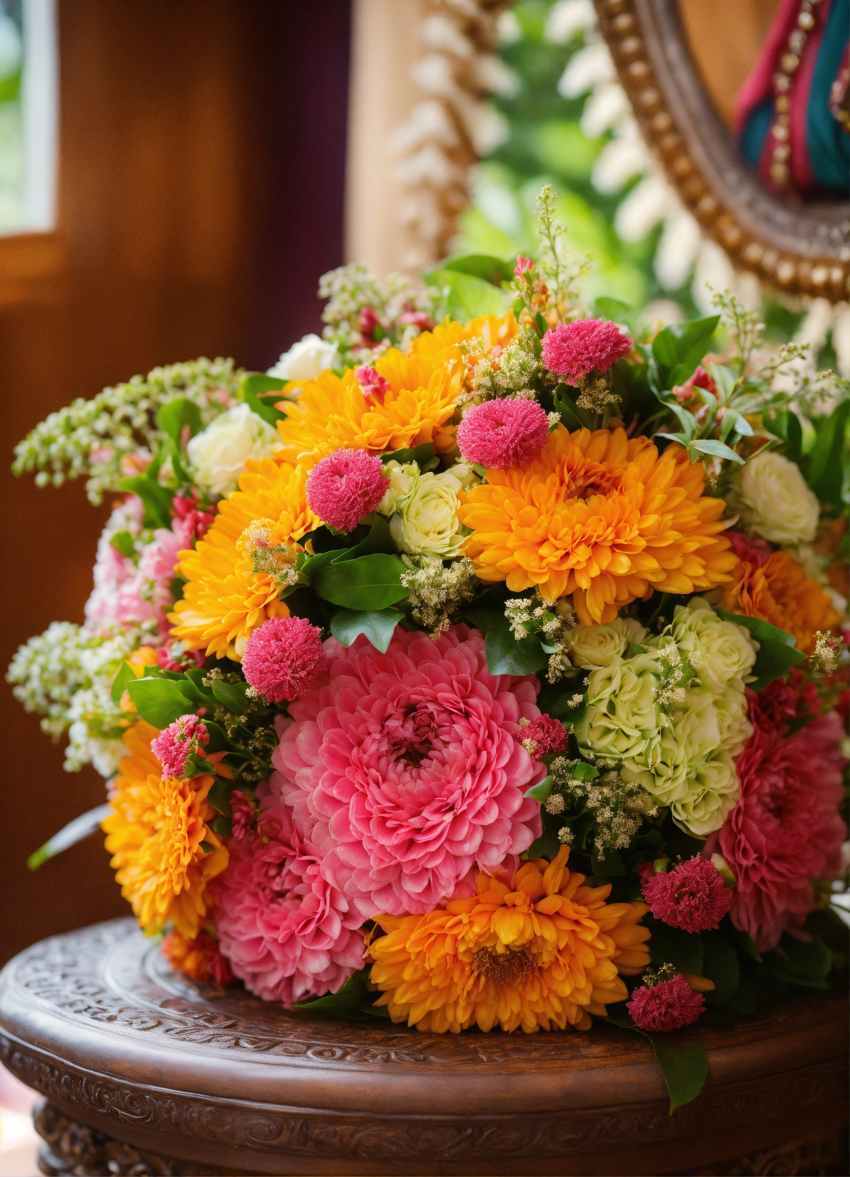 A bouquet artistically skilled adorned with fragrant flowers of campaka, ashoka, punnaga and saugandhika