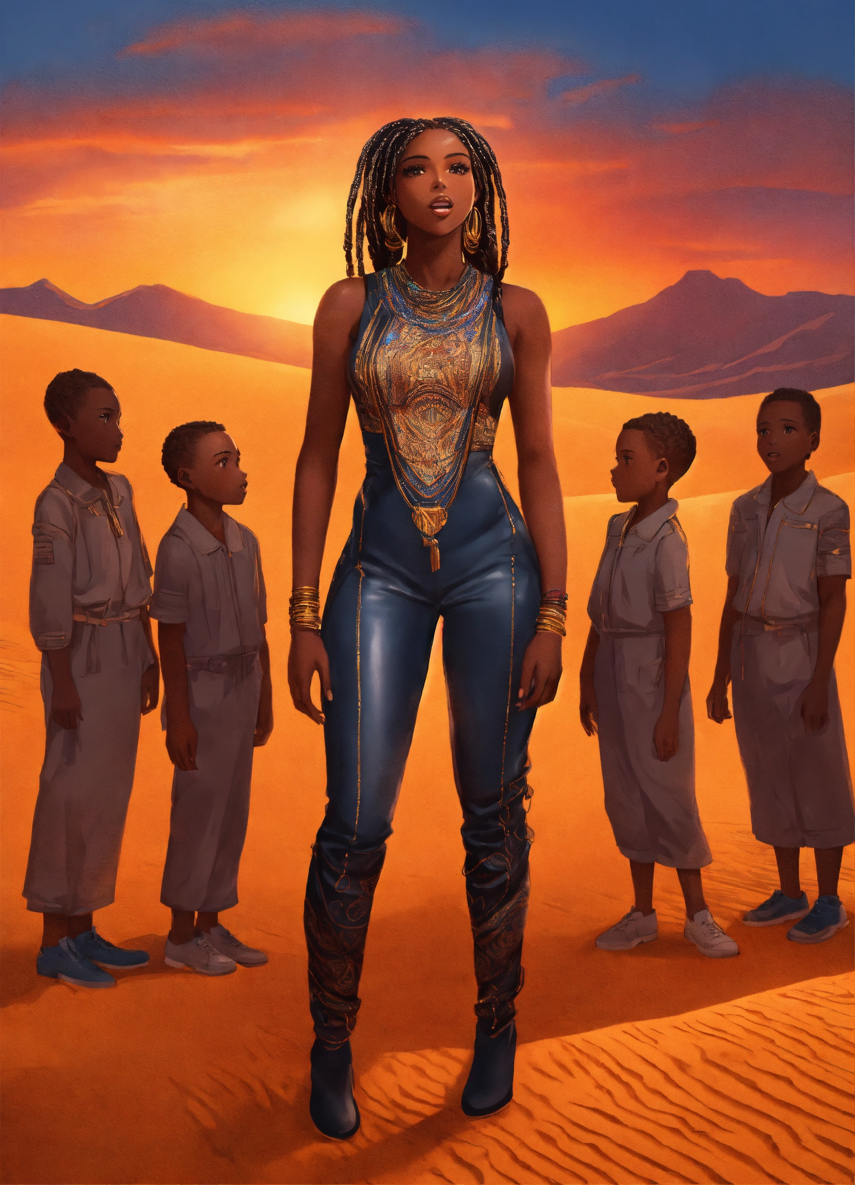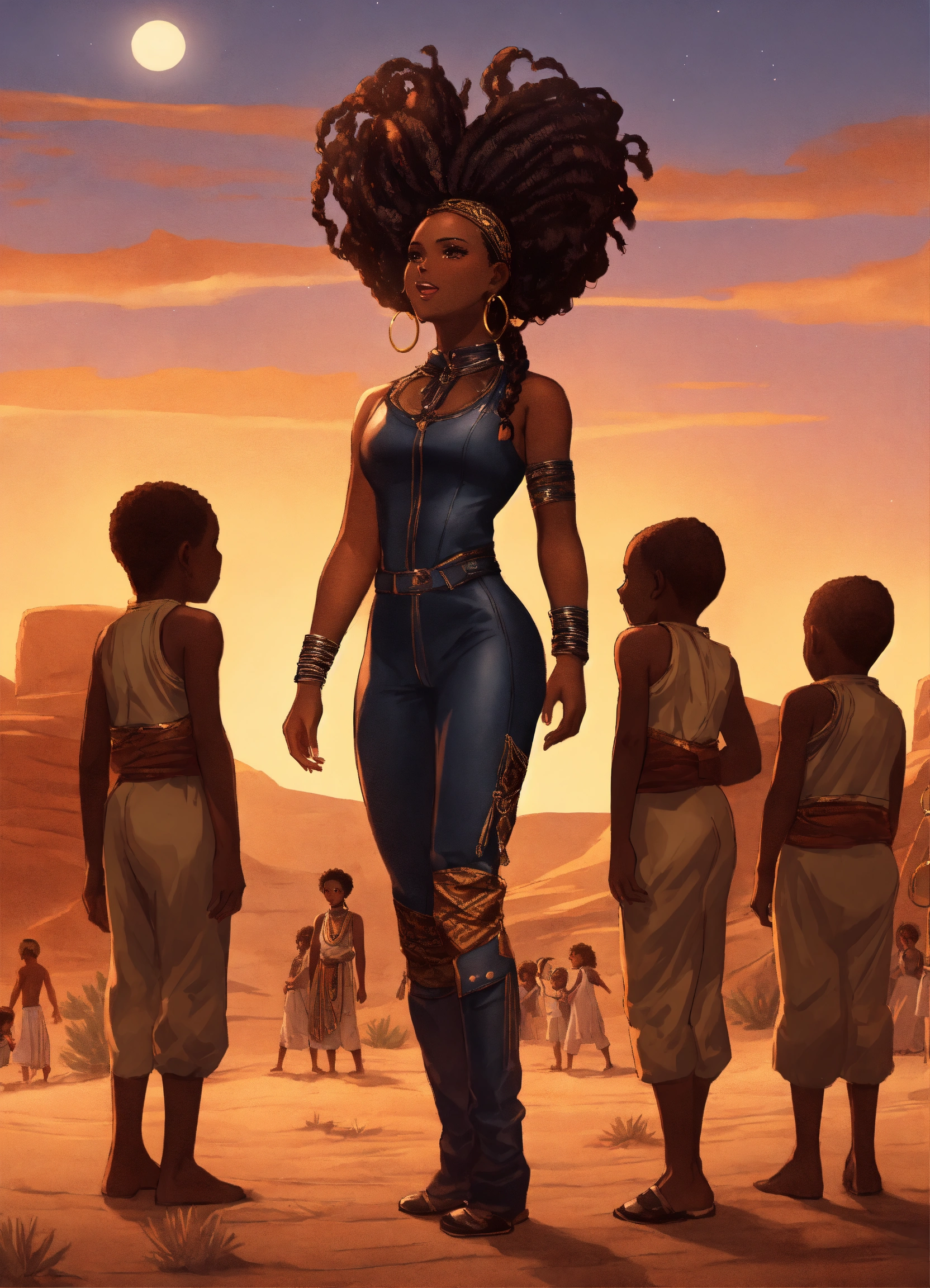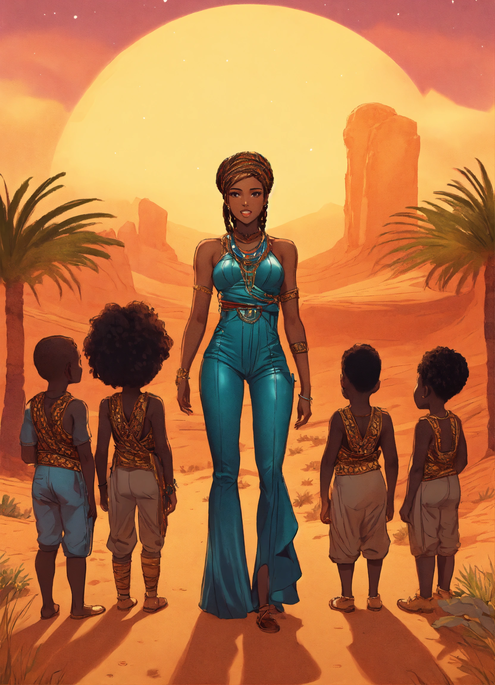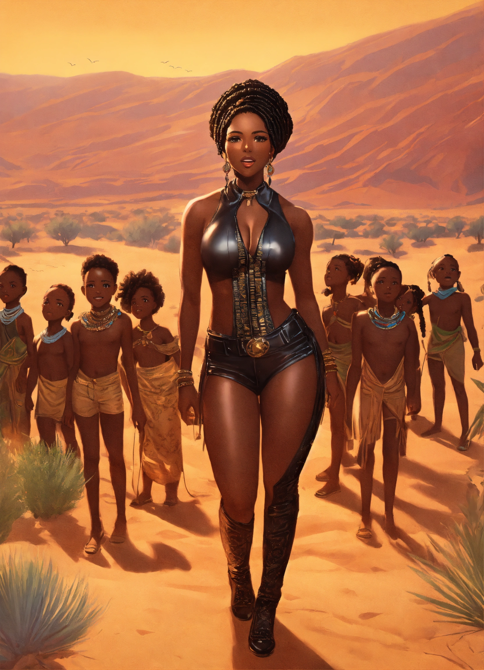 Full body incredibly insanely stunningly beautiful 35 year old cartoon dark skinned african american woman with intricate braids in her hair dressed in leather jumpsuit gloriously standing in the desert oasis during a celebration looking powerful with ten little african children looking up to her for guidance