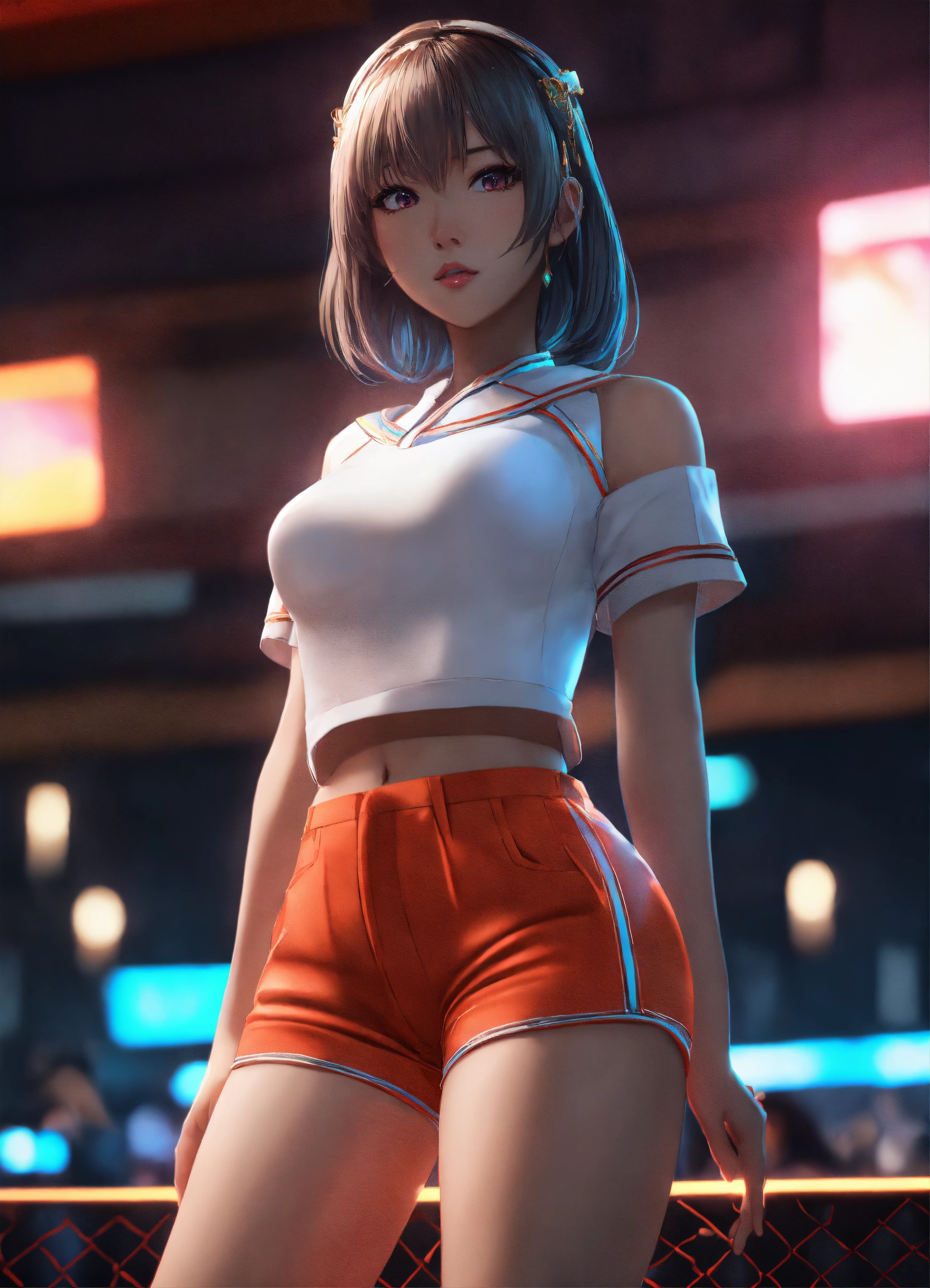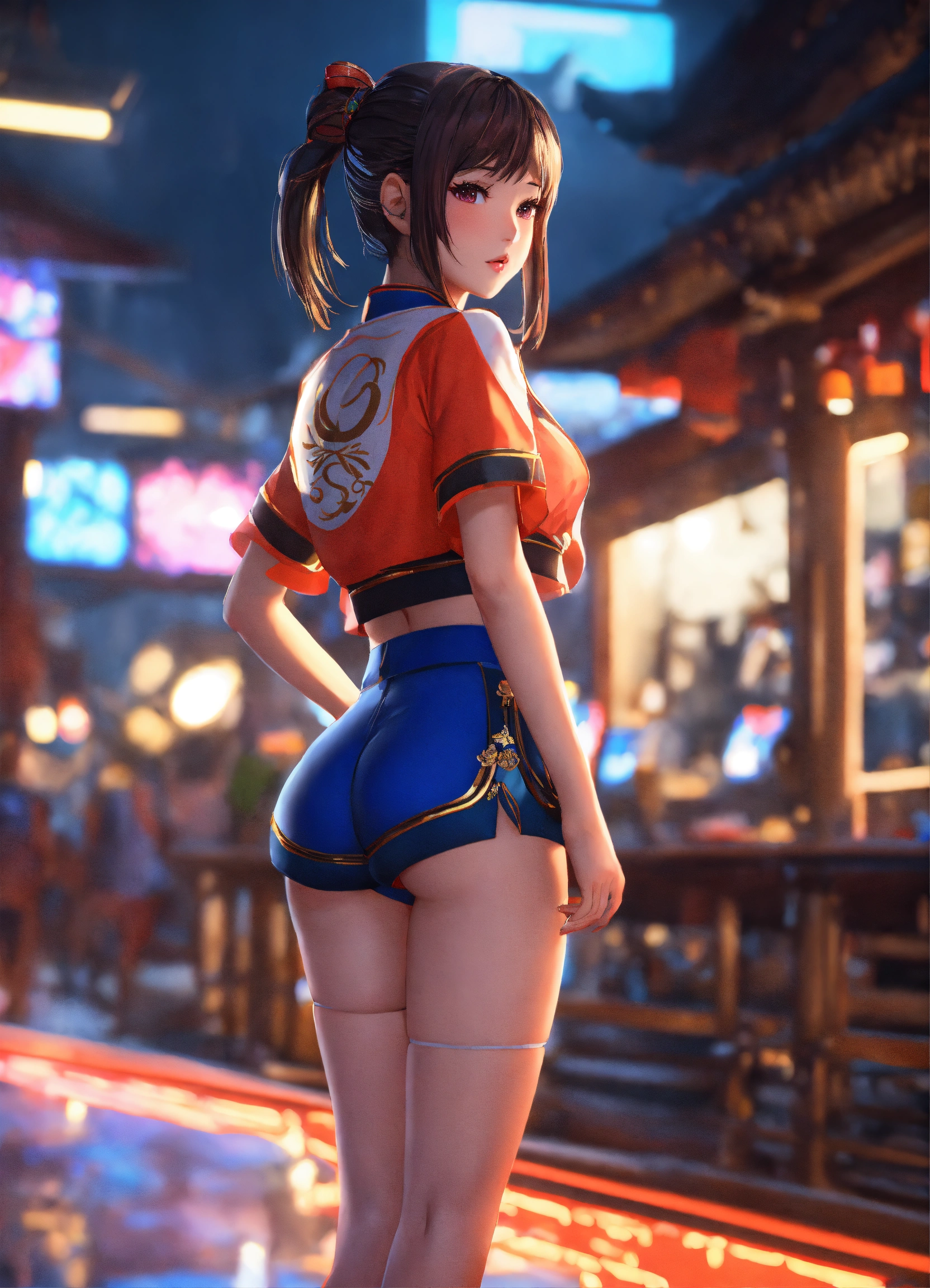 Unreal engine 8k cute asian royal girl waifu wearing tight shorts looking behind anime realism neon