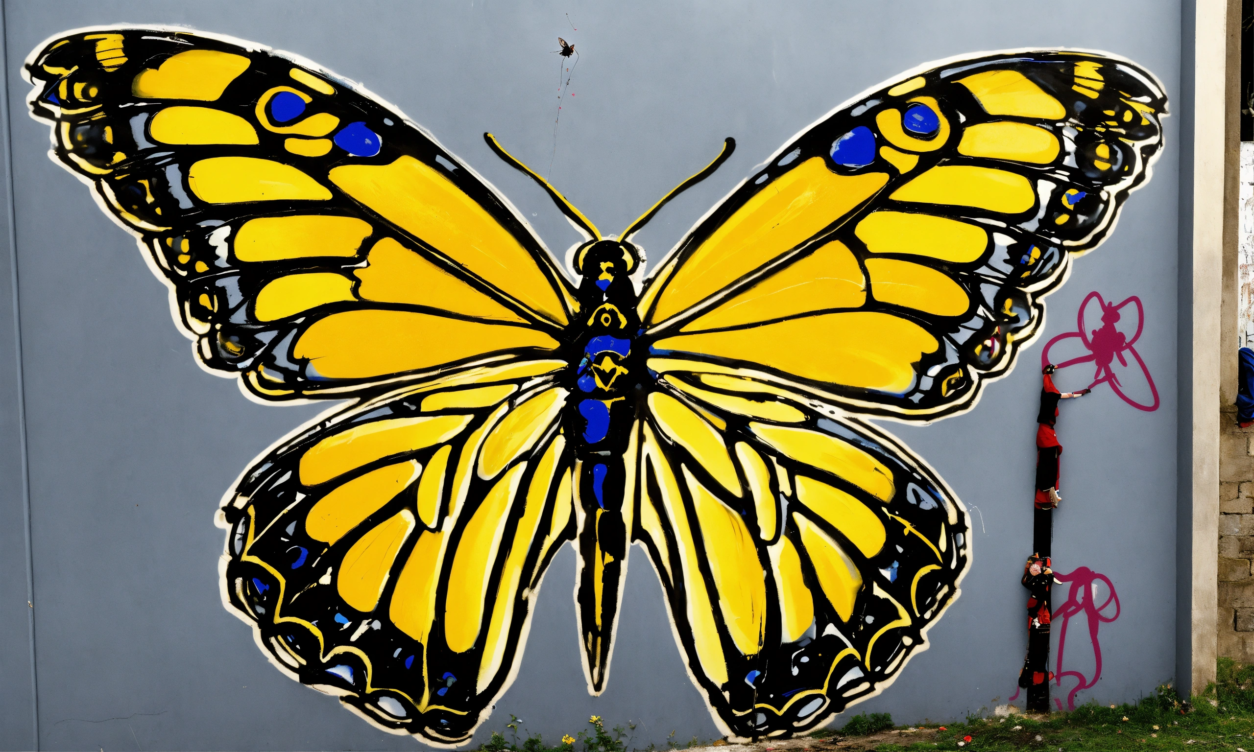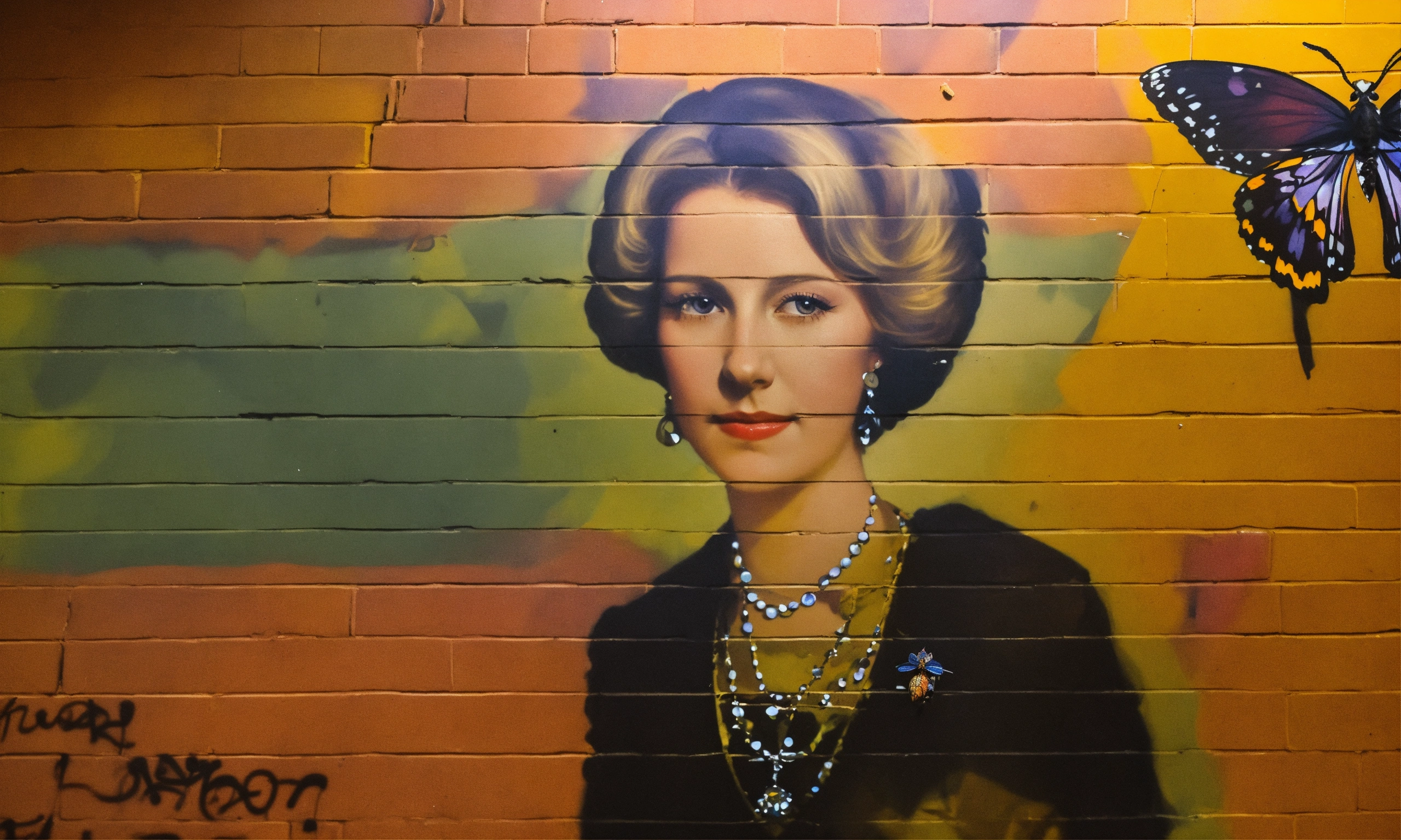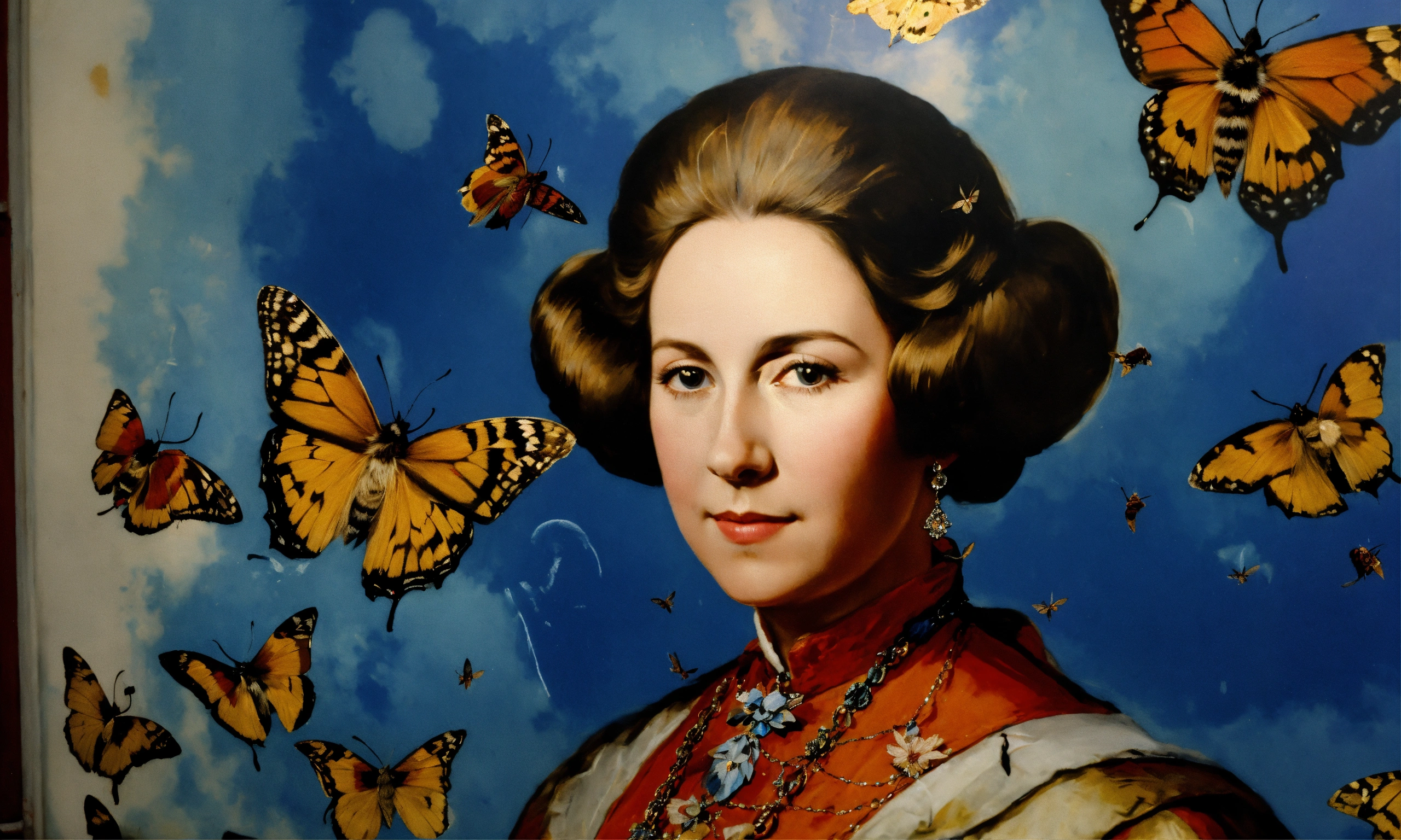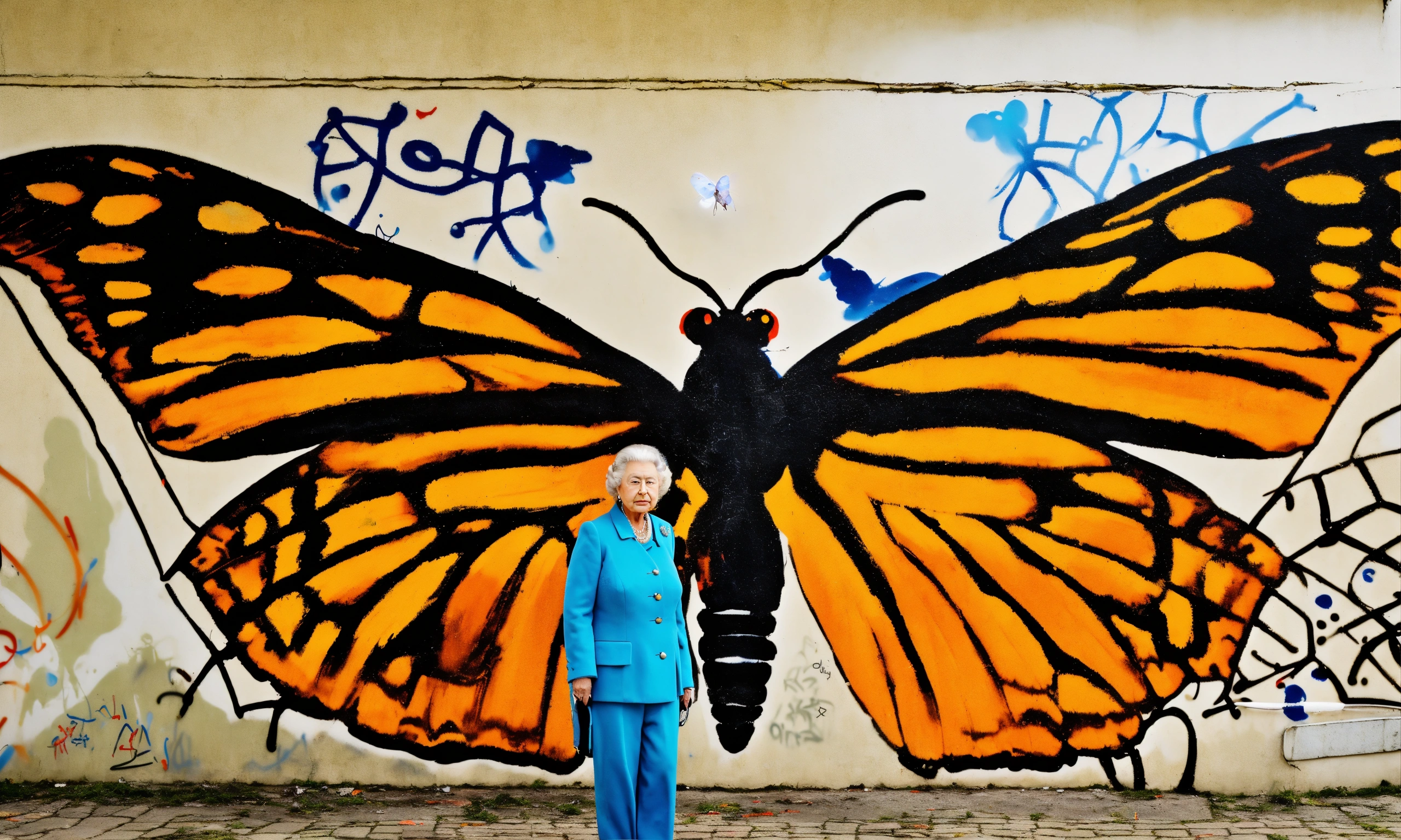 Queen sofia margaret victoria frederick of schleswig-holstein-sonderburg-glücksburg, with a moth hovering around him, in graffiti stencil