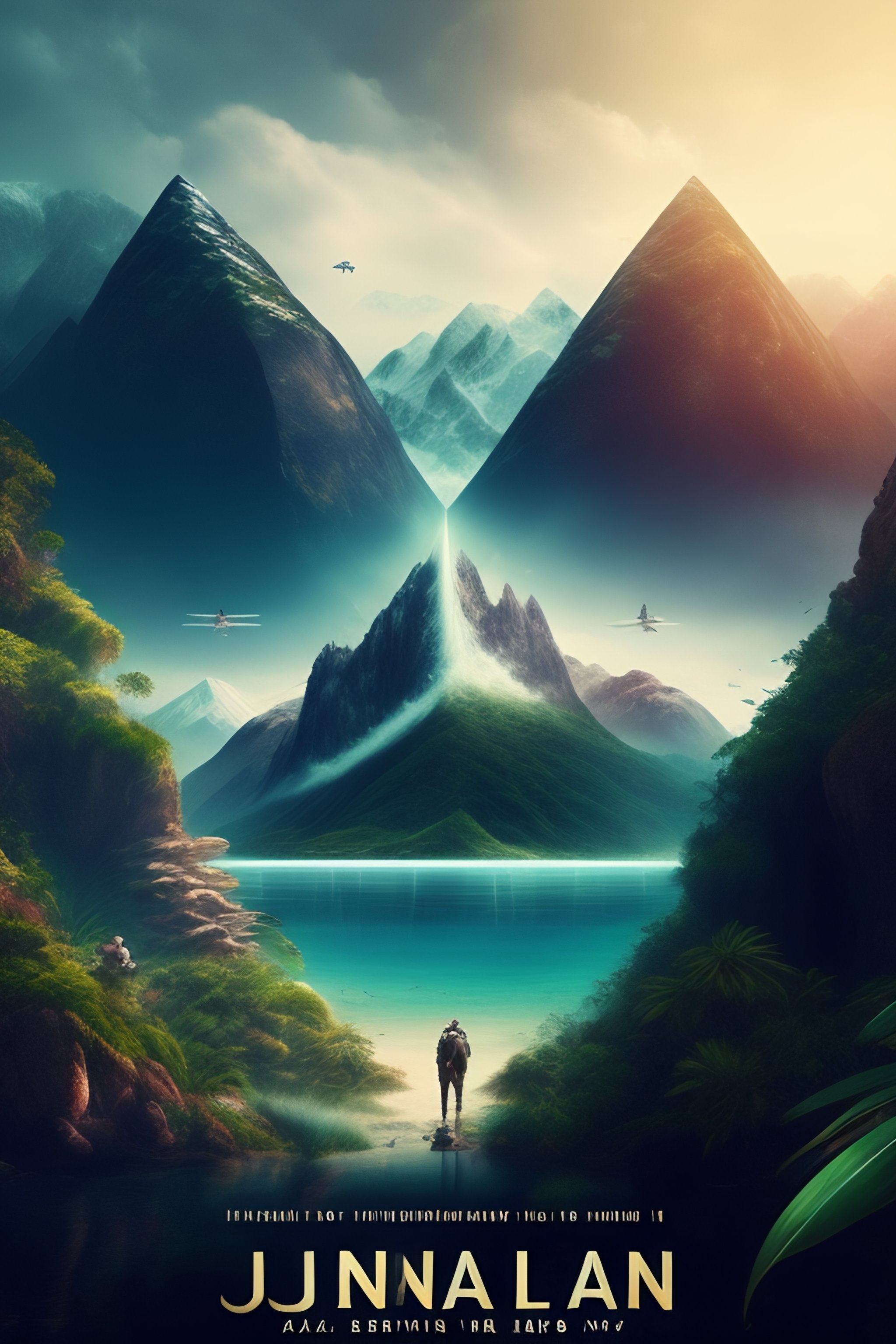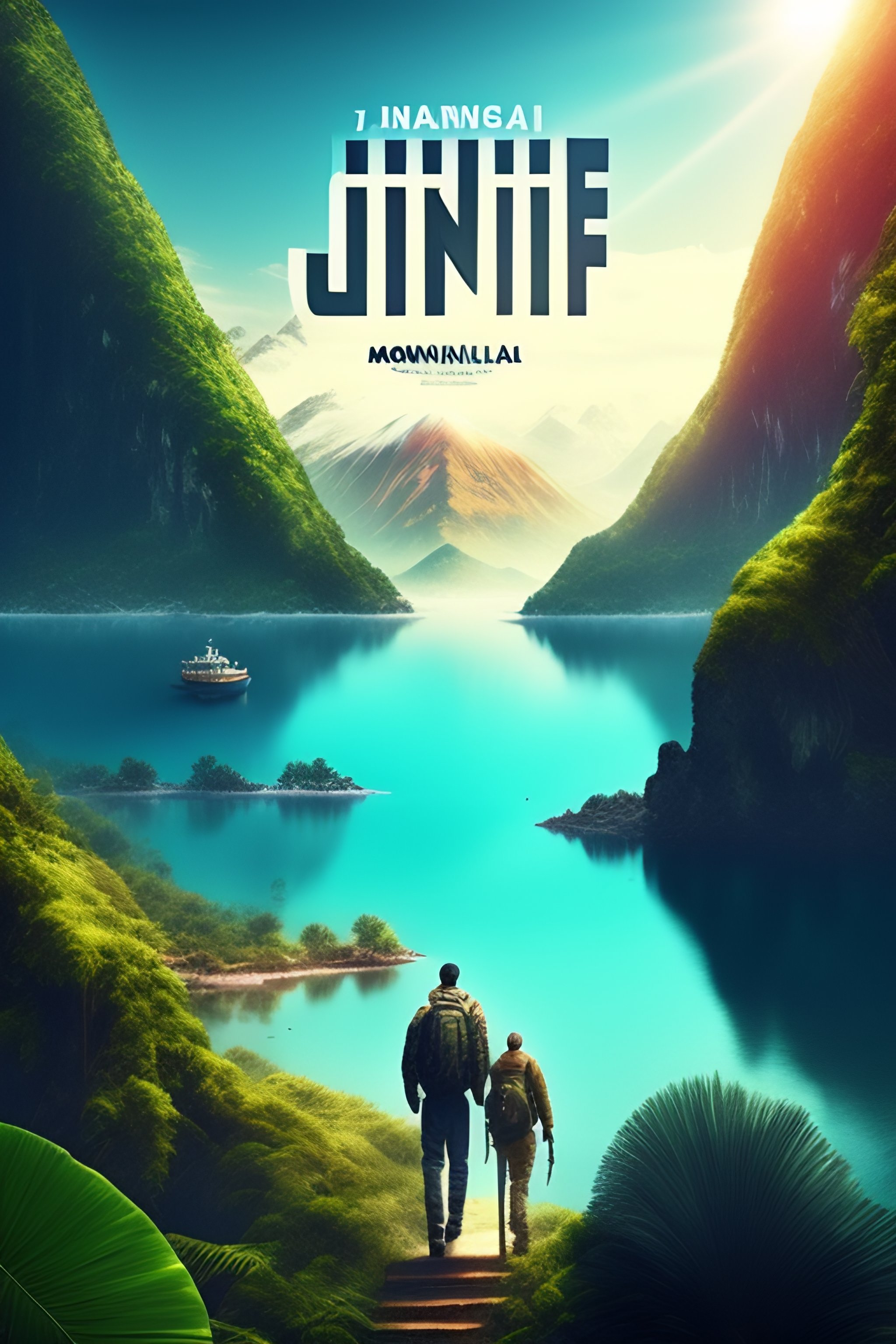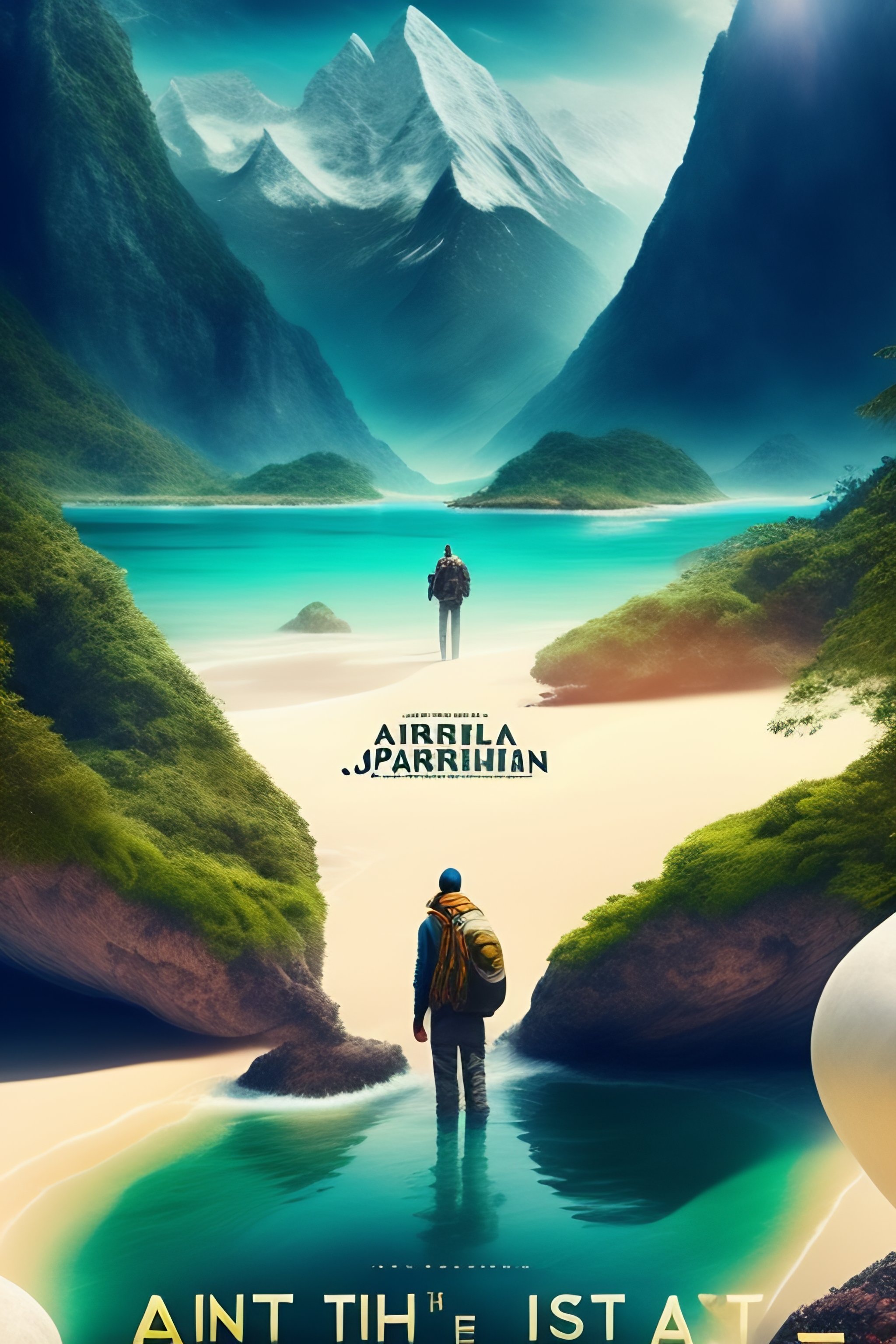 A movie poster with 7 random people that are surviving in their different landscape:( jungle, compaign, montain, antartic, paradise island .)