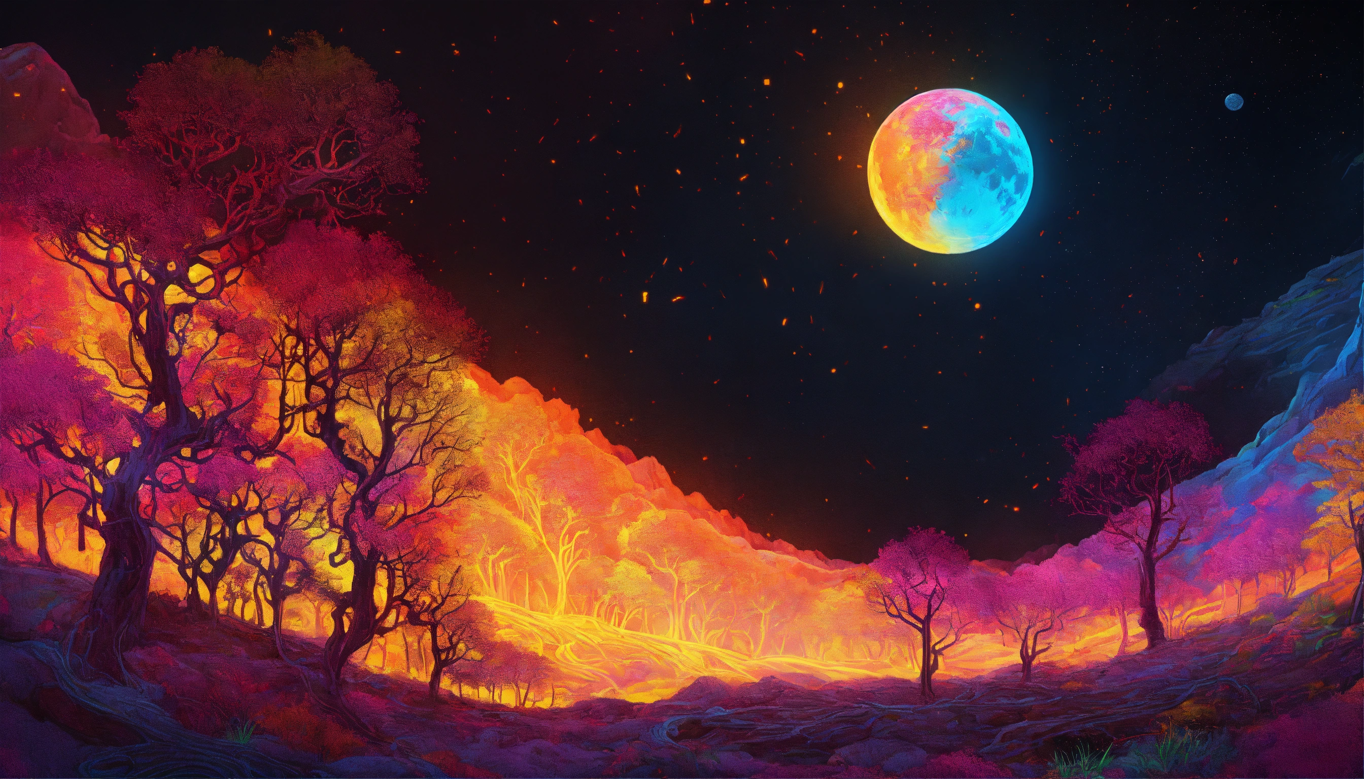 Neon glowing vines growing on the moon. tee-shirt design, line art, black background, ultra detailed artistic, colour splash art, fire and ice, splatter, black ink, liquid melting, dreamy, glowing, glamour, glimmer, shadows, oil on canvas, brush strokes, smooth, ultra high definition, 8k, unreal engine 5, ultra sharp focus, intricate artwork masterpiece, ominous, golden ratio, highly detailed, vibrant, ultra high quality