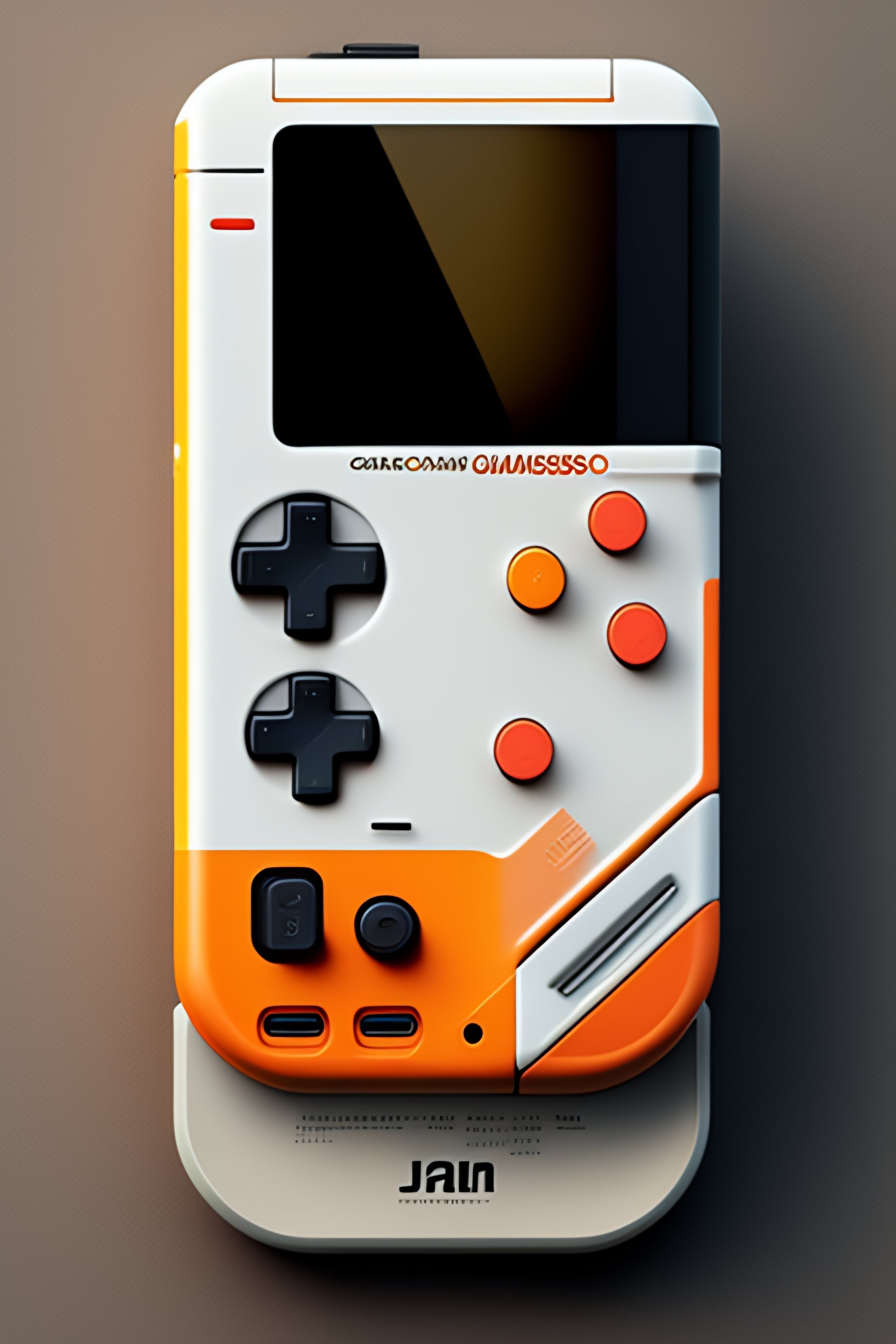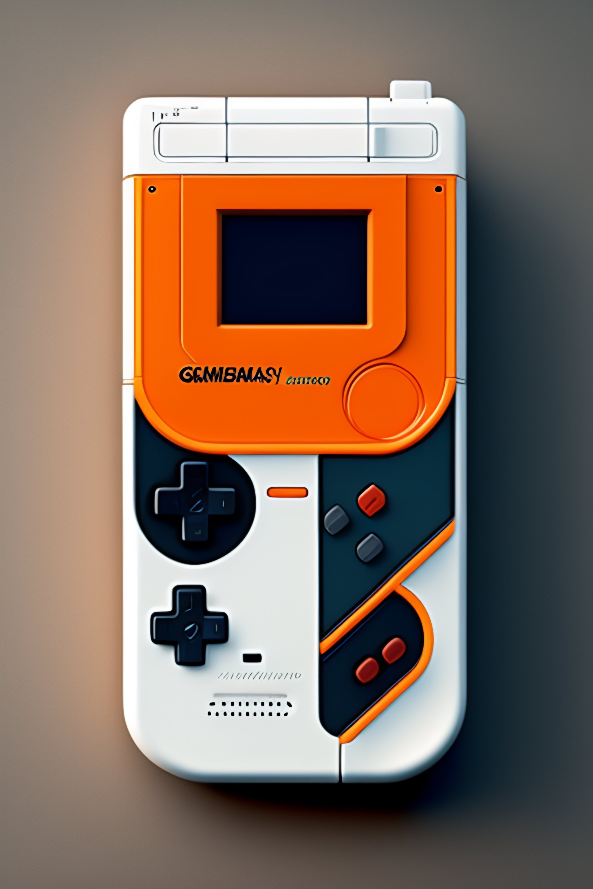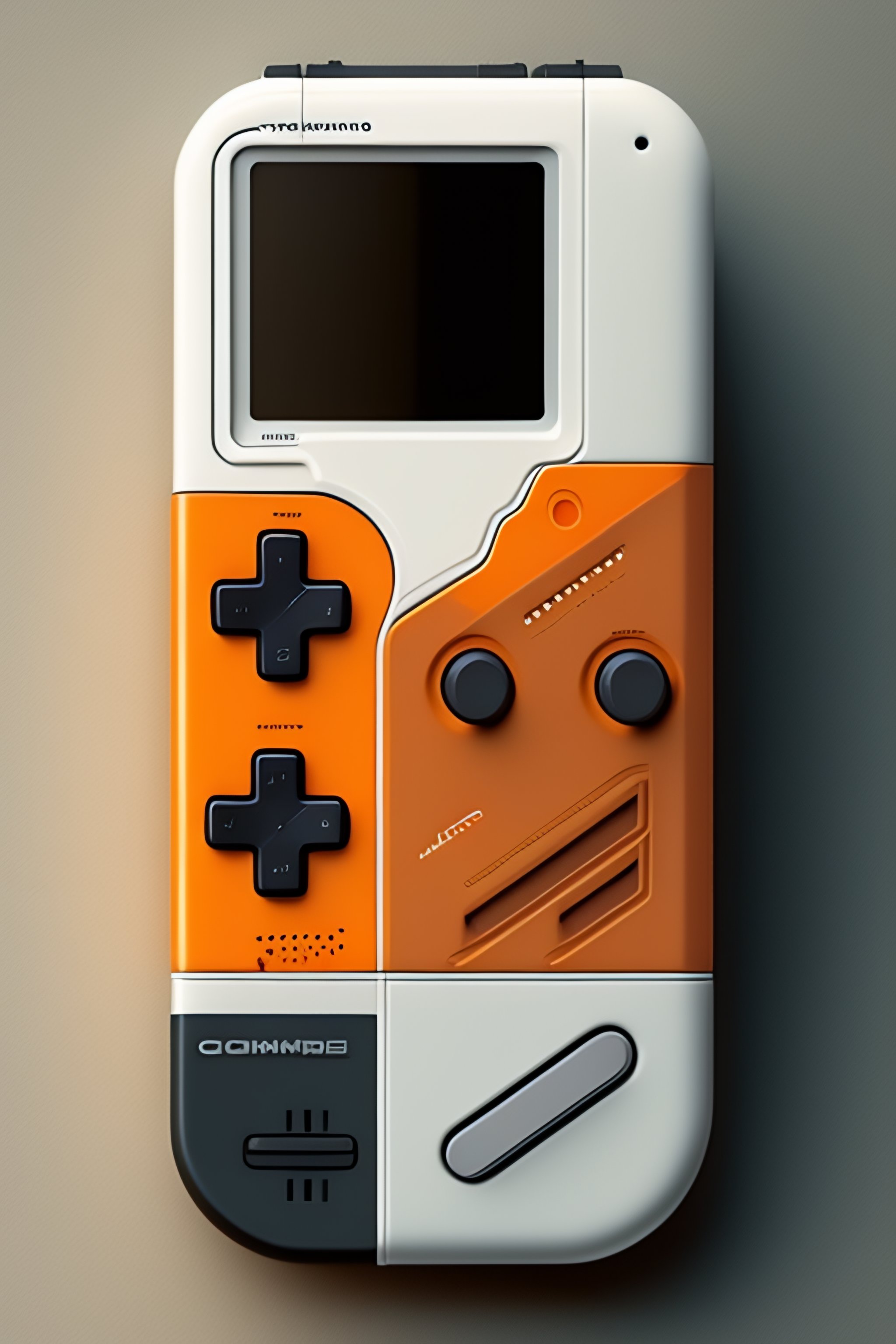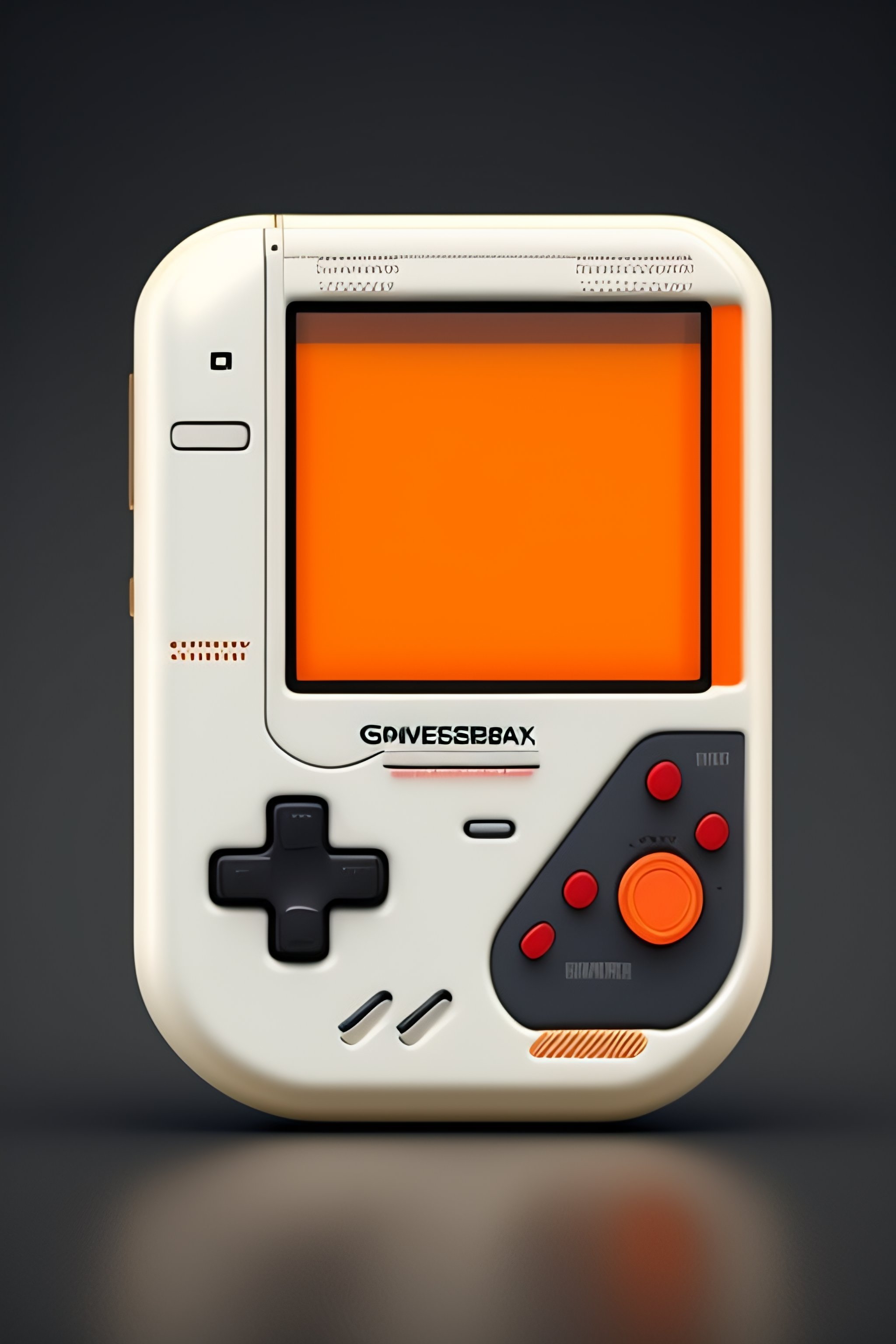 Gameboy console render designed by dieter rams, in white color, orange is the accent color, very simple just few buttons, super mario on screen