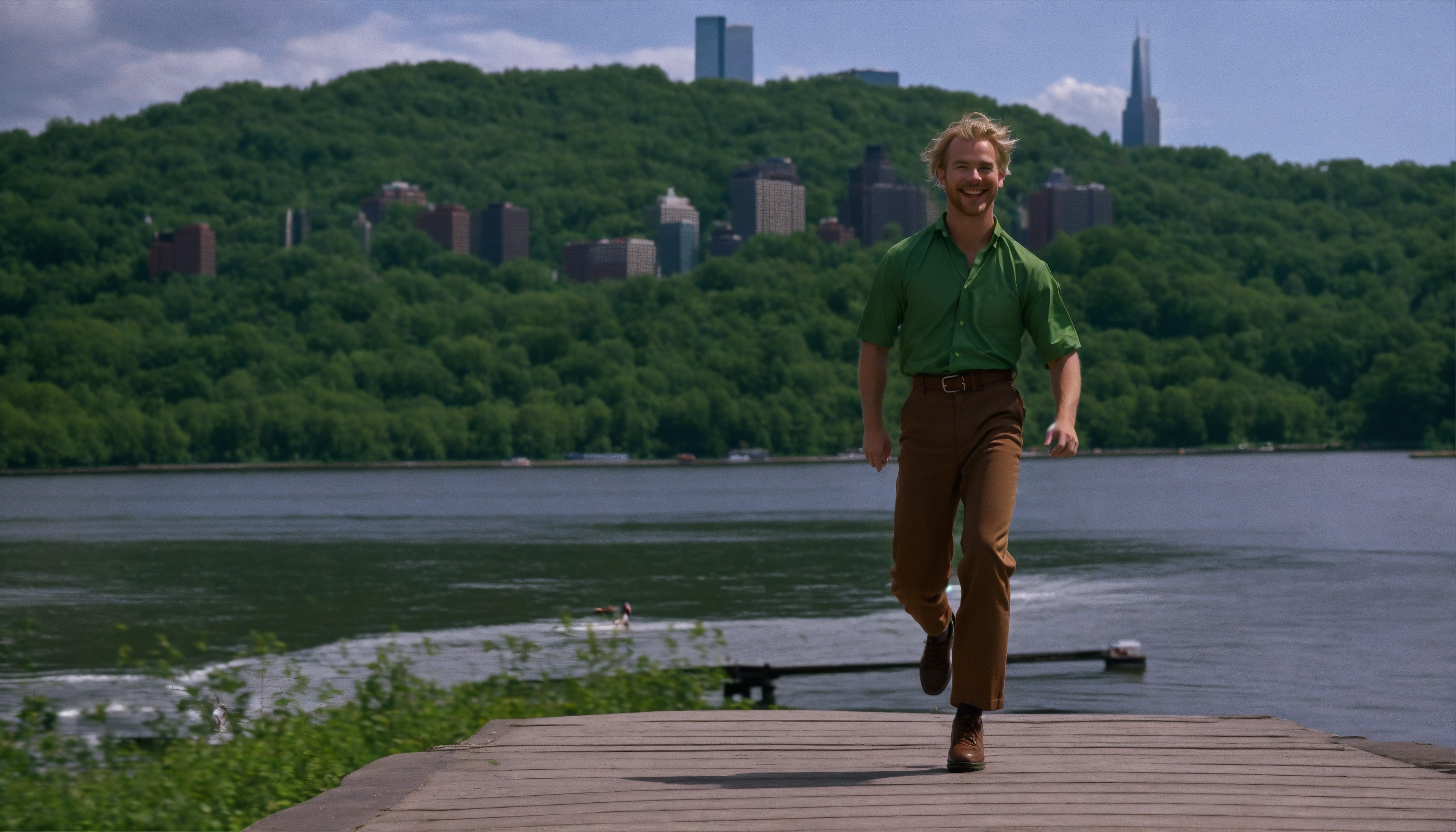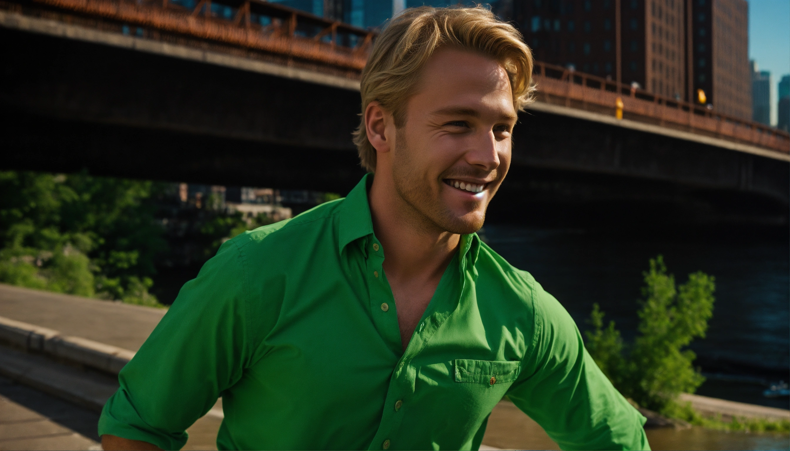 A norwegian, wearing a green shirt and brown trousers. he has blond hair and is 30 years old. he smiles and jumps on the bank of the hudson river, in the horizon the skyscrapers. 1950