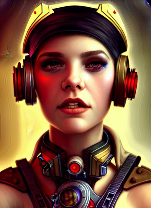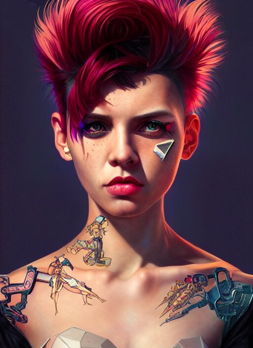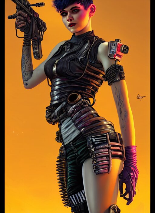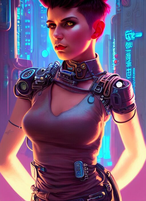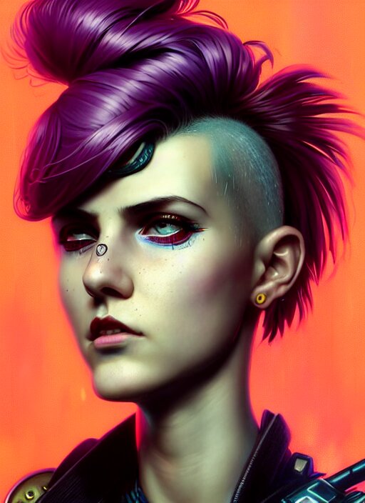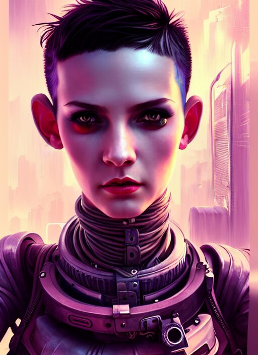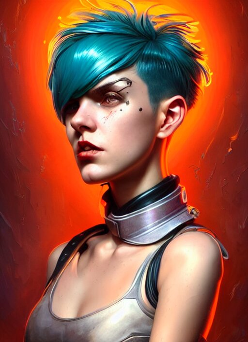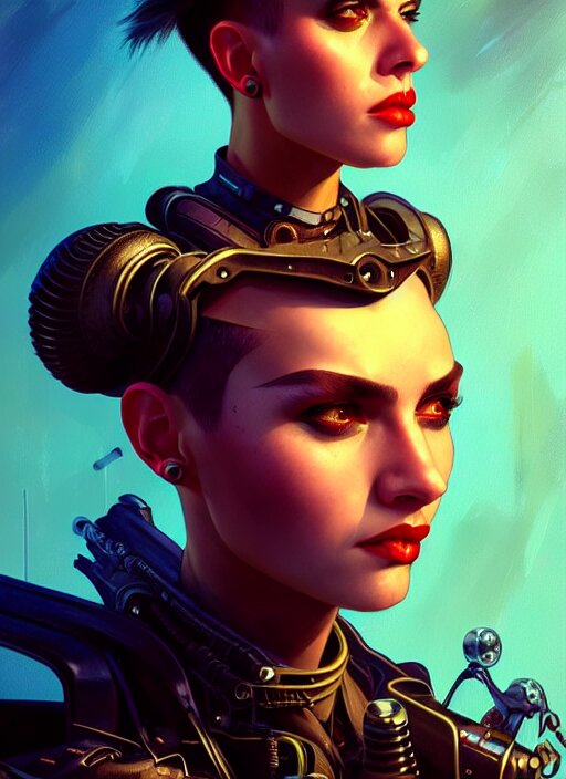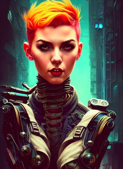 Character portrait of young woman as a heroic retrofuturistic punk, pixie cut with shaved side hair, bad attitude, dystopian cyberpunk steampunk soviet mood, intricate, wild, highly detailed, digital painting, artstation, upper body, concept art, smooth, sharp focus, illustration, art by artgerm and greg rutkowski and alphonse mucha, vibrant deep colors