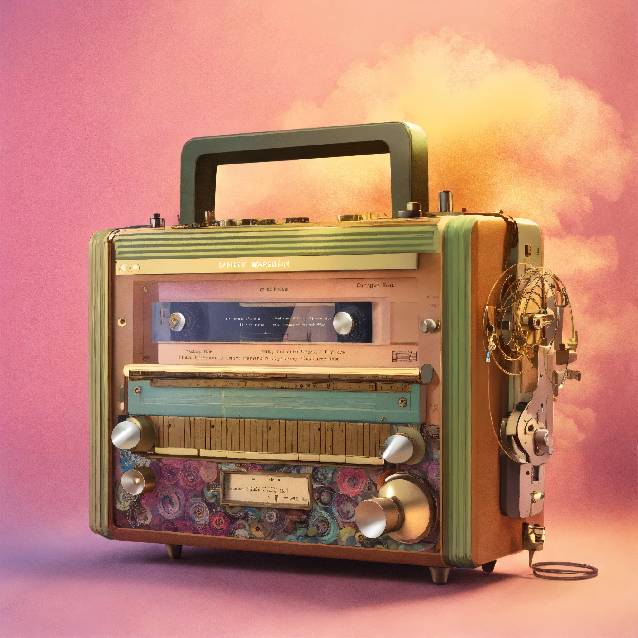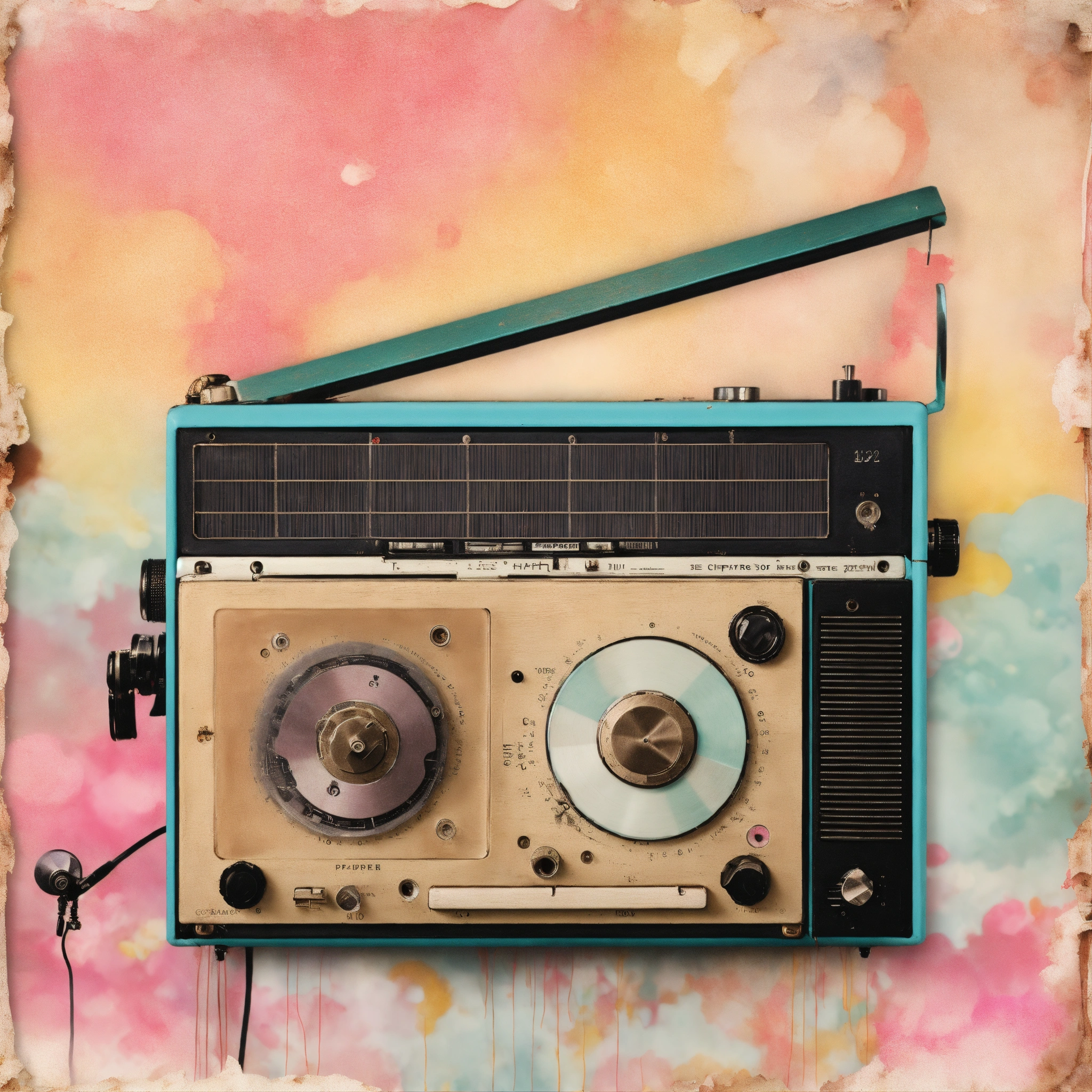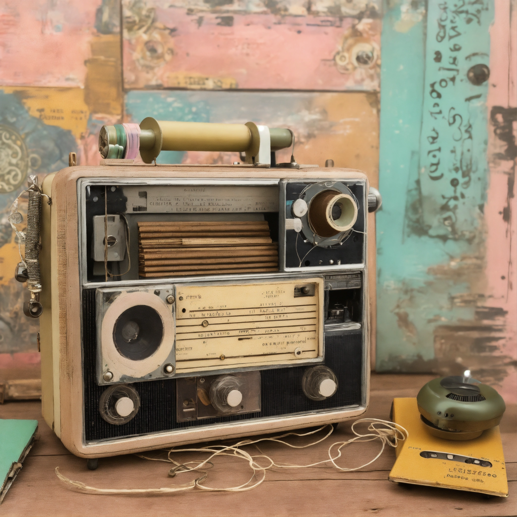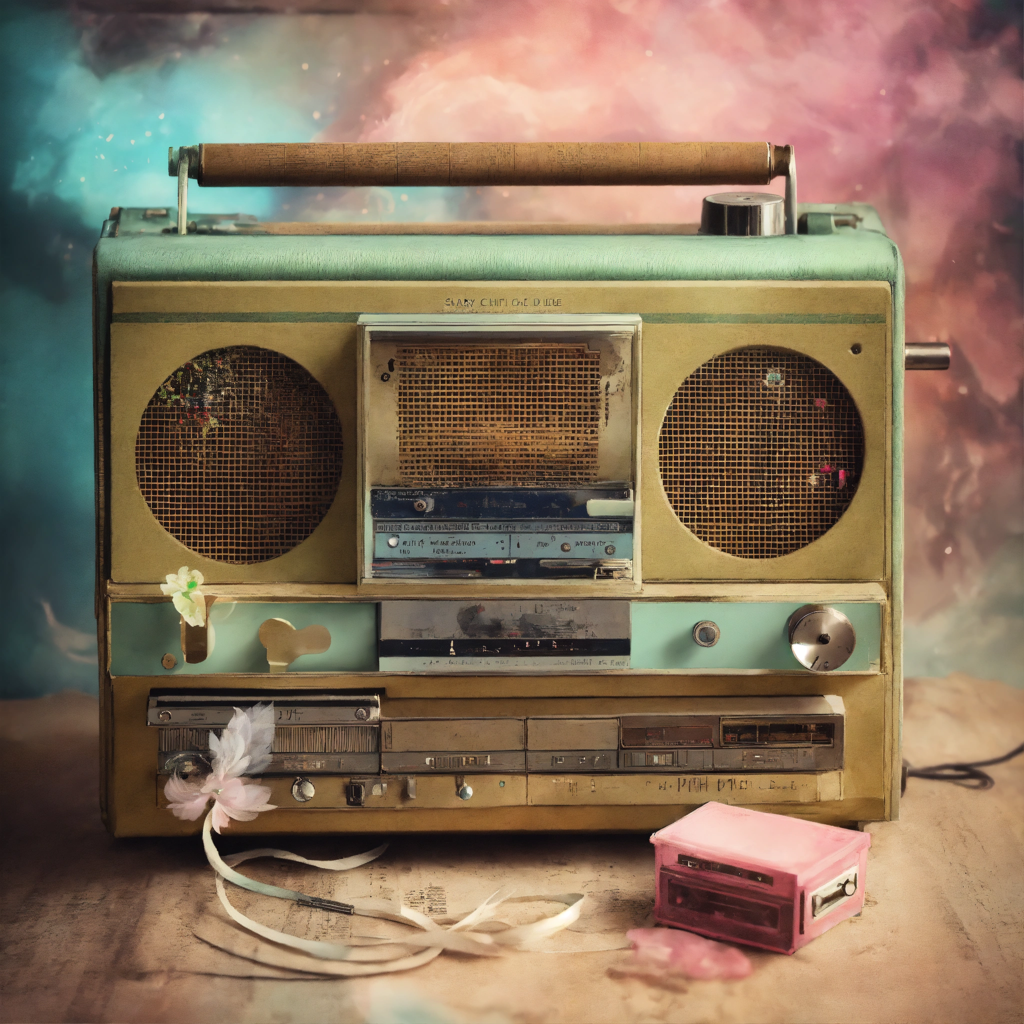 Shabby chic dreamy mist pastel junk journals vintage retro old age taperecorder player and cassette tape swirling magical fairytale abstract art style