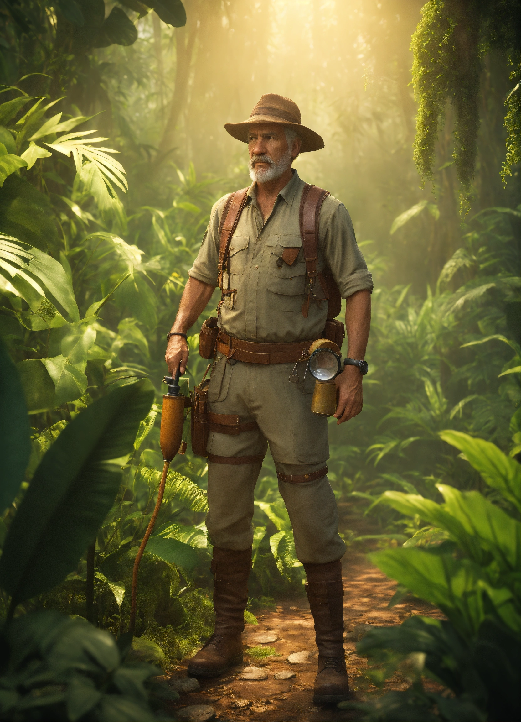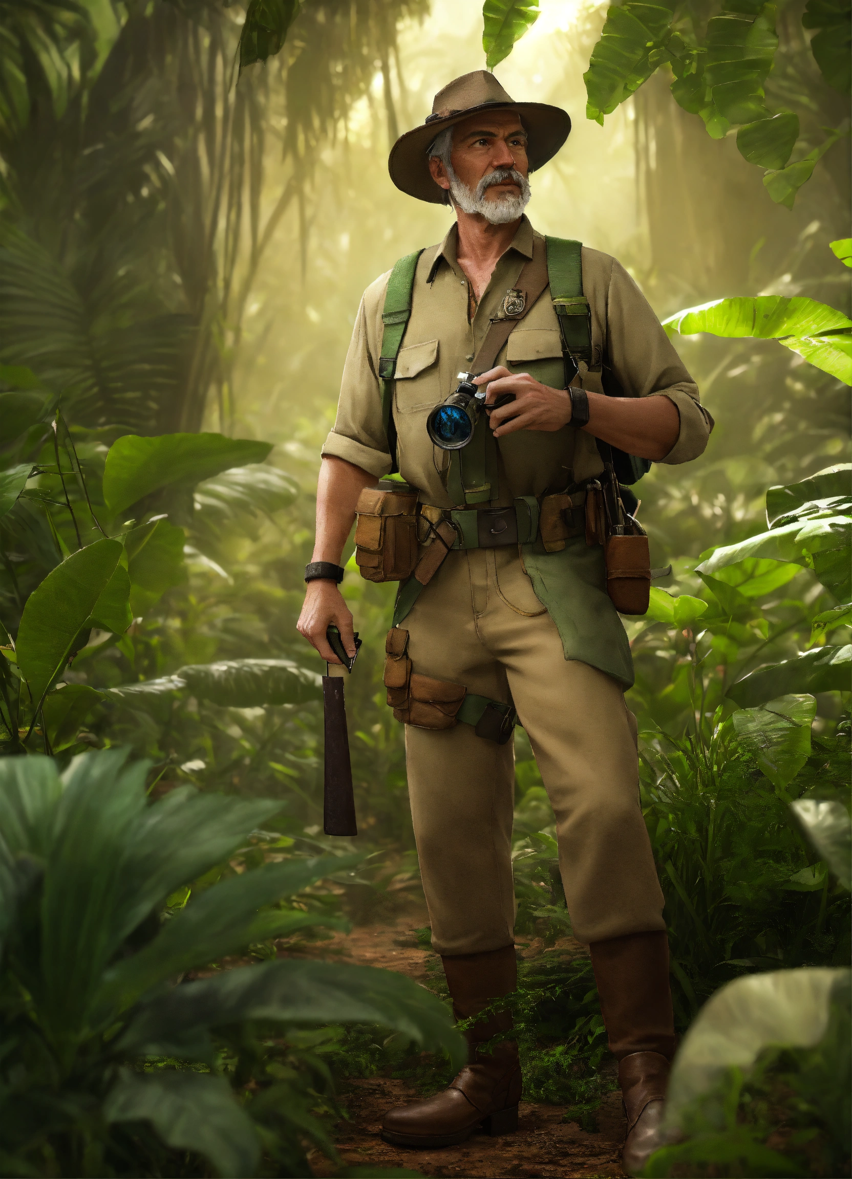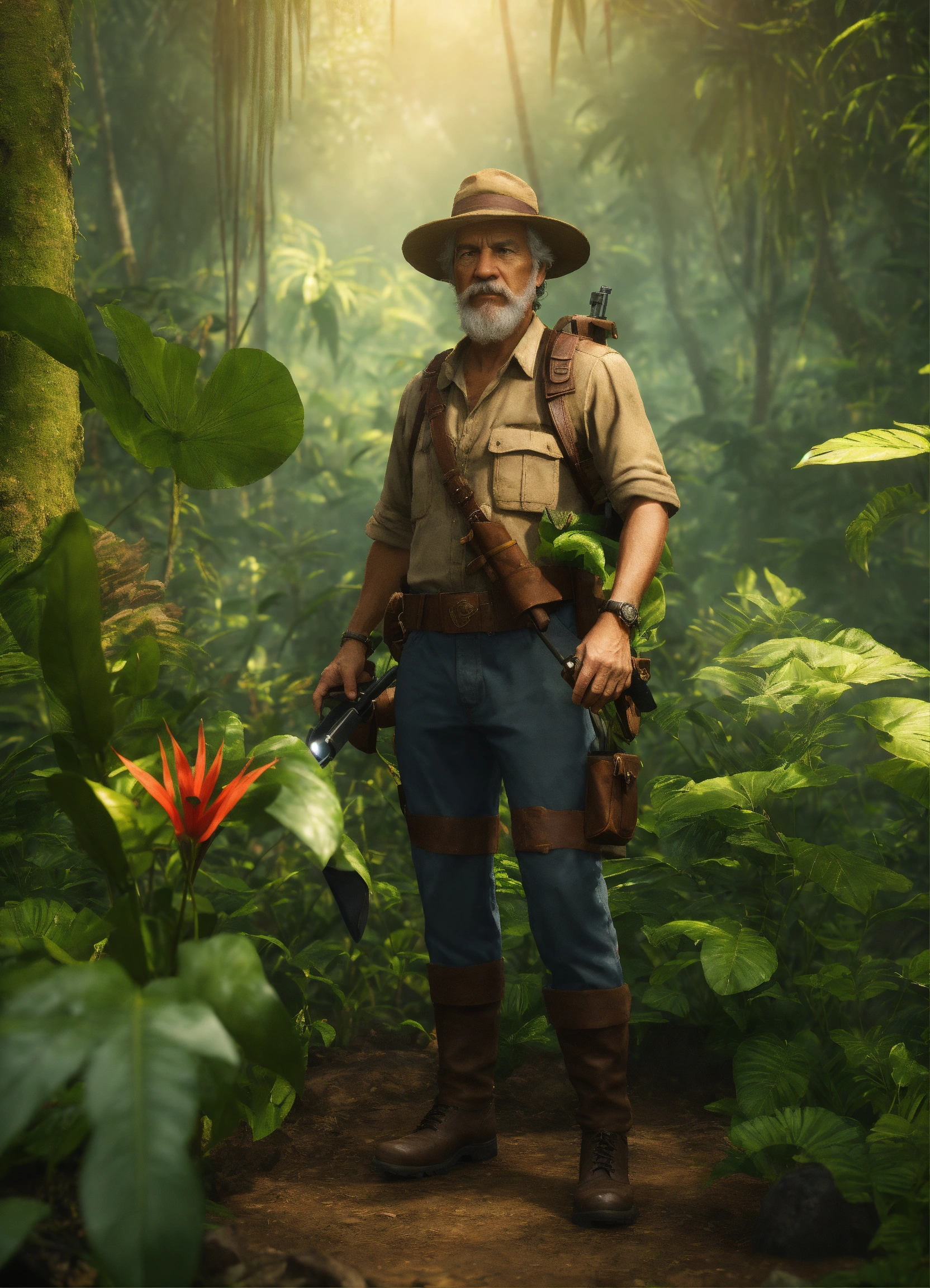 Establishing shot of a front view of a 60 year old botanist, surrounded by luxuriant vegetation in a humid jungle.detailed tenue and objets, with in expedition clothing, with a jumanji video game look, with a tropical flower in to one hand, with a magnifying glass in the other hand, with a machete in its holster attached to his belt. detailed image with vintage 3d adventure video game animation style, with natural lighting at dawn, high humidity atmosphere. detailed posture of the character, he is standing, he is holding his plant and his magnifying glass in this hands