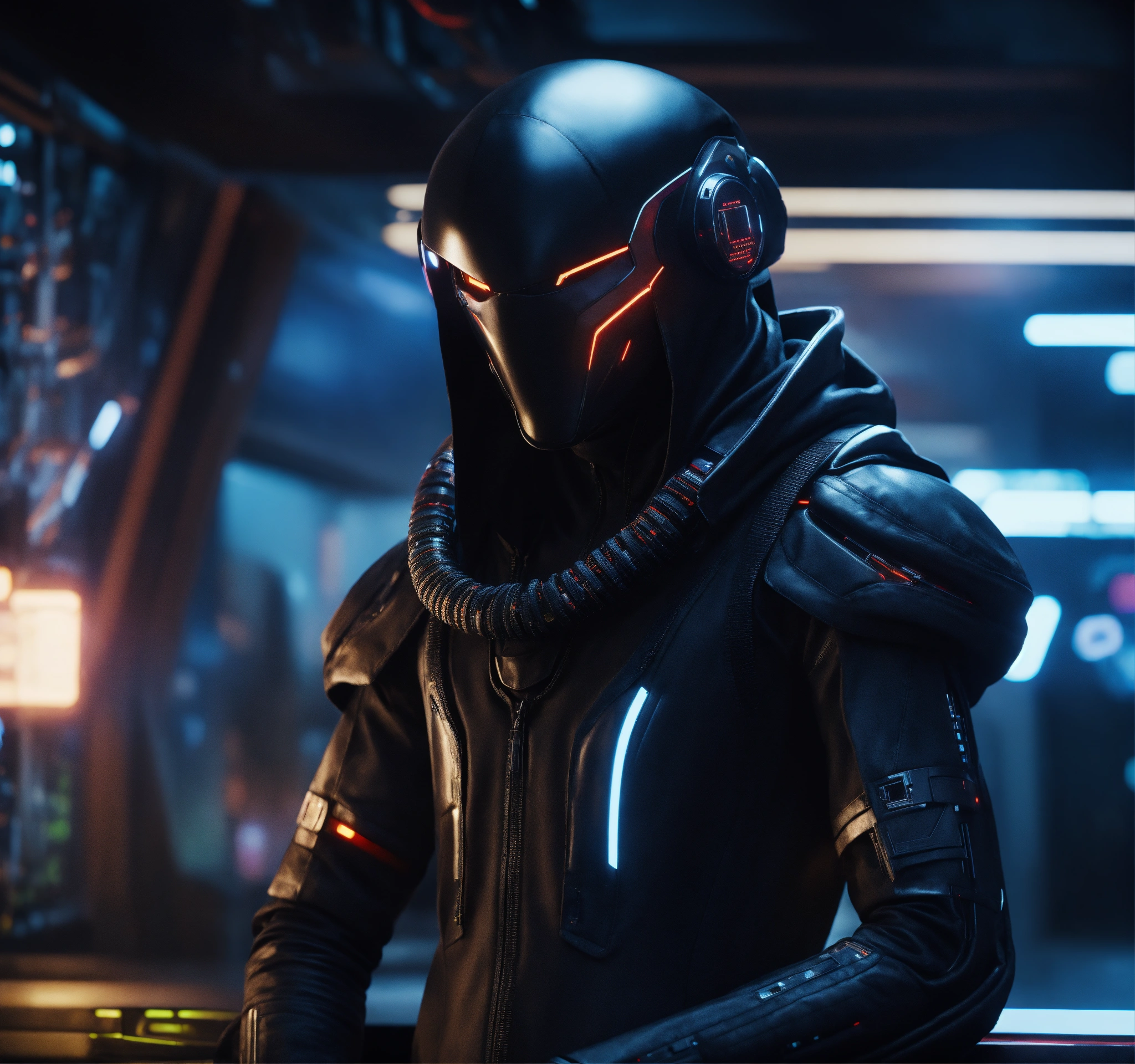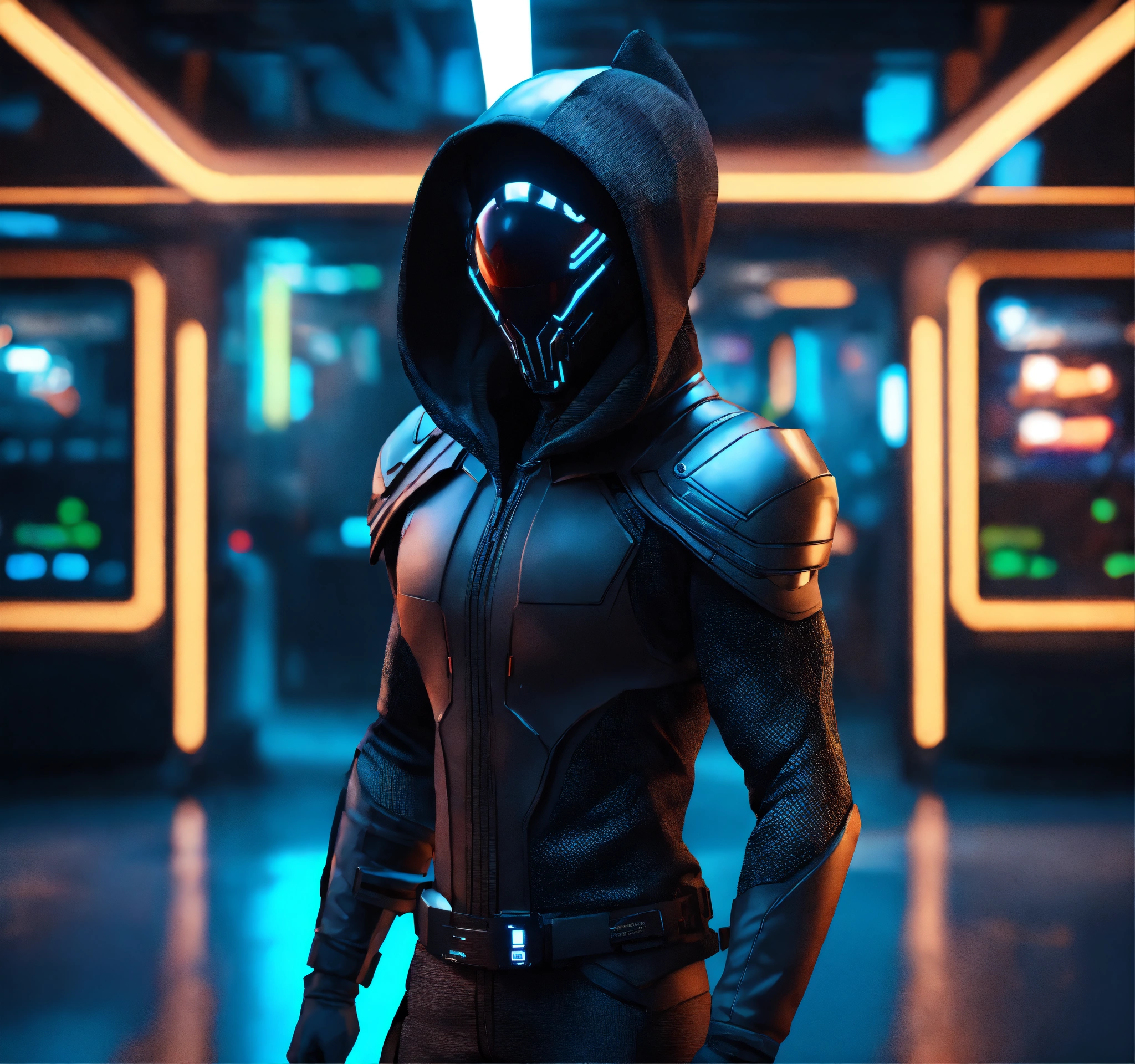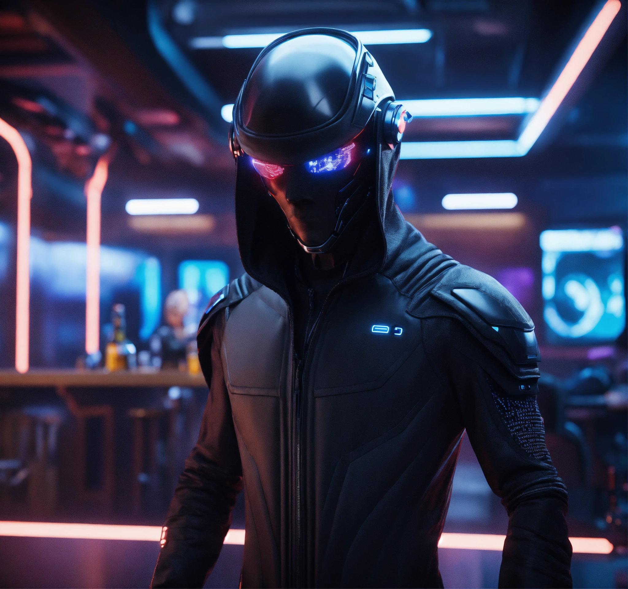 Male alien mutant half cyborg hacker wearing futuristic black clothing, hi-tech visor and hooded cape, in a dark futuristic space port bar, 8k, realistic. unreal engine, pixar