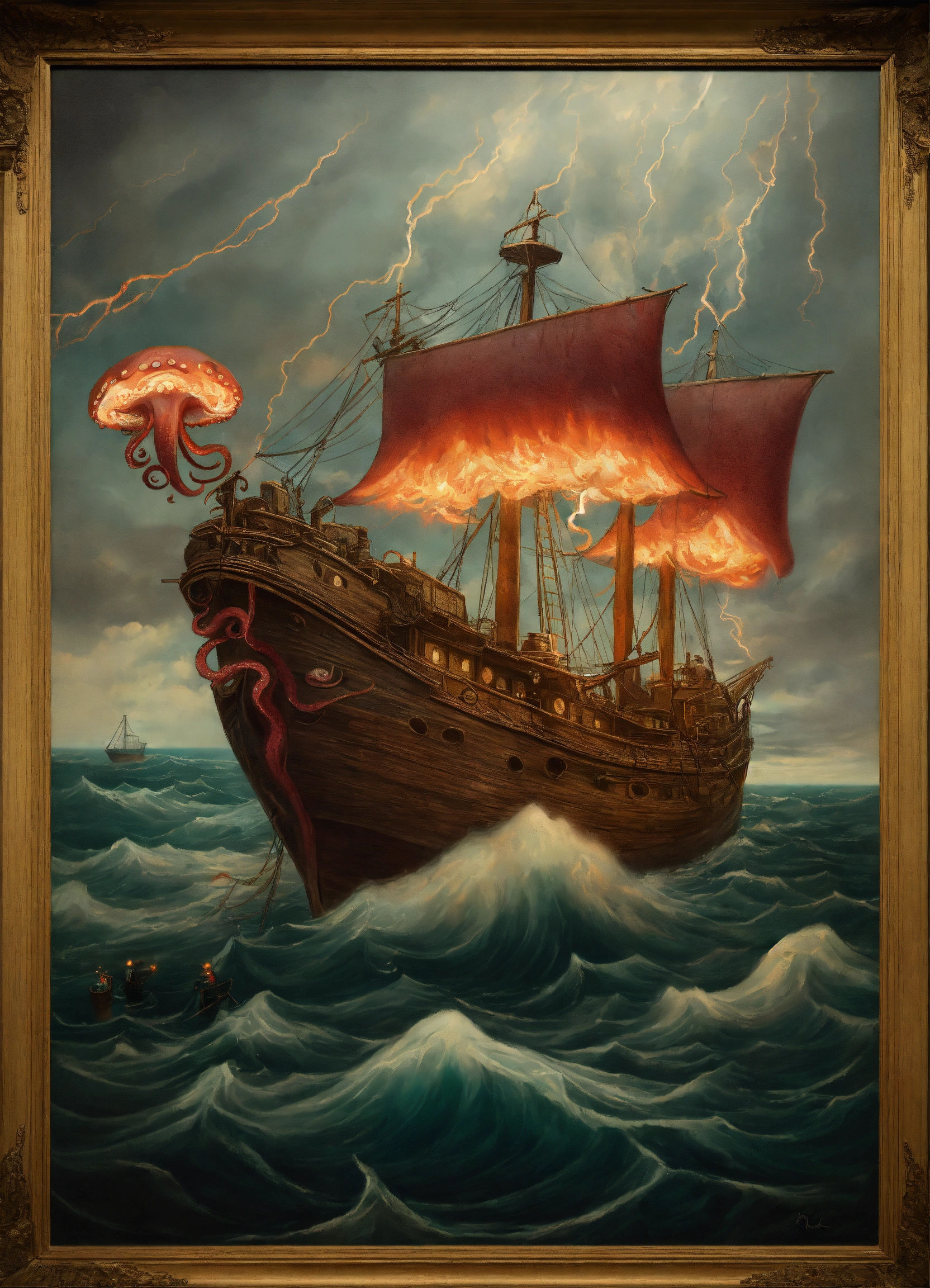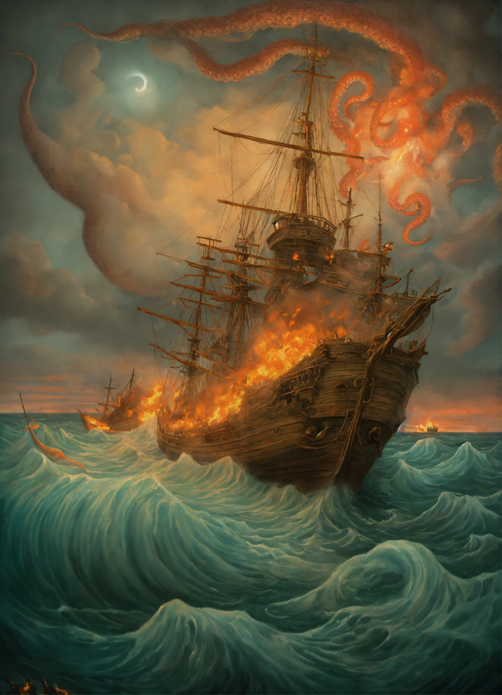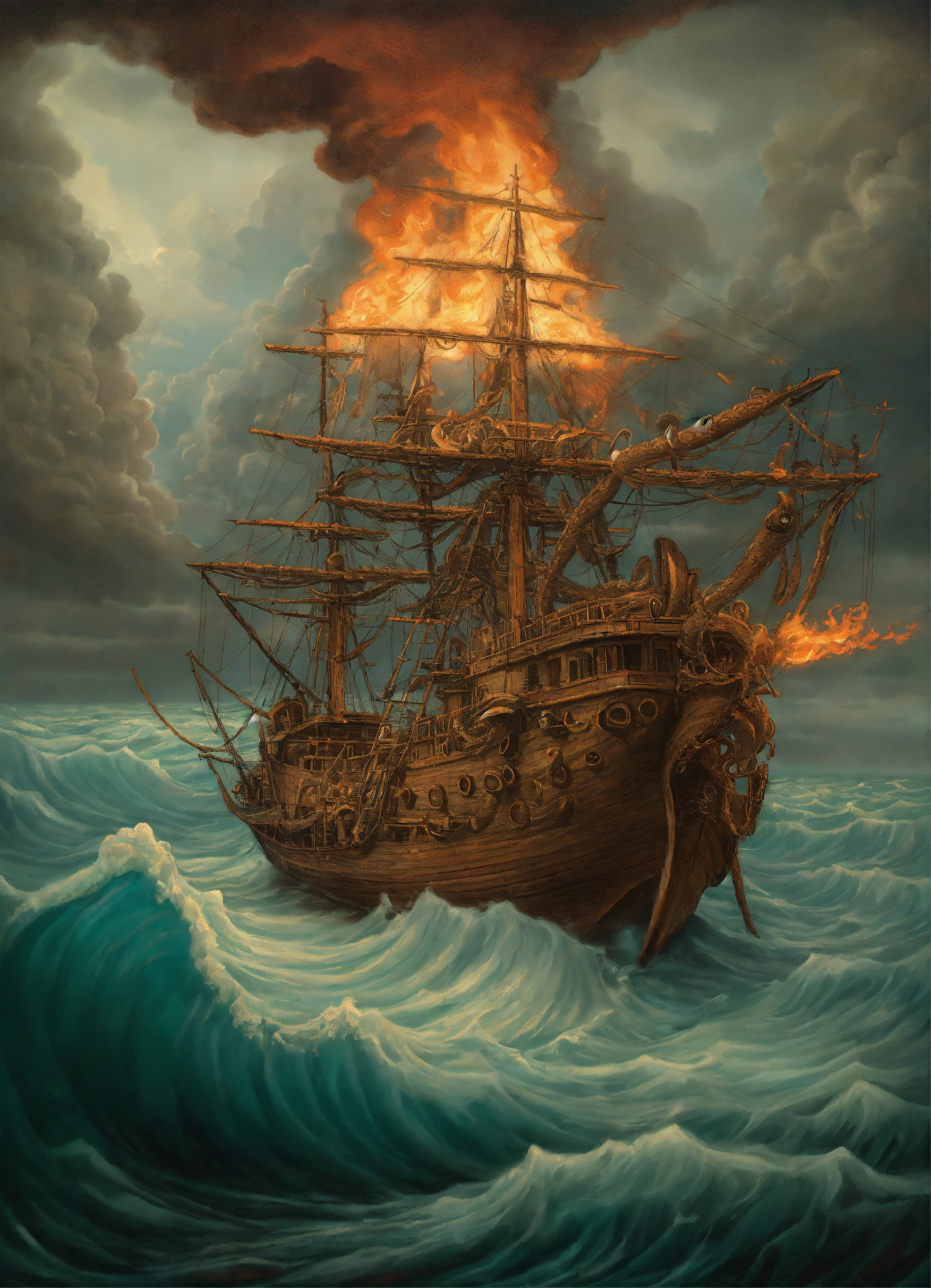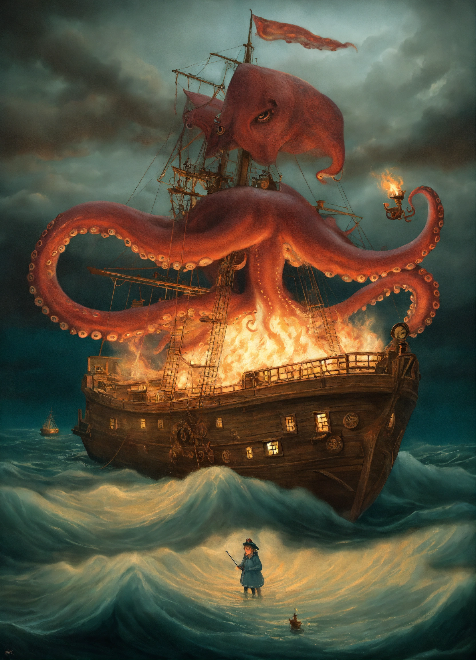 Giant creep octopus in a stormy and iced sea with tentacles wrapping a old wooden ship in flames and lightning in the sky by mark ryden
