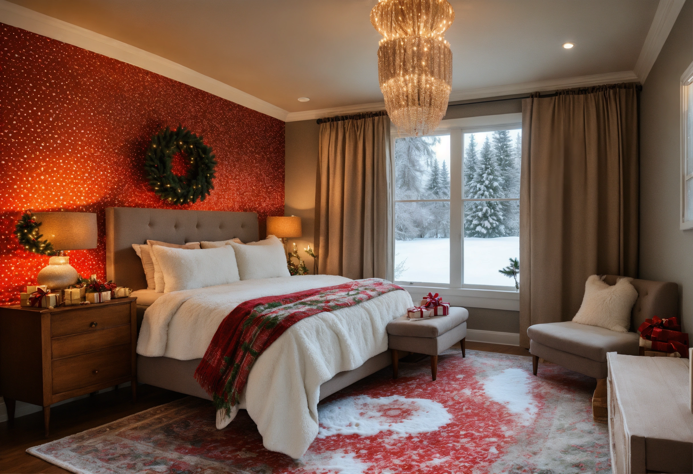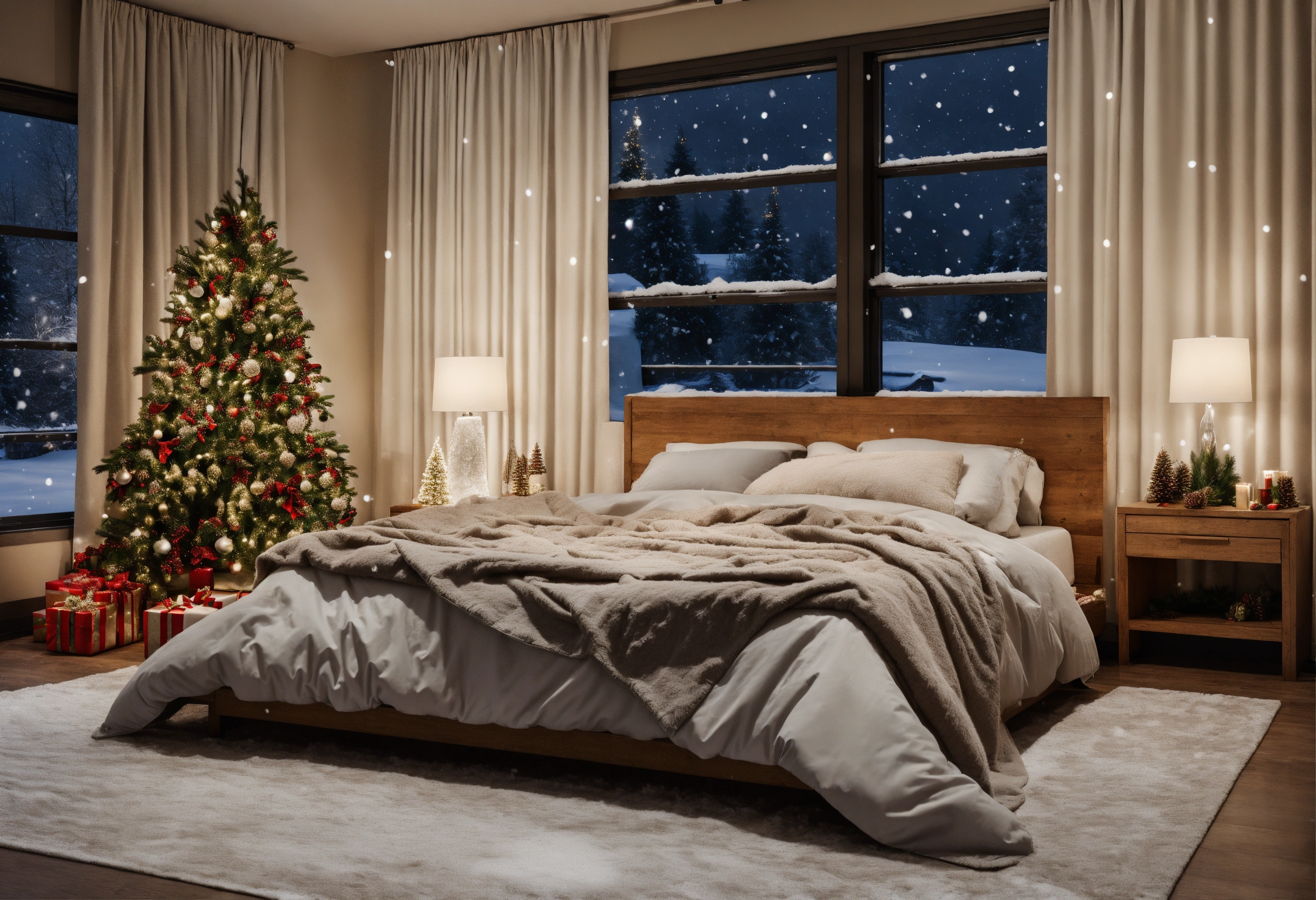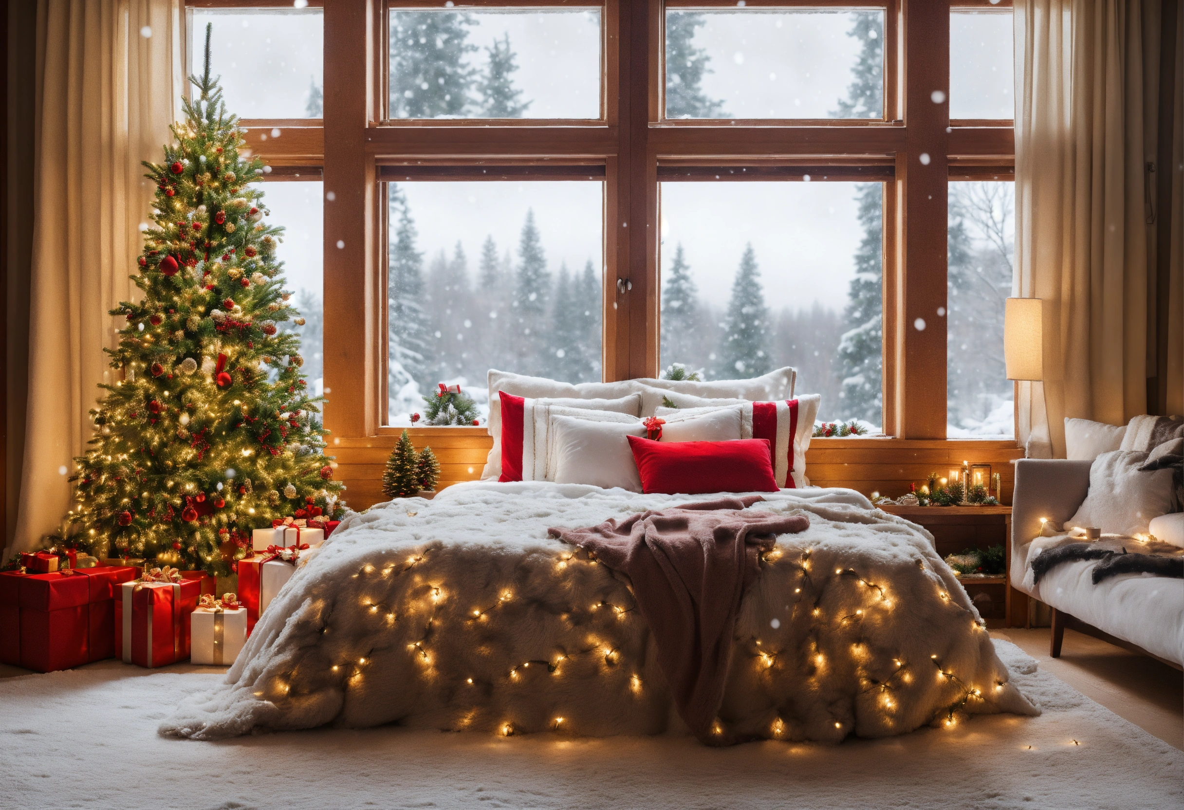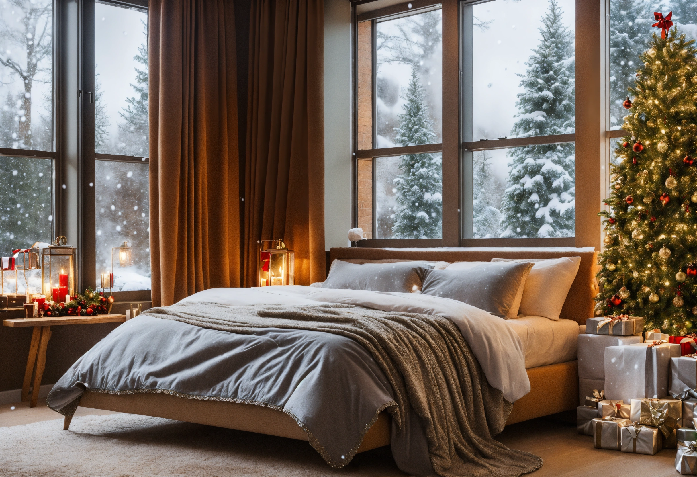 Beautiful christmas bedroom facing facing forward, bed facing forward, christmas bedspread, window in the back with snow falling outside, full image