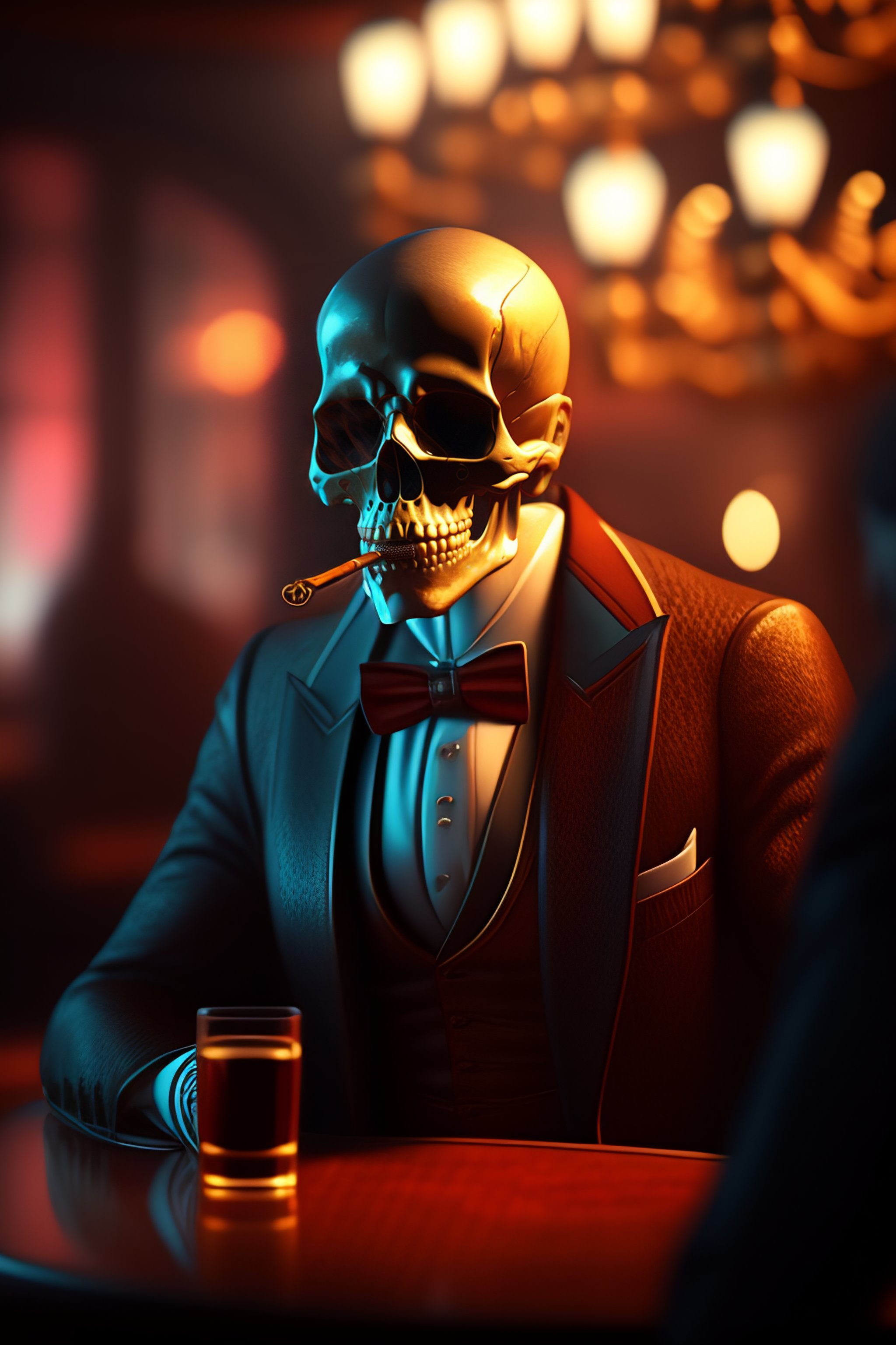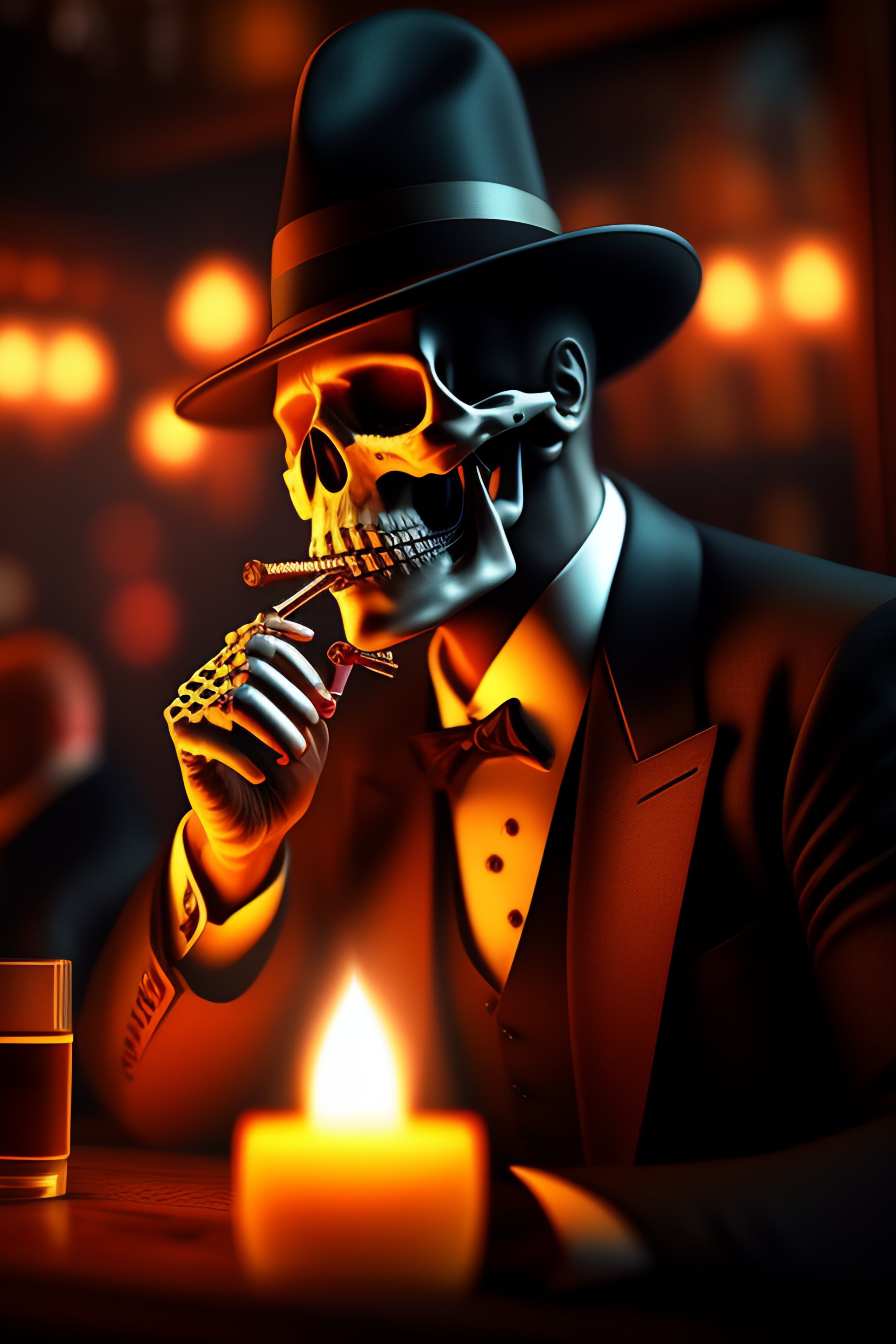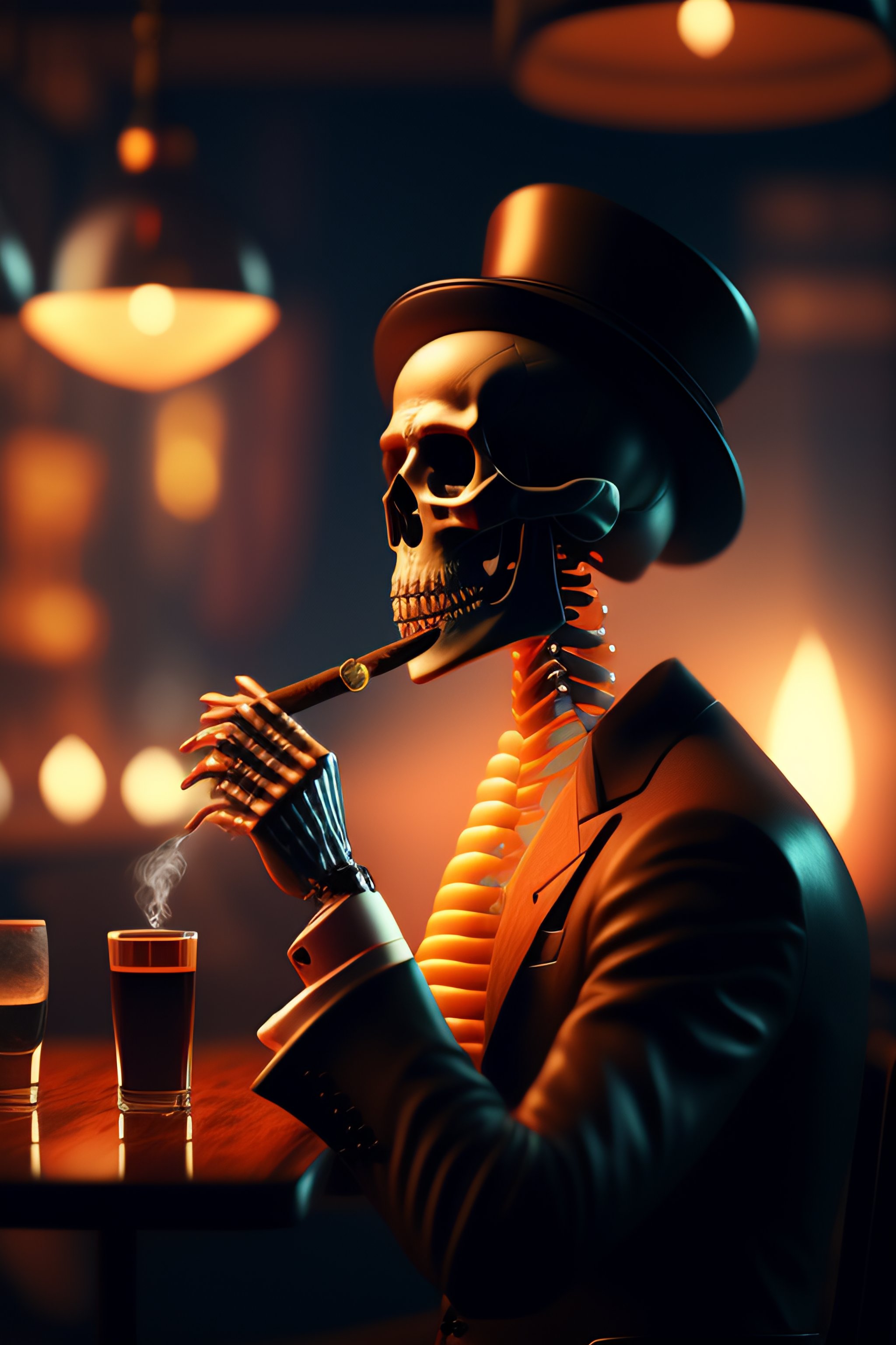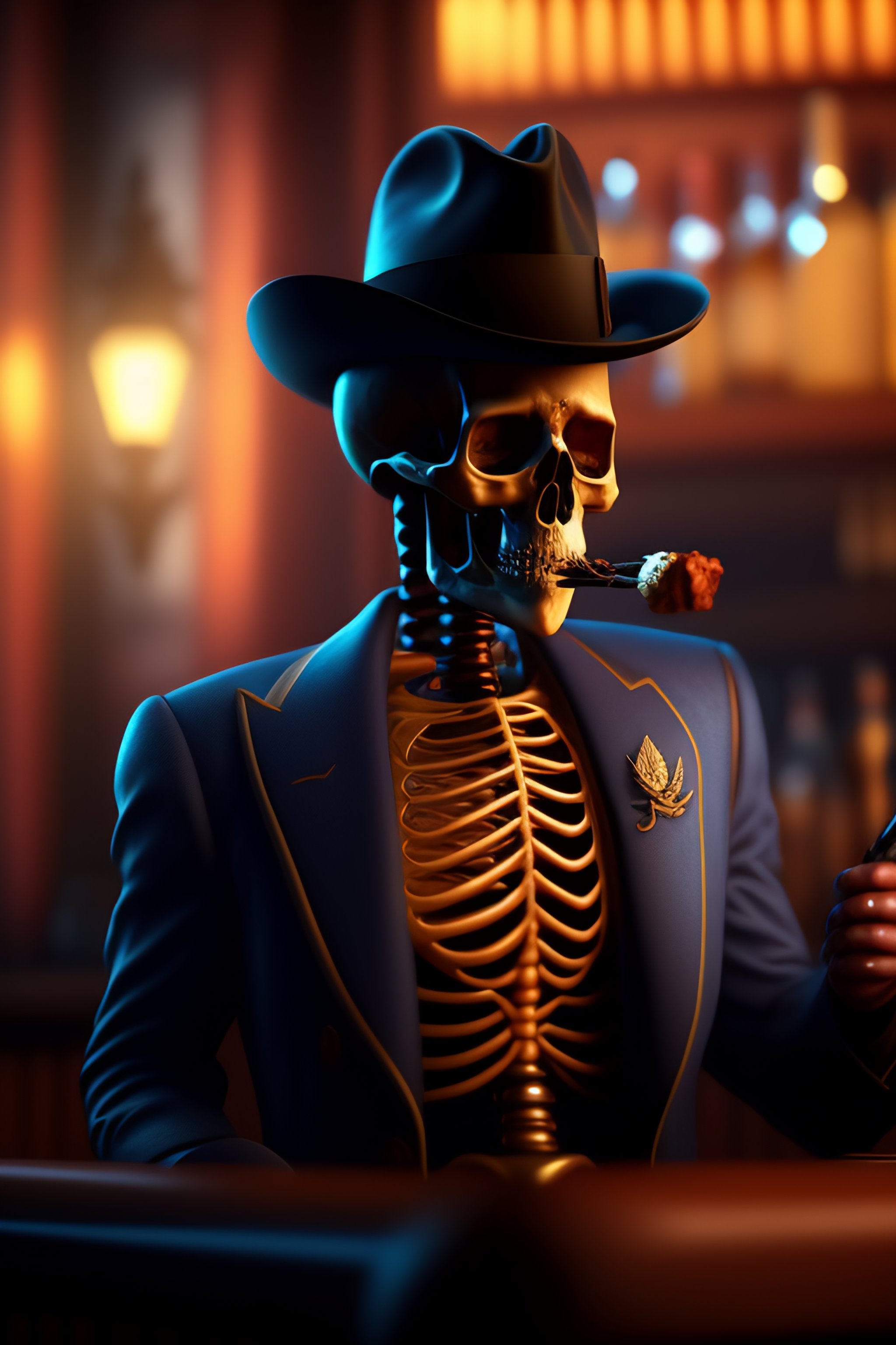 Gentleman skeleton smoking a cigar in a bar, cinematic lighting, dimly lit, hyper-detailed, hd, 4k, volumetric lighting