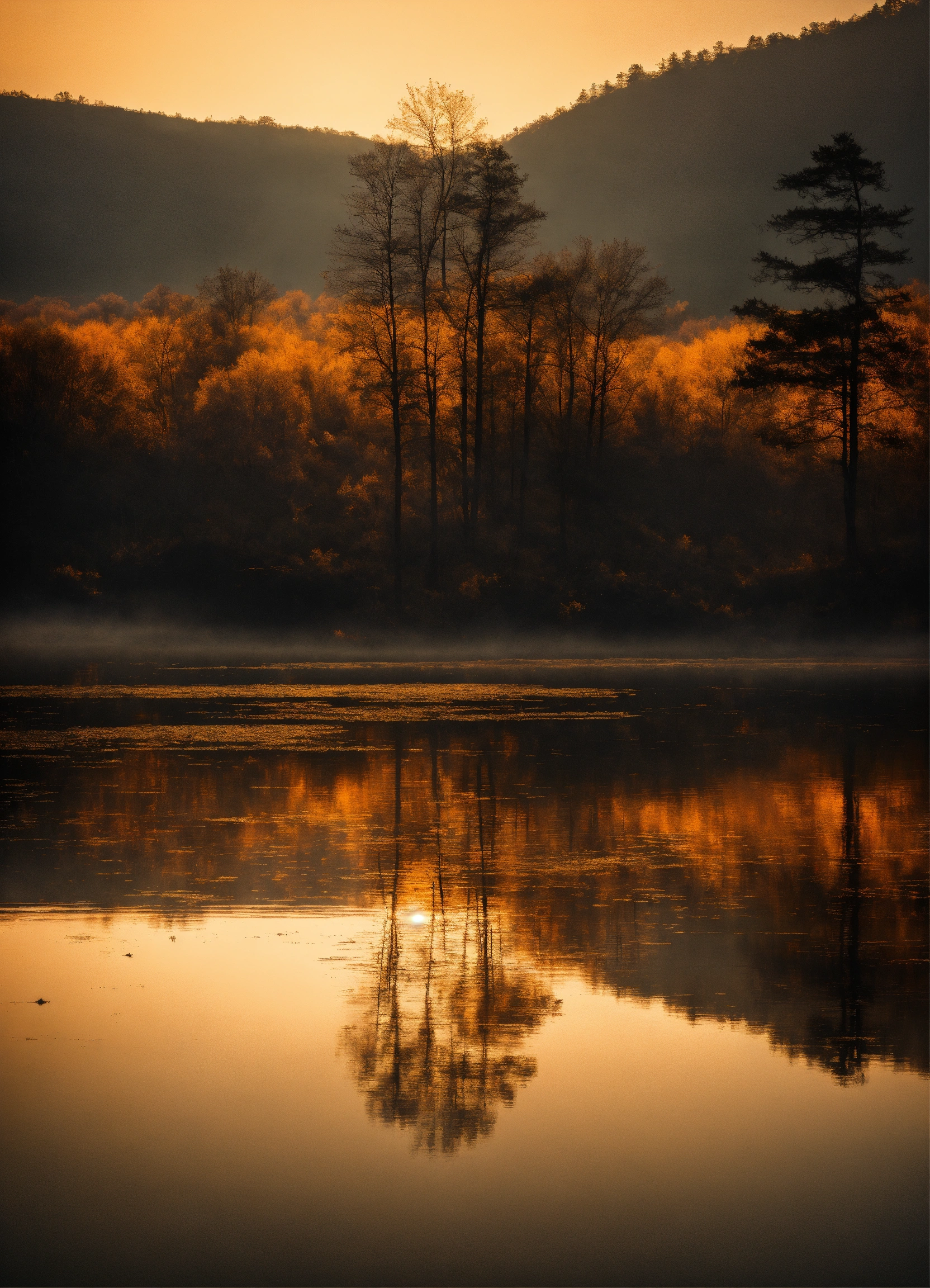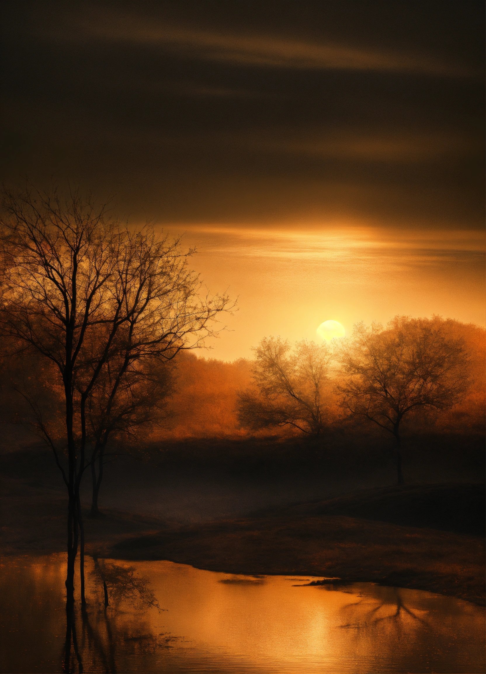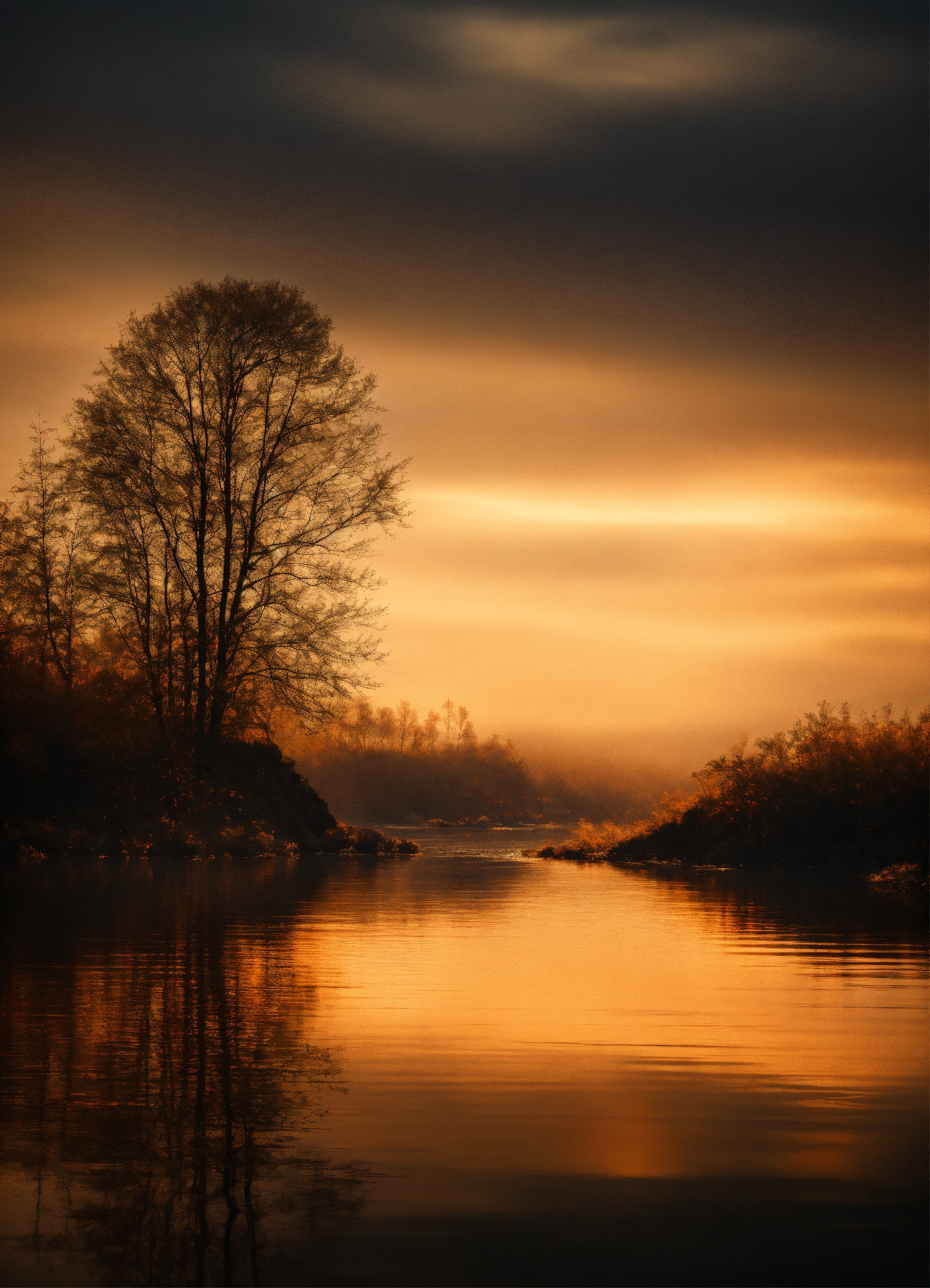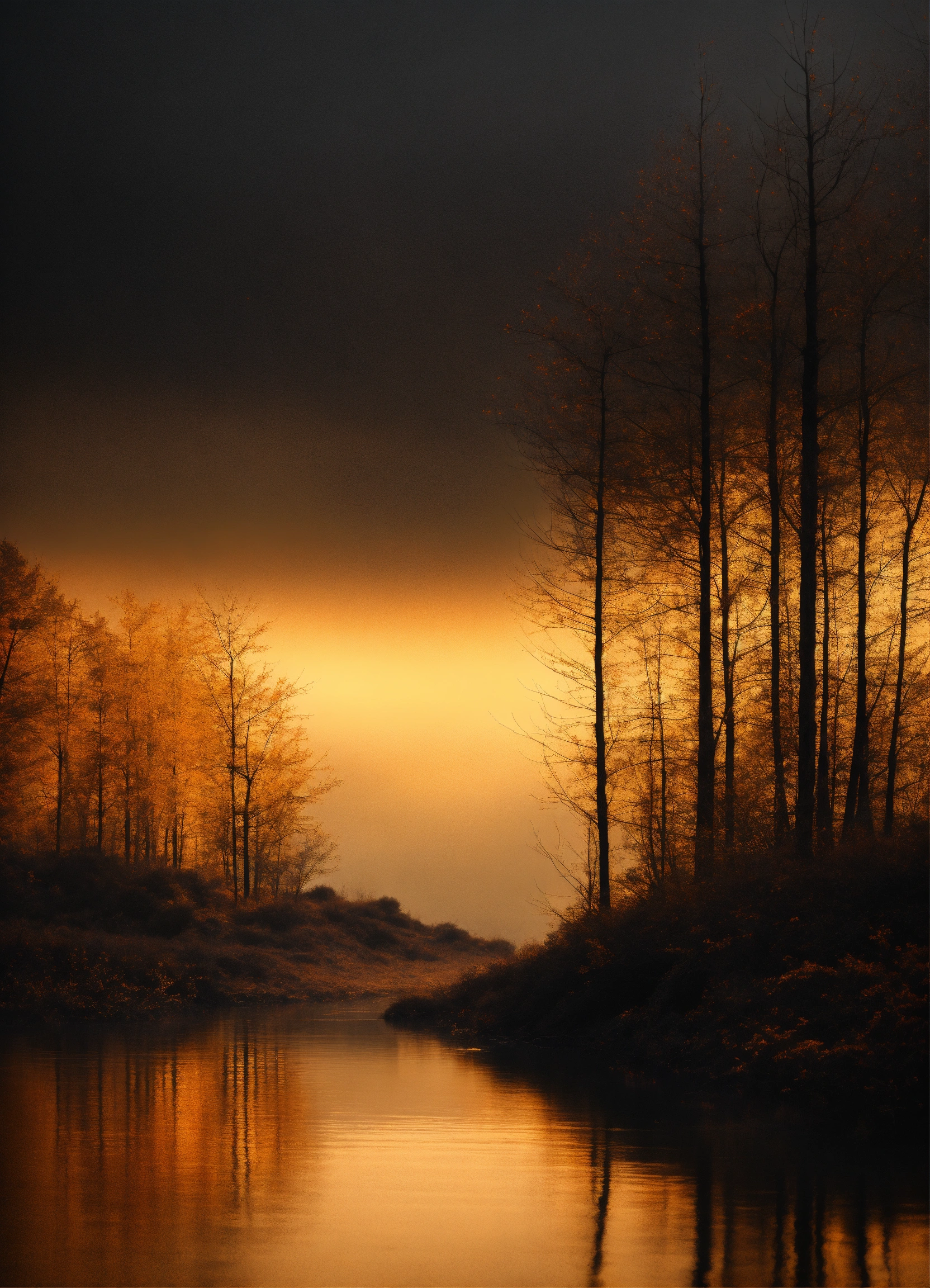 Minimalist, elegant, discreet, abstract, enigmatic, sophisticated, modern, mysterious and perfect nature scene in black, gold and copper and with depth
